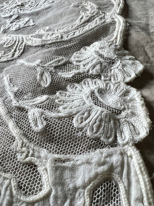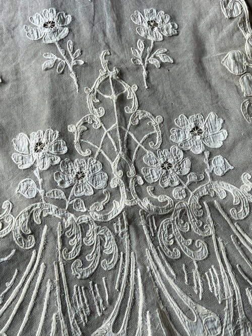 コルネリーステッチでお花や植物が描かれたアプリケーションレースのカーテンです。