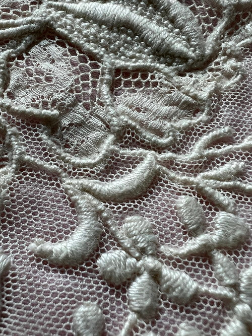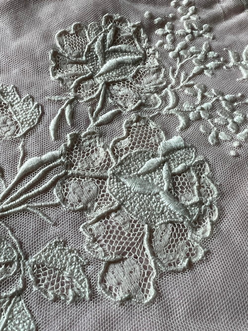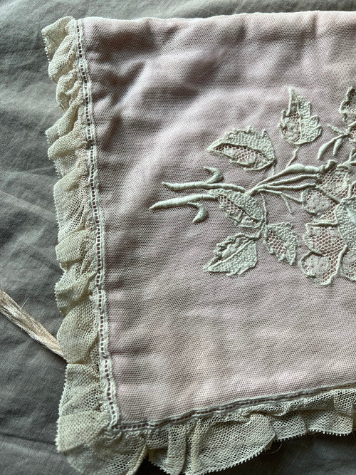 サテン地にチュール刺繍レースが組み合わさったデザインのハンキーケースです。 二つに折り曲げるだけのタイプ。 元々は結ぶためにシルクリボンがついていたようですが一部が残るのみです。