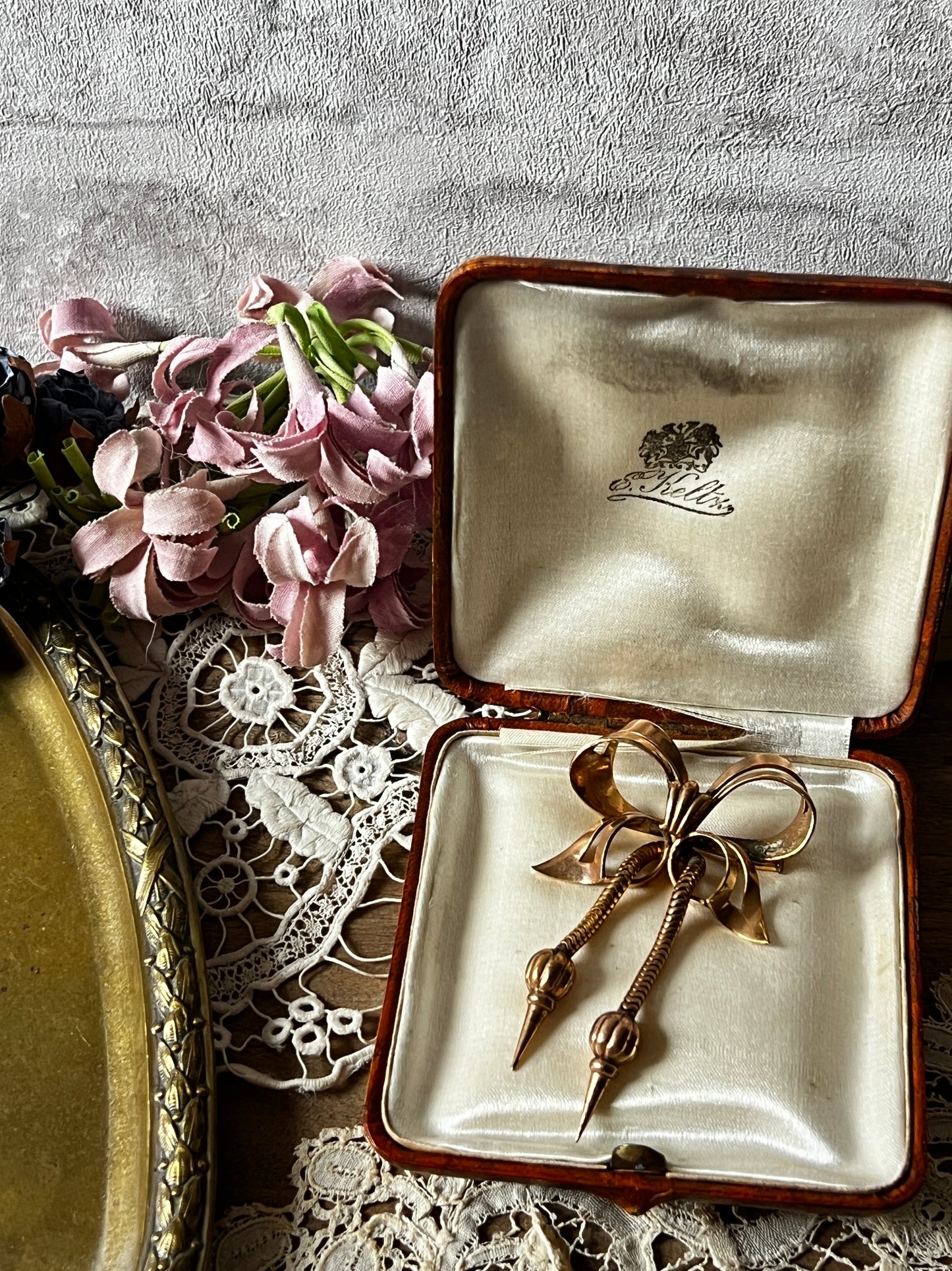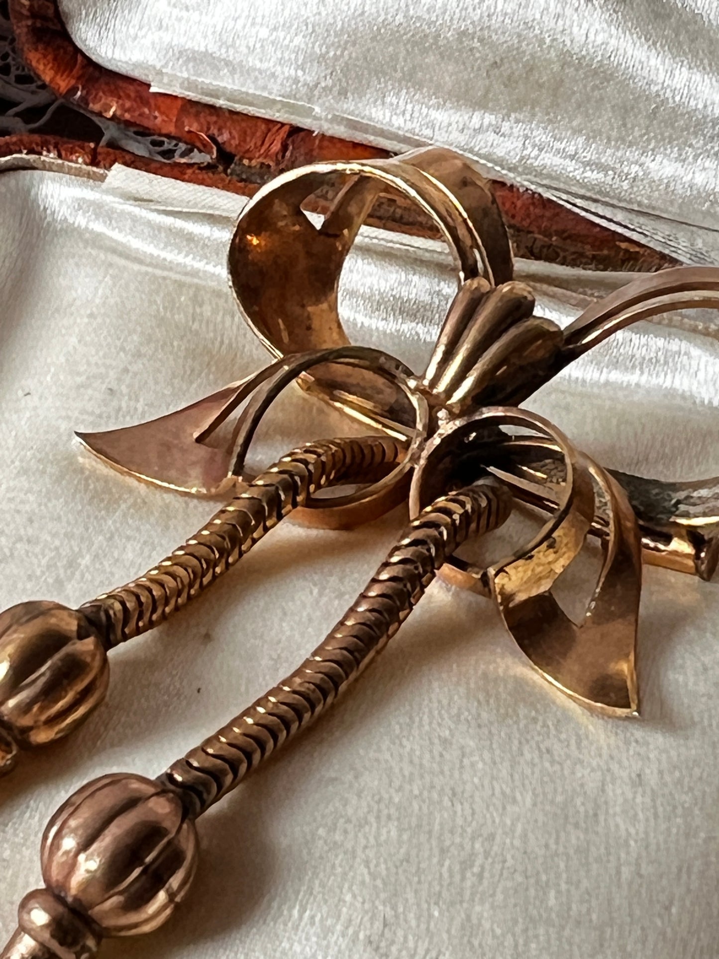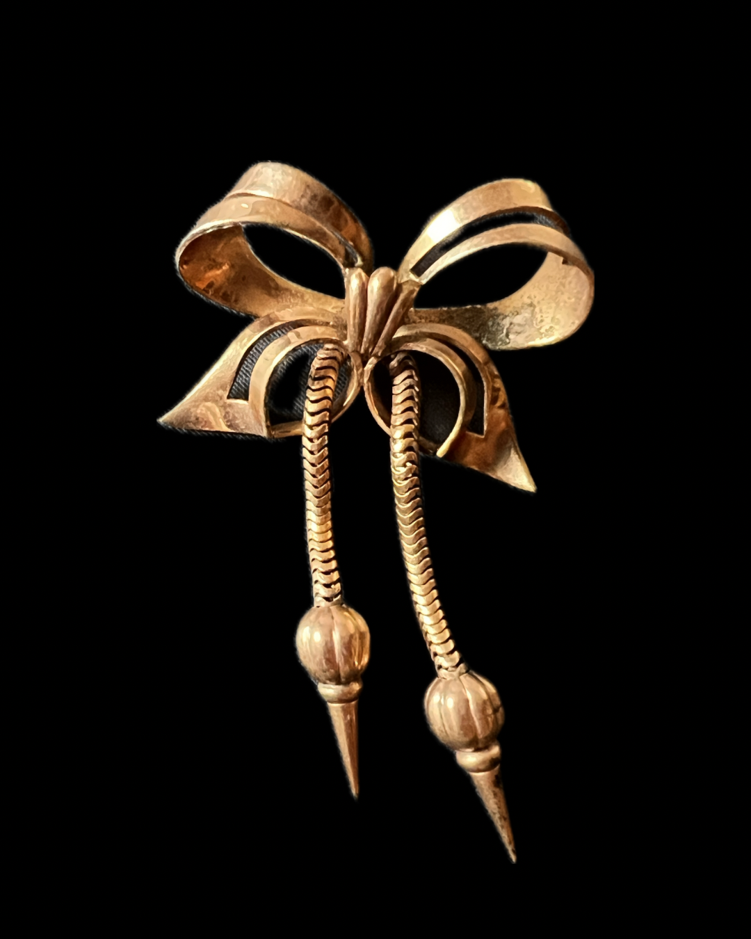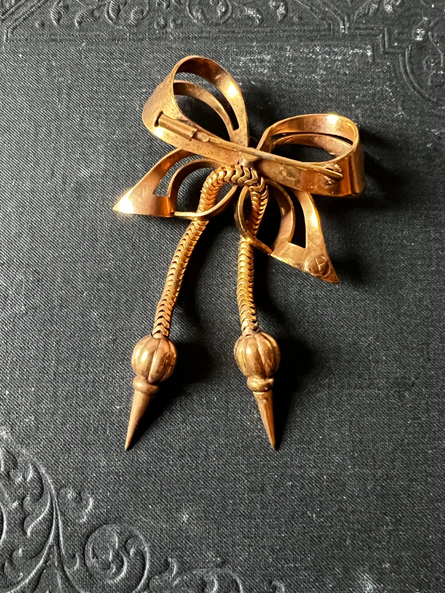 真鍮カラーのリボンとゆらゆら揺れるチャームがかわいらしいブローチです