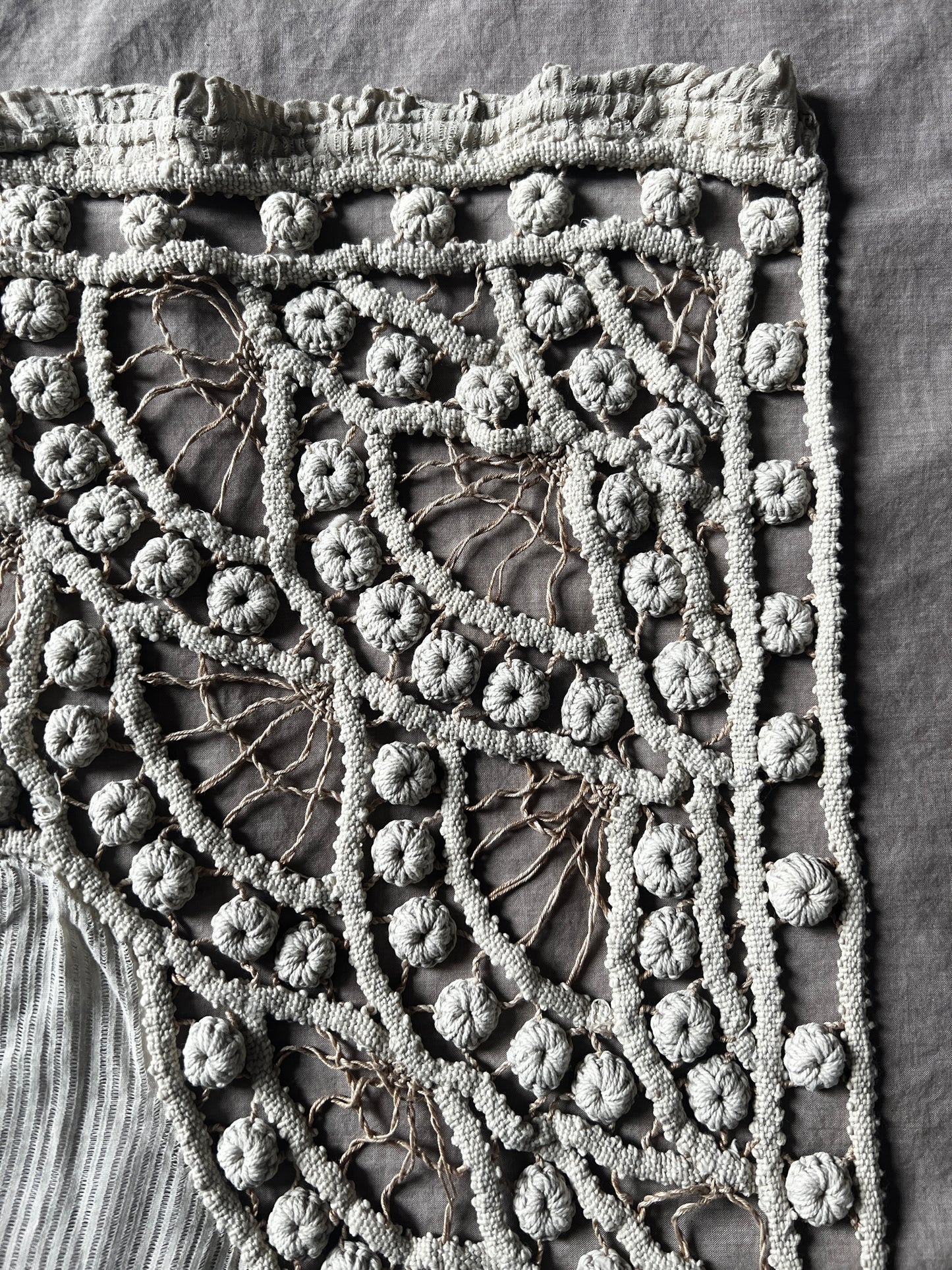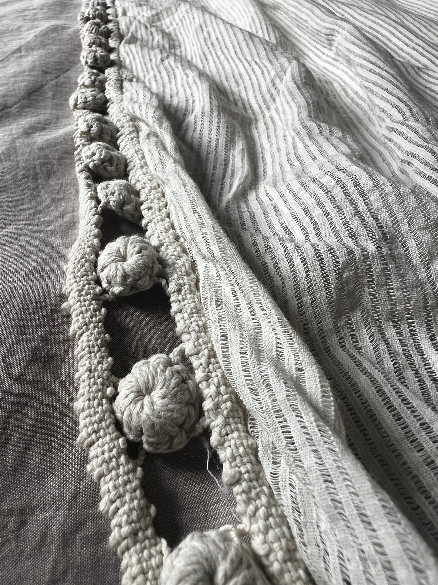 丸くころりとしたクロシェのモチーフでかわいらしくデザインされたカーテンです。