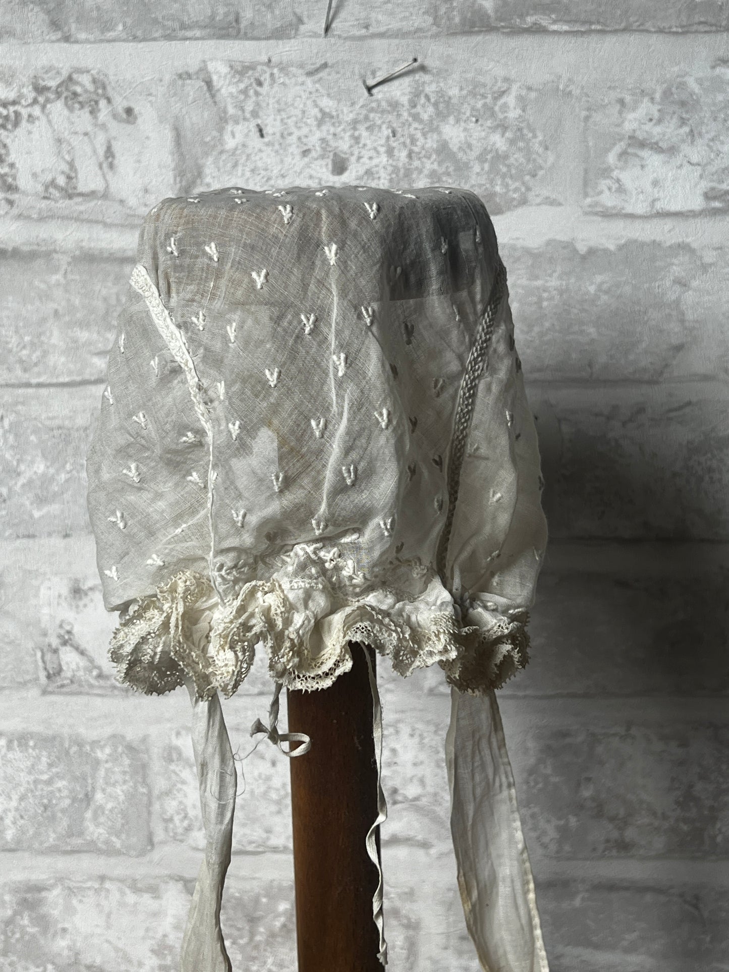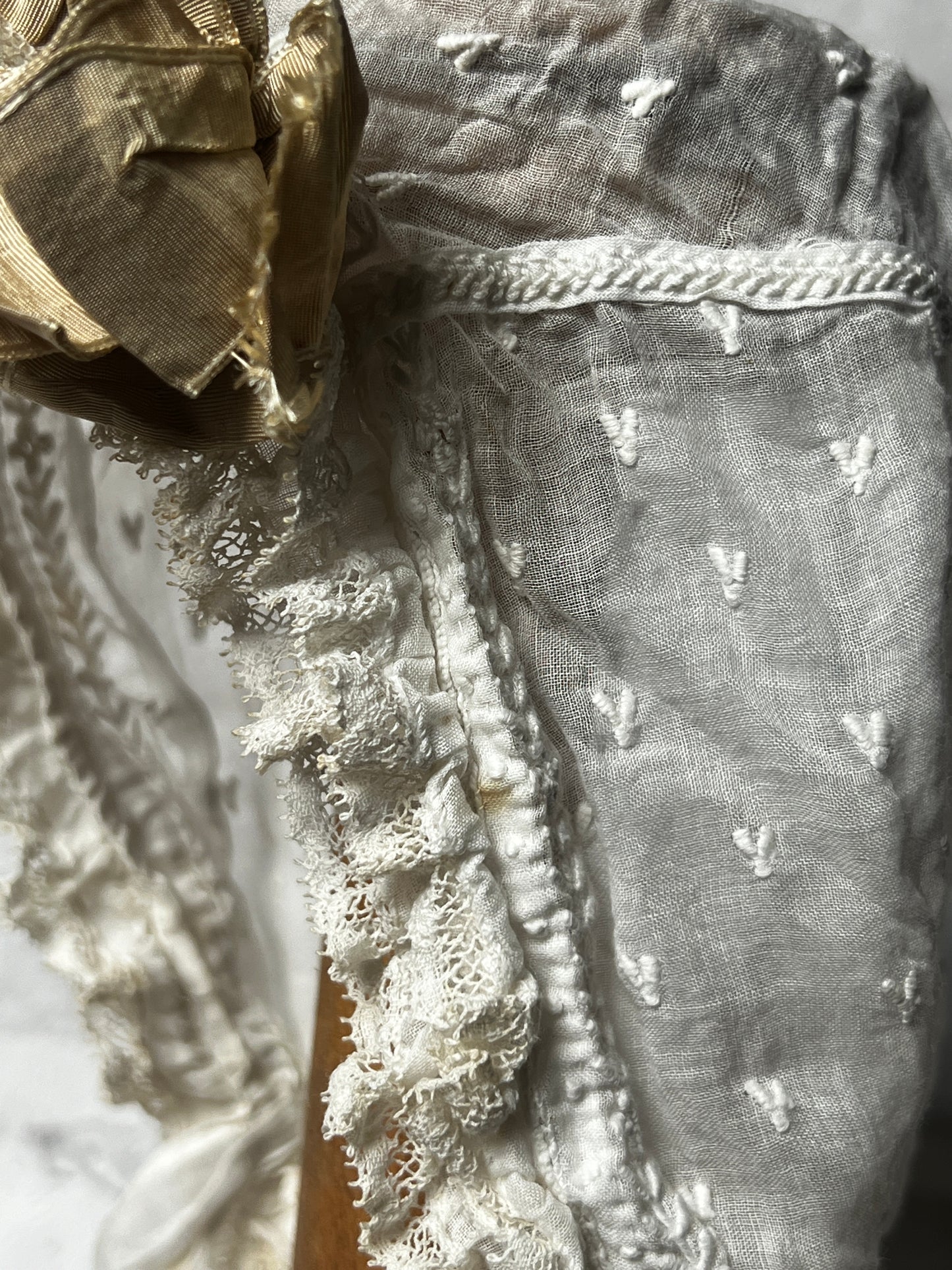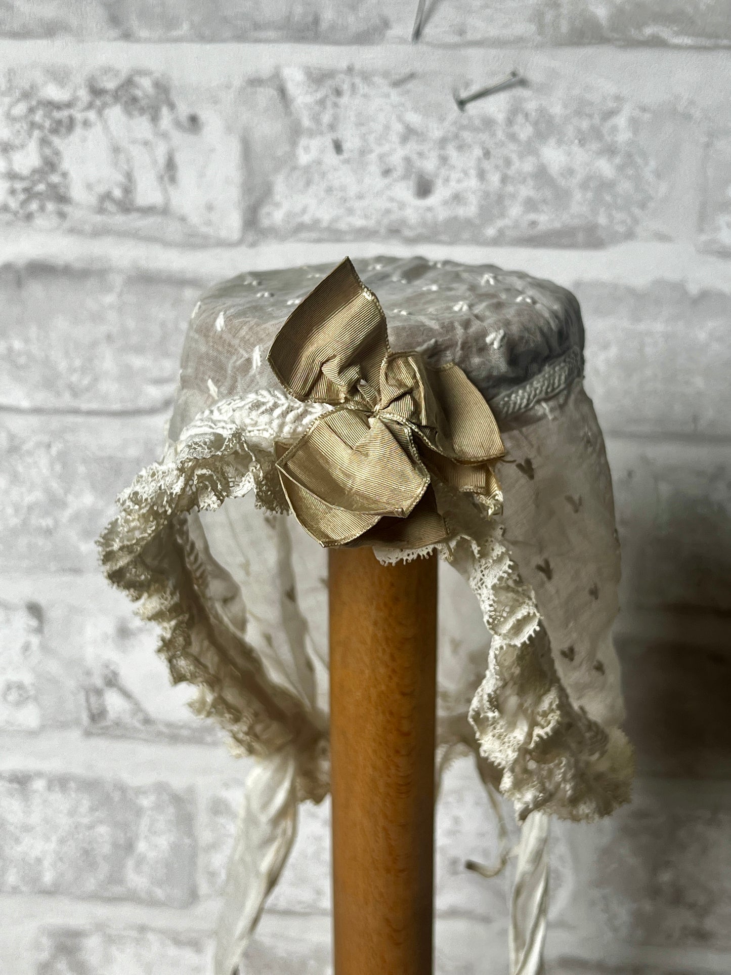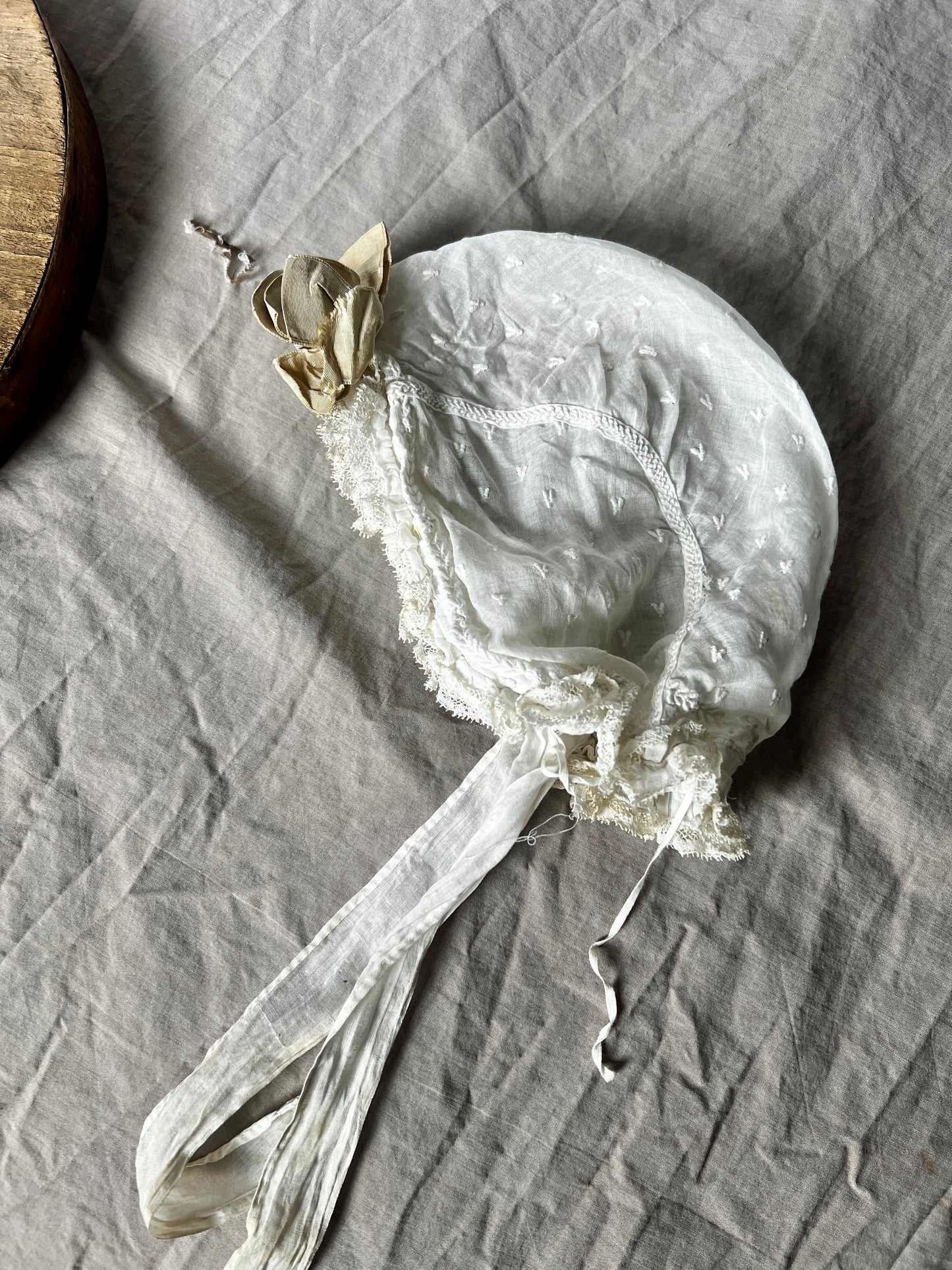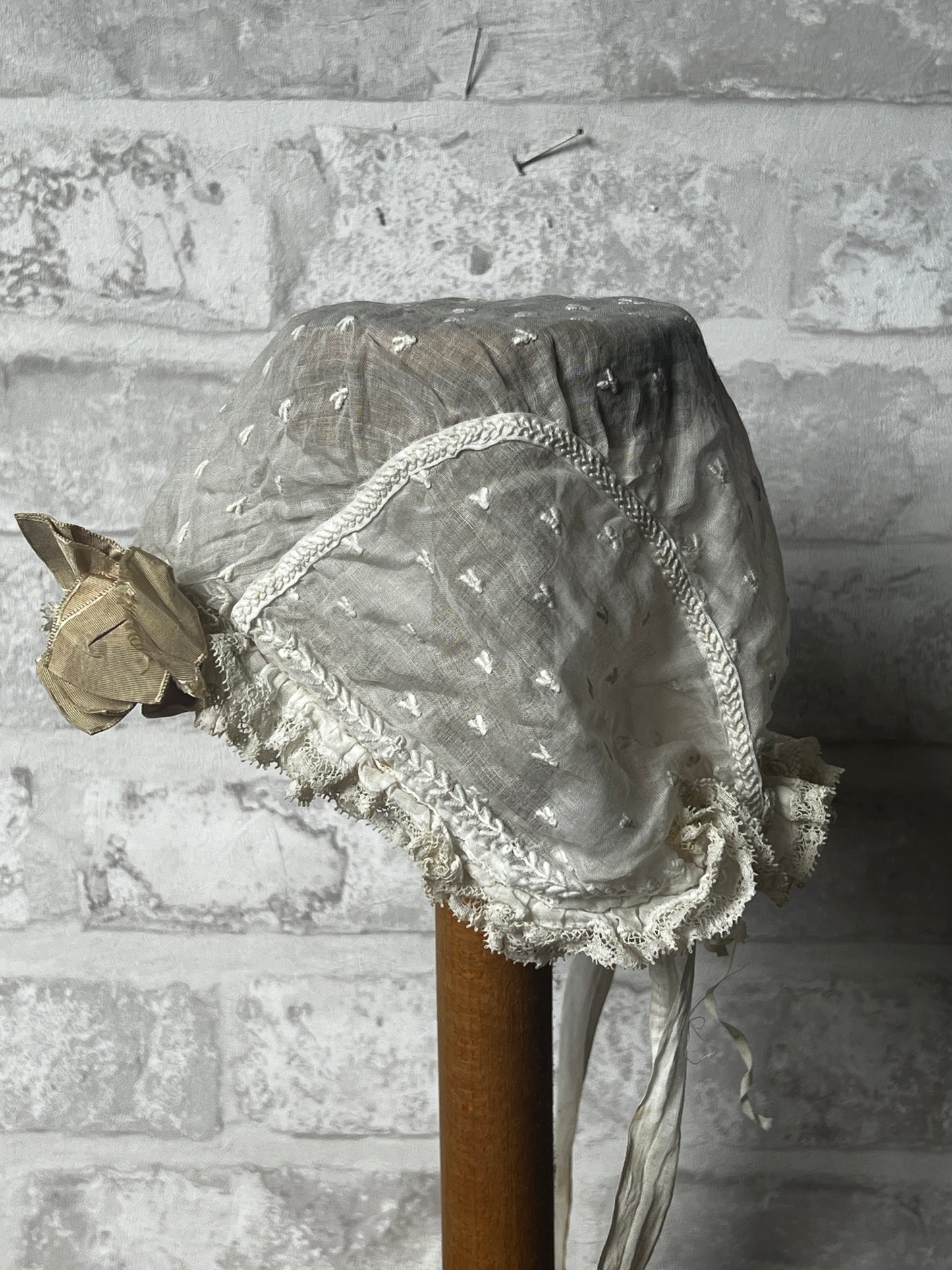 フリルとリボン飾りがかわいらしいベビーボネです