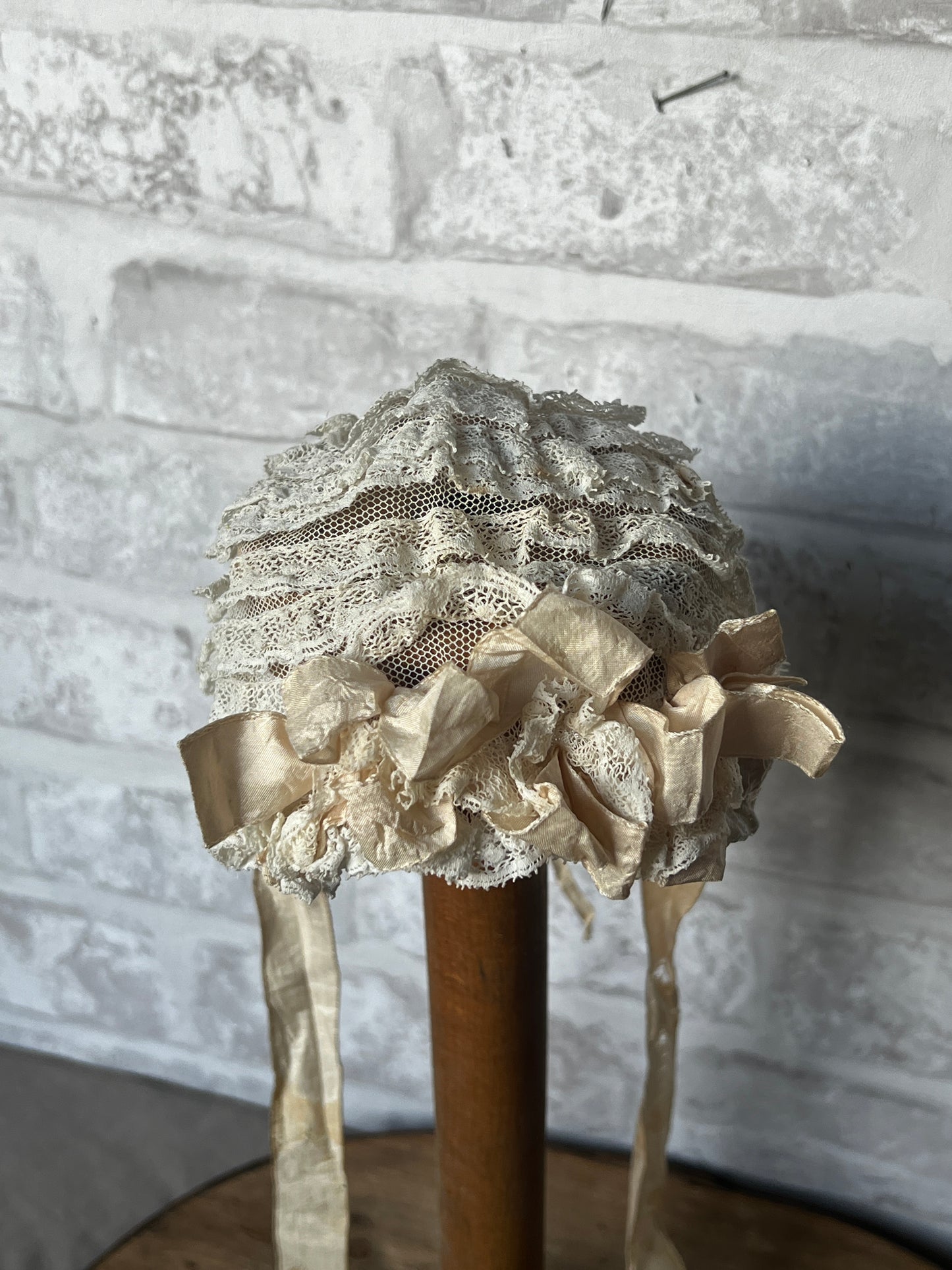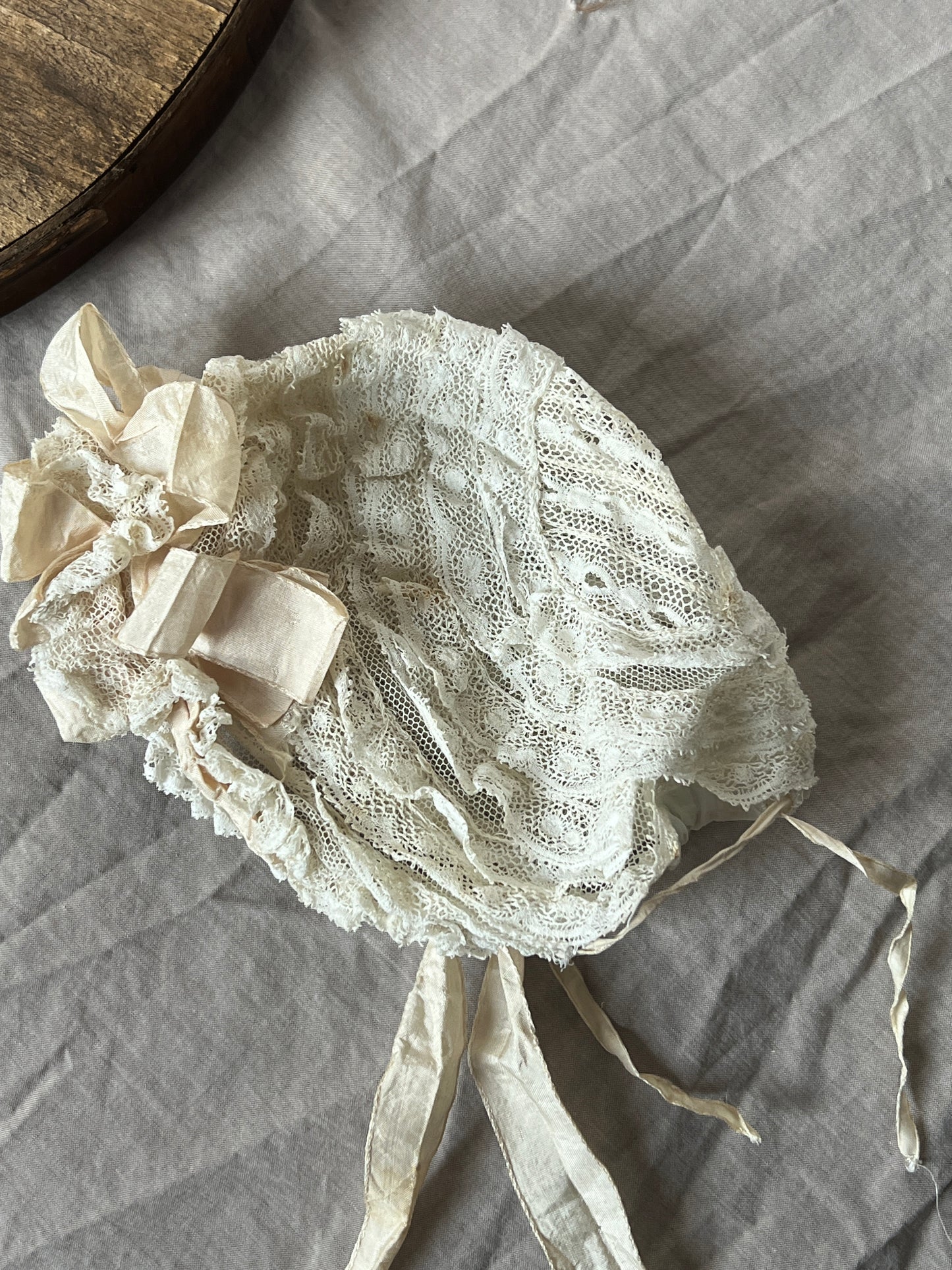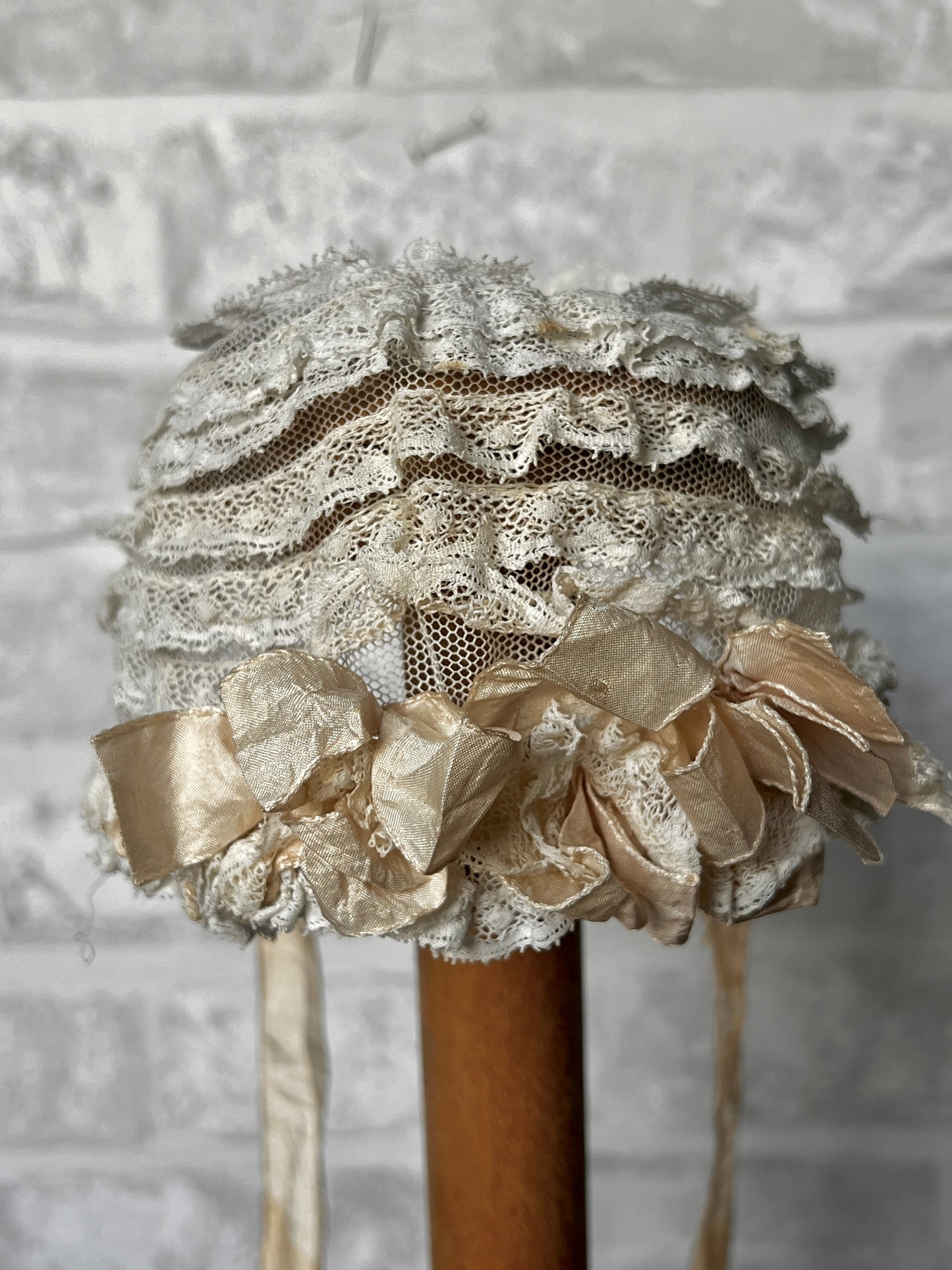 幾重ものフリルとたっぷりのリボン飾りがかわいらしいベビーボネです
