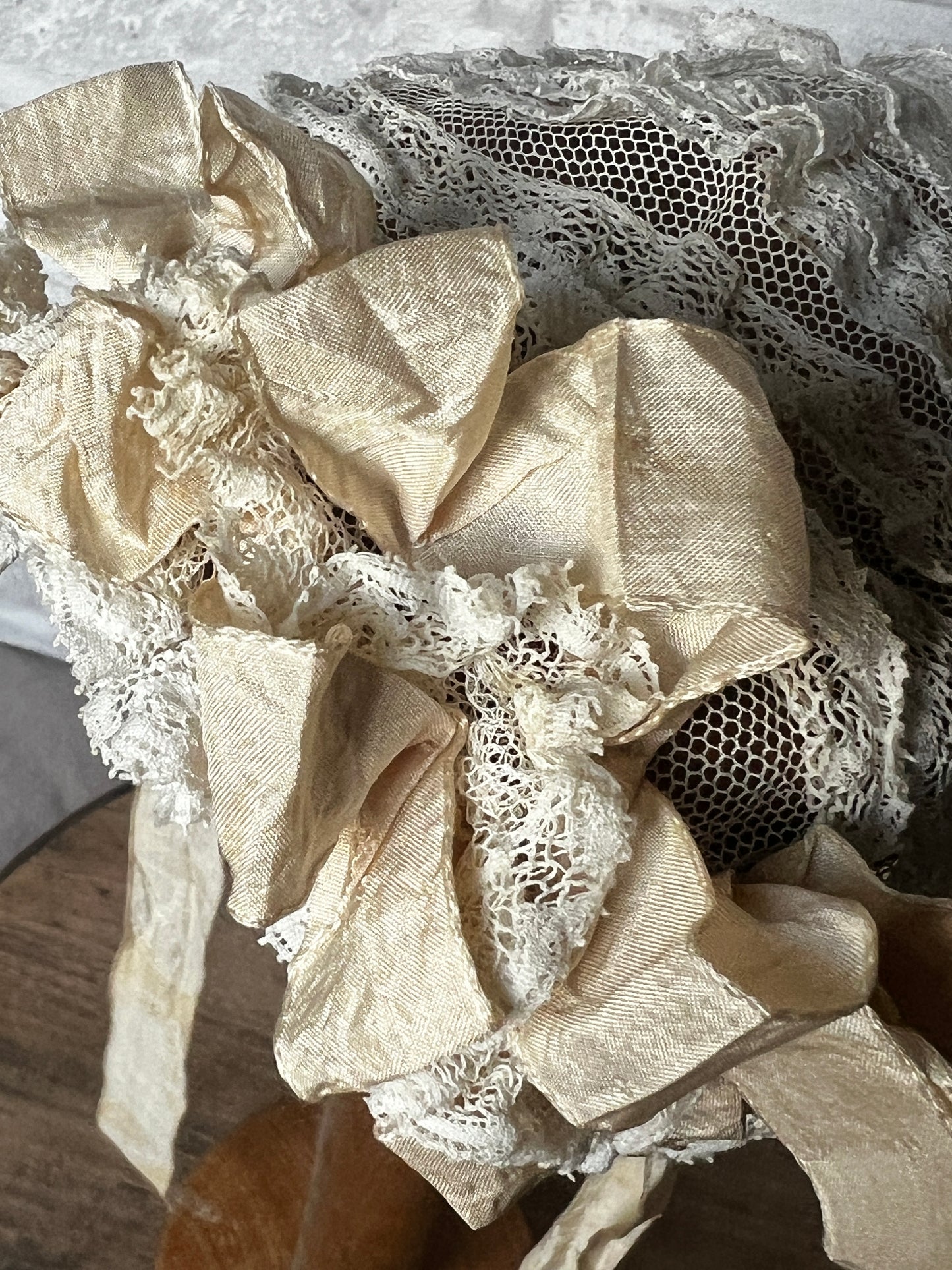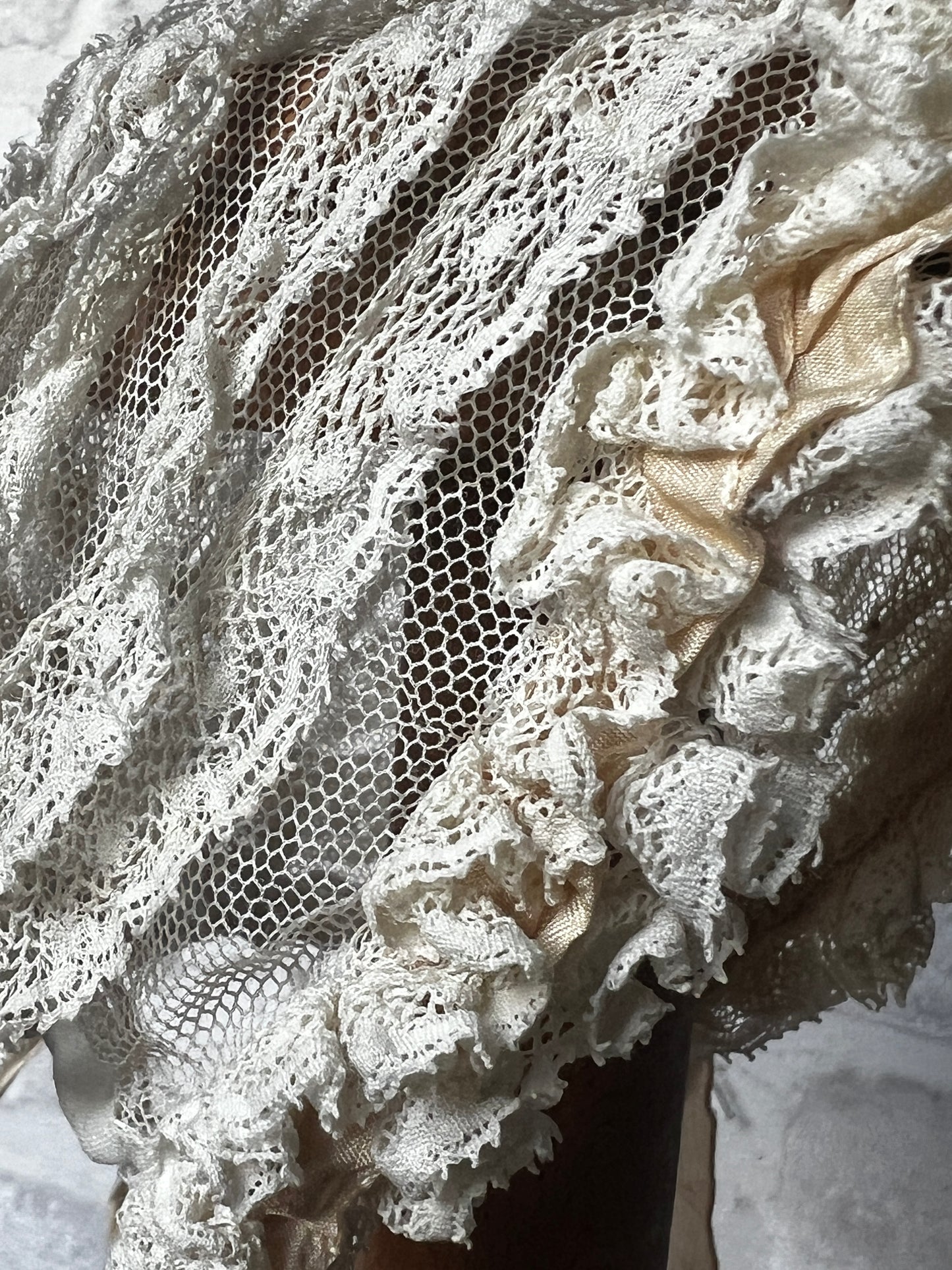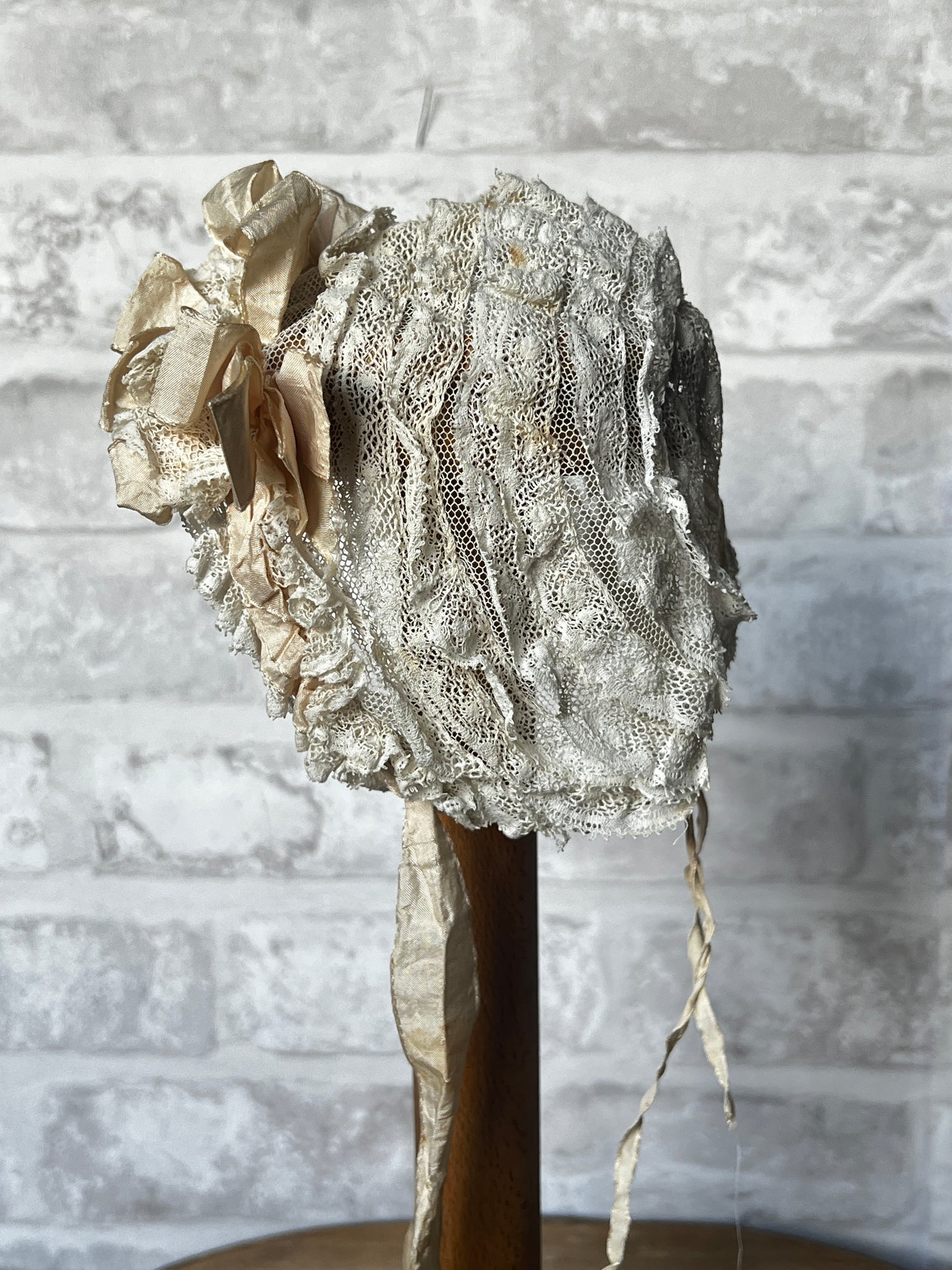 幾重ものフリルとたっぷりのリボン飾りがかわいらしいベビーボネです
