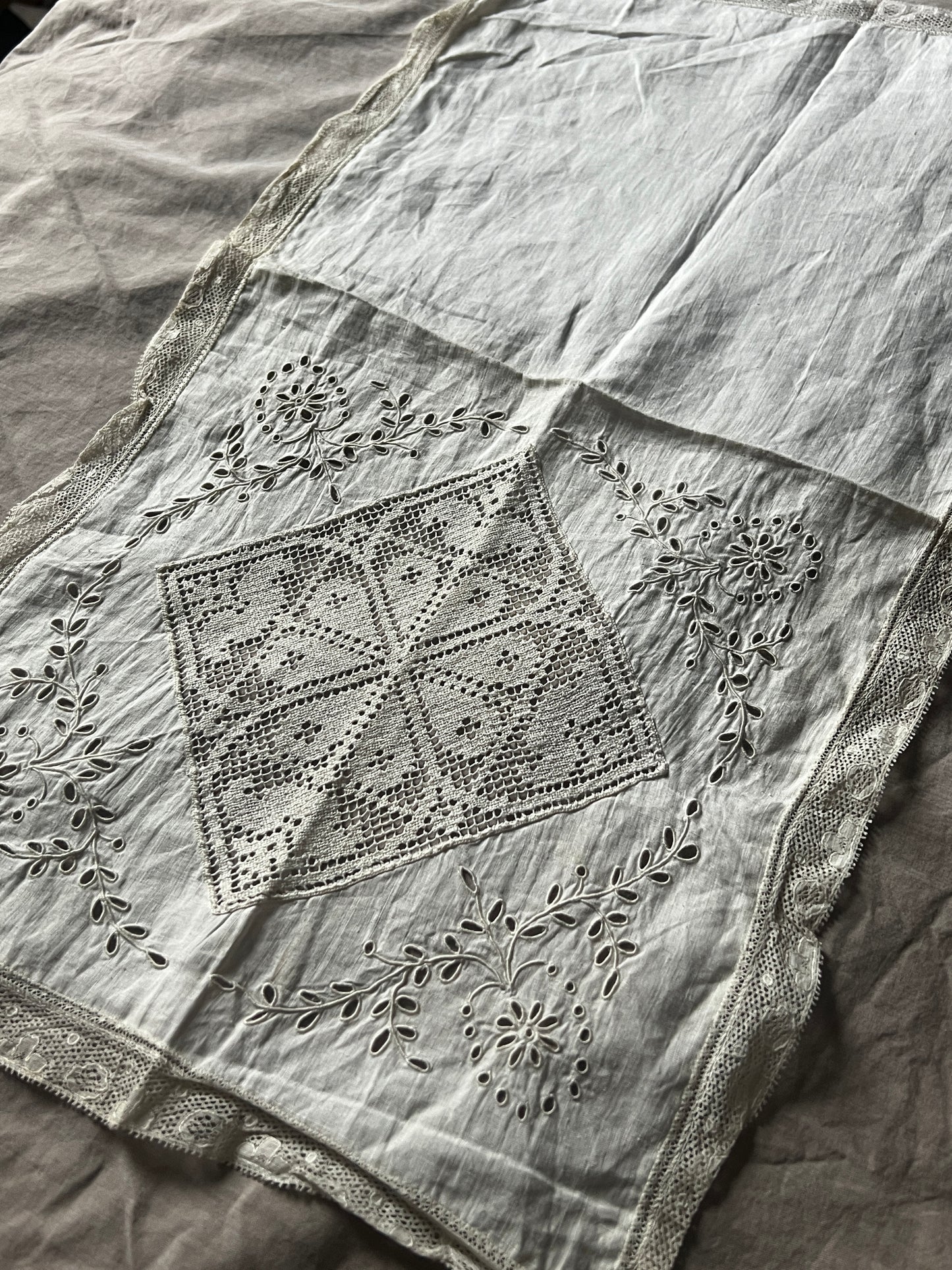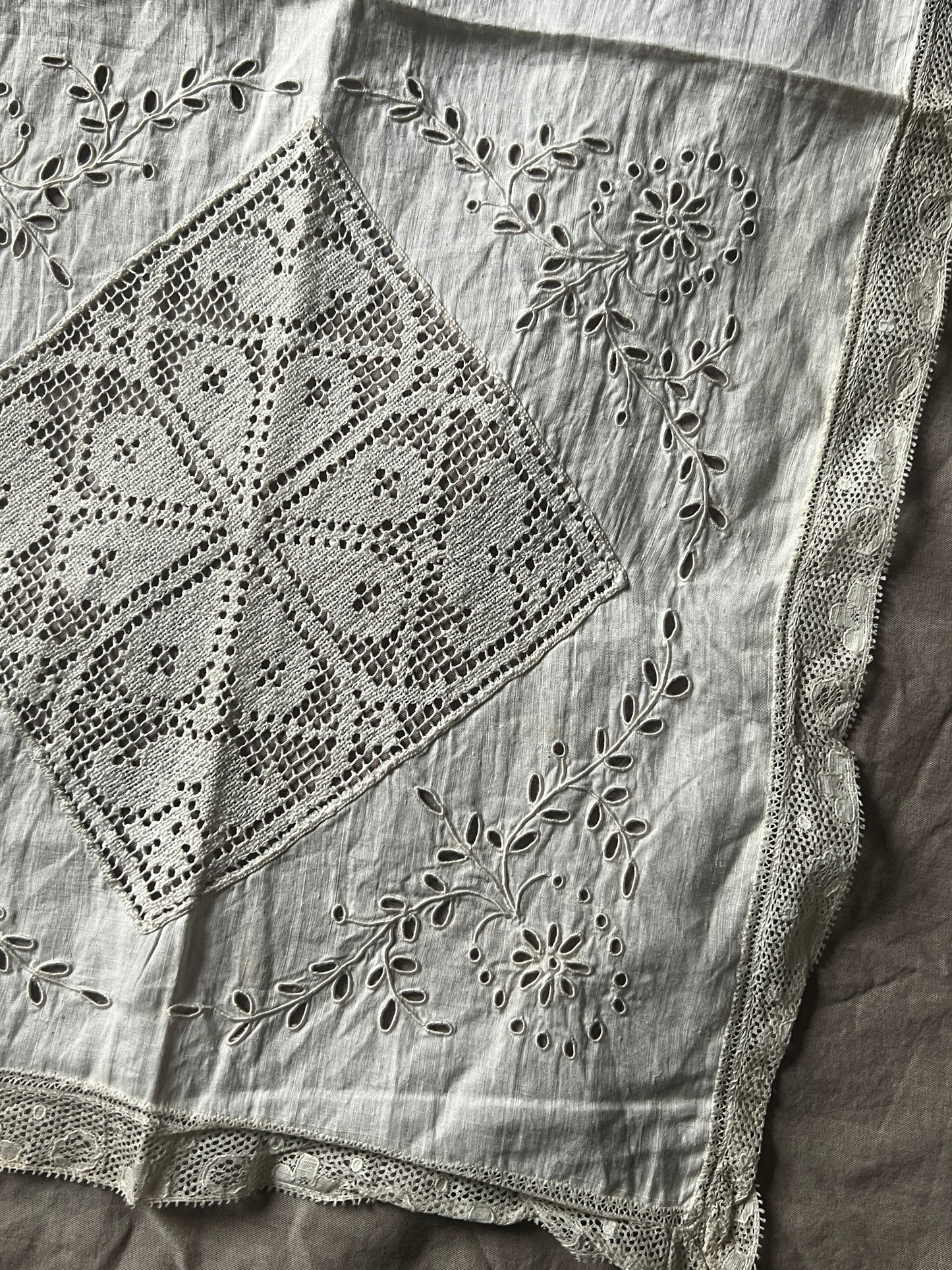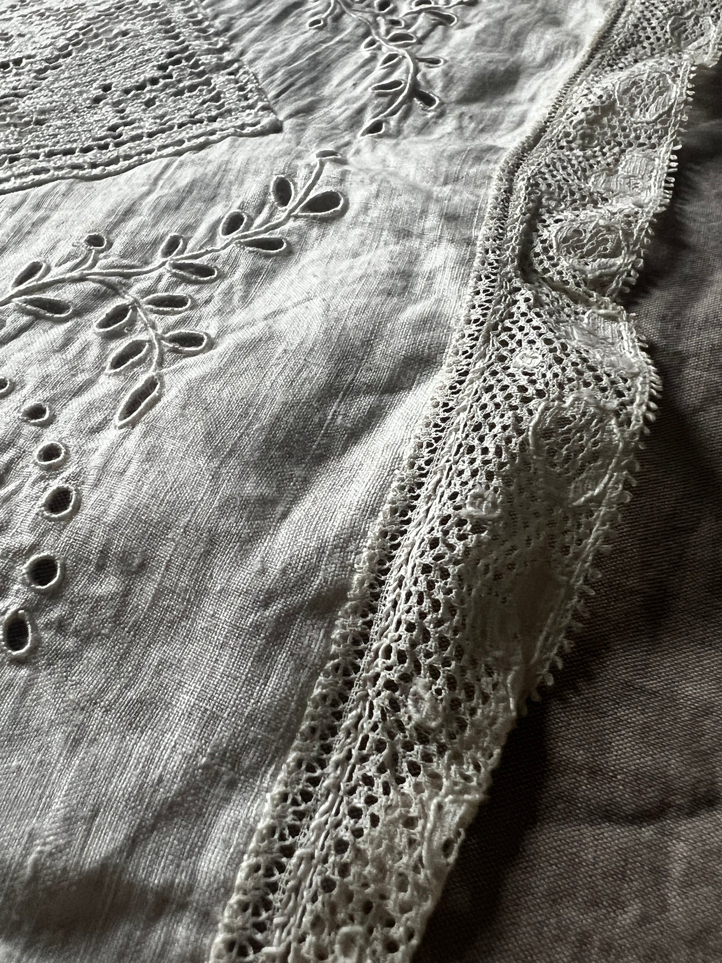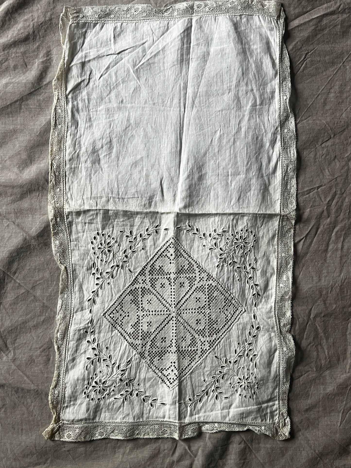 細いレースで縁取られた薄手の布に半分面刺繍が施されています