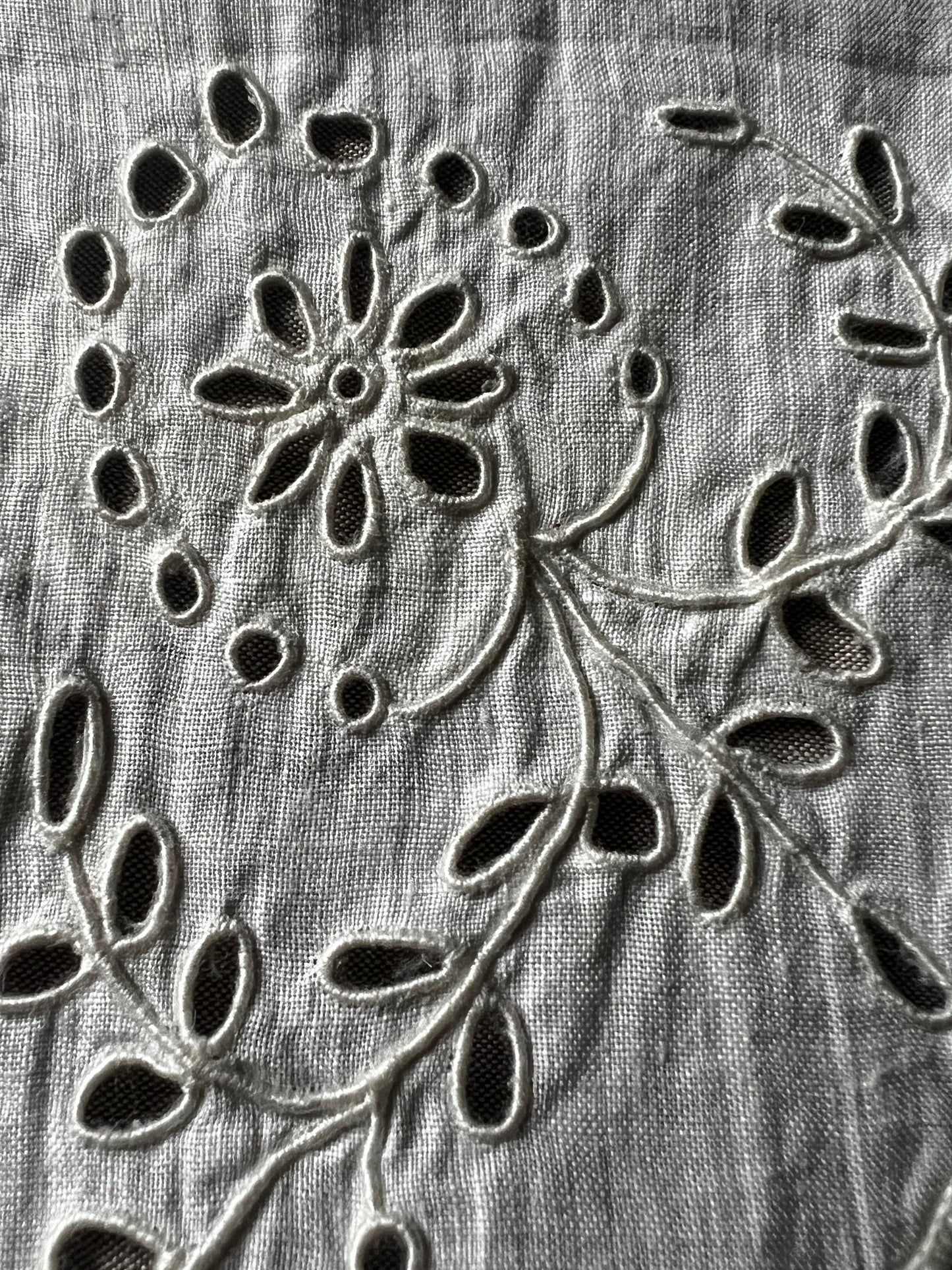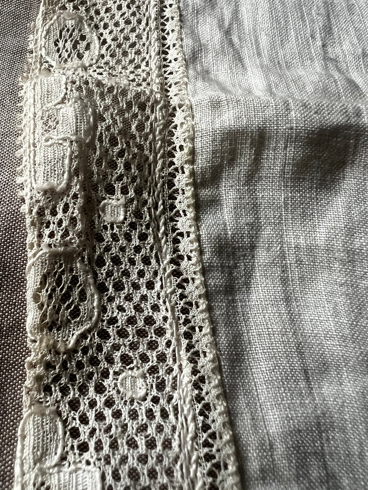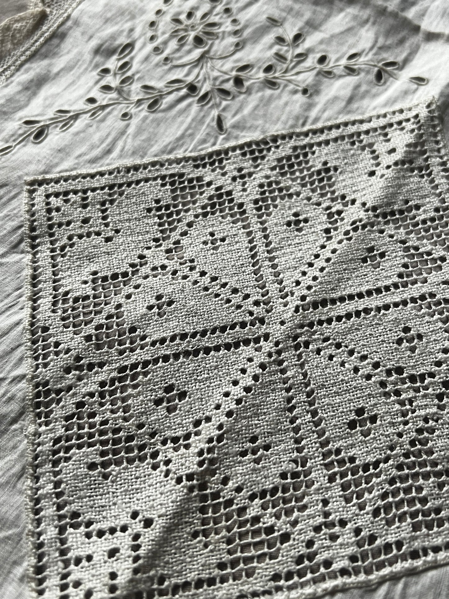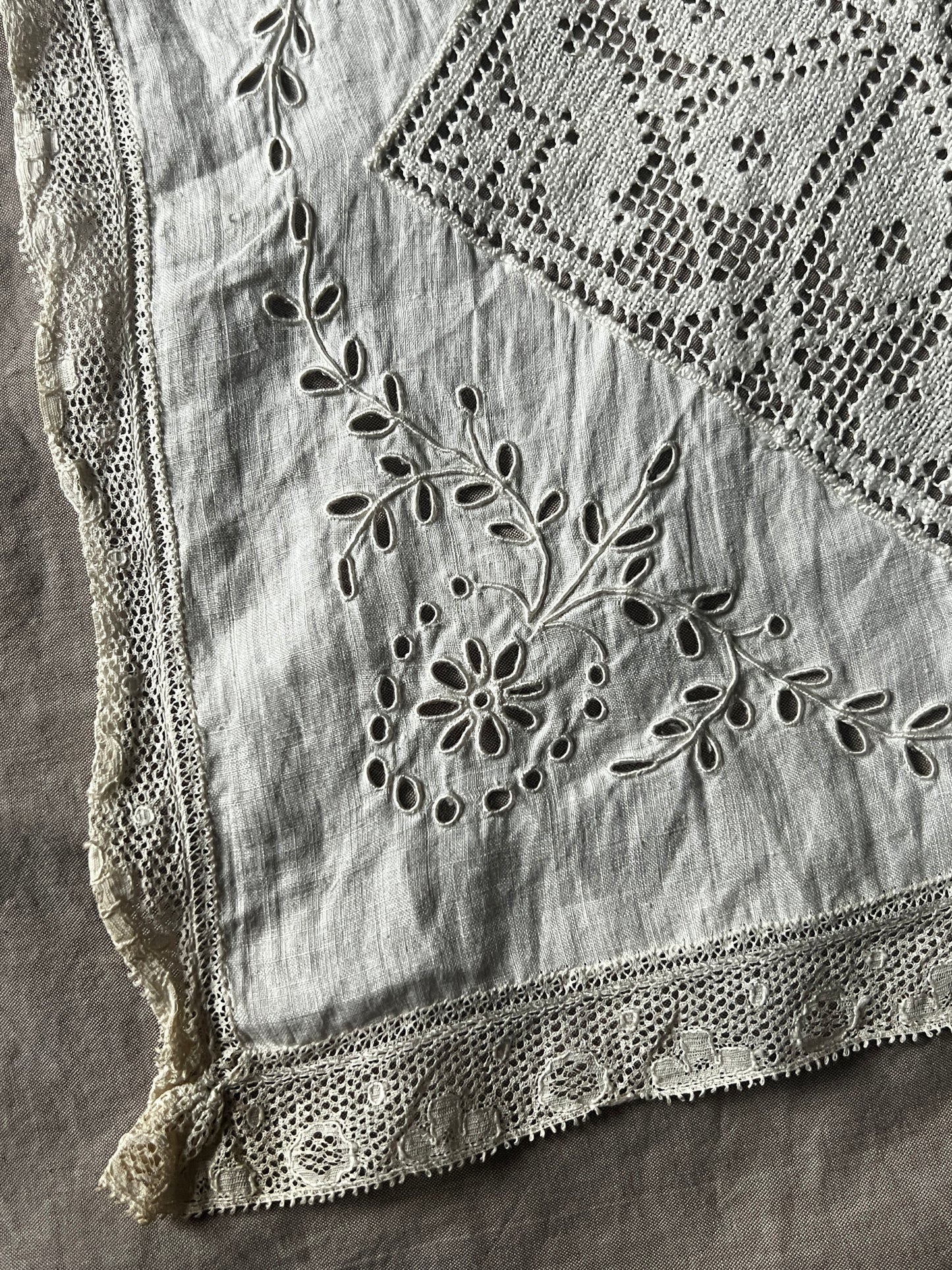 細いレースで縁取られた薄手の布に半分面刺繍が施されています