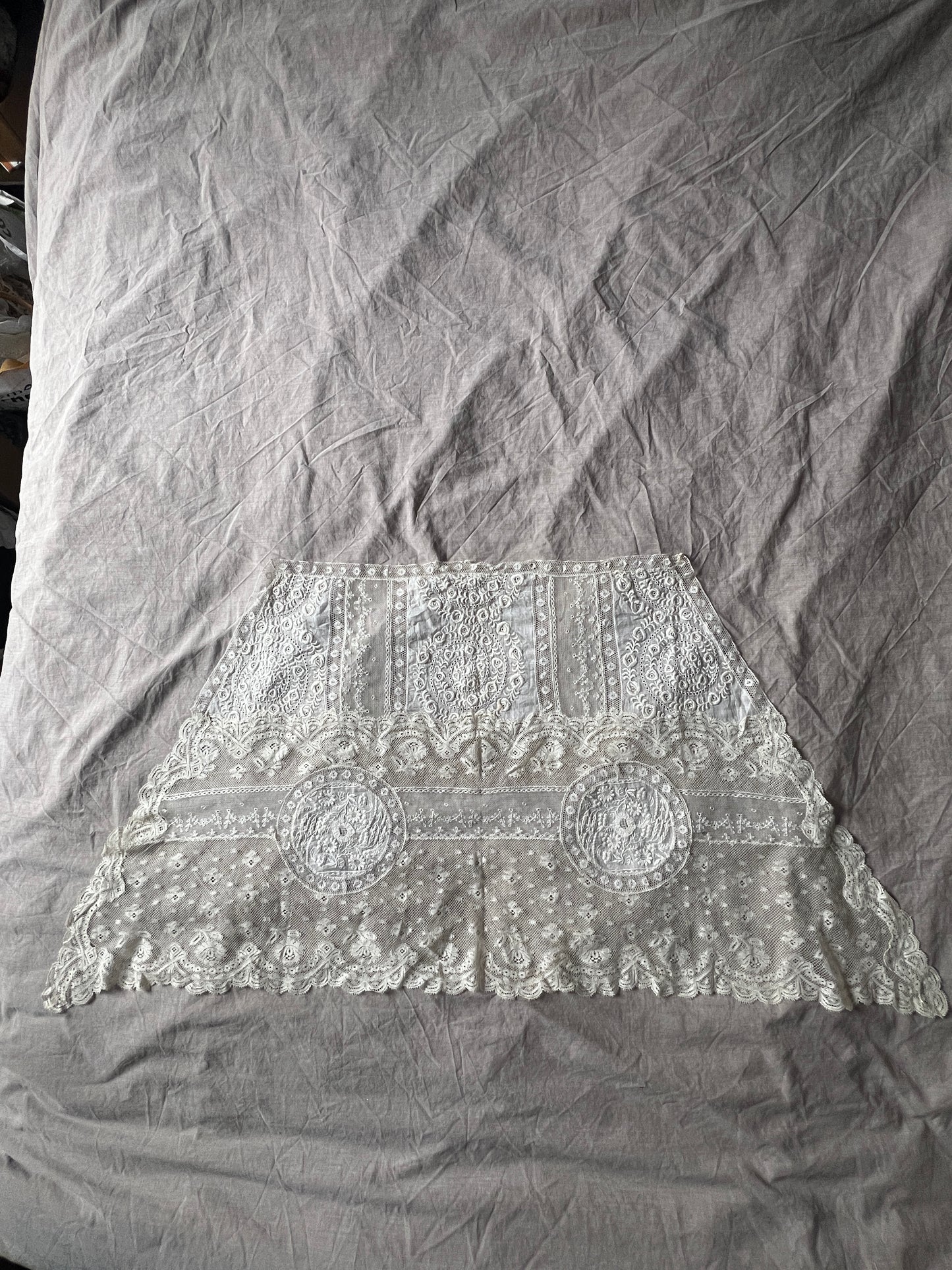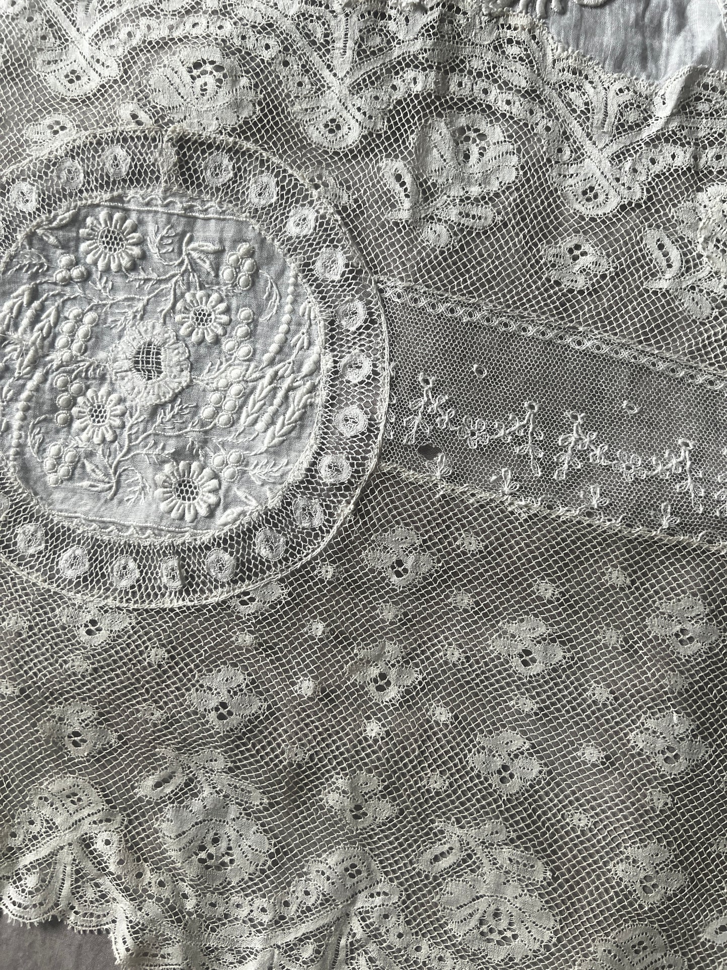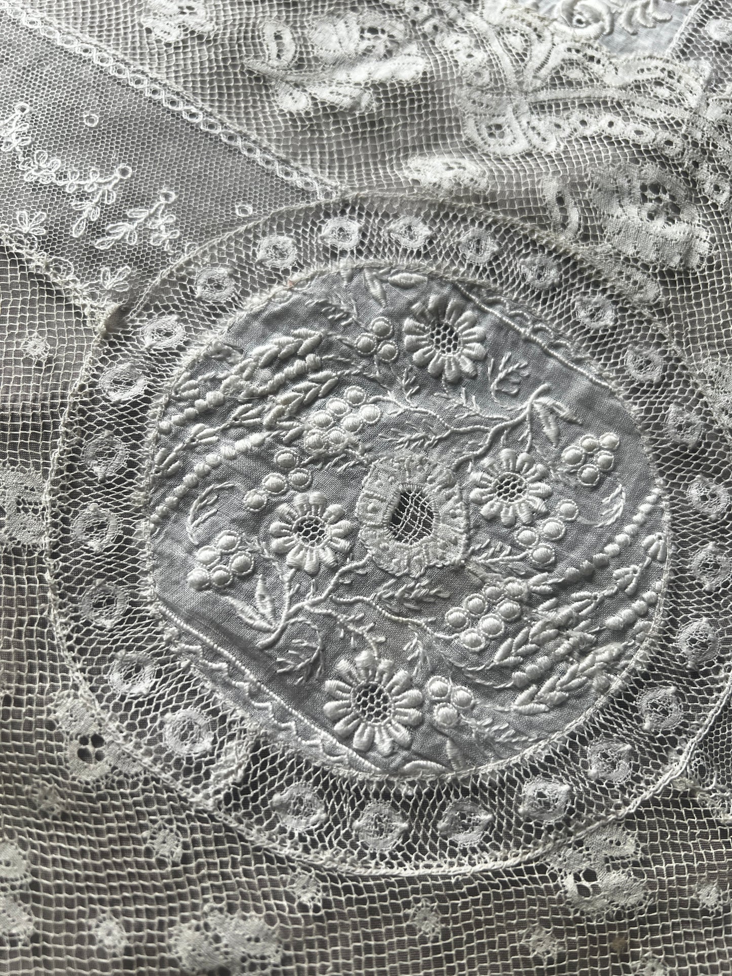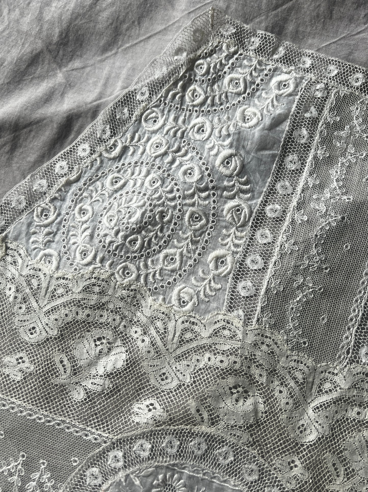 繊細なステッチの刺繍布やヴァランシエンヌレース、チュール刺繍レースなどを組み合わせてパッチワークのようにつなぎ合わせたドレスパーツです