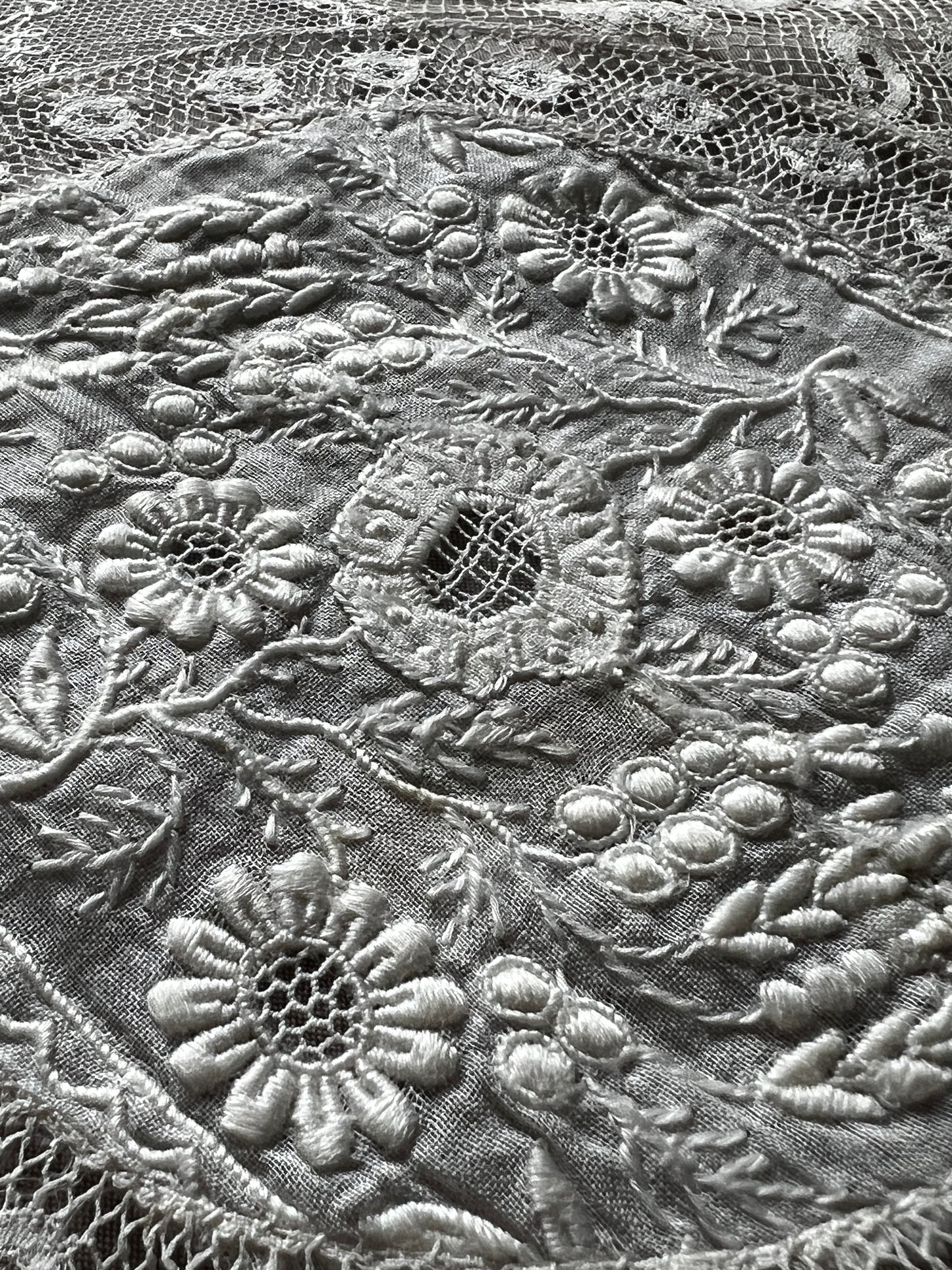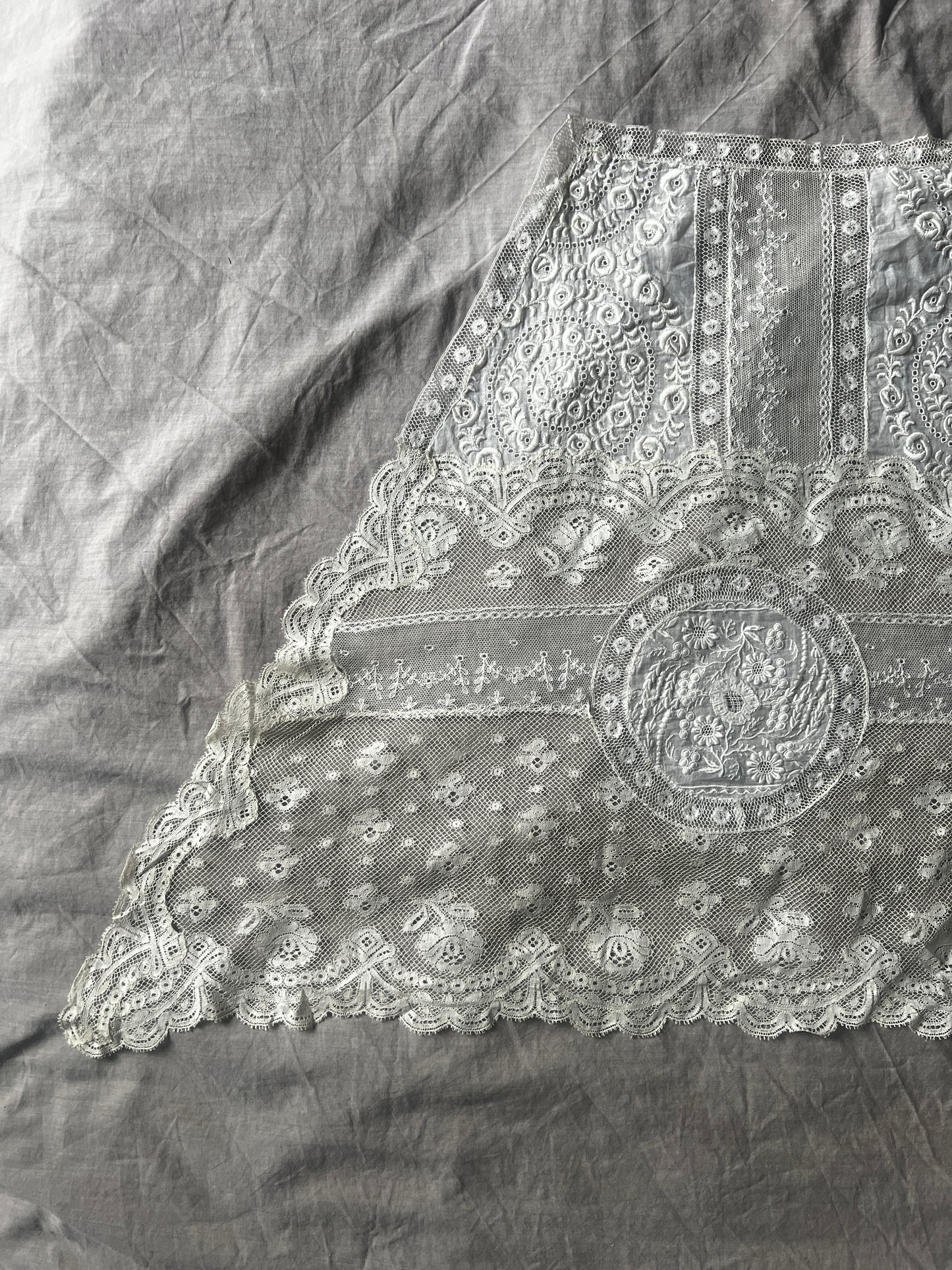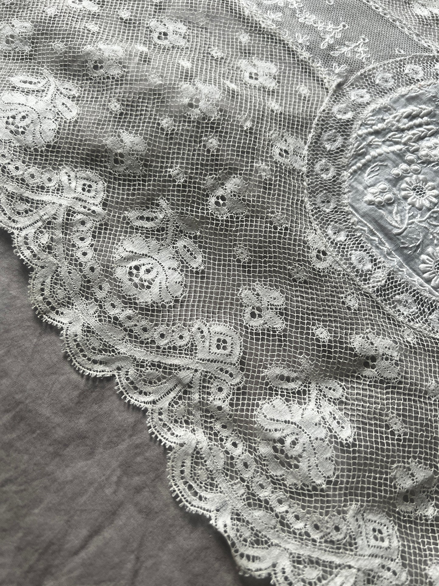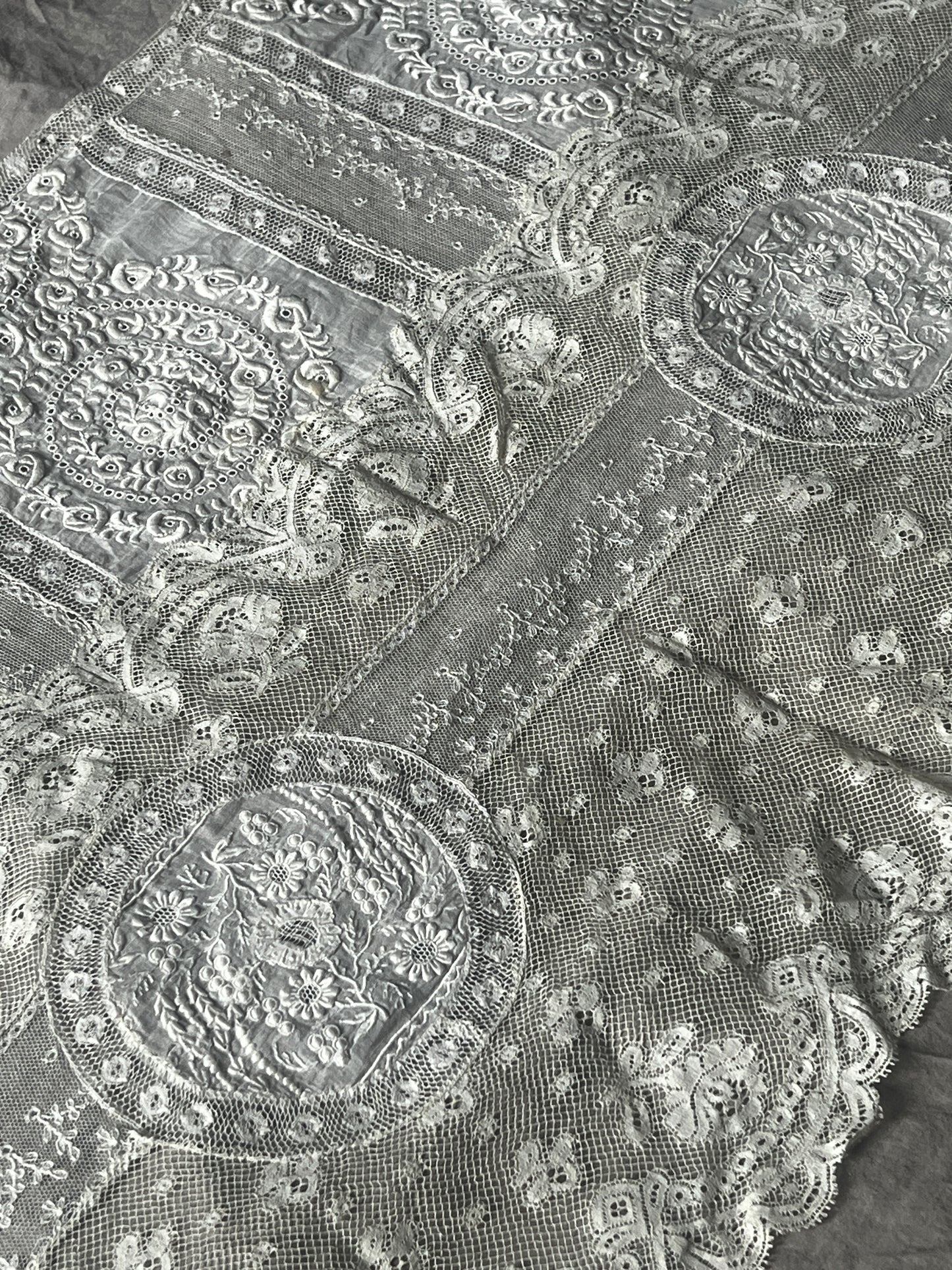 繊細なステッチの刺繍布やヴァランシエンヌレース、チュール刺繍レースなどを組み合わせてパッチワークのようにつなぎ合わせたドレスパーツです