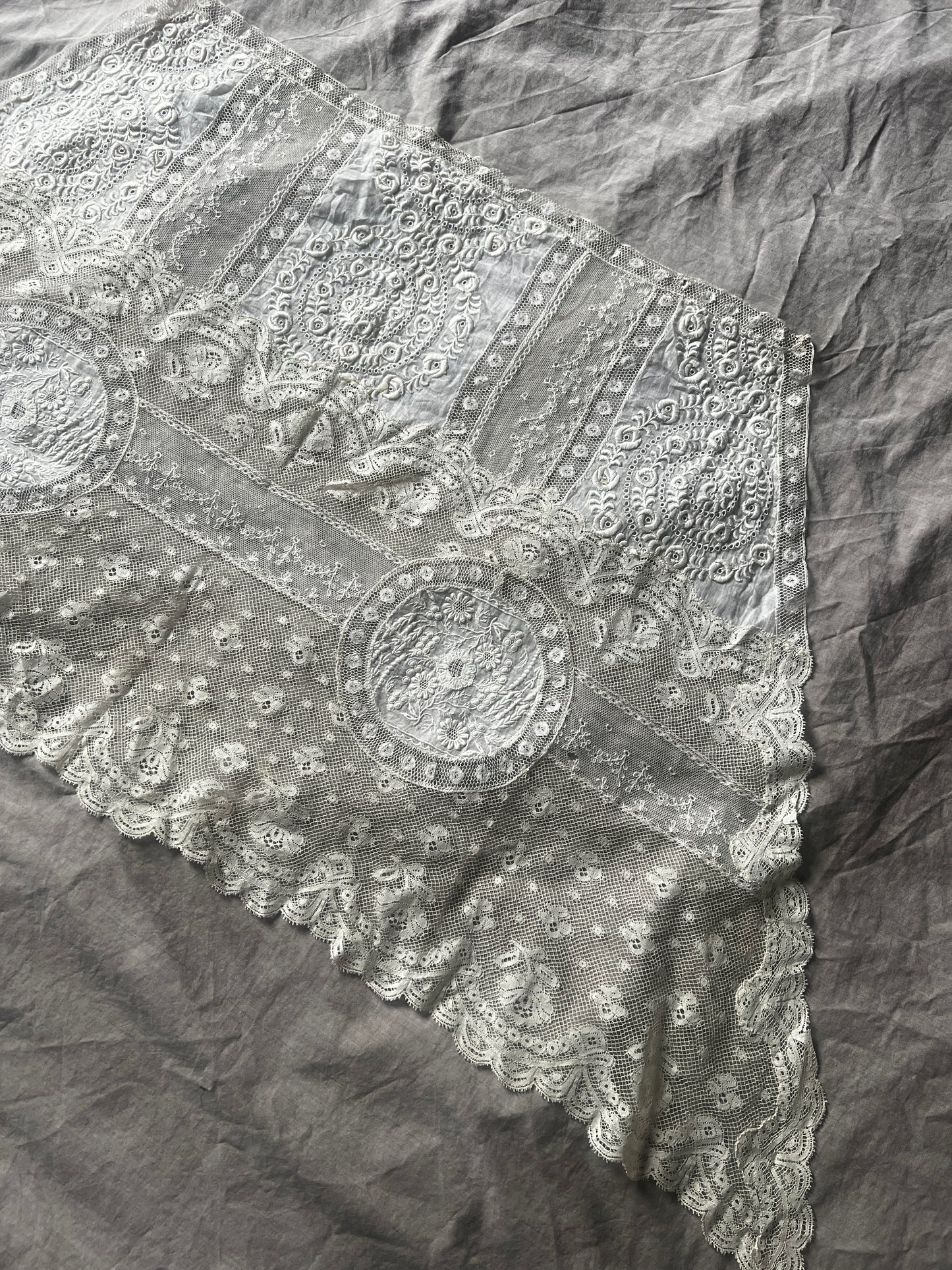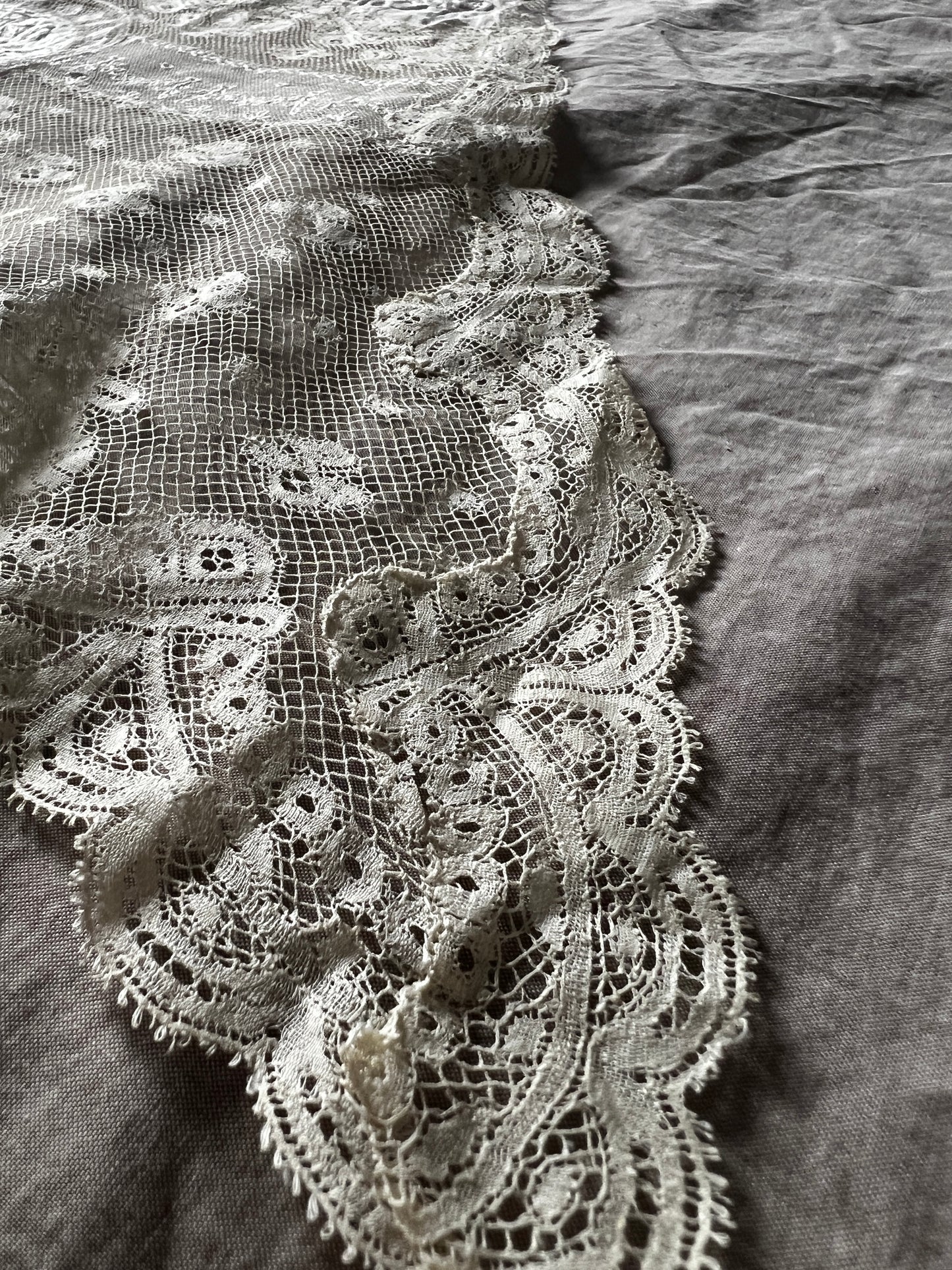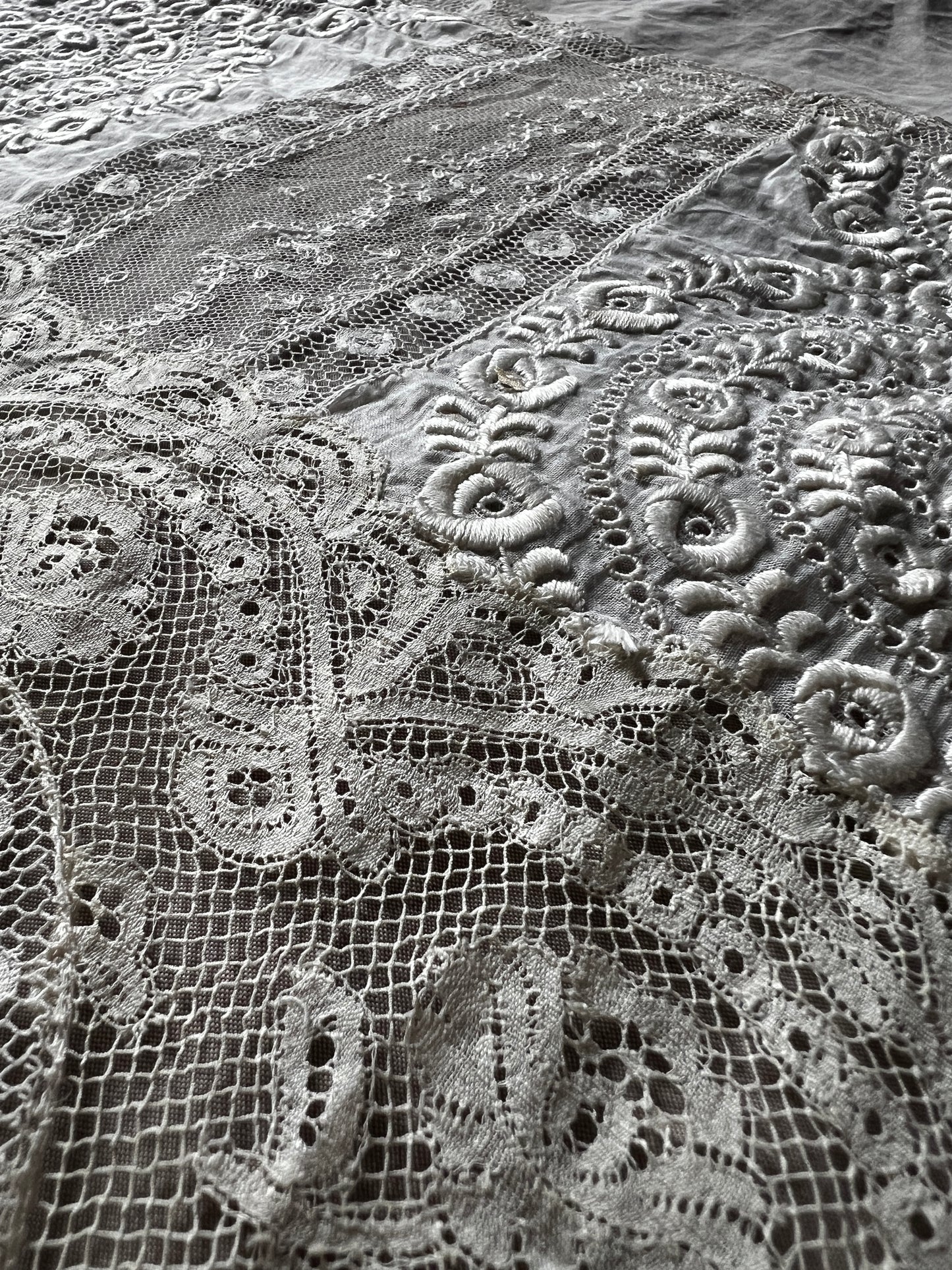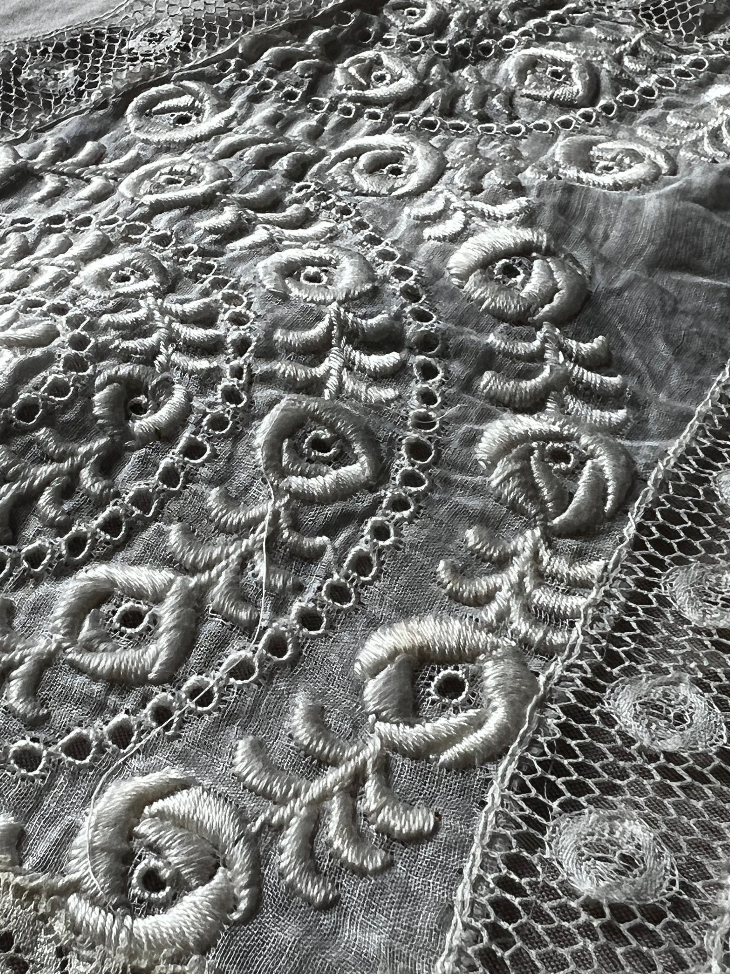 繊細なステッチの刺繍布やヴァランシエンヌレース、チュール刺繍レースなどを組み合わせてパッチワークのようにつなぎ合わせたドレスパーツです