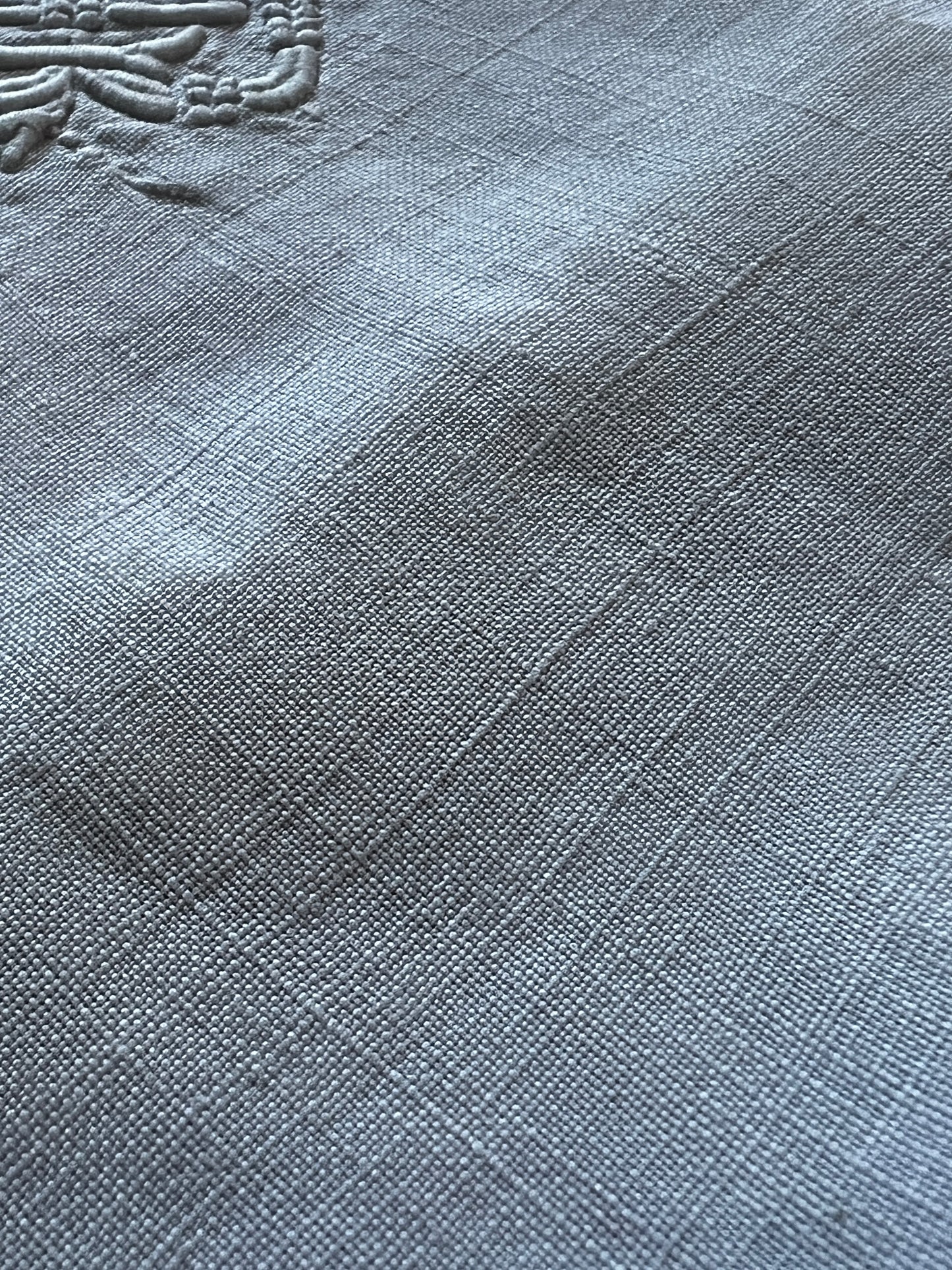 複雑でエレガントな字体のモノグラム刺繍が施されたリネンクロスです