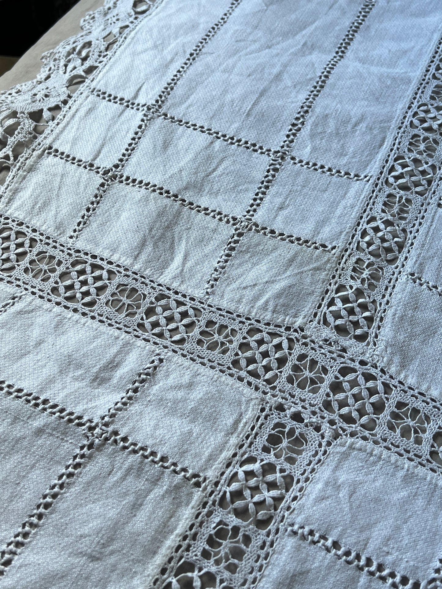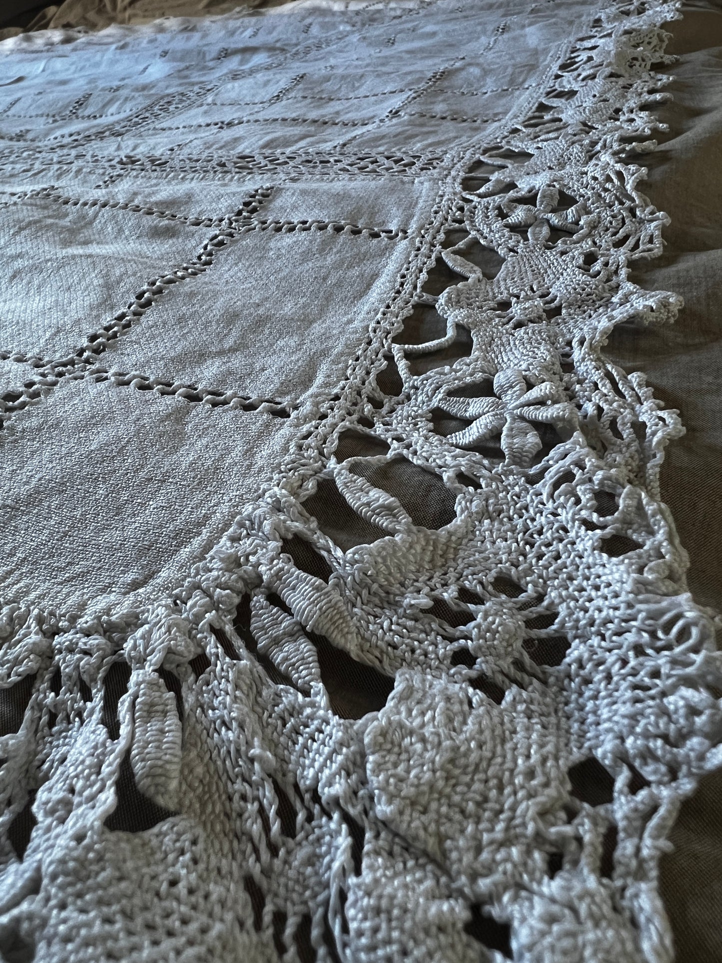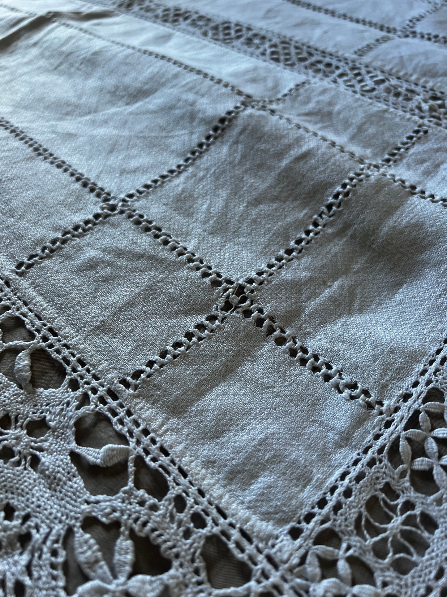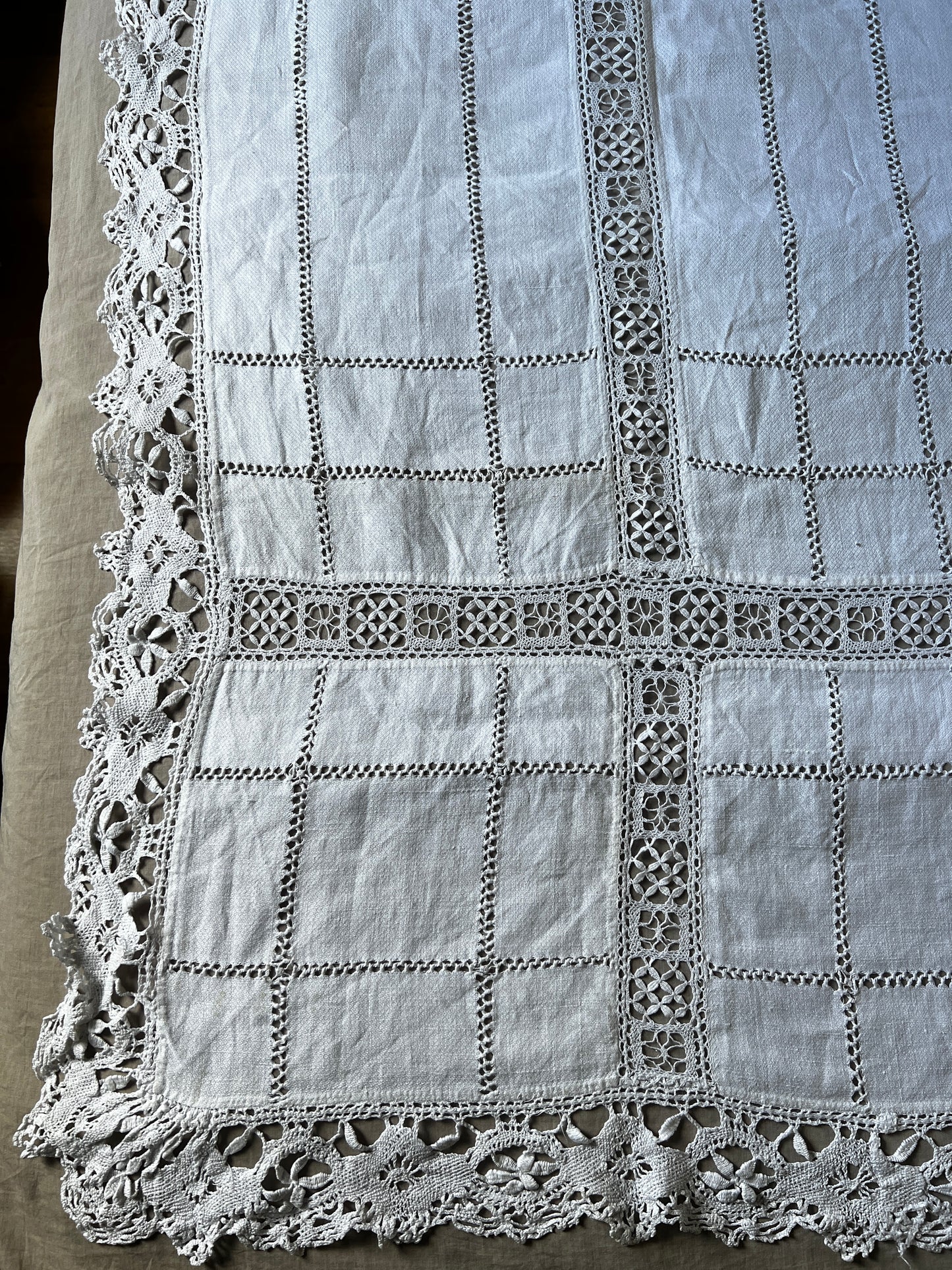 リネン地にボビンレースがインサートされドロンワークでデザインされた大判クロスです