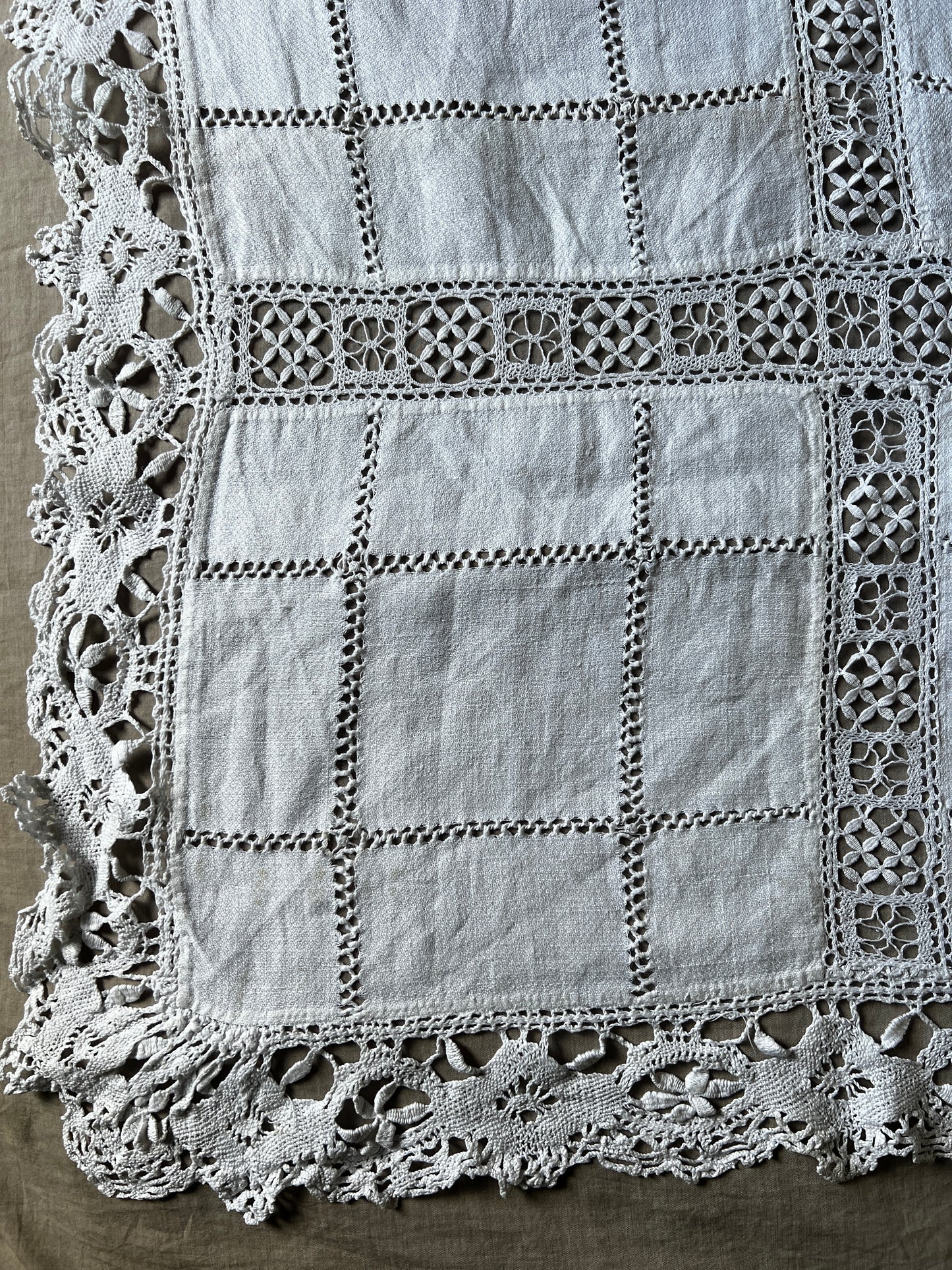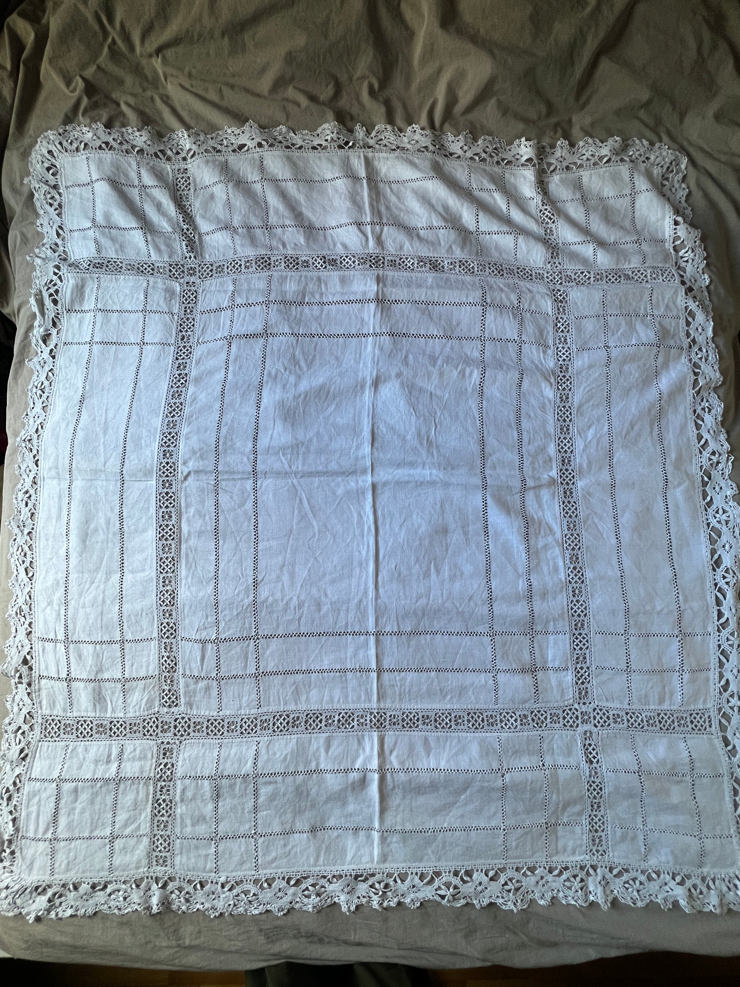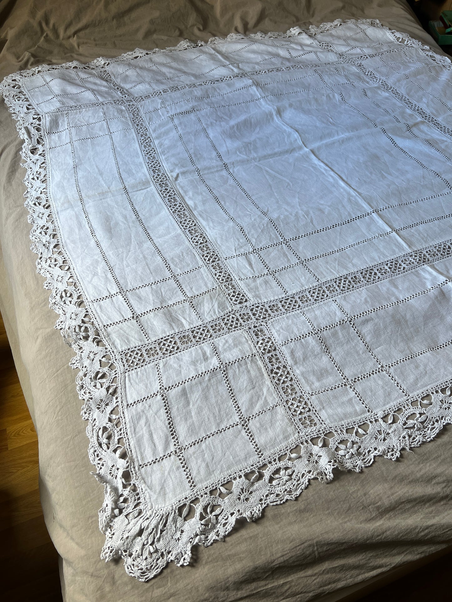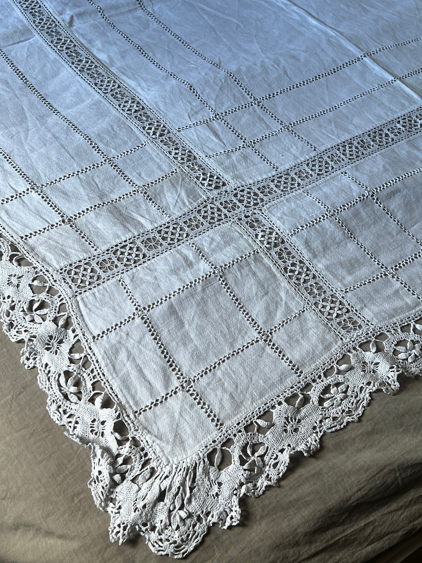 リネン地にボビンレースがインサートされドロンワークでデザインされた大判クロスです