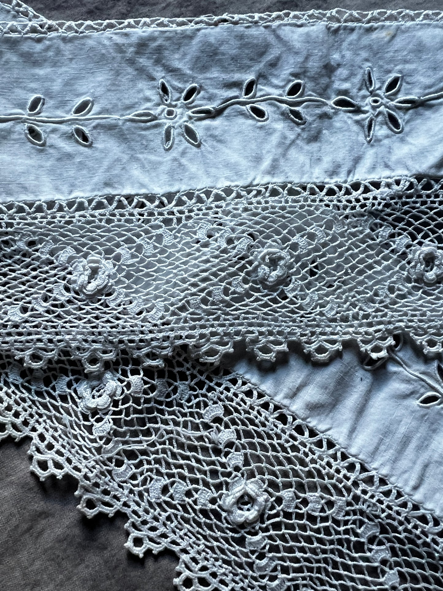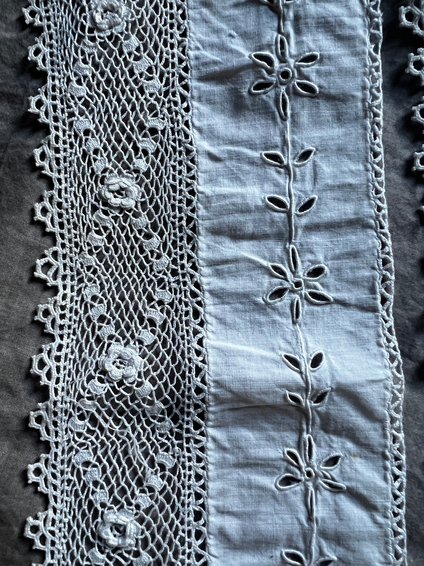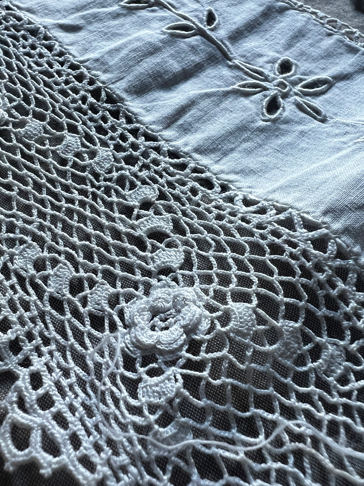 カットワーク刺繍の布地にクロシェレースが合わさったデザインの飾り布です