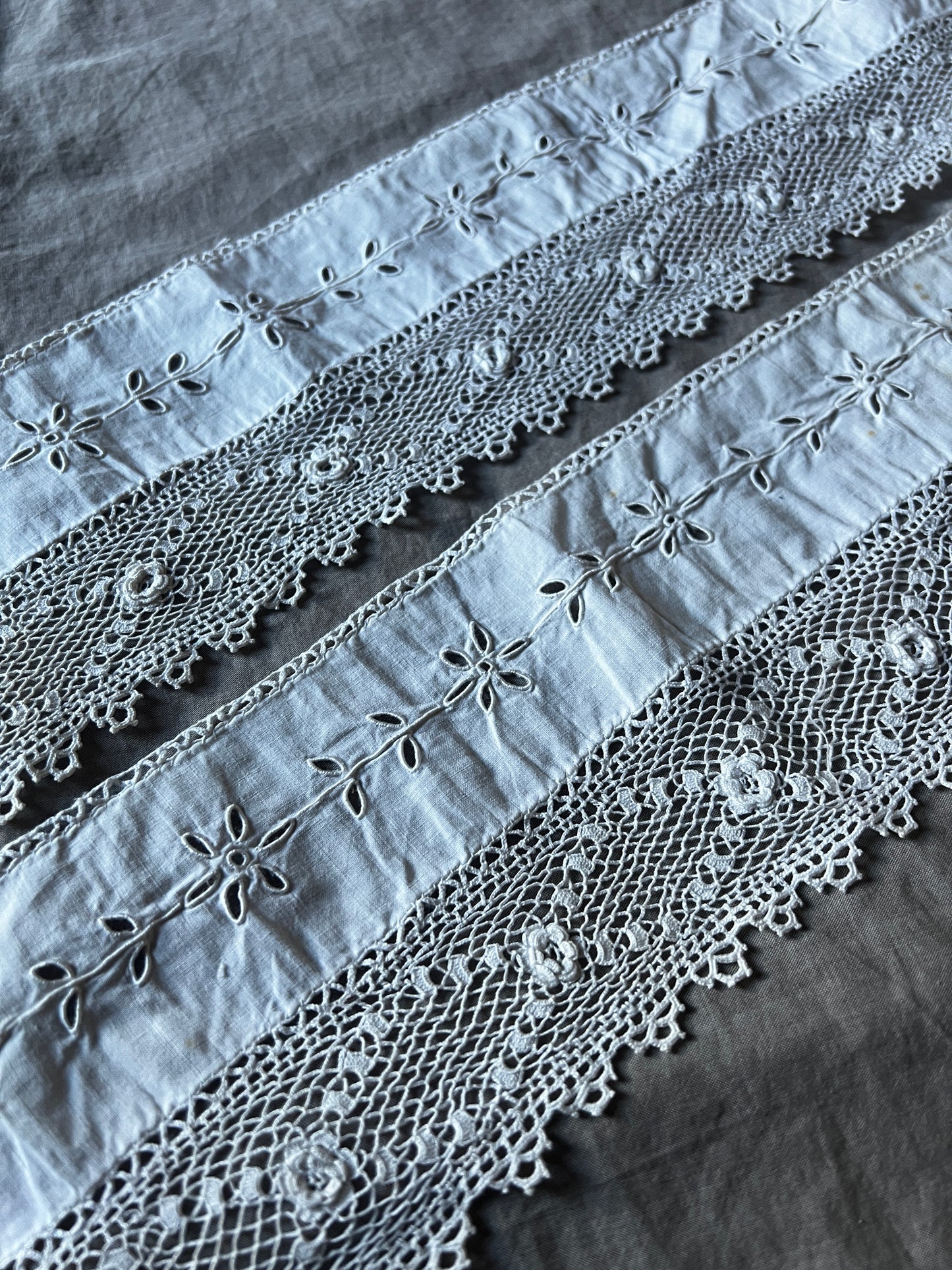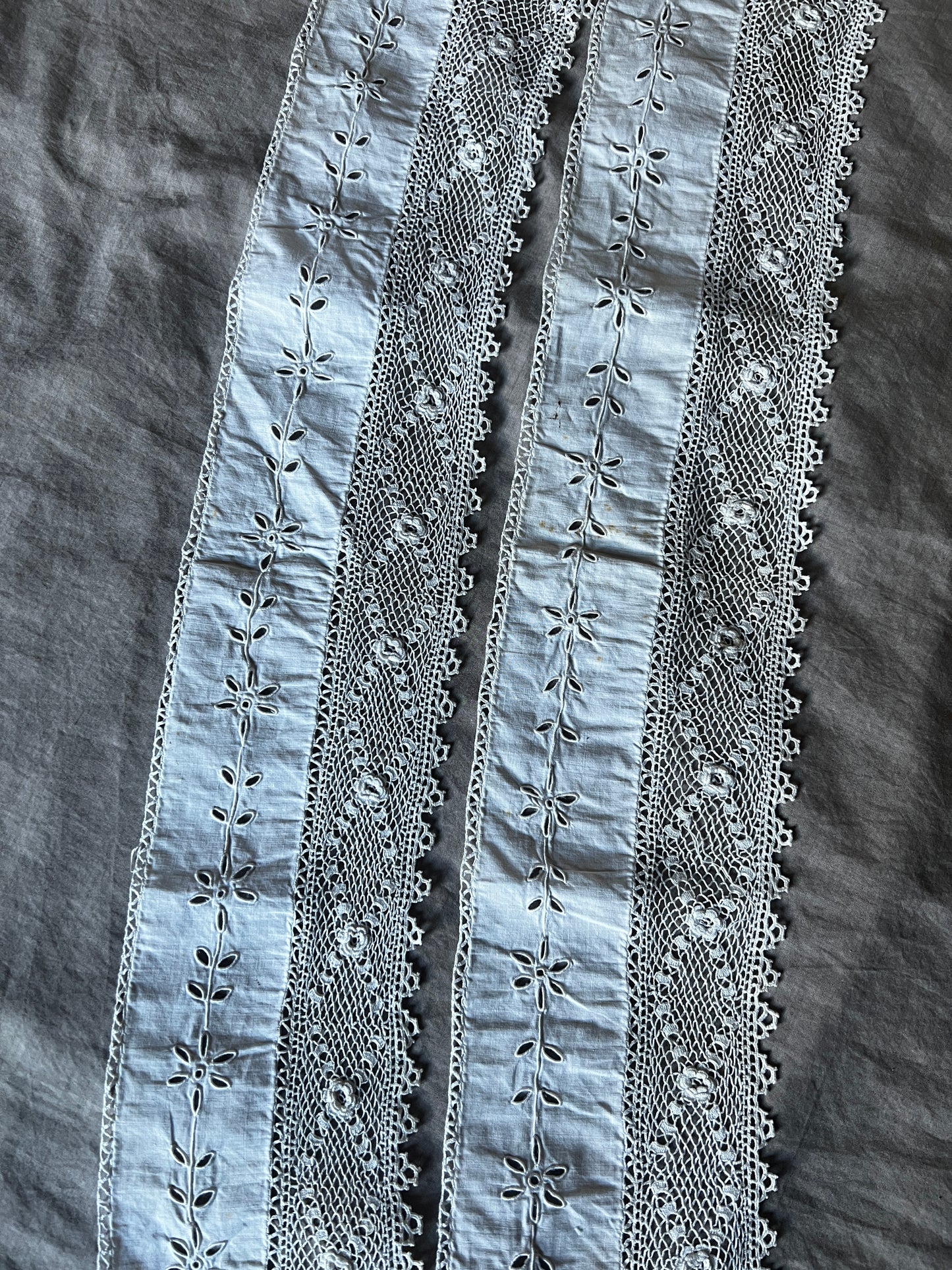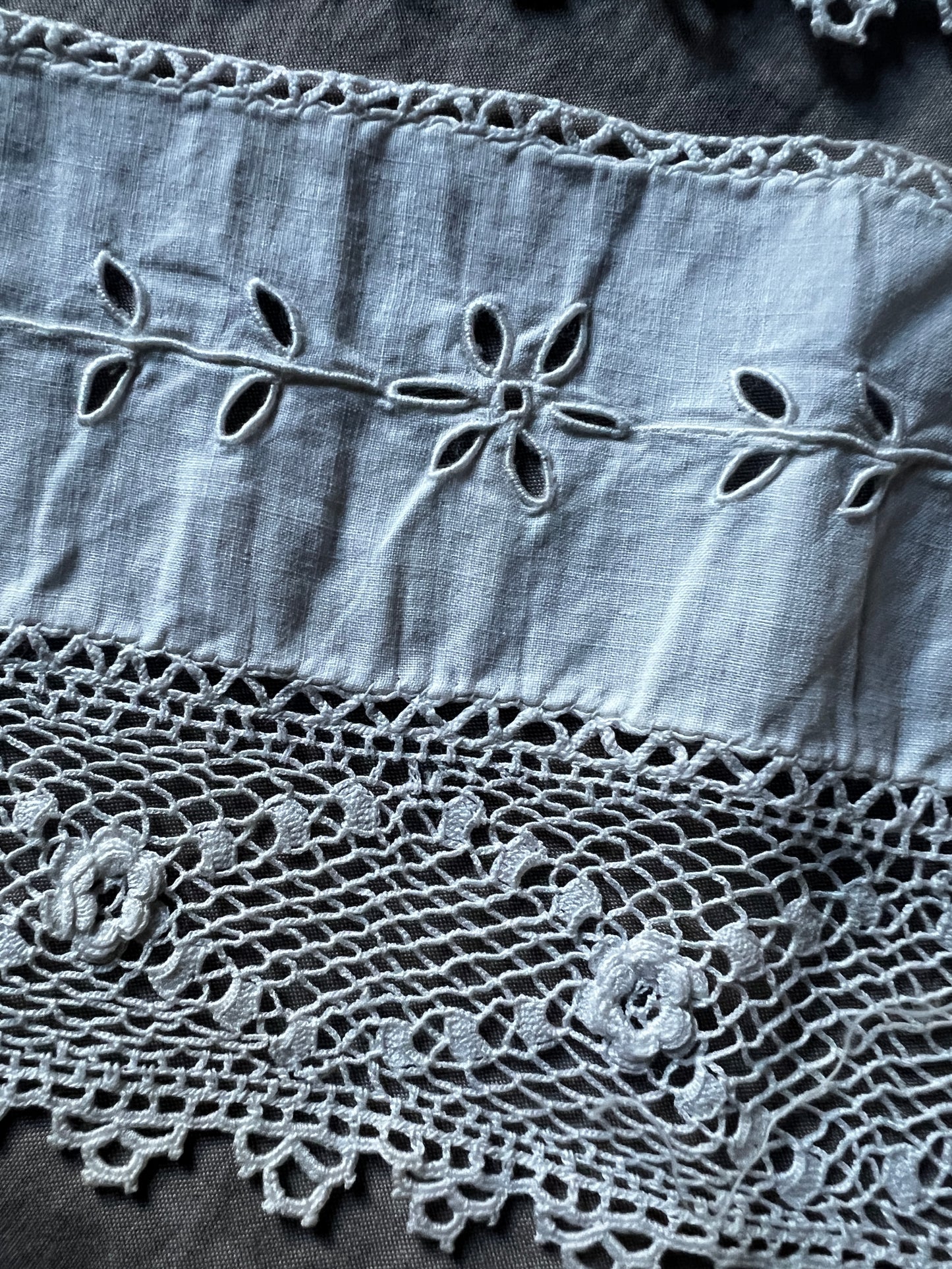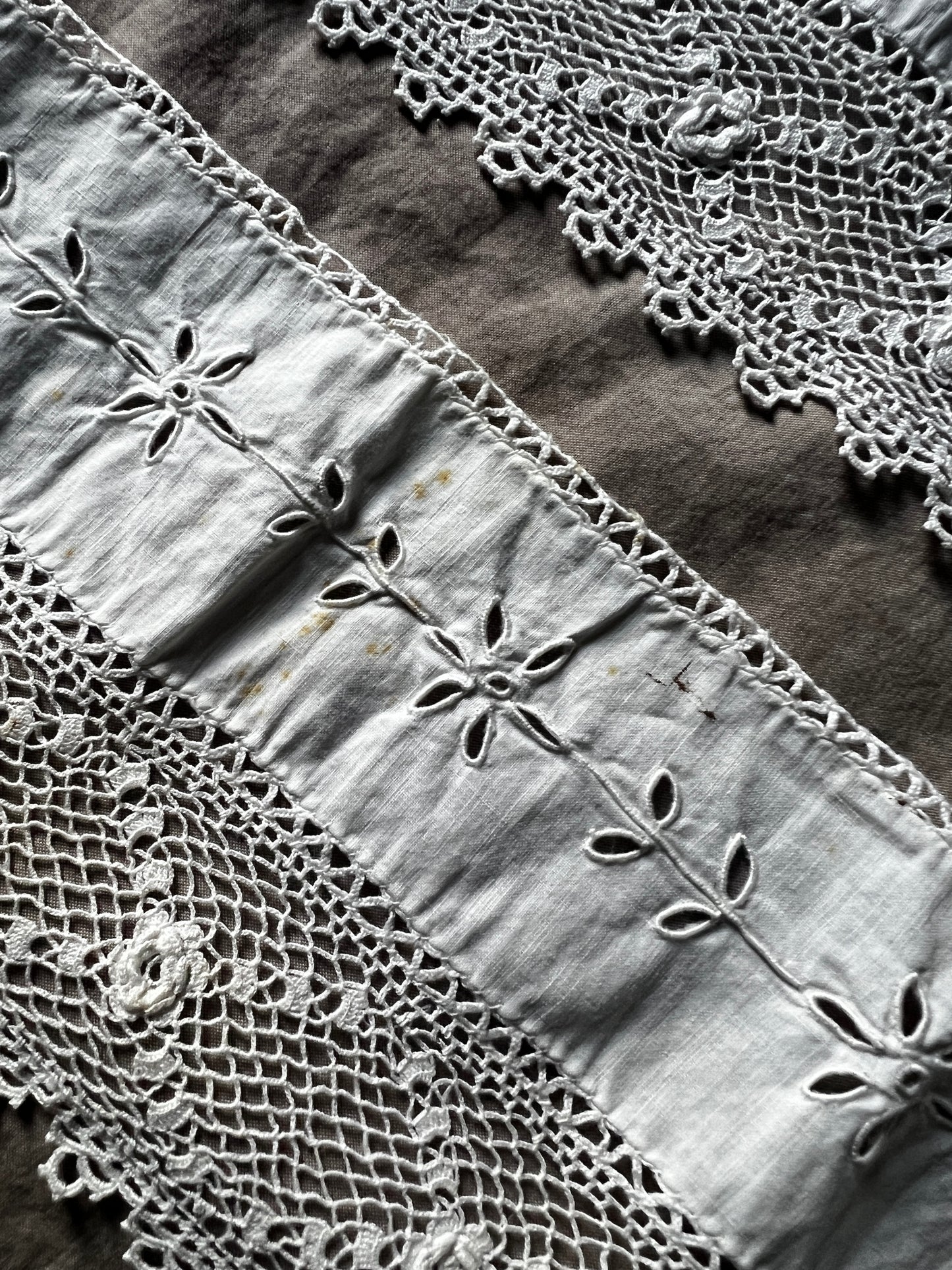 カットワーク刺繍の布地にクロシェレースが合わさったデザインの飾り布です