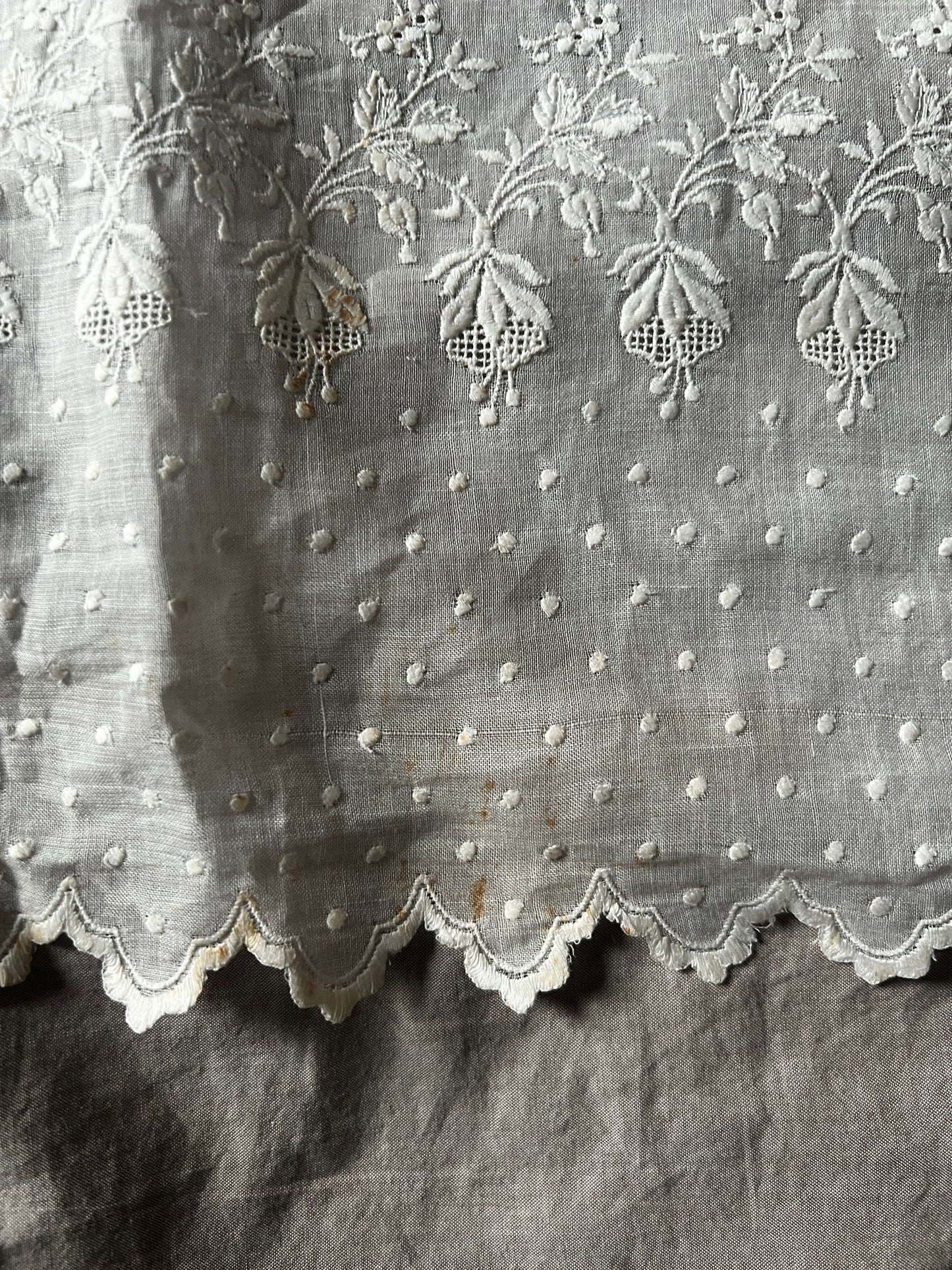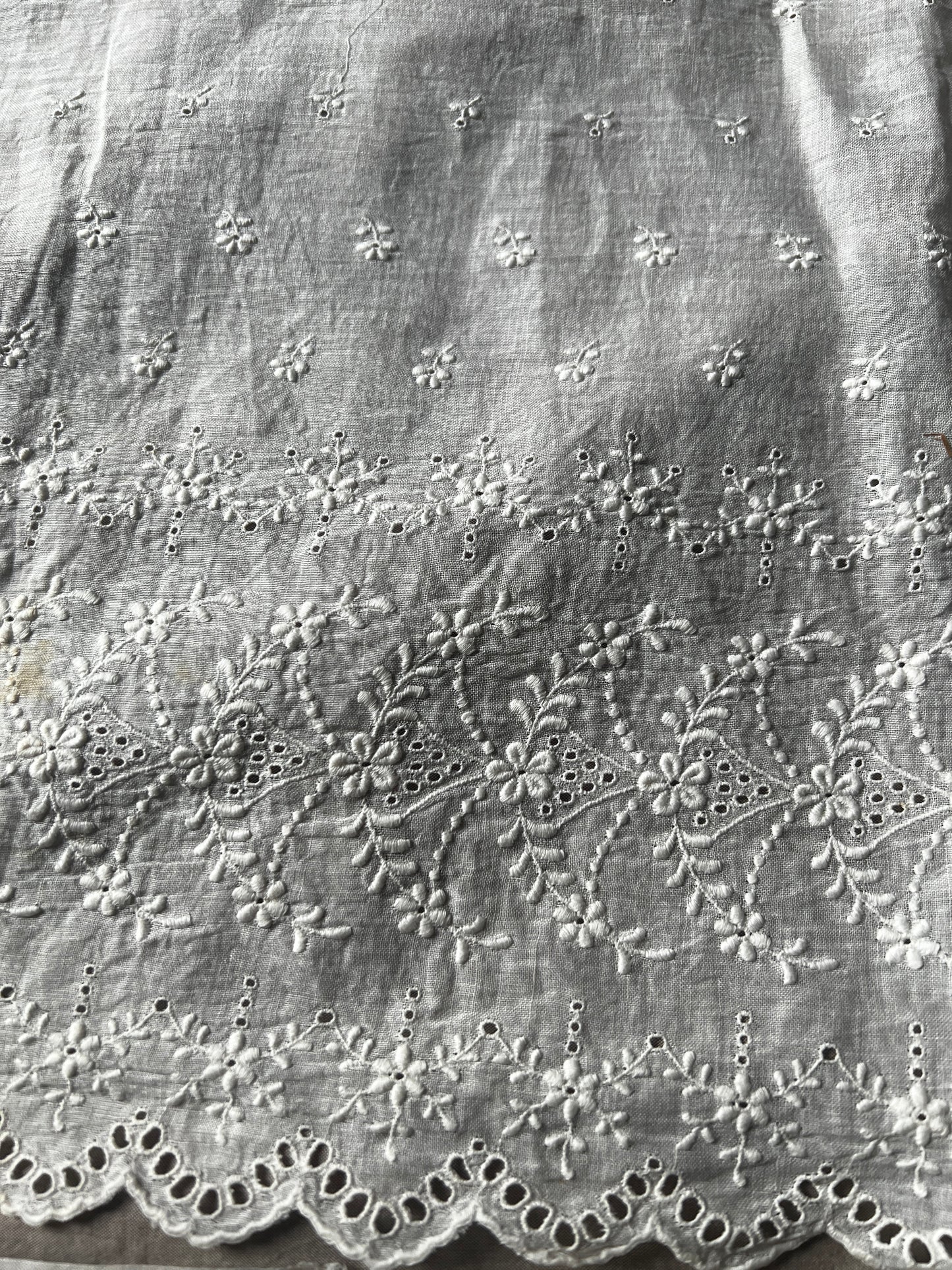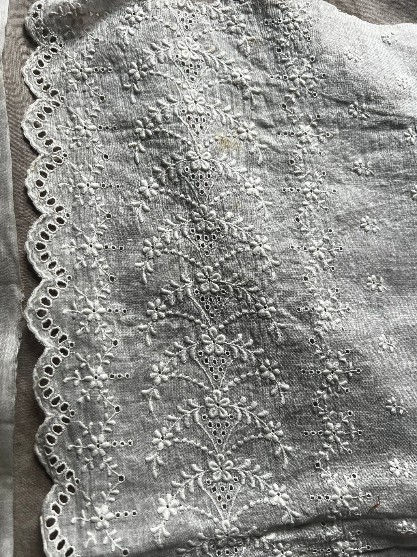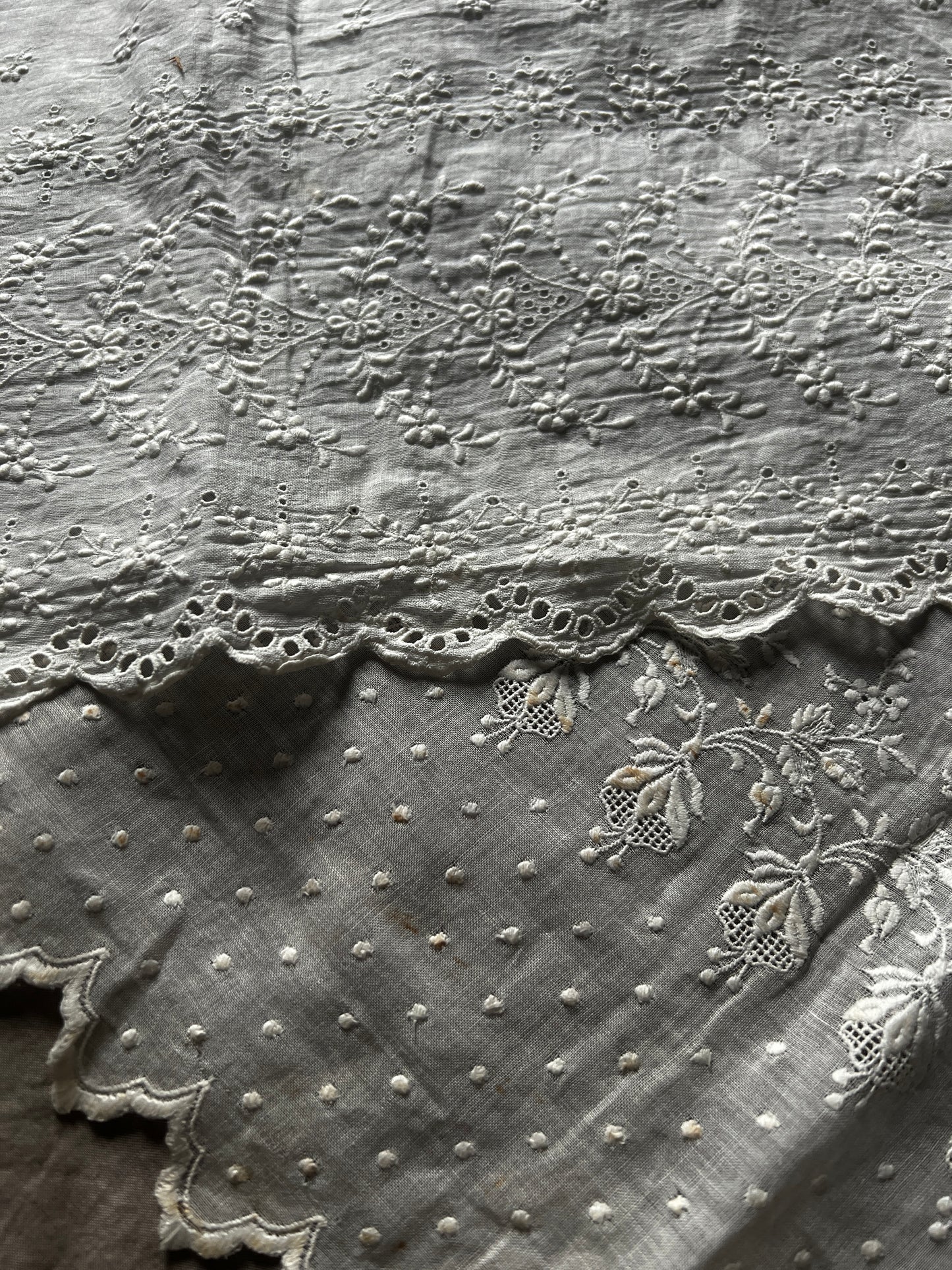 透けるような薄さのコットンローン地に白糸で刺繍が施された端布2種のセットです