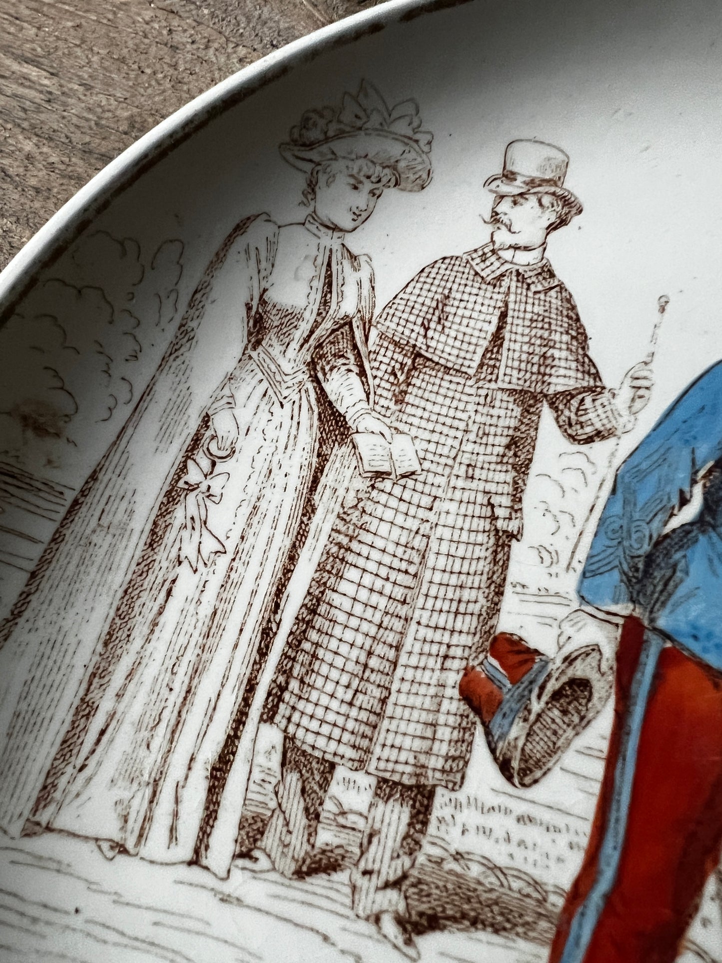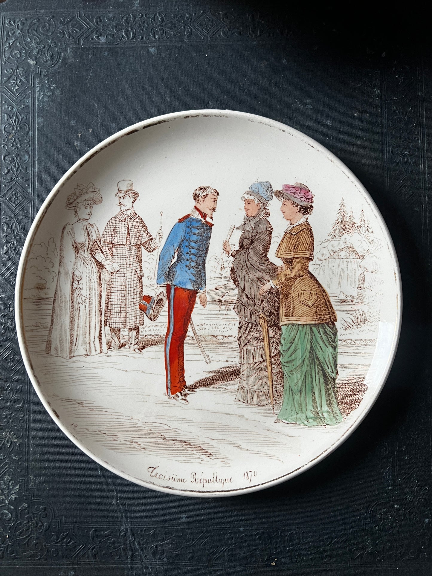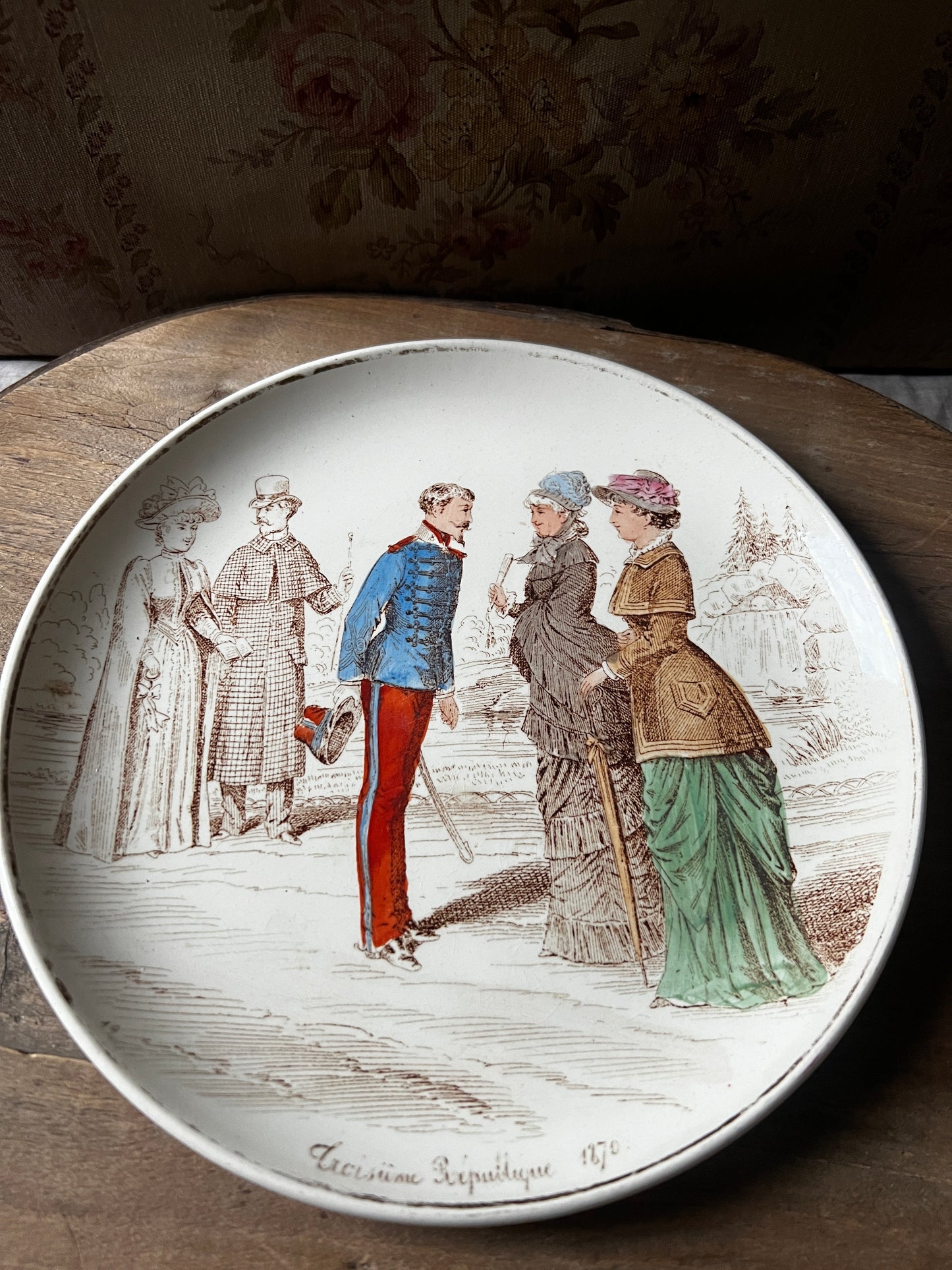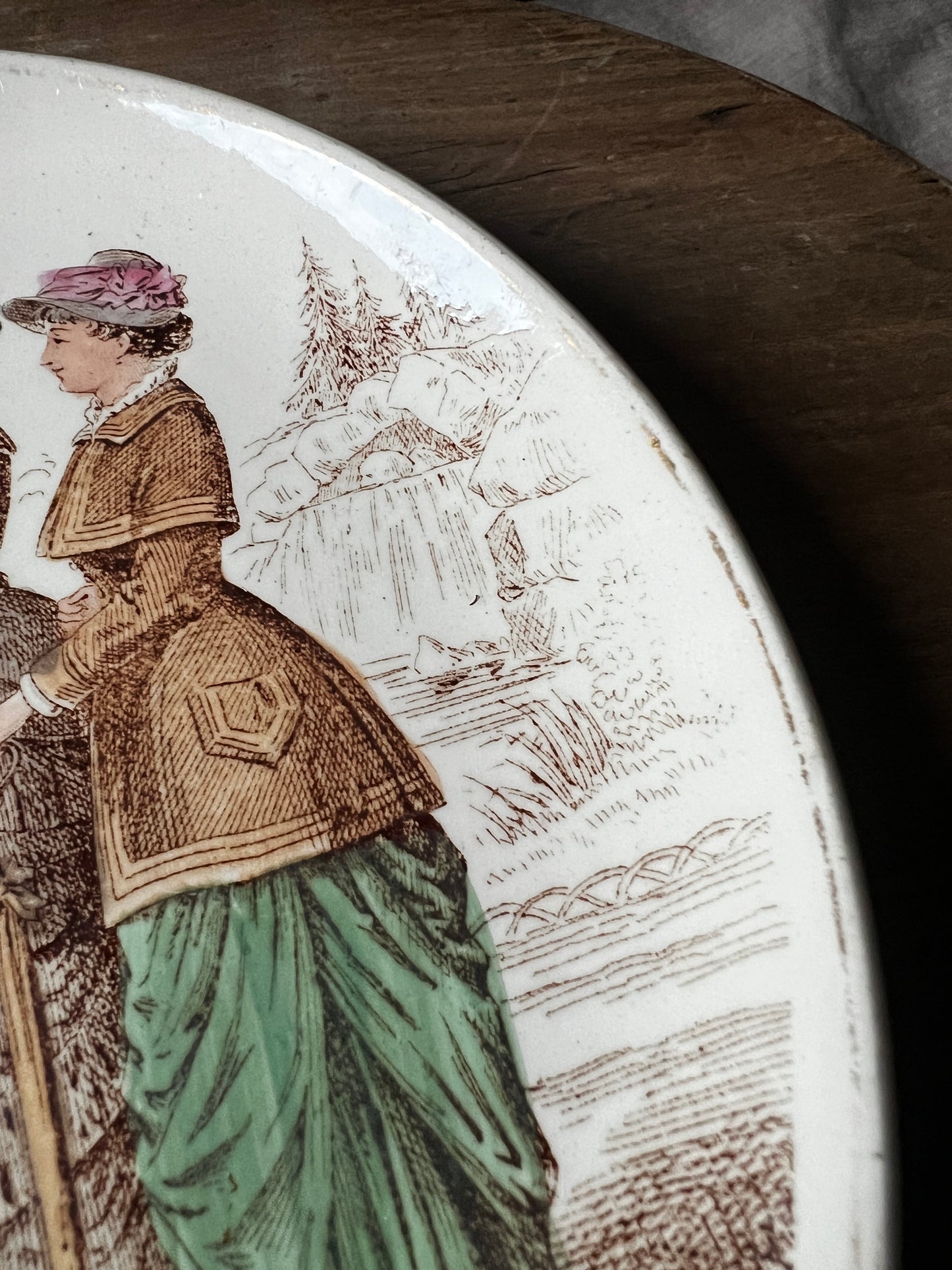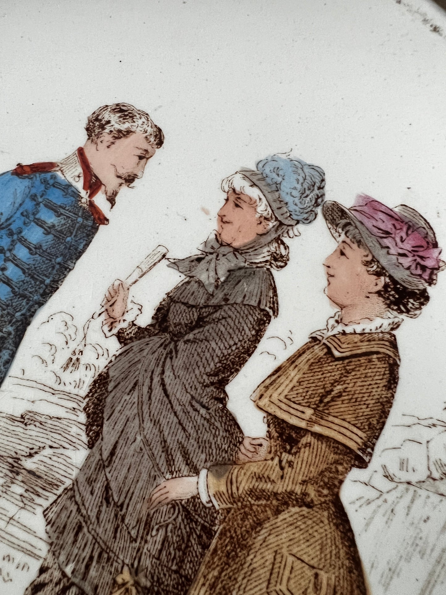 優しく上品なタッチで19世紀の人々の様子が描かれた古いお皿です