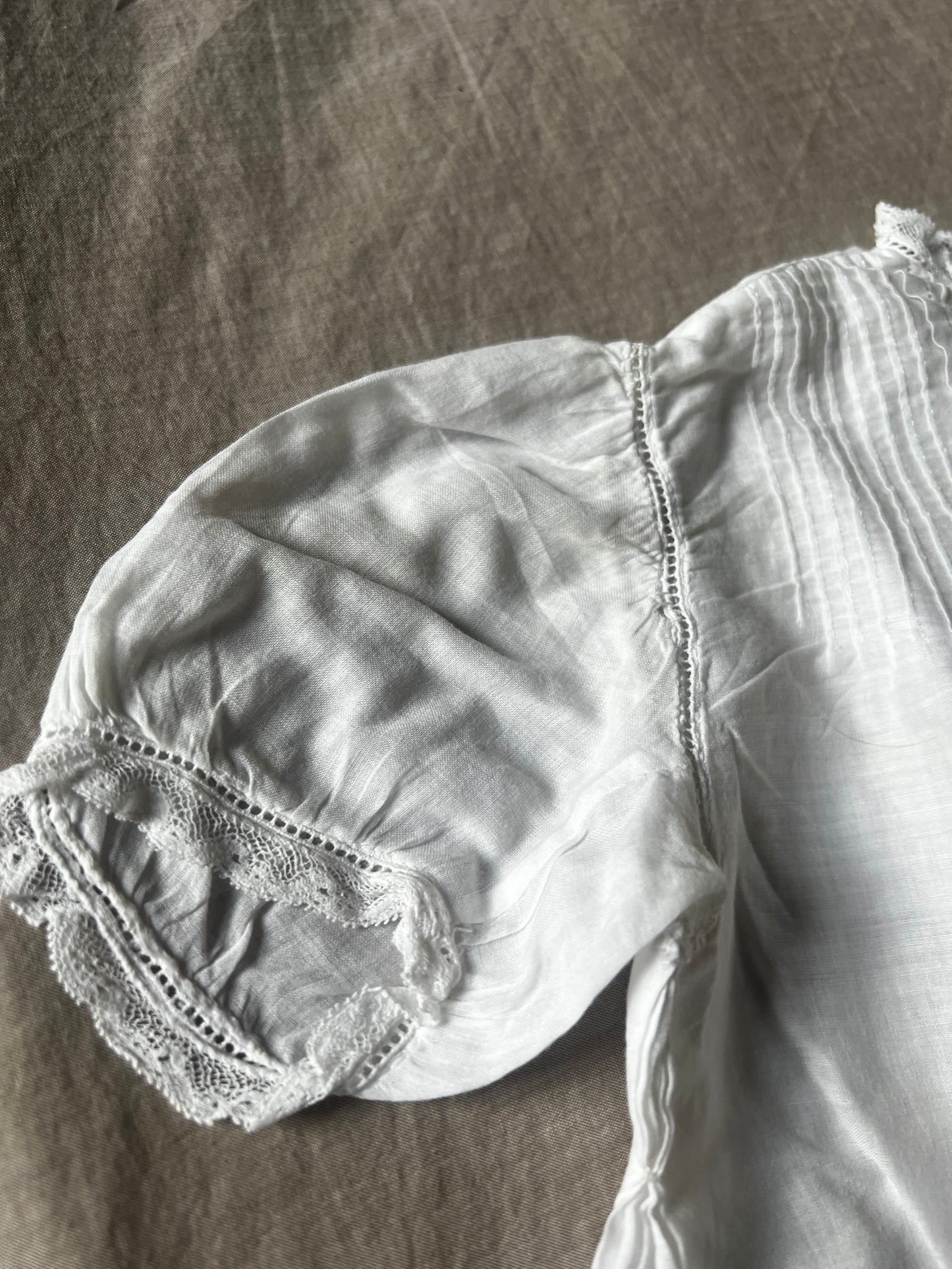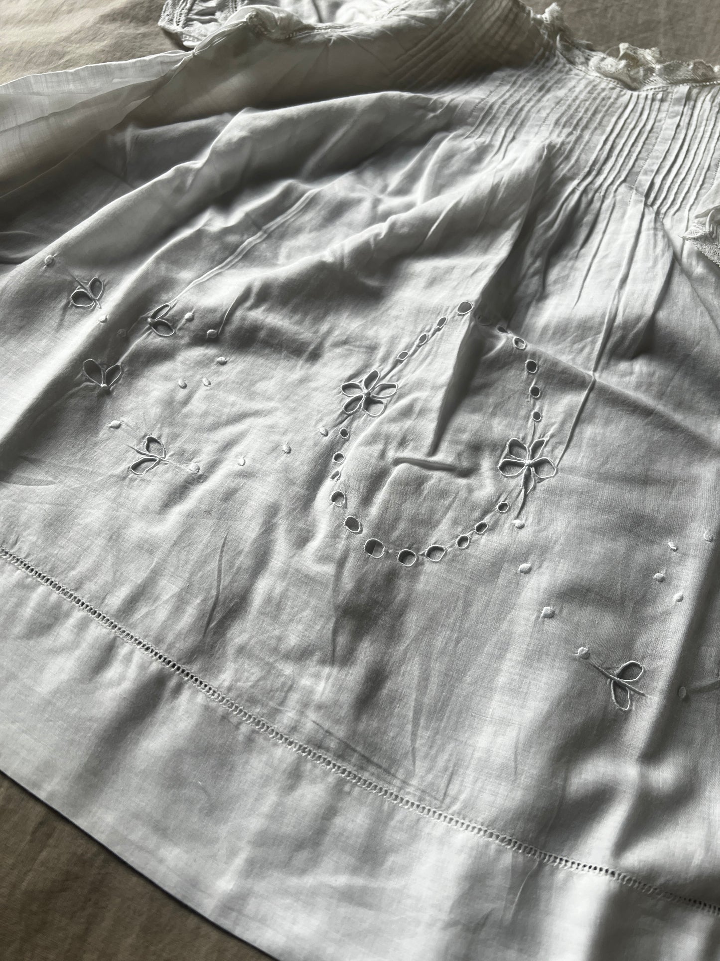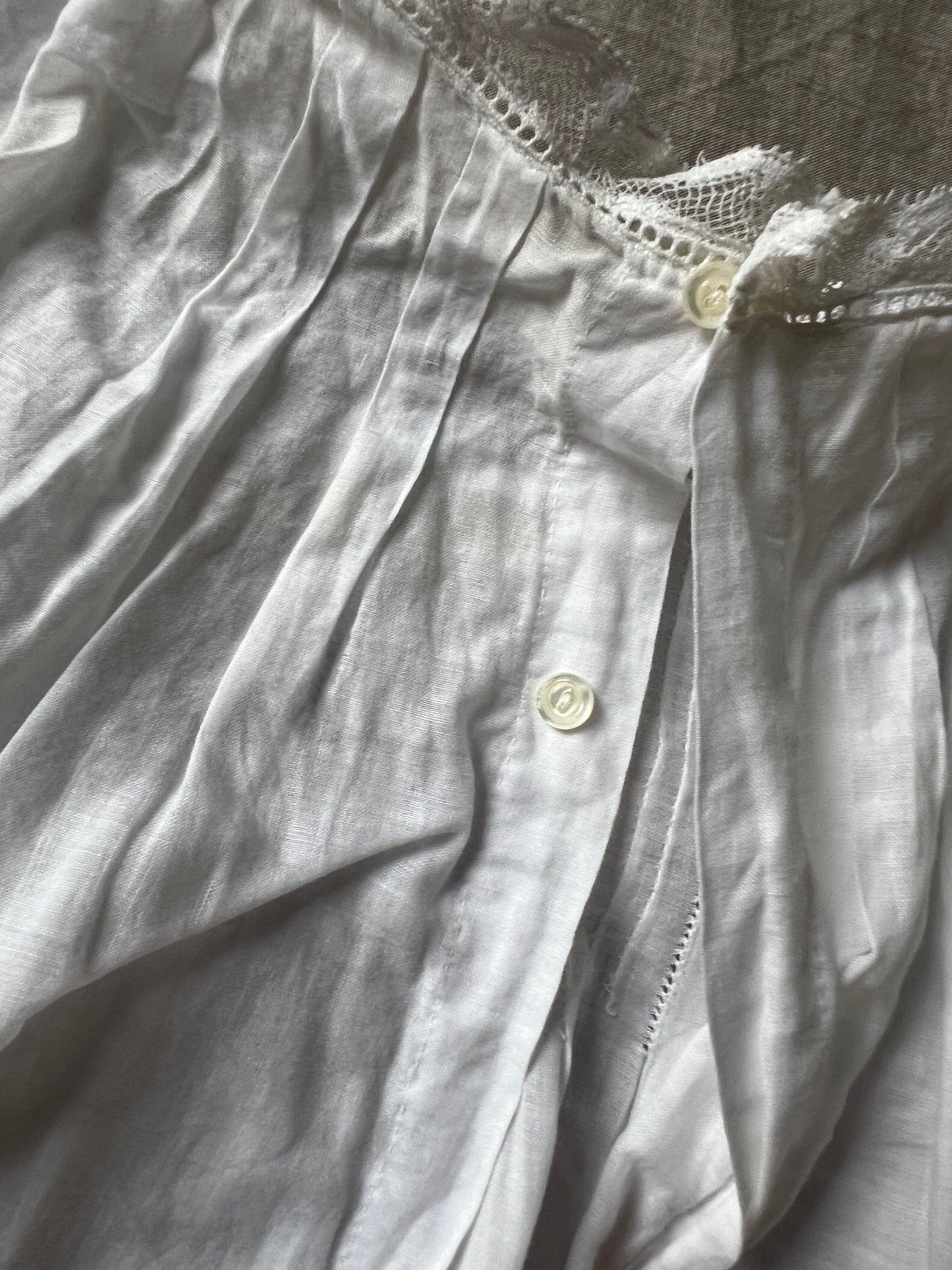首元には細いレースがあしらわれており、前裾にはカットワーク刺繍が施されています
