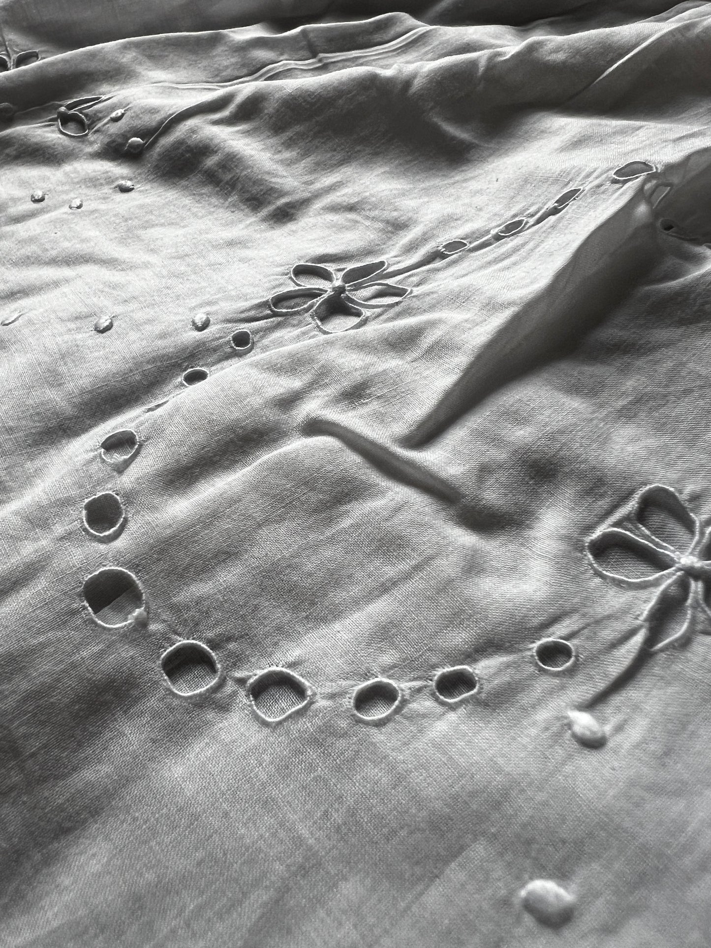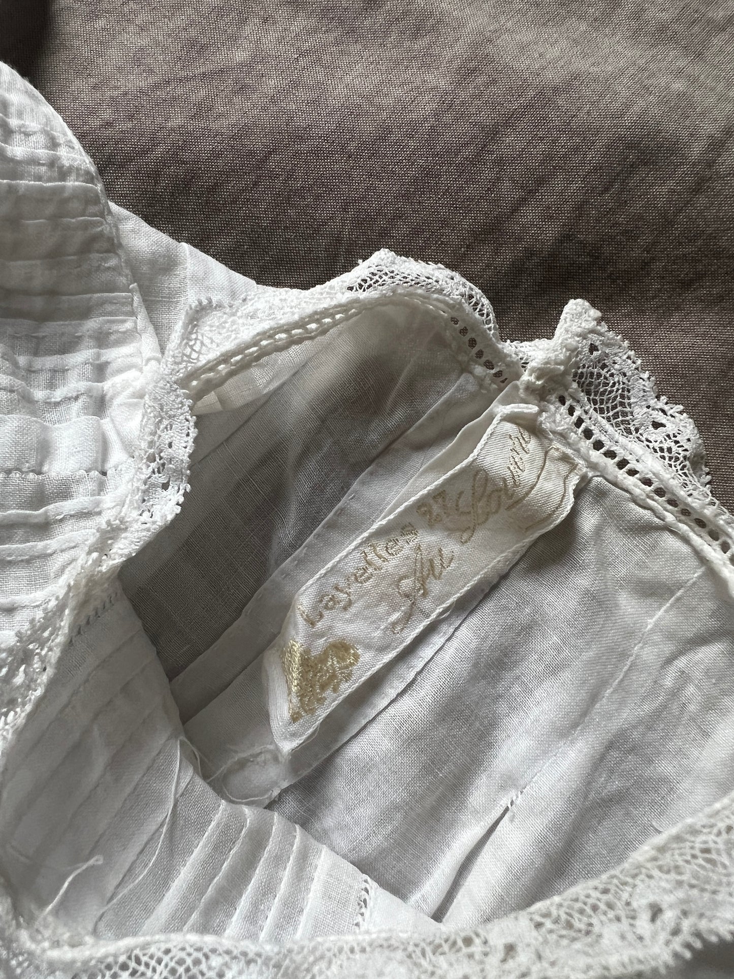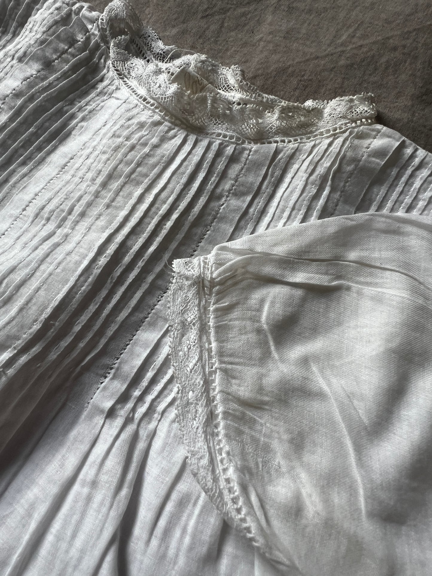 首元には細いレースがあしらわれており、前裾にはカットワーク刺繍が施されています