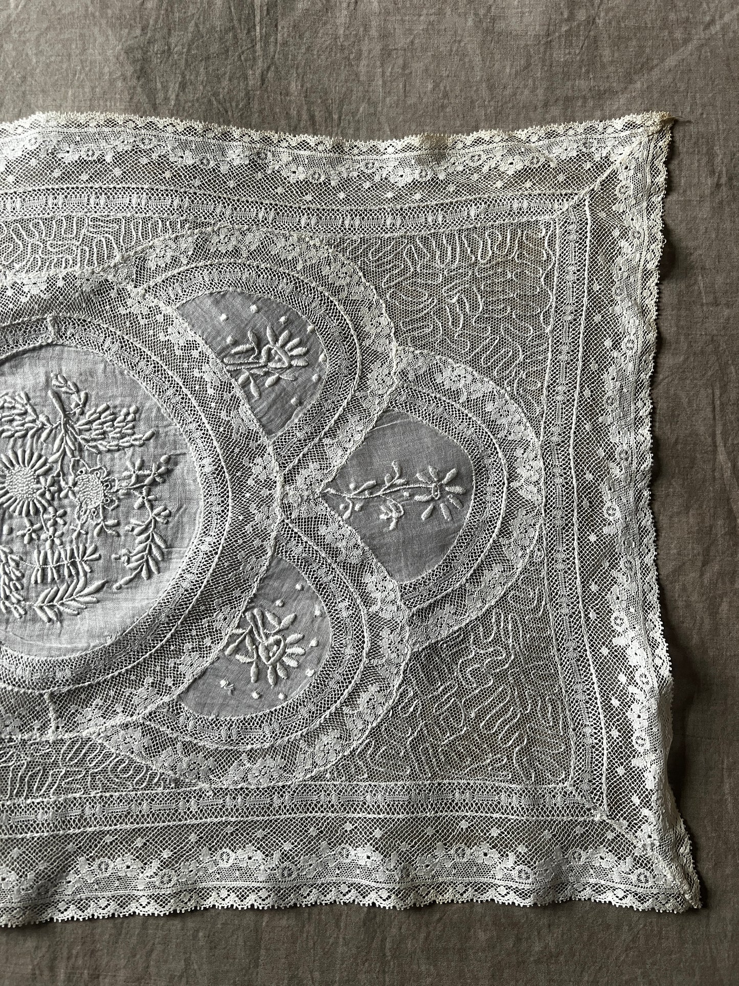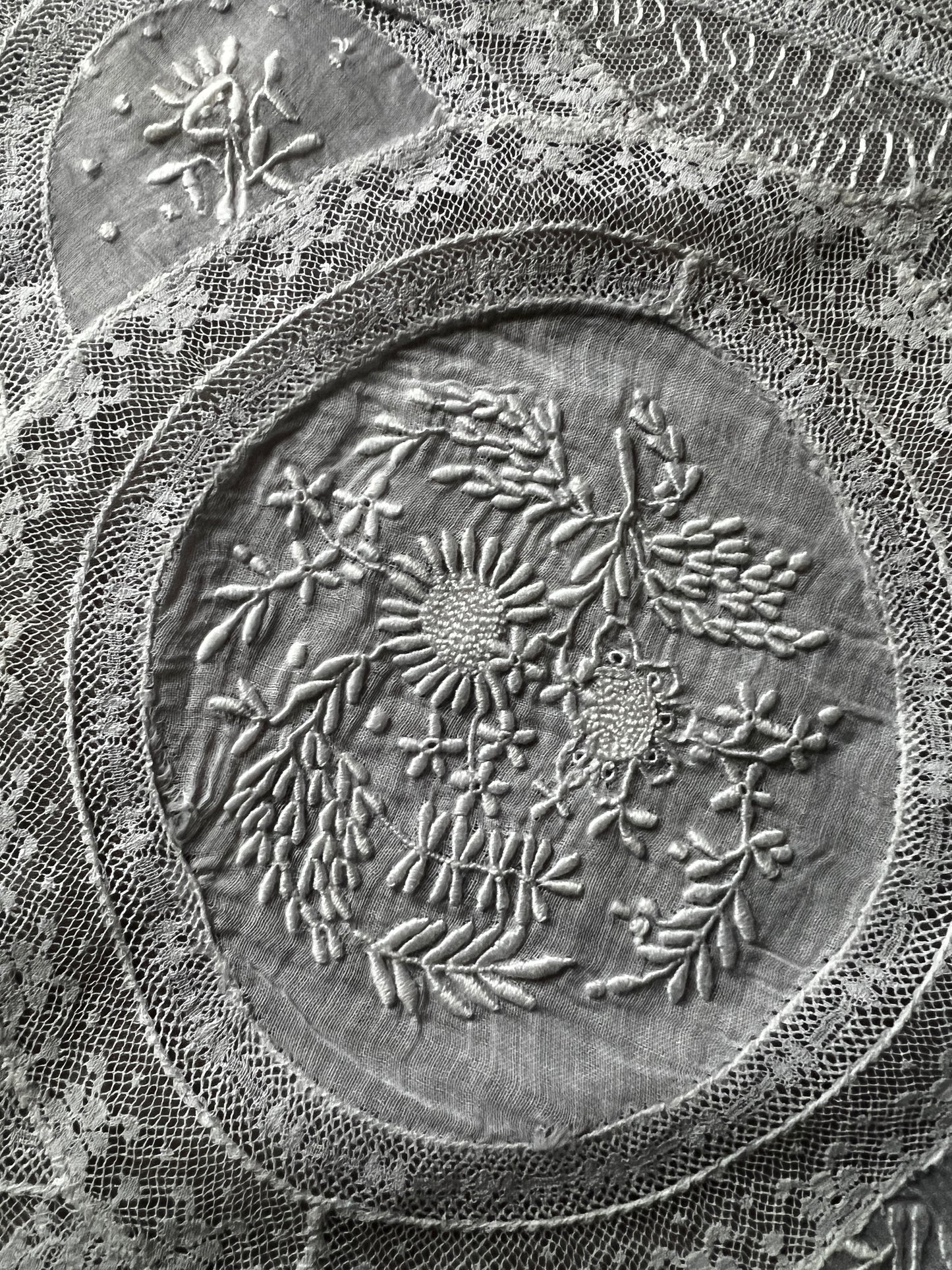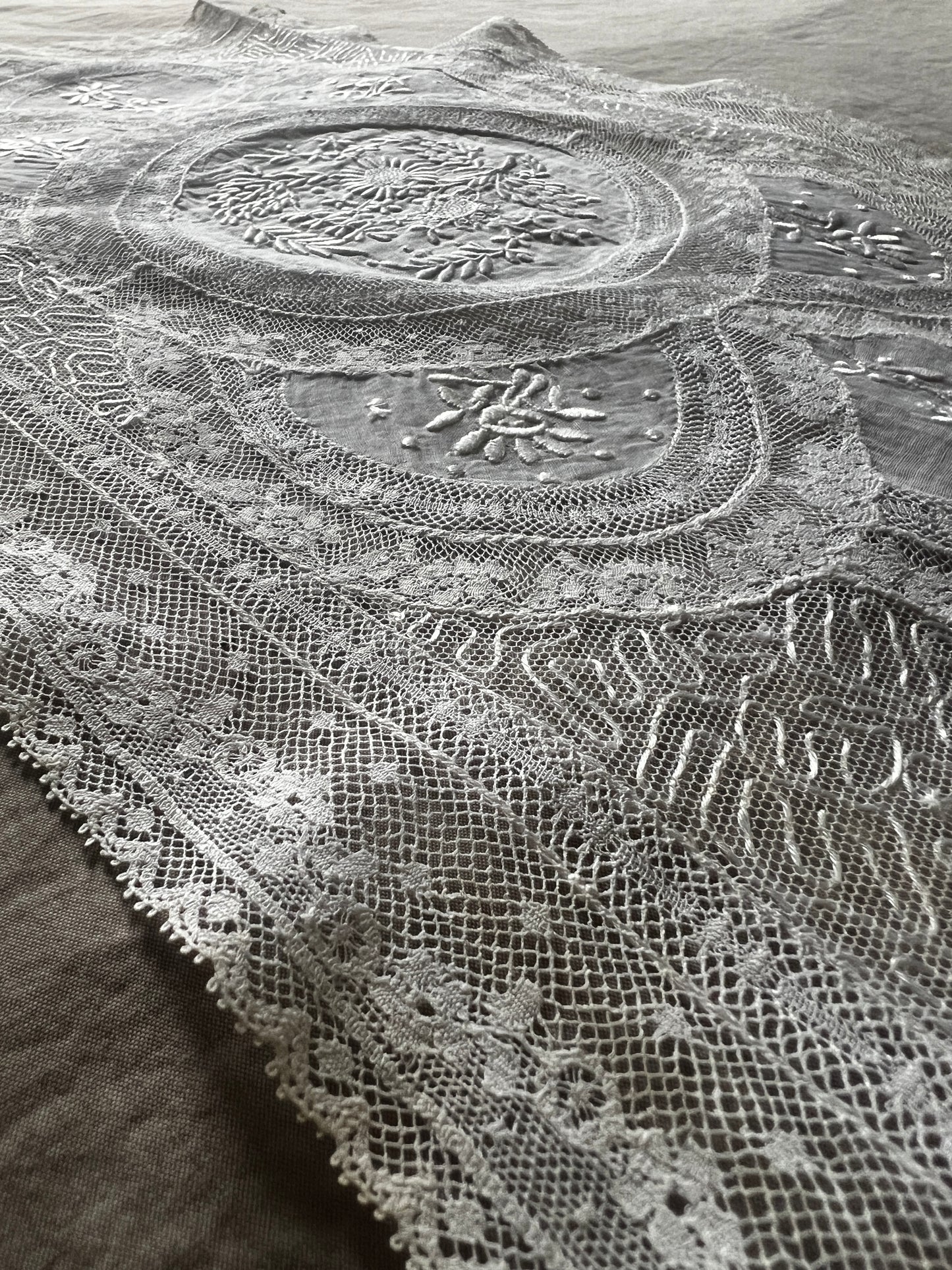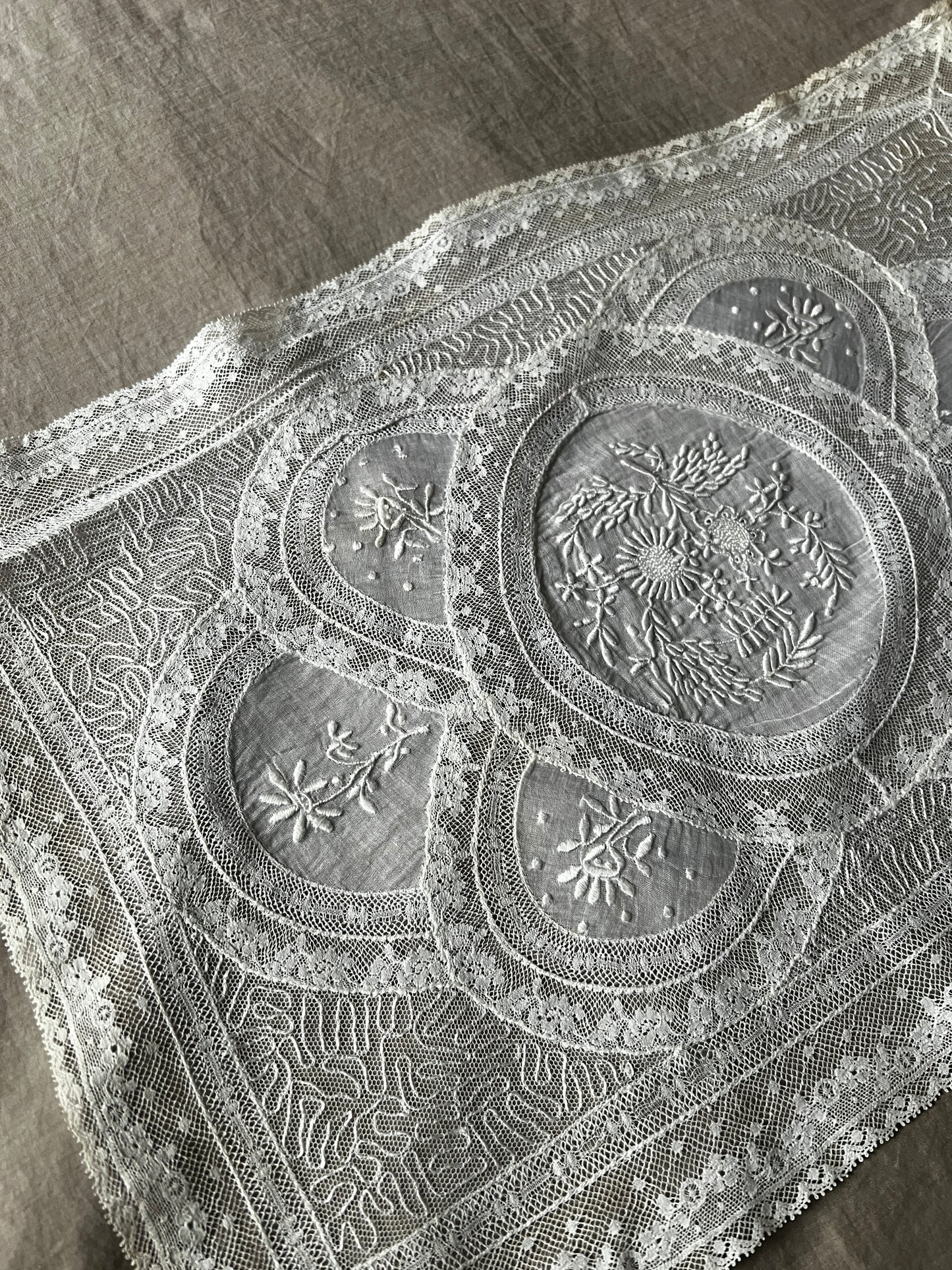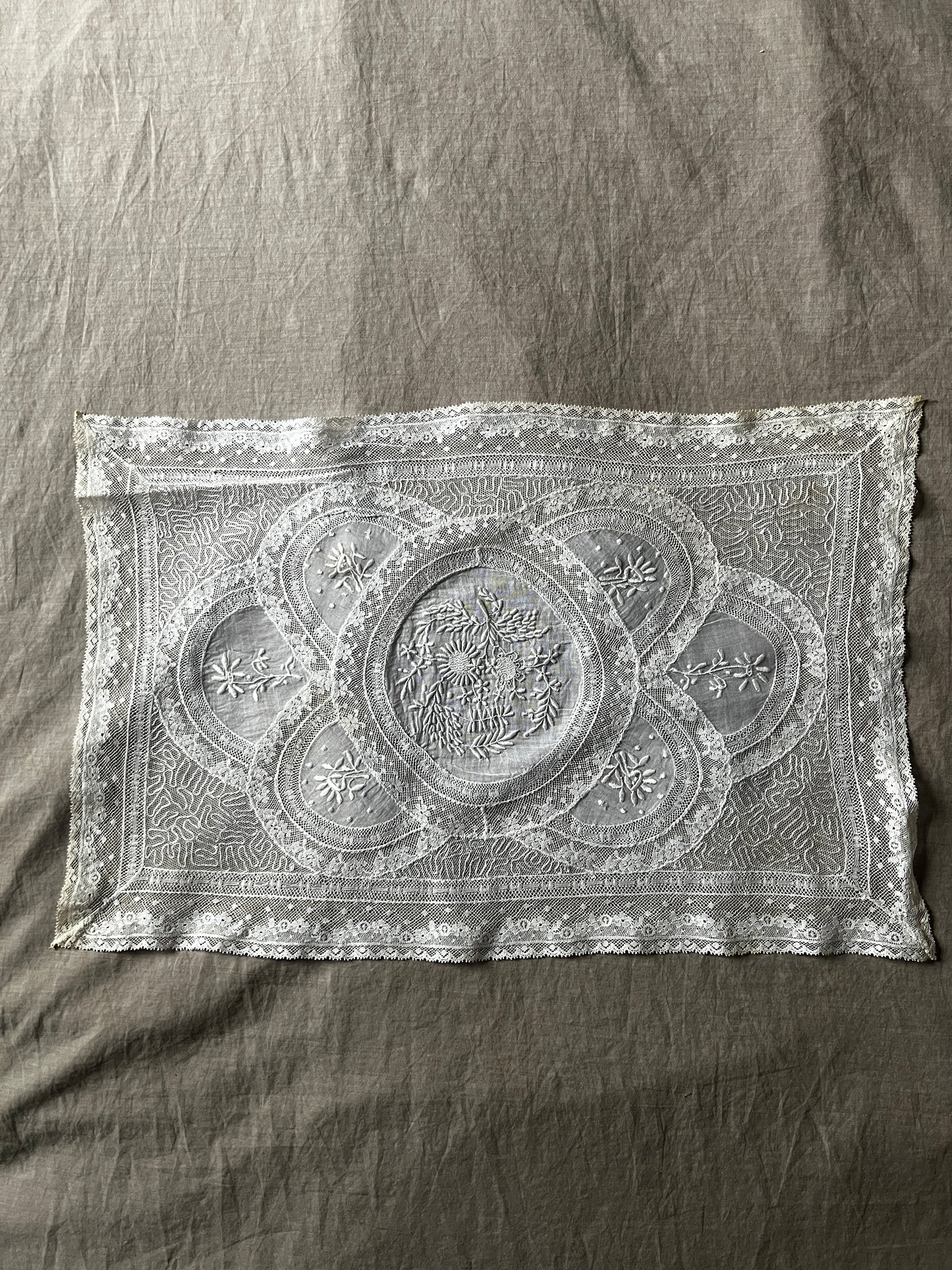 様々なレースや刺繍布をパッチワークのように組み合わせてデザインされたノルマンディレースの長方形クロスです