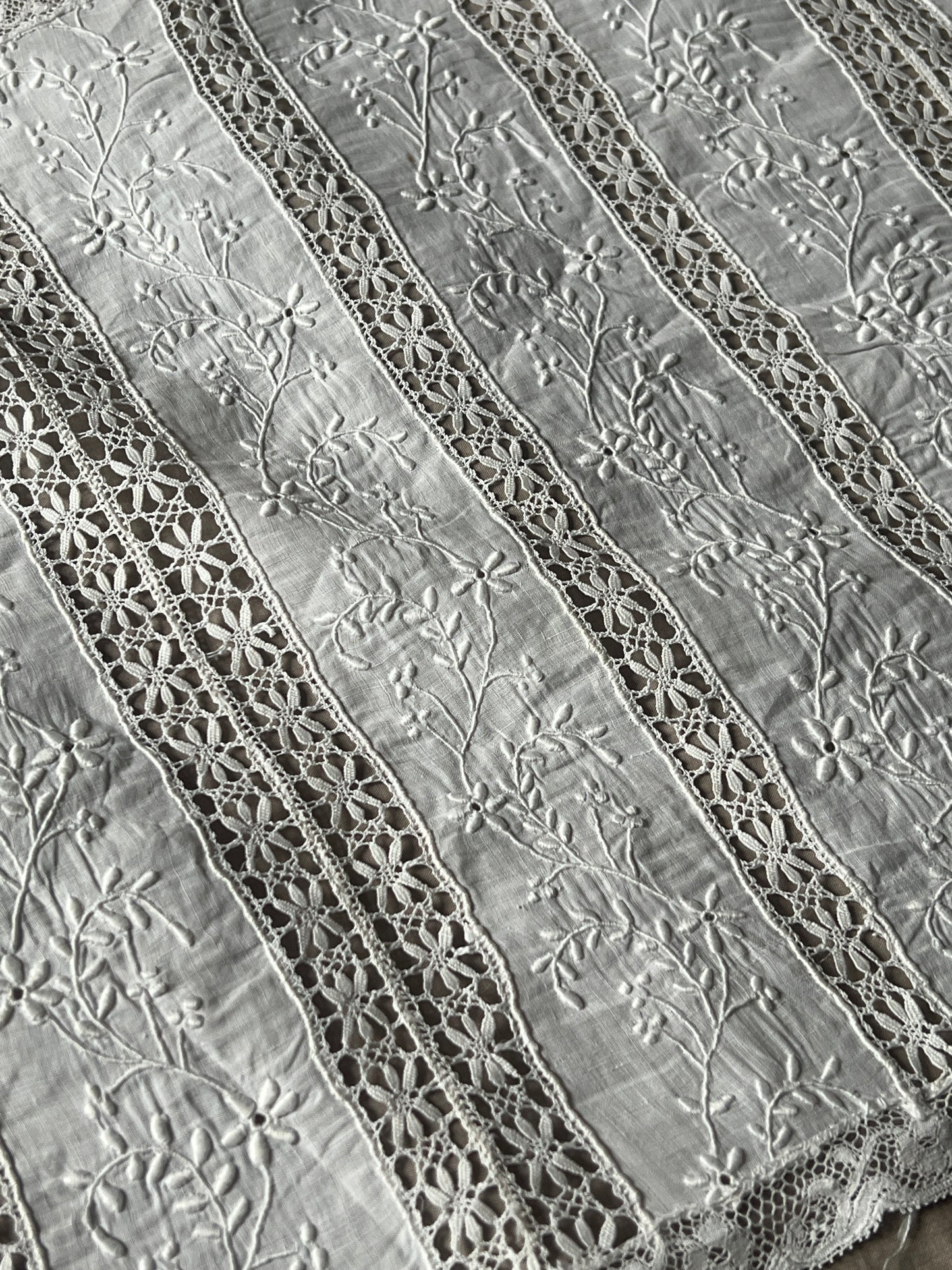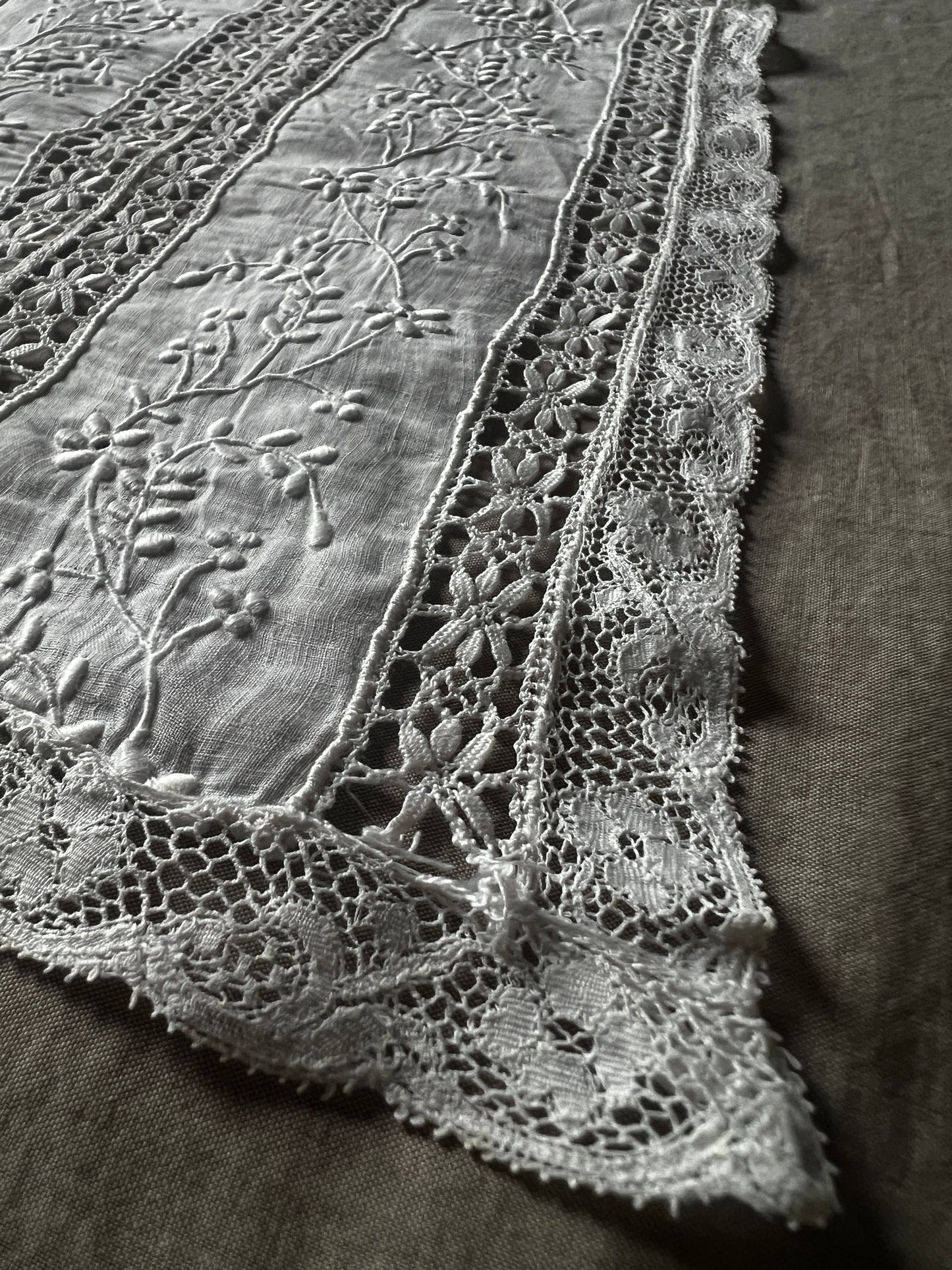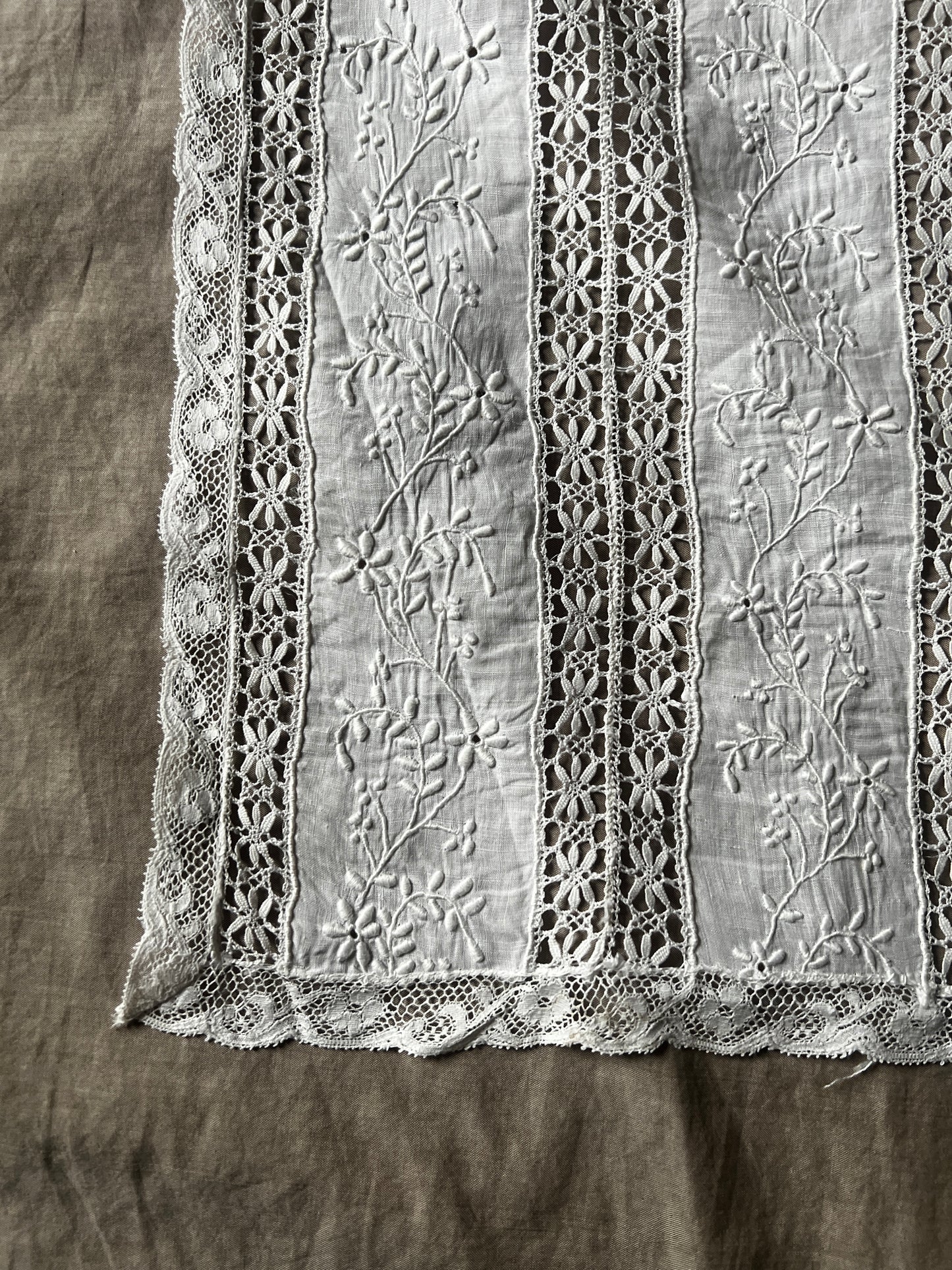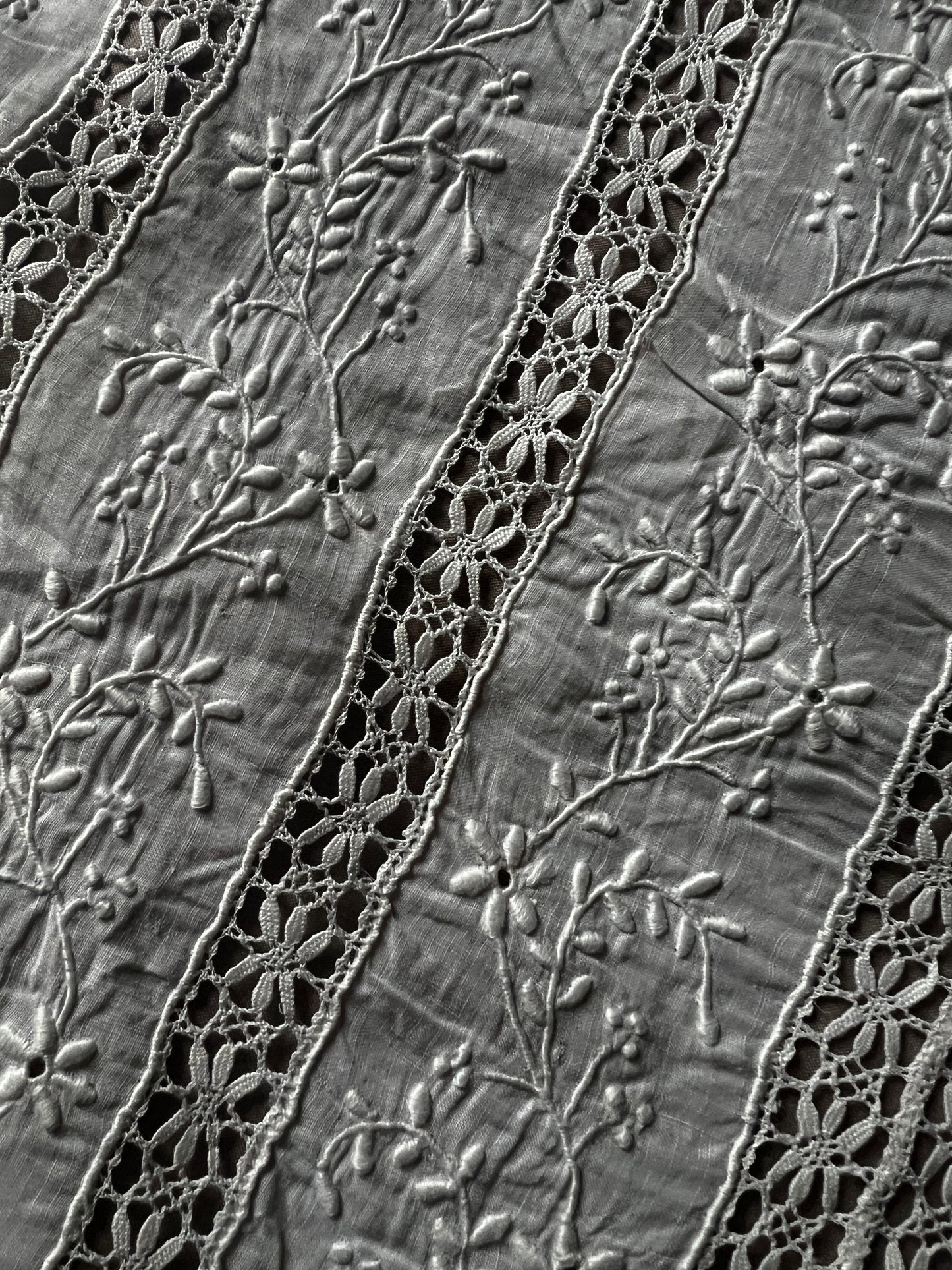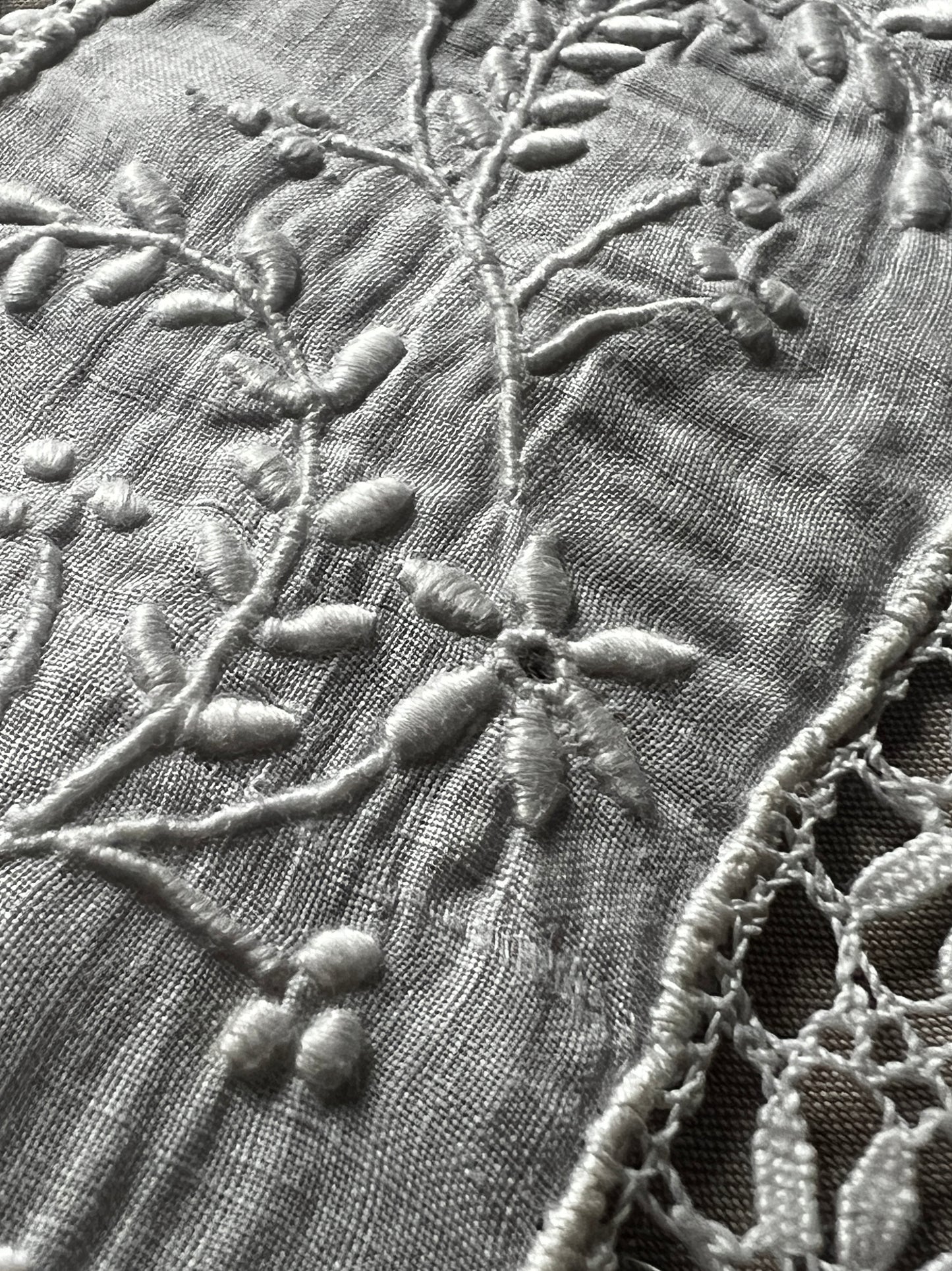 ぷっくりとした繊細なステッチの刺繍布とボビンレースでデザインされています