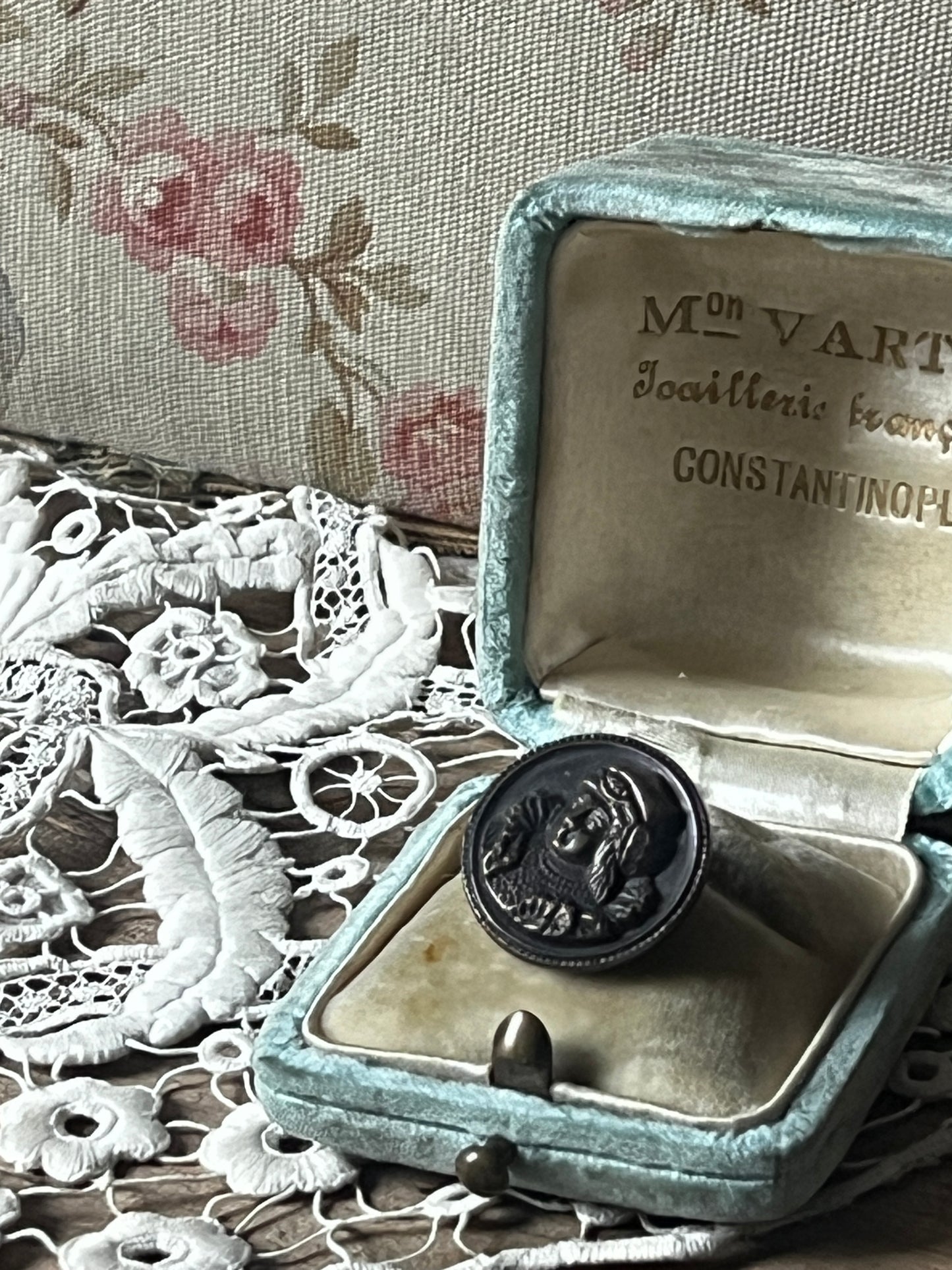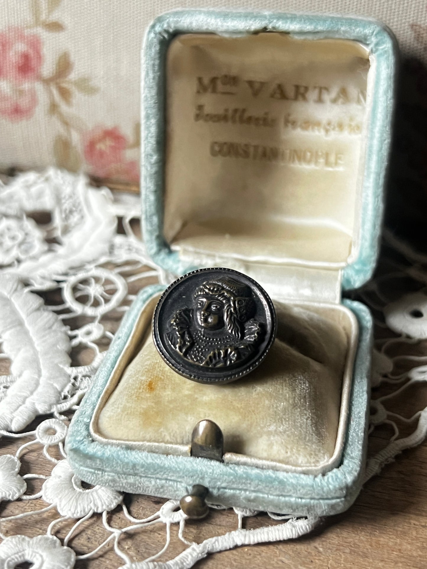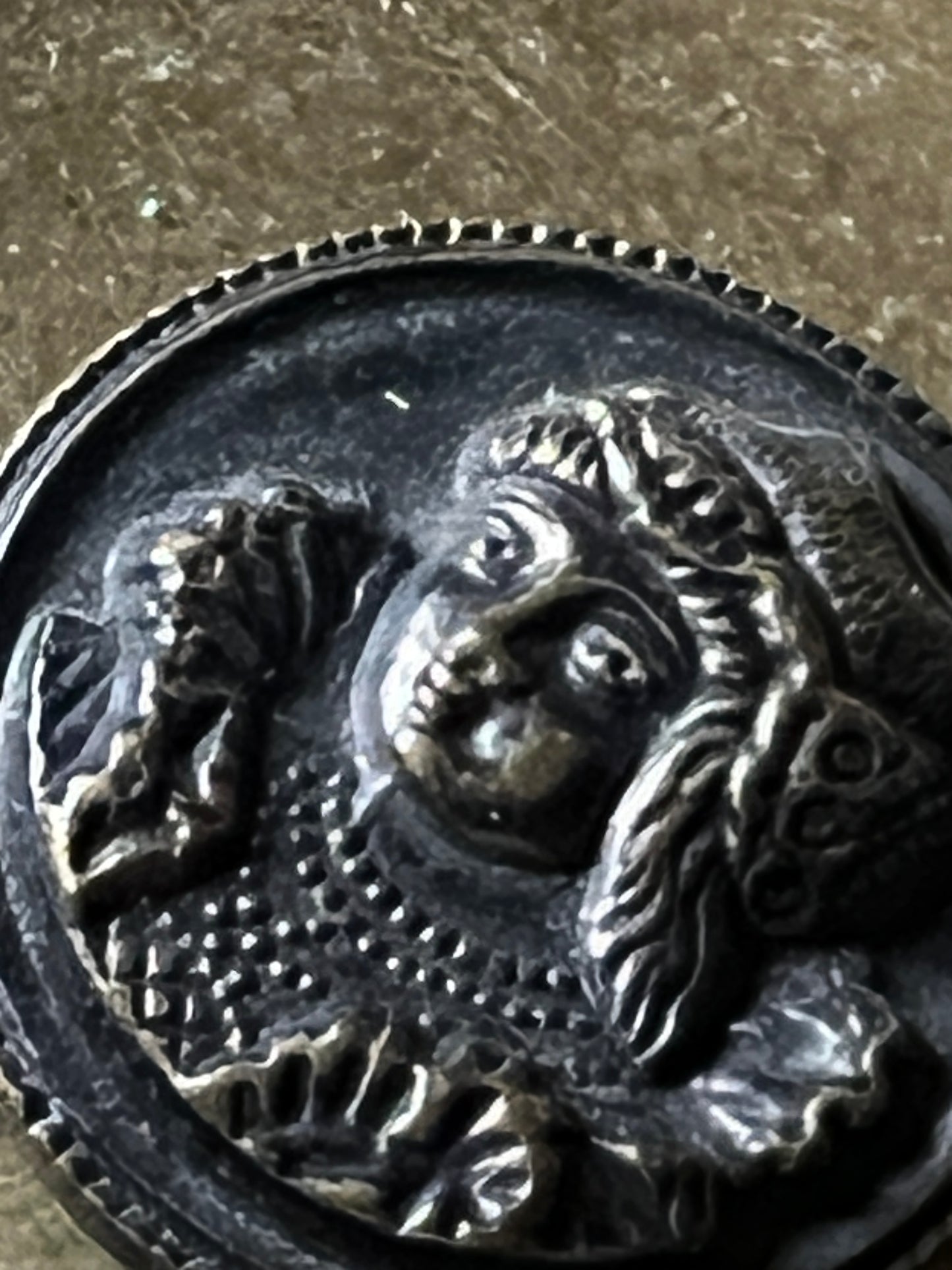 美しい衣装を纏った貴婦人の姿が描かれたメタルボタンです