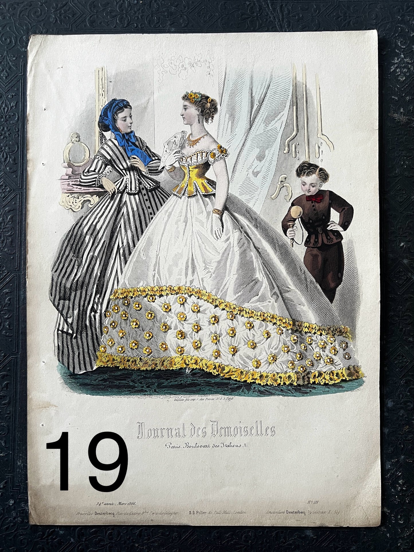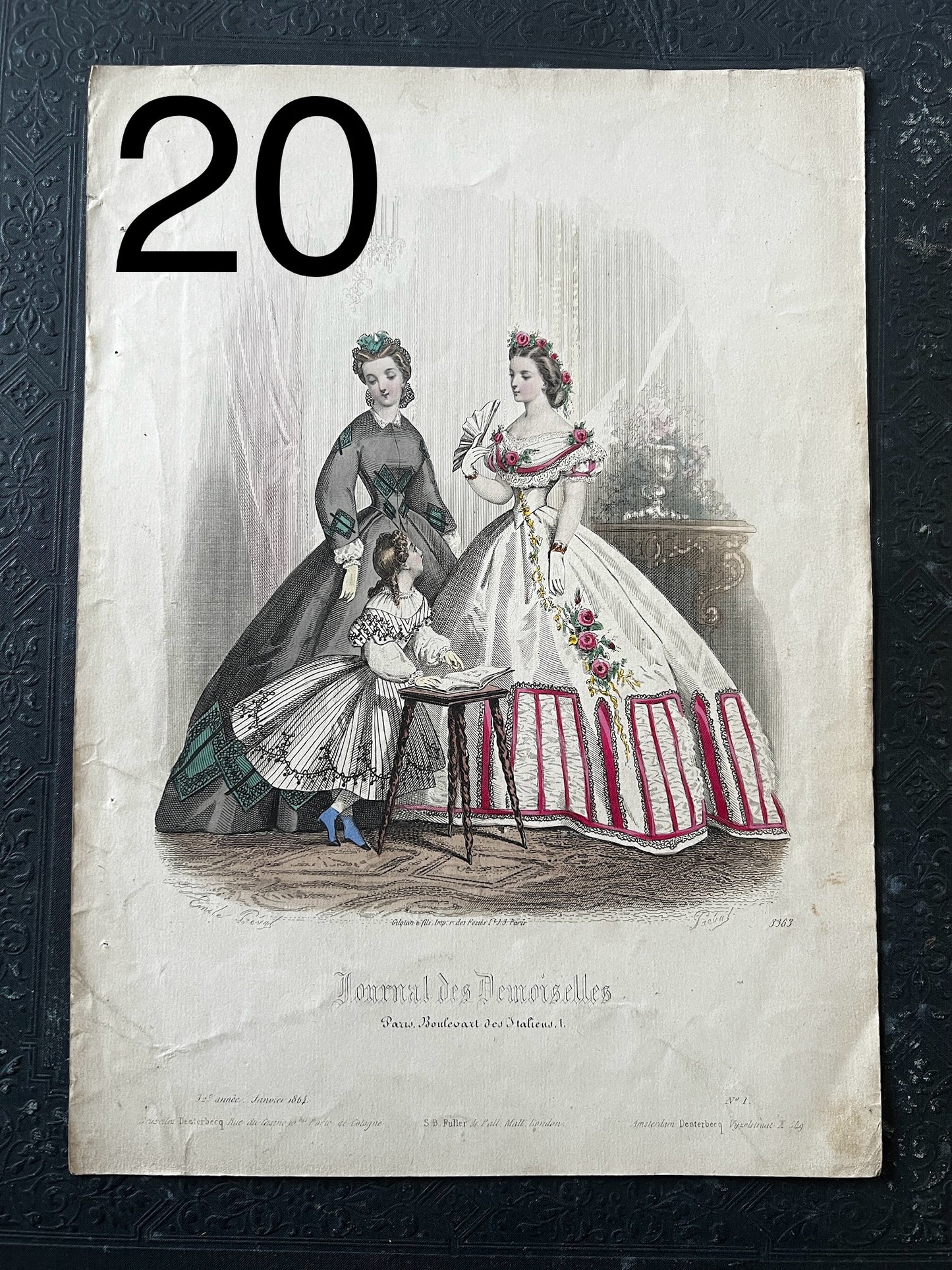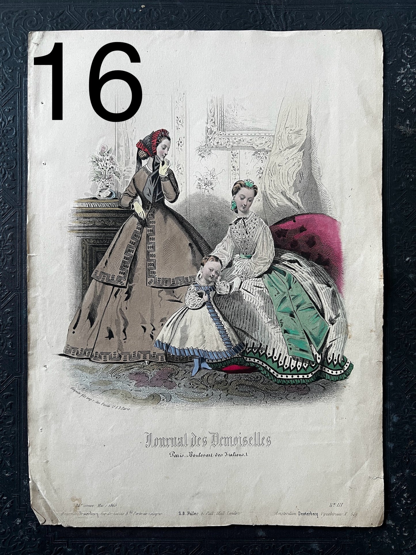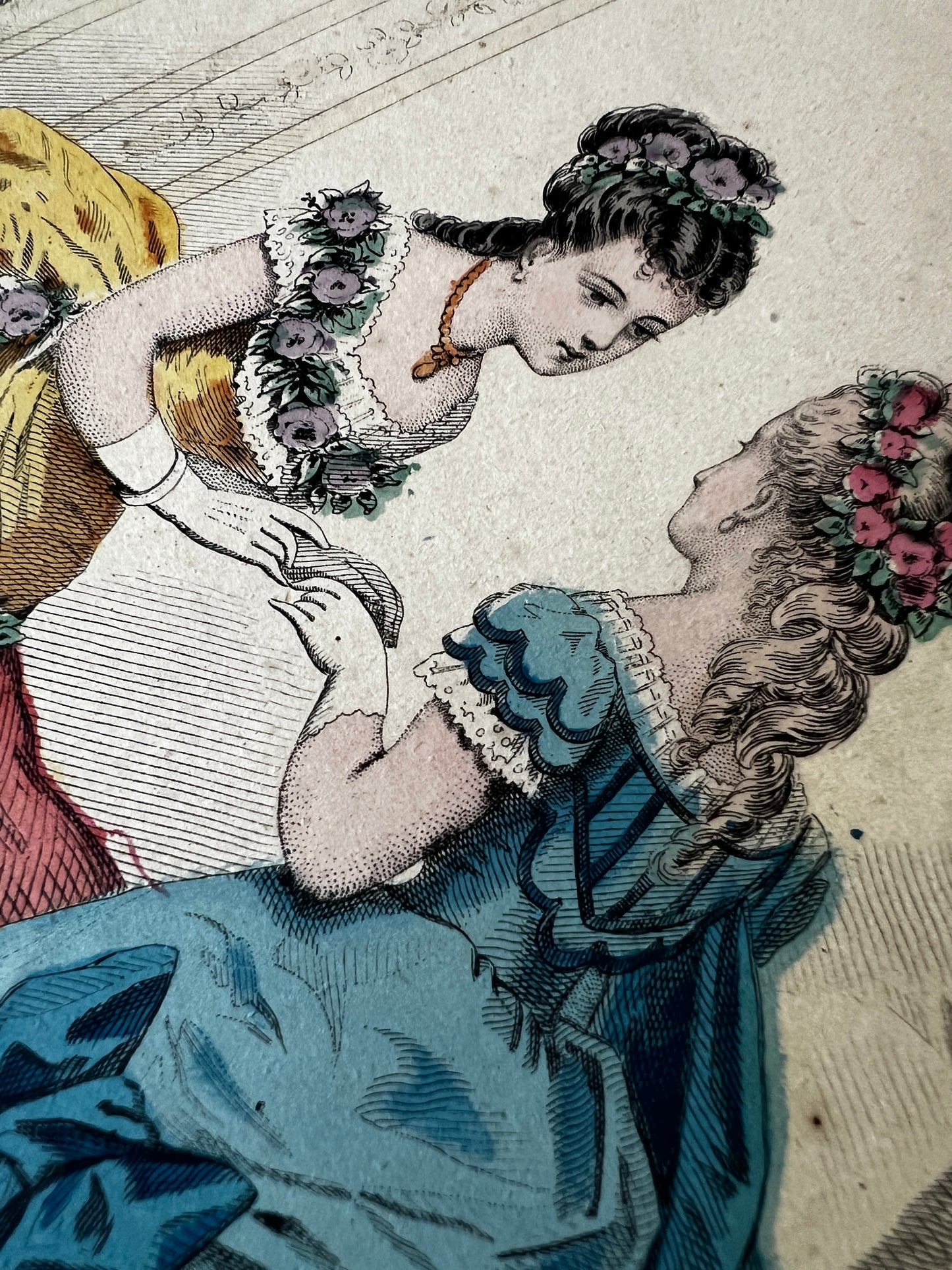 当時のファッションの流行を描いたもので、写真印刷物がまだ普及していなかった時代の手彩色仕上げの貴重なお品です