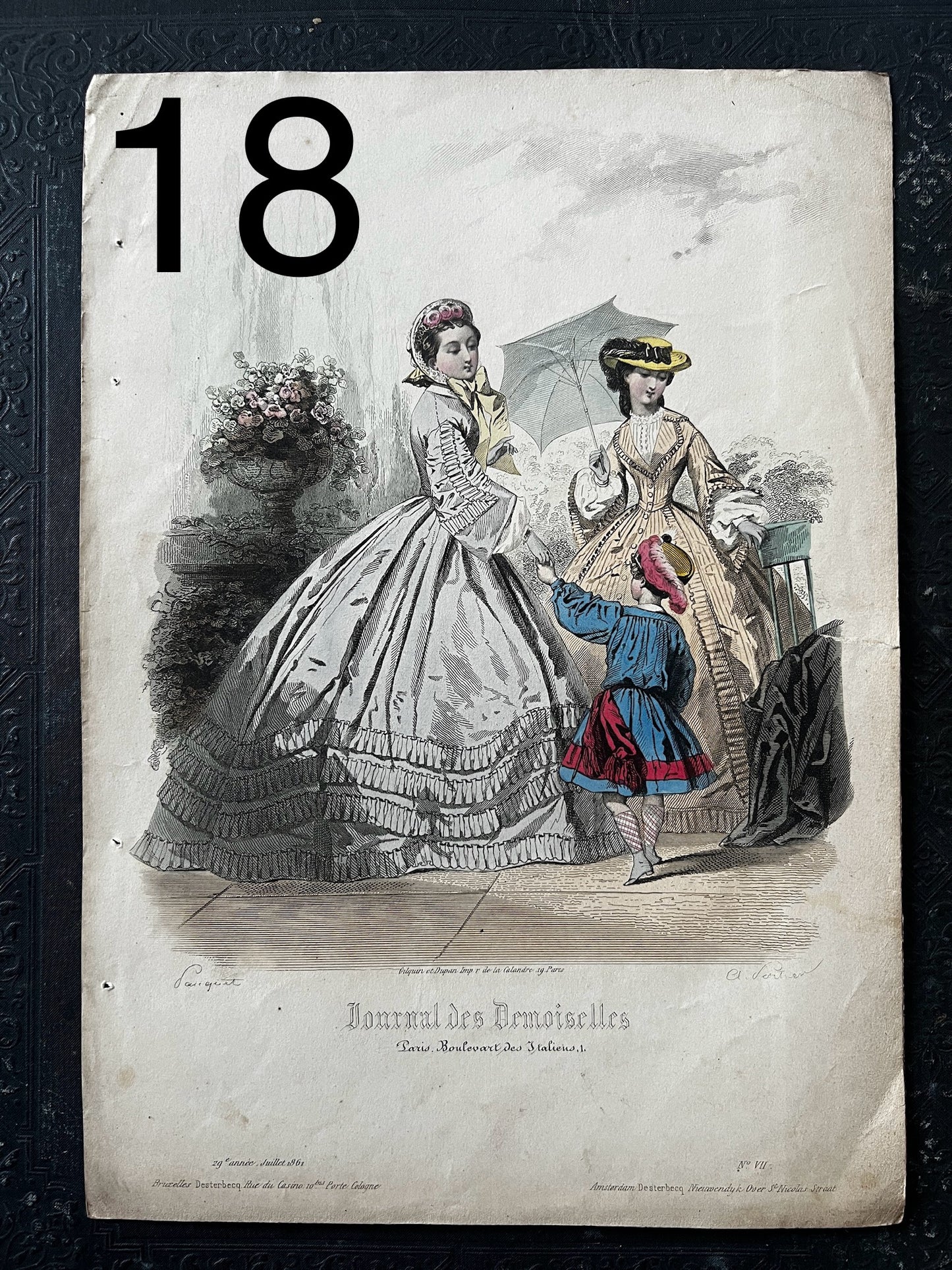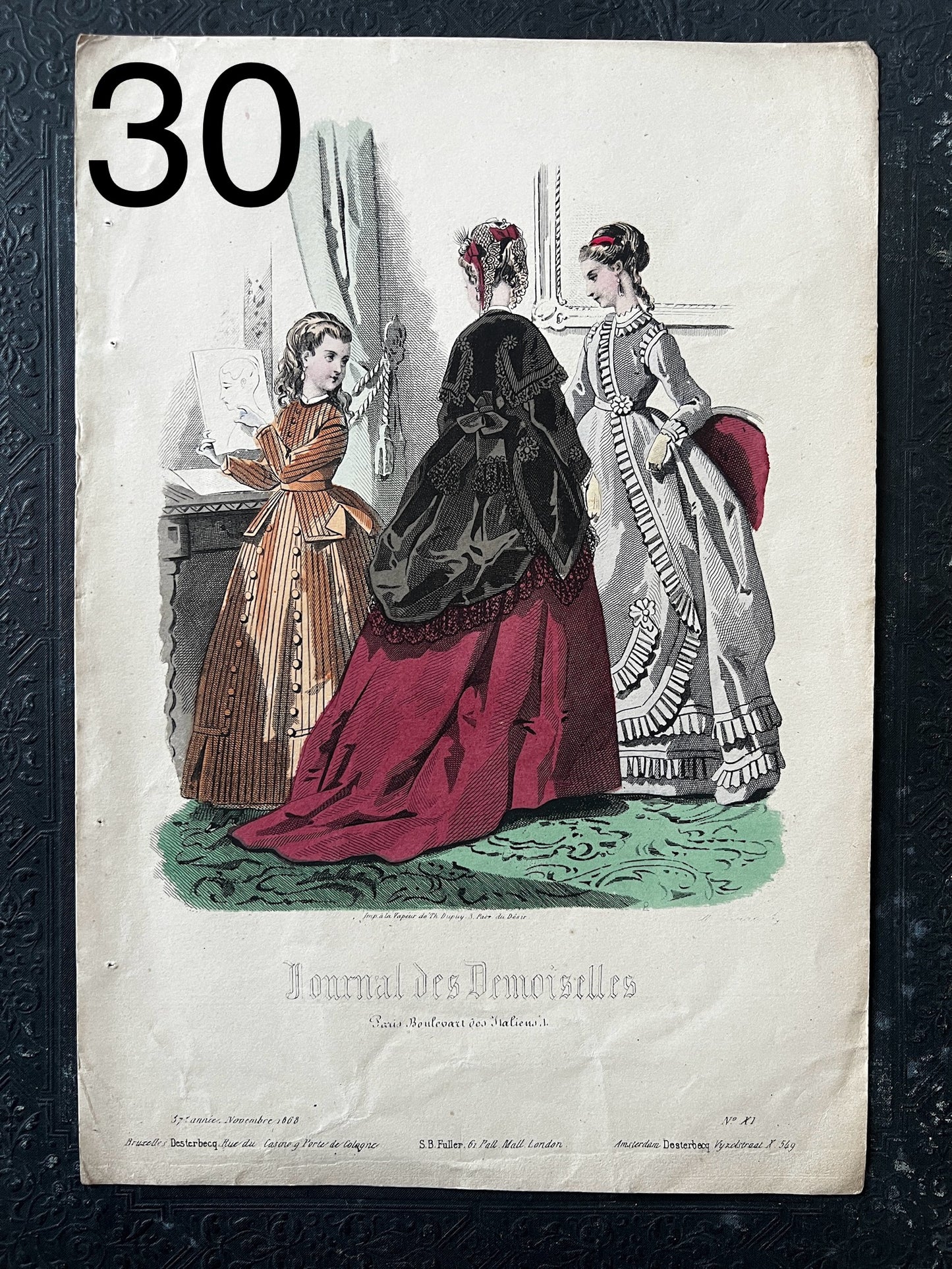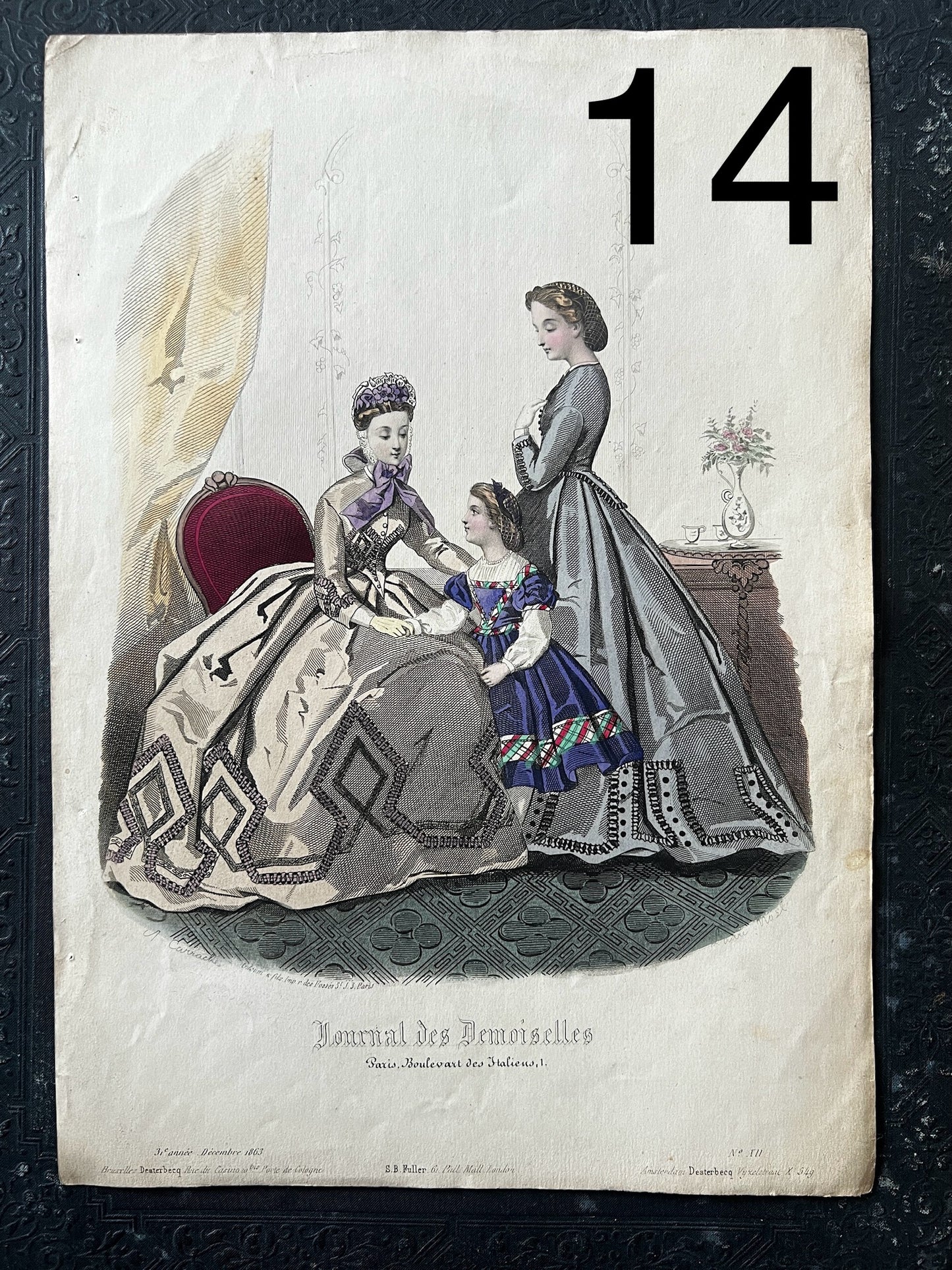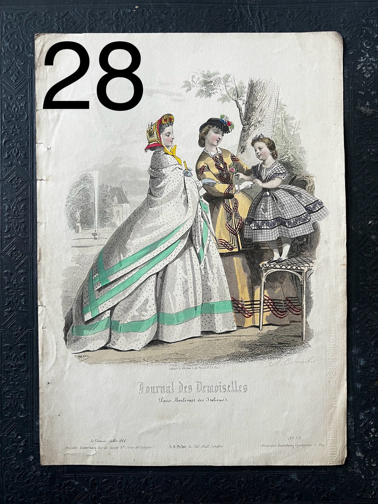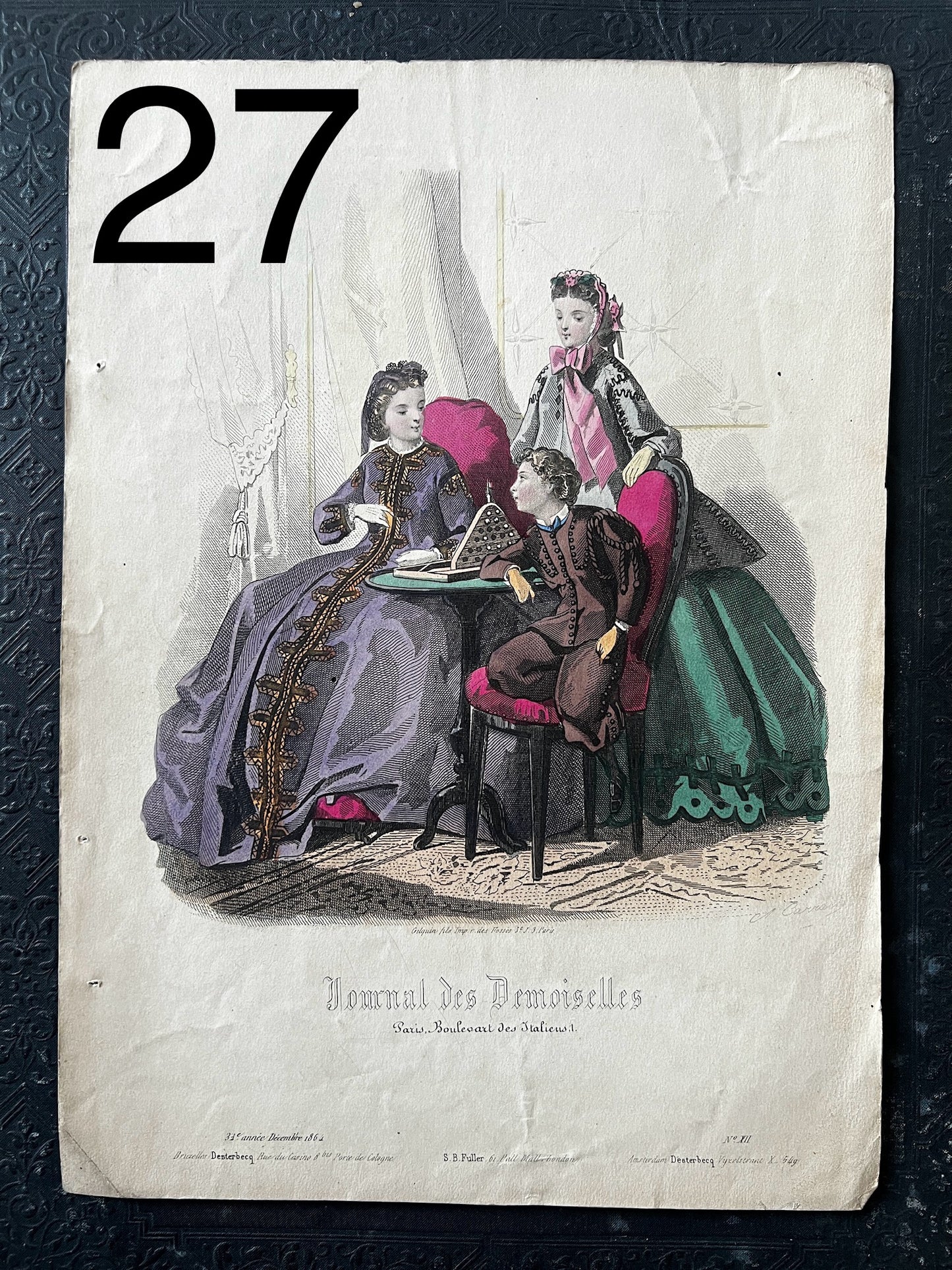 当時のファッションの流行を描いたもので、写真印刷物がまだ普及していなかった時代の手彩色仕上げの貴重なお品です