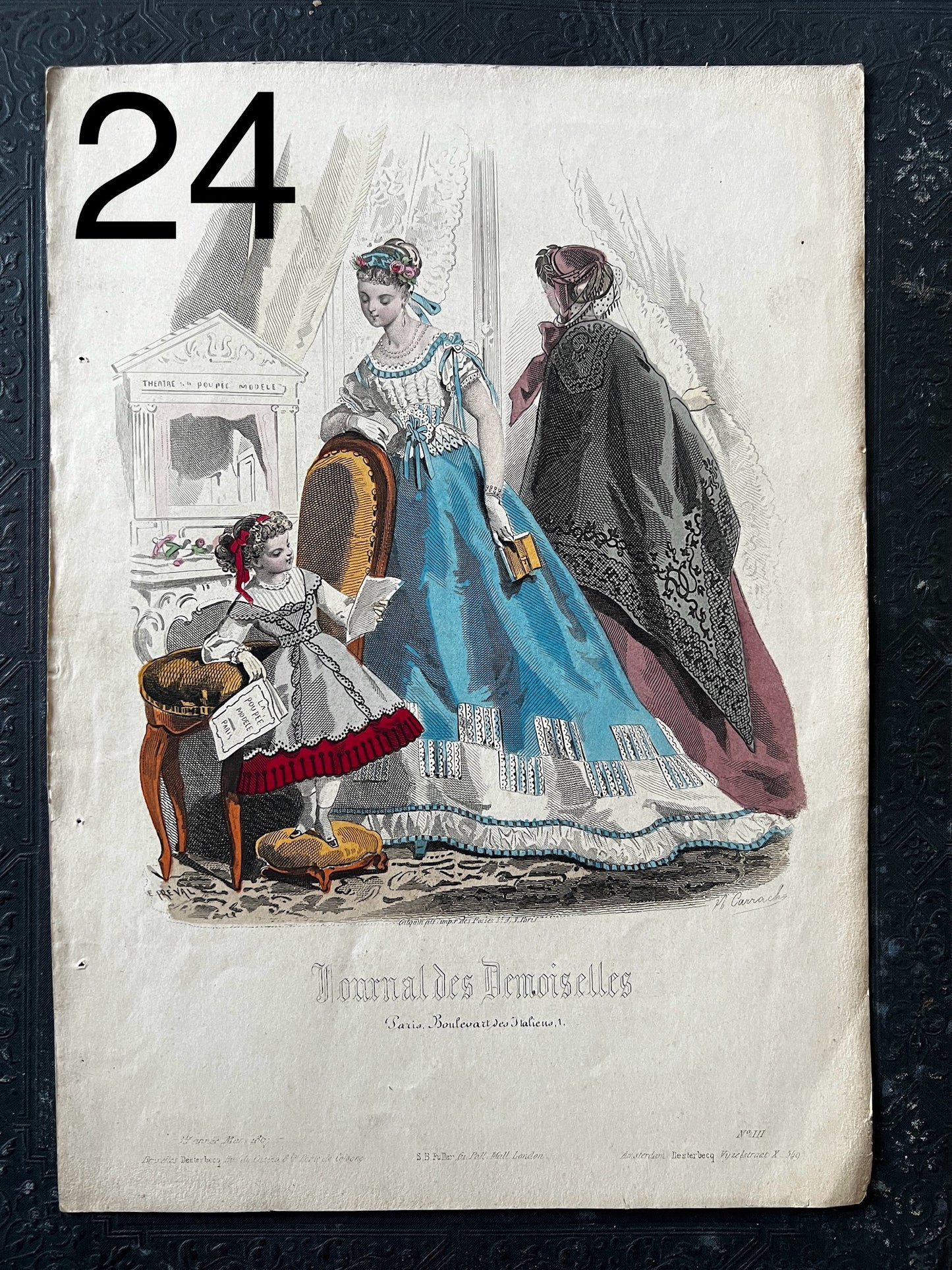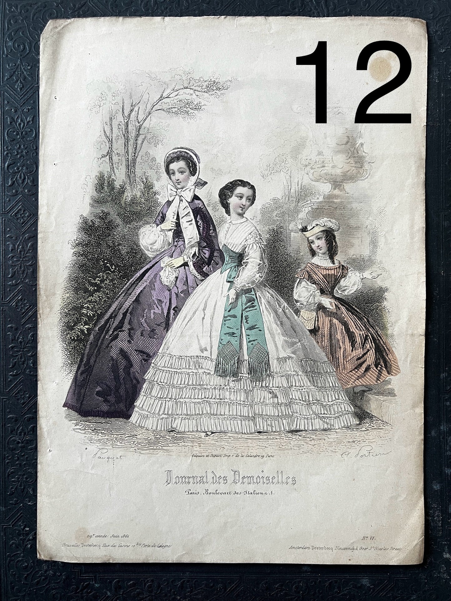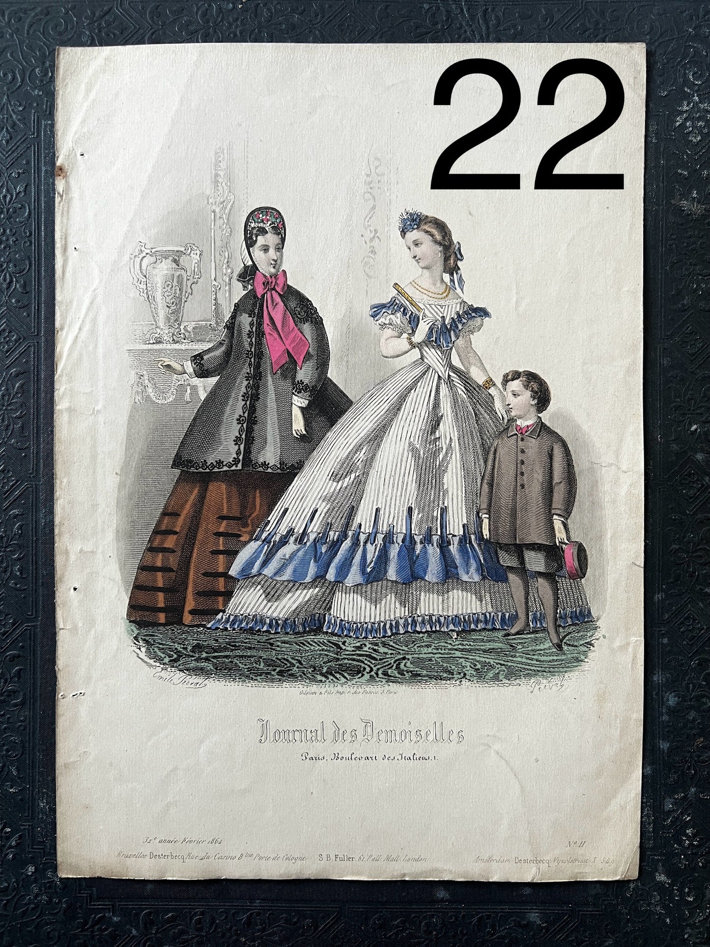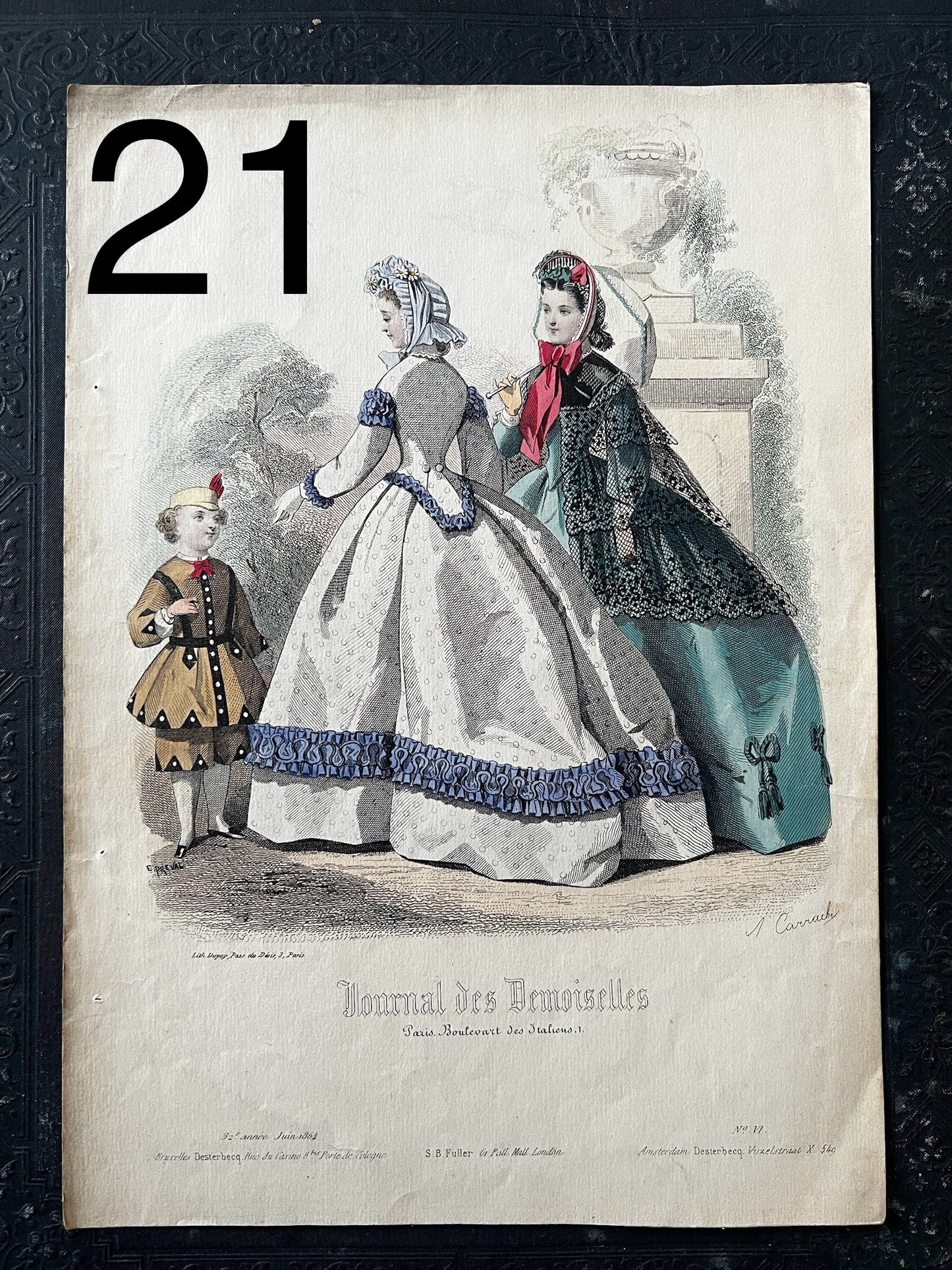 当時のファッションの流行を描いたもので、写真印刷物がまだ普及していなかった時代の手彩色仕上げの貴重なお品です