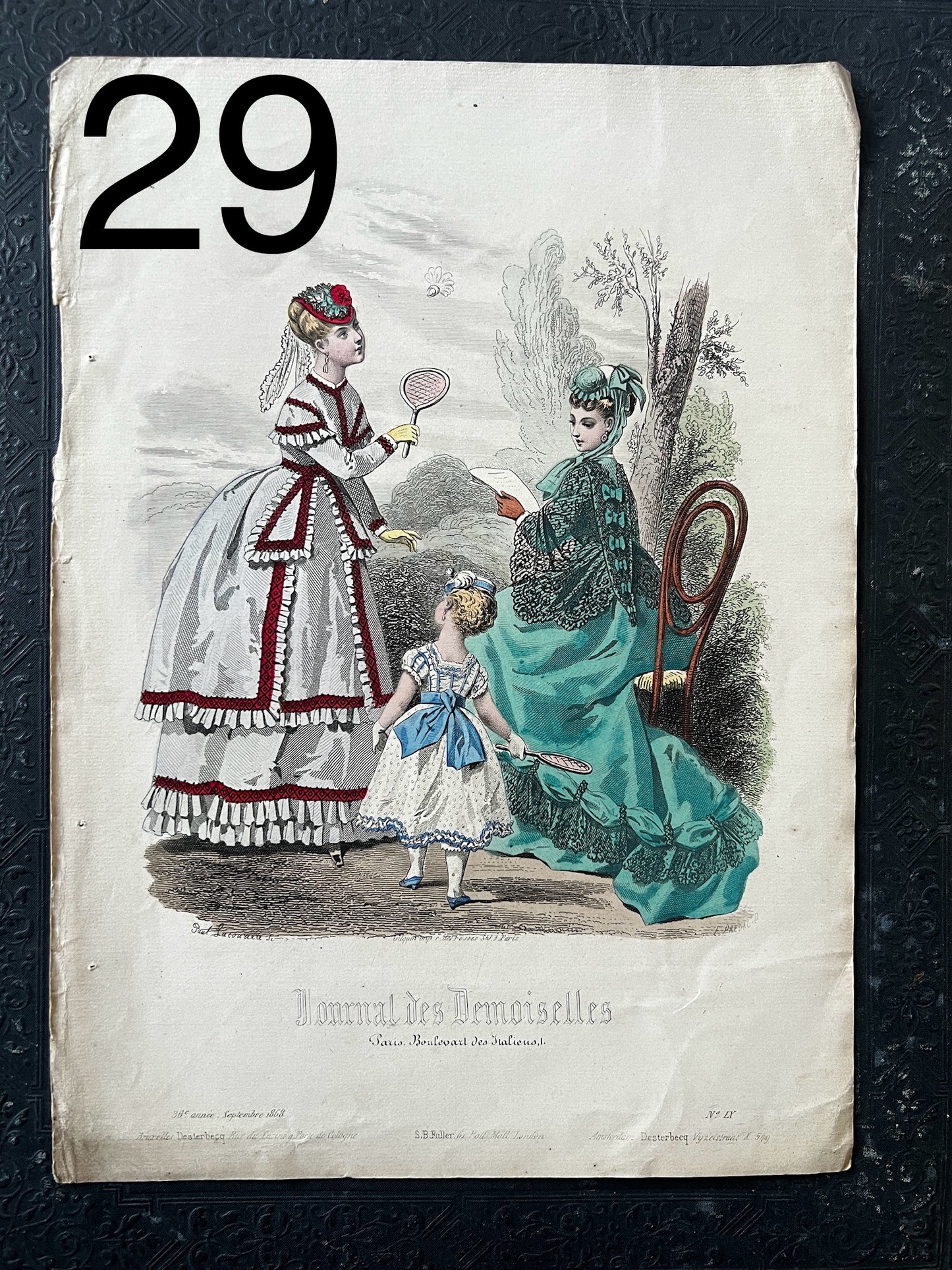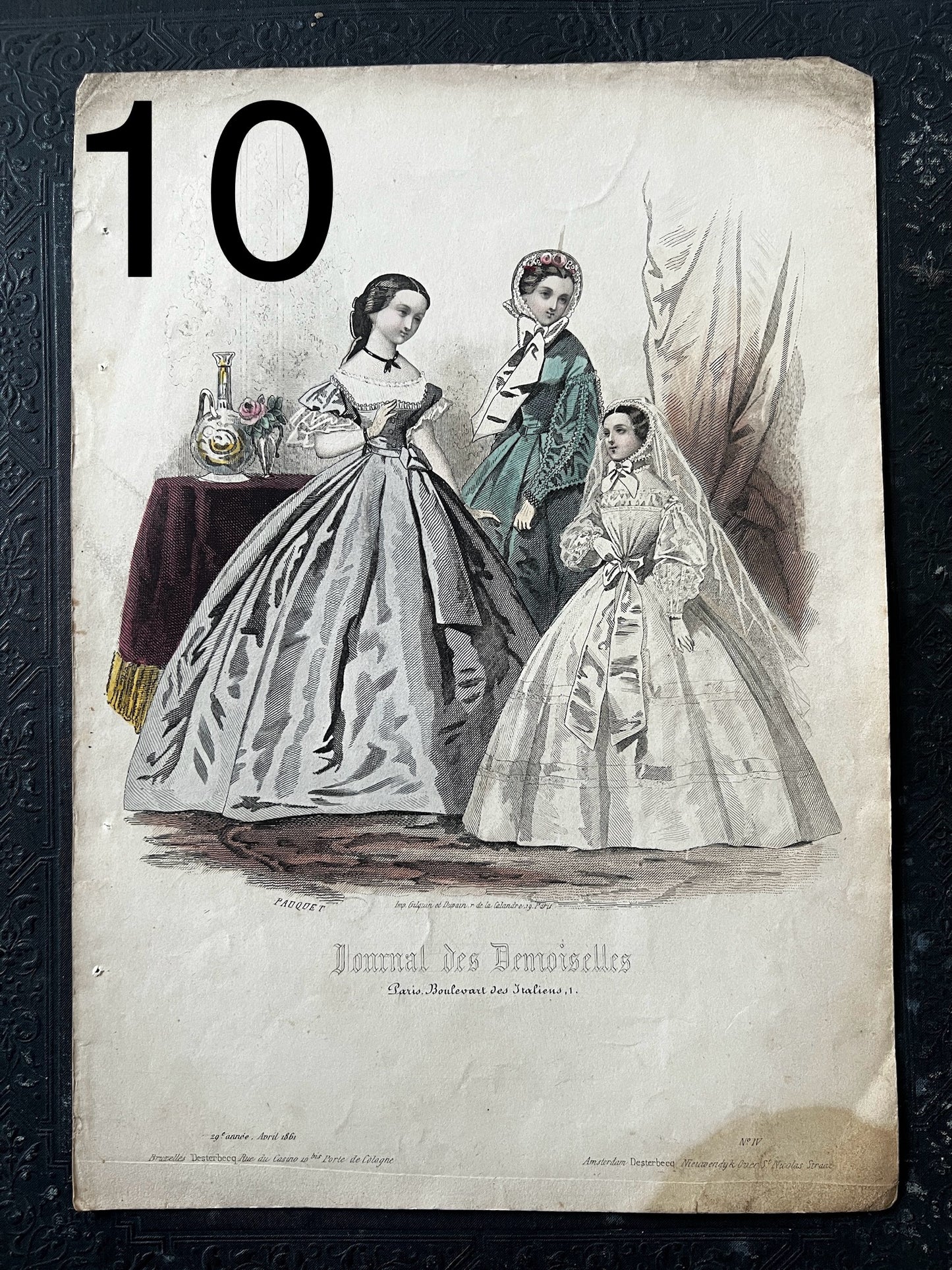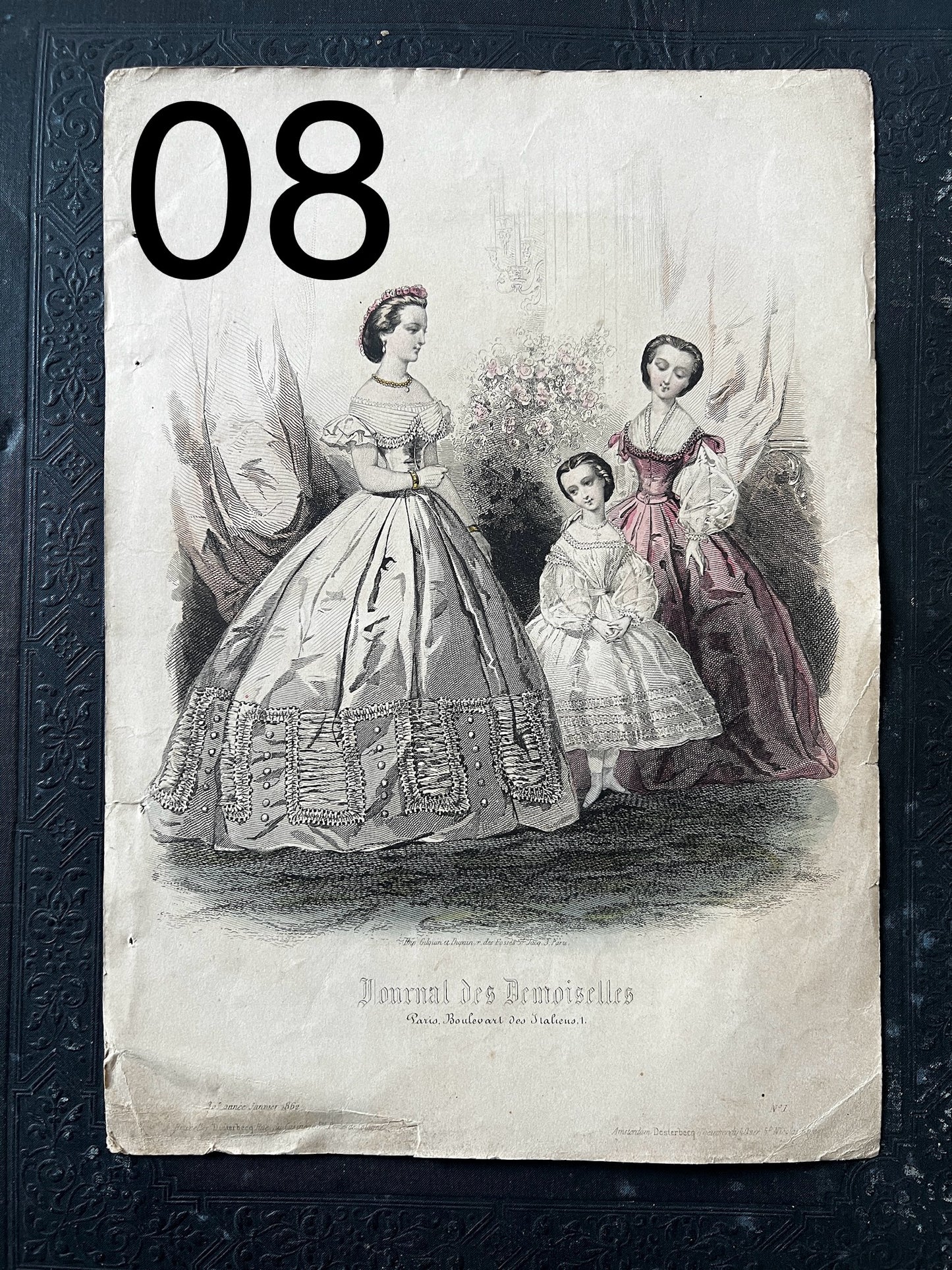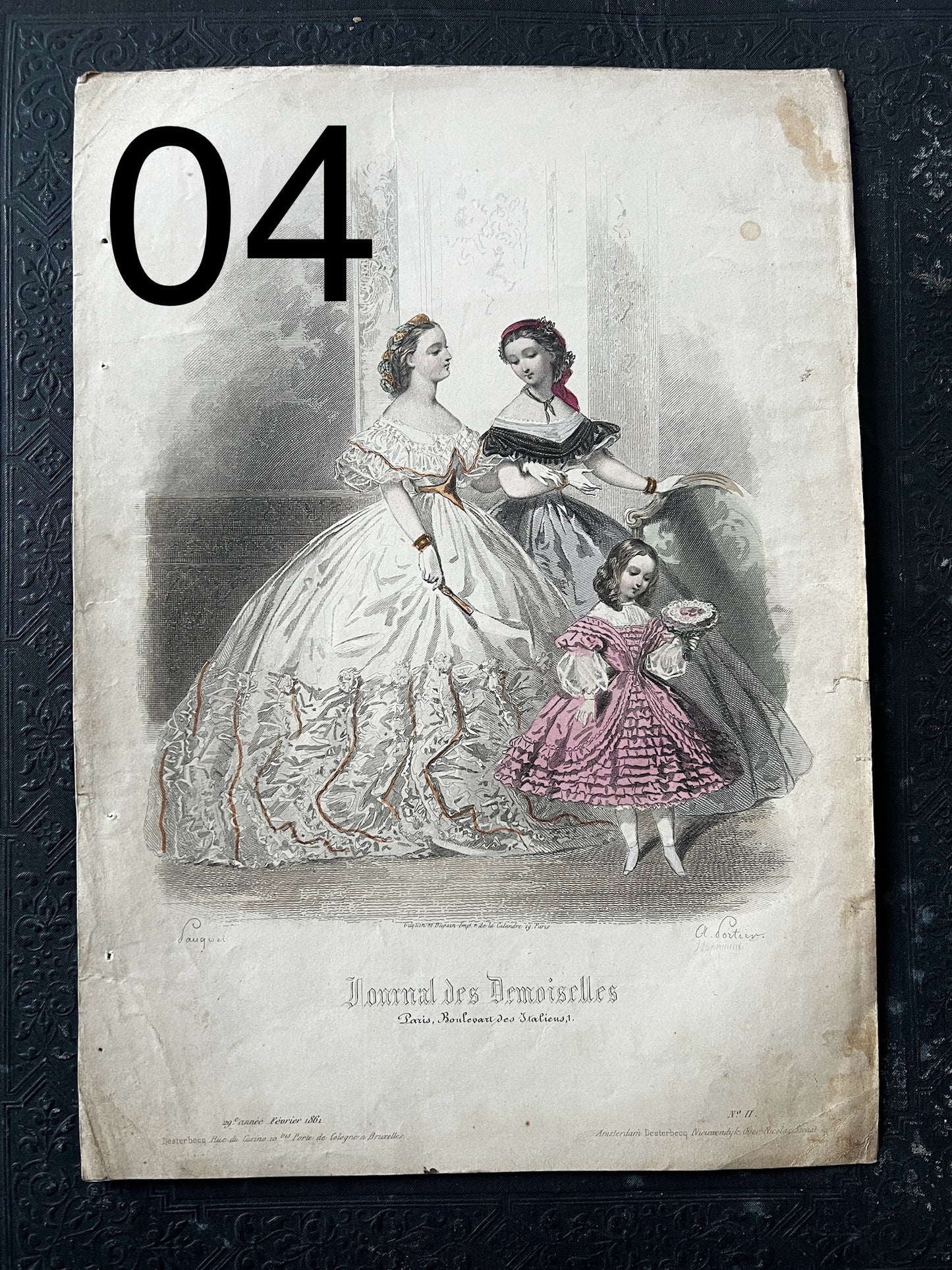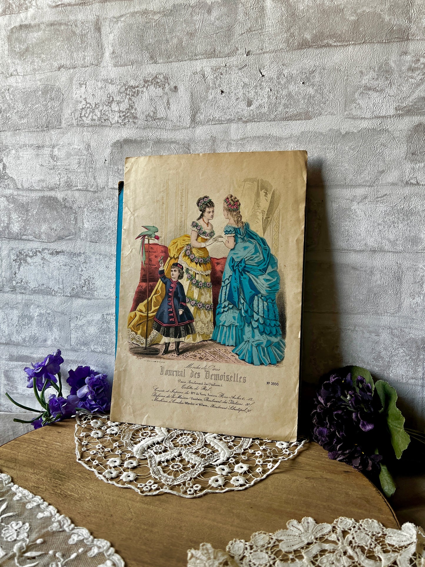 当時のファッションの流行を描いたもので、写真印刷物がまだ普及していなかった時代の手彩色仕上げの貴重なお品です