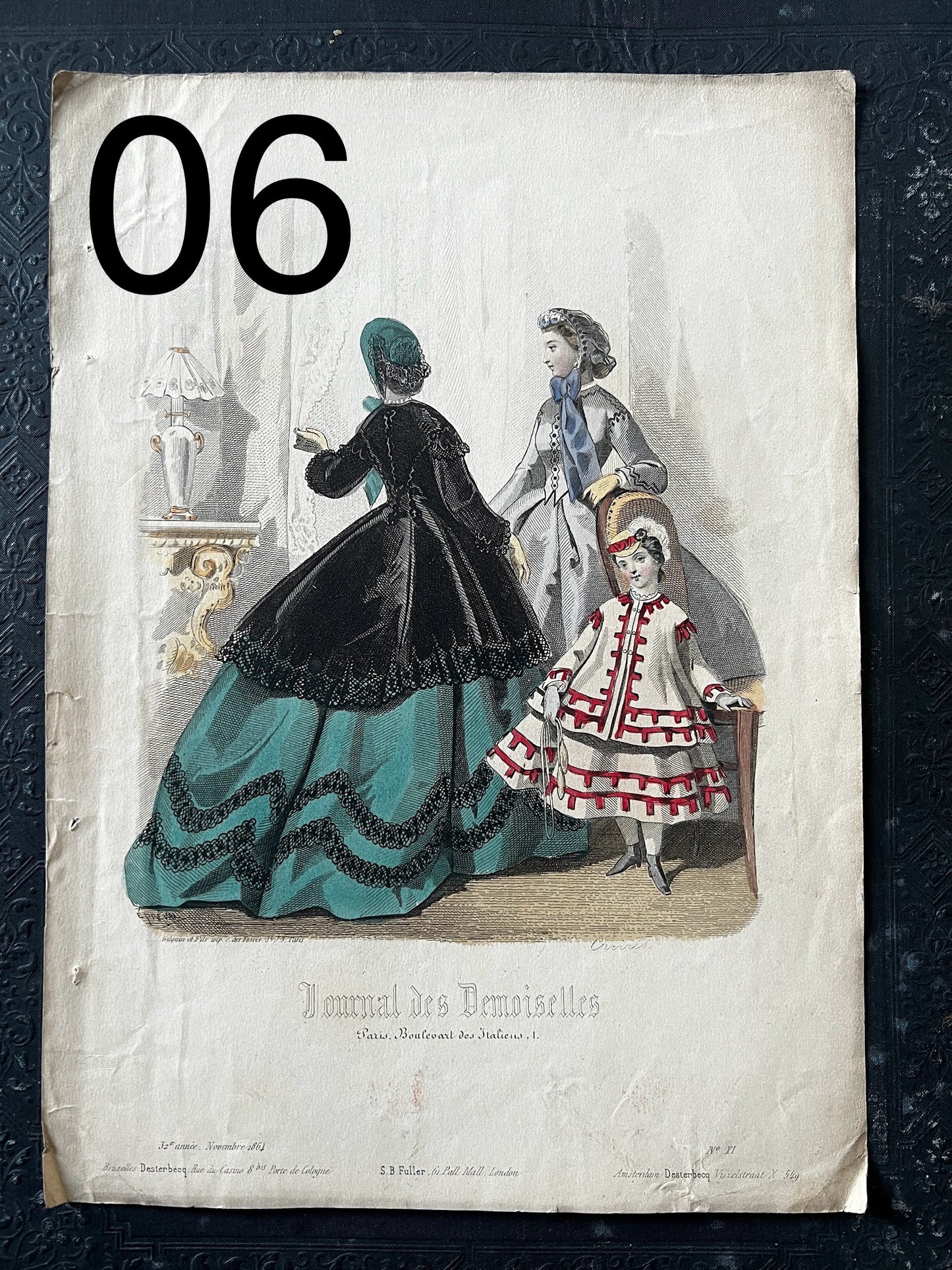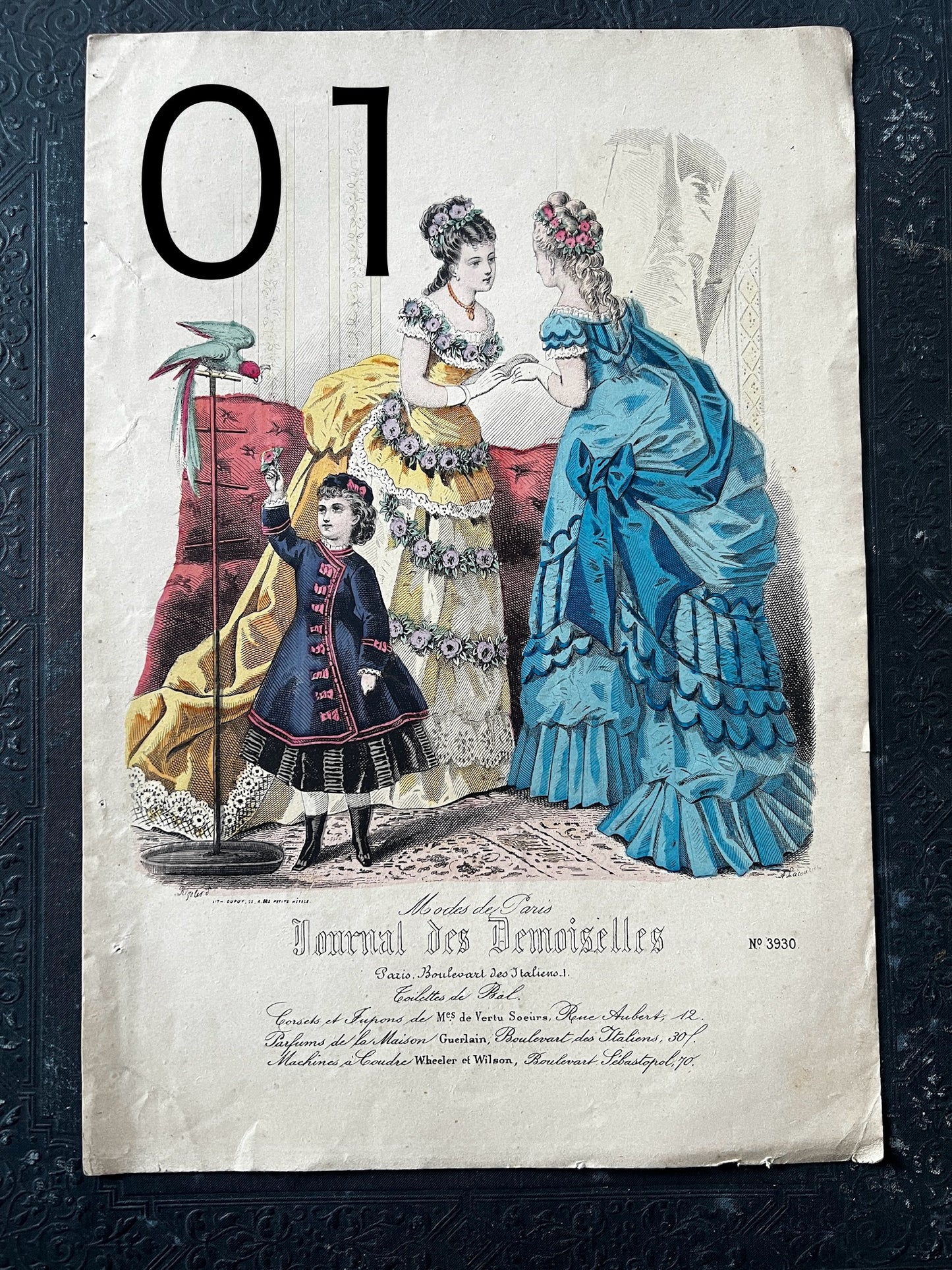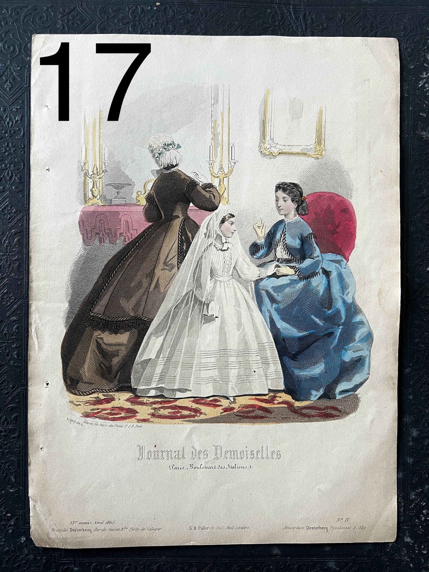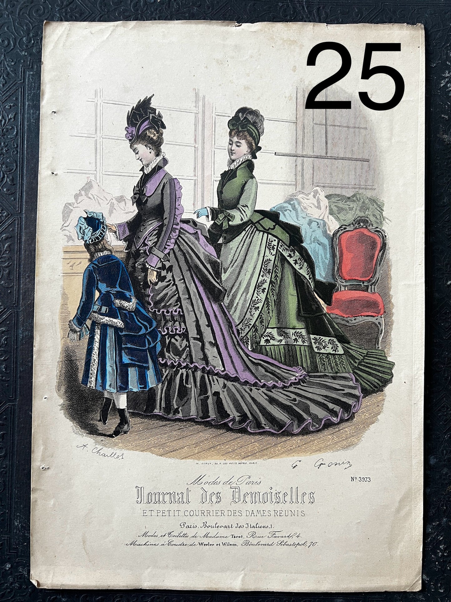 当時のファッションの流行を描いたもので、写真印刷物がまだ普及していなかった時代の手彩色仕上げの貴重なお品です