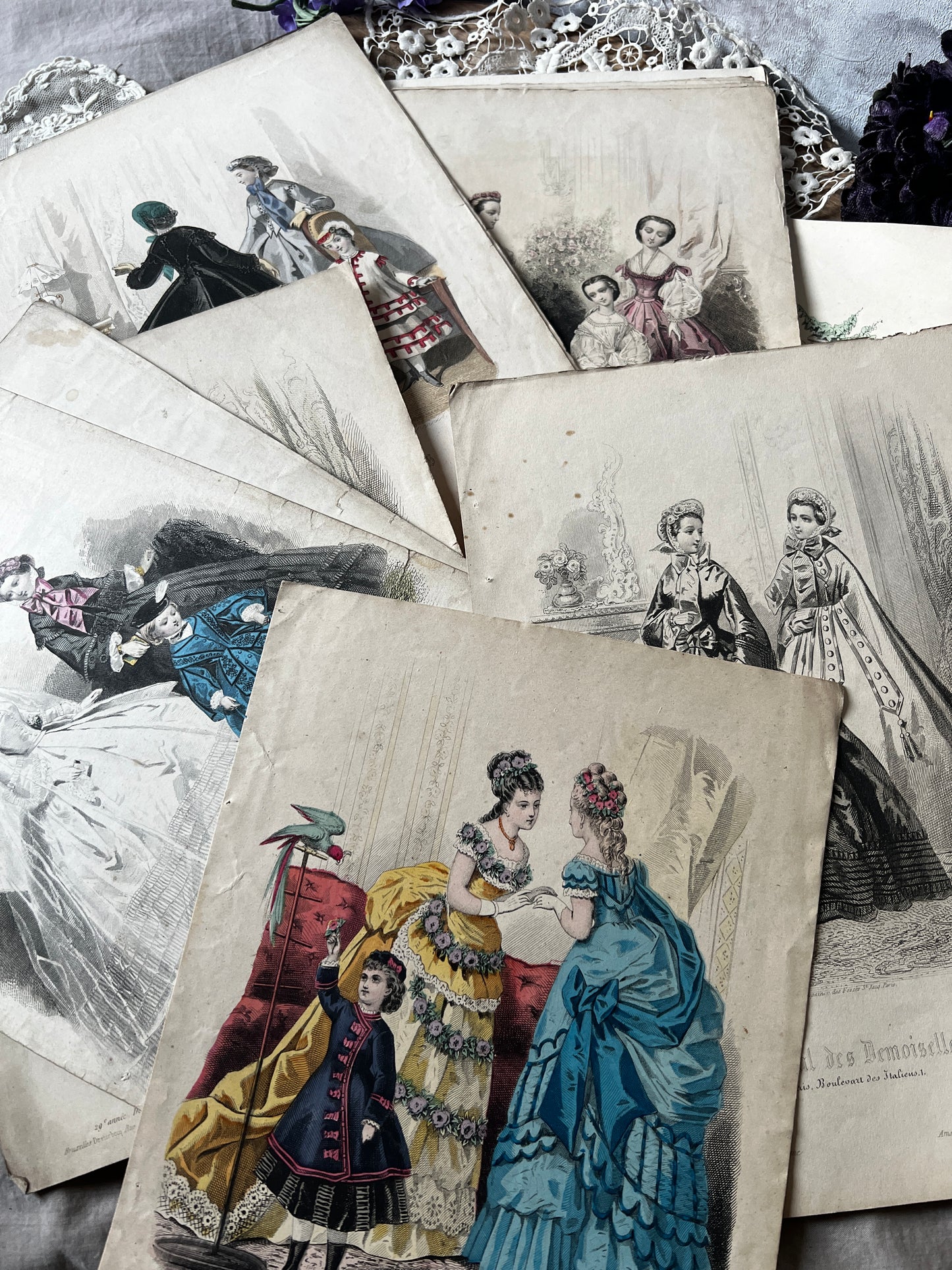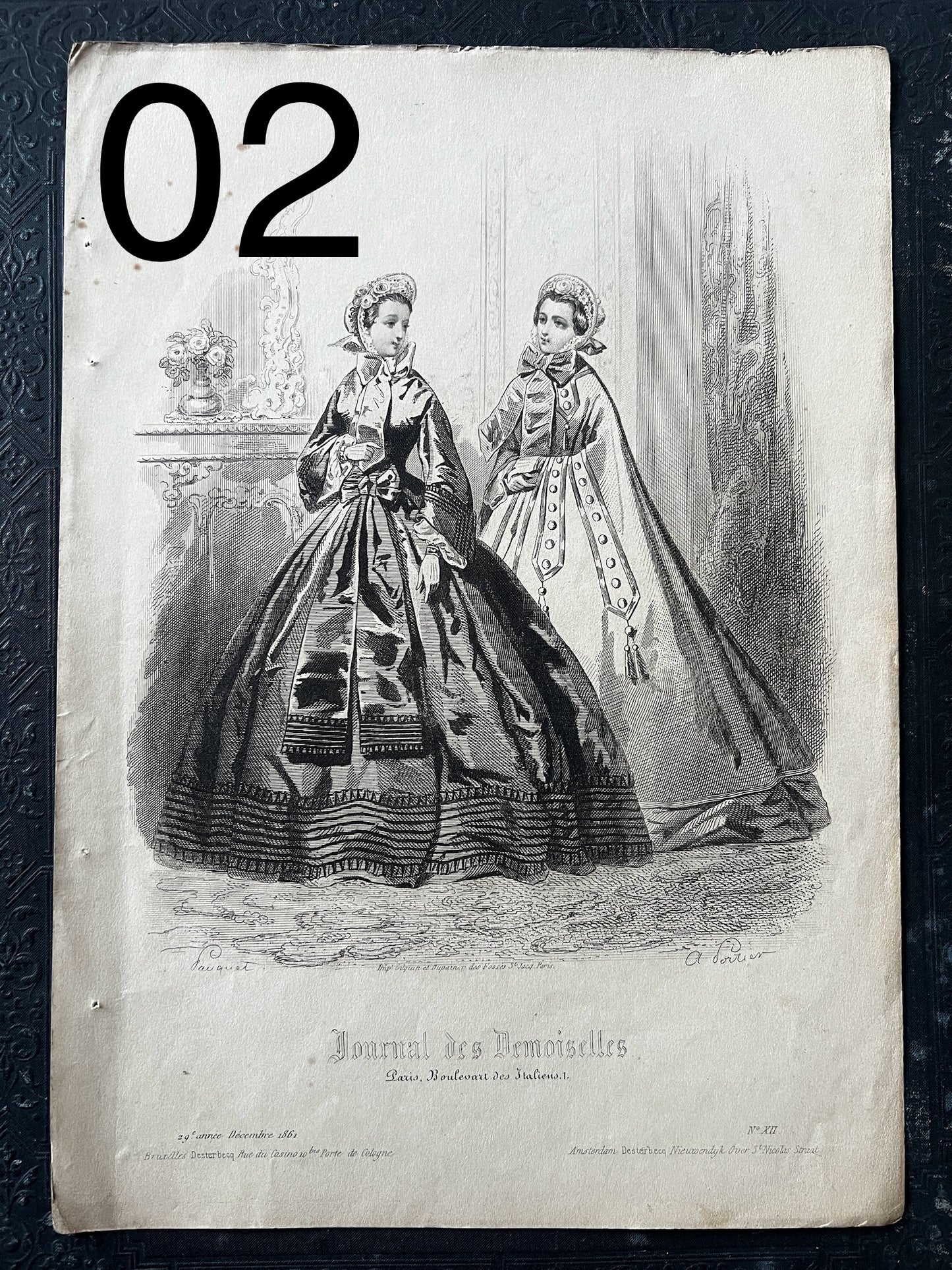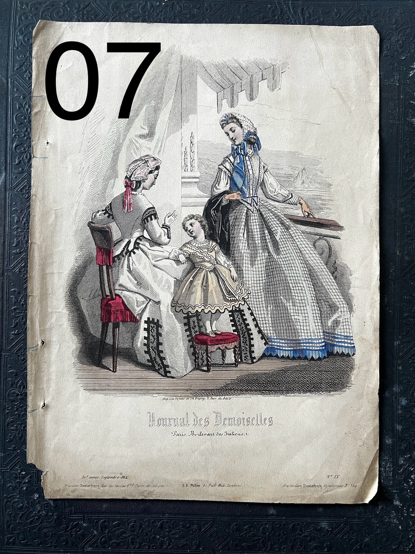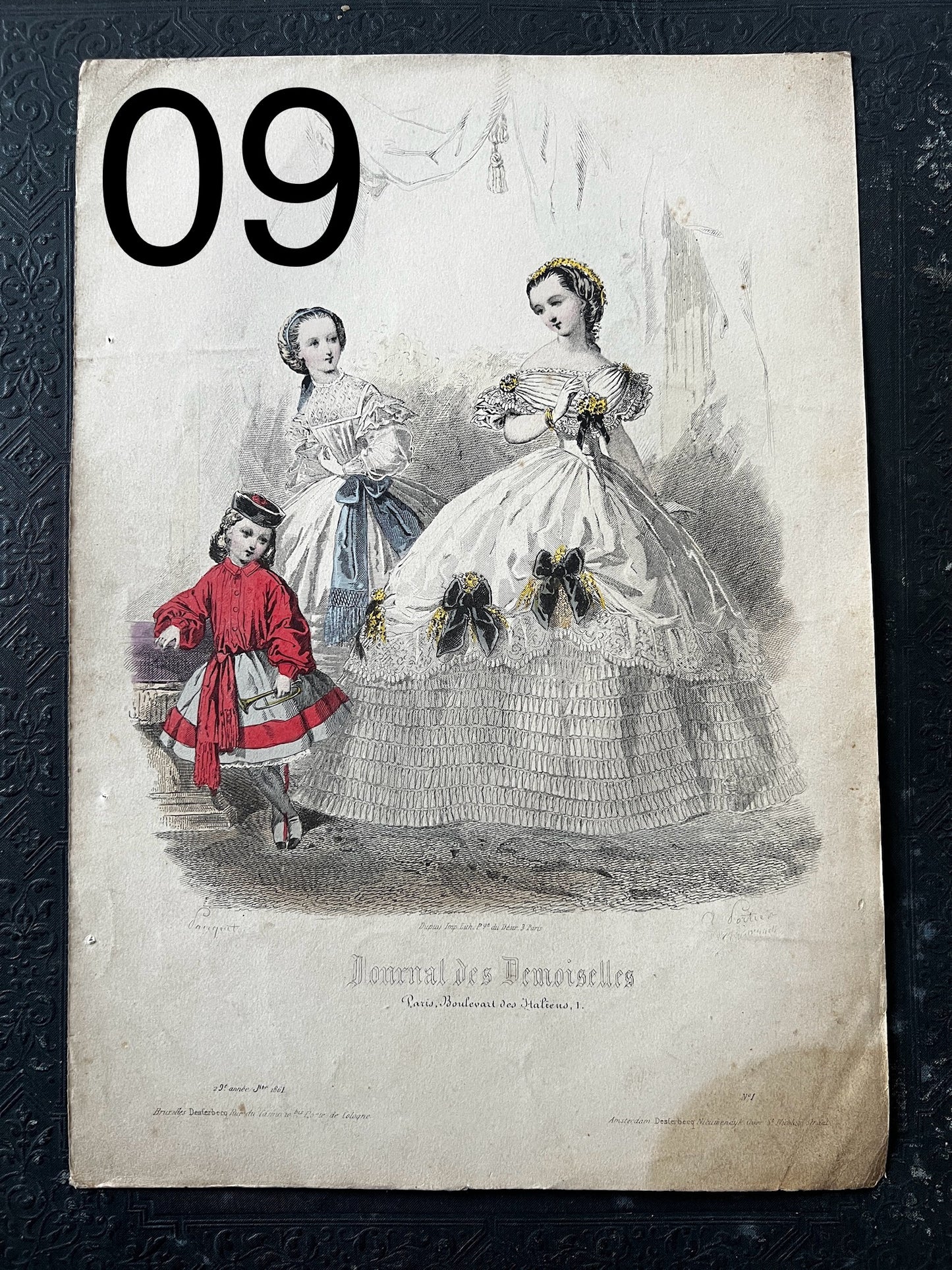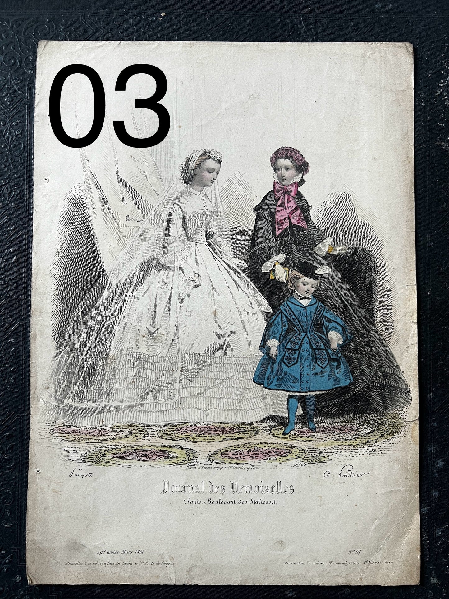 当時のファッションの流行を描いたもので、写真印刷物がまだ普及していなかった時代の手彩色仕上げの貴重なお品です