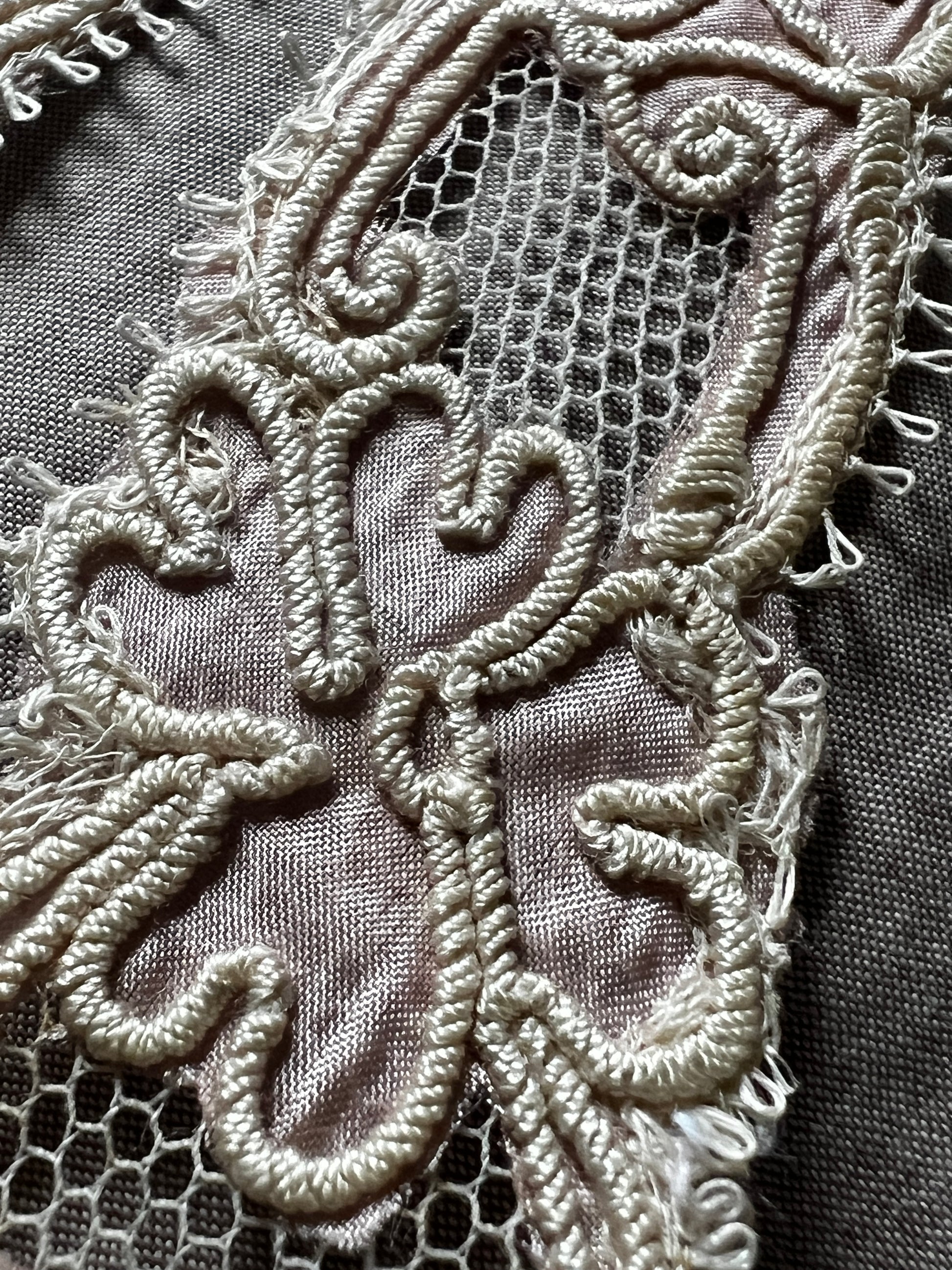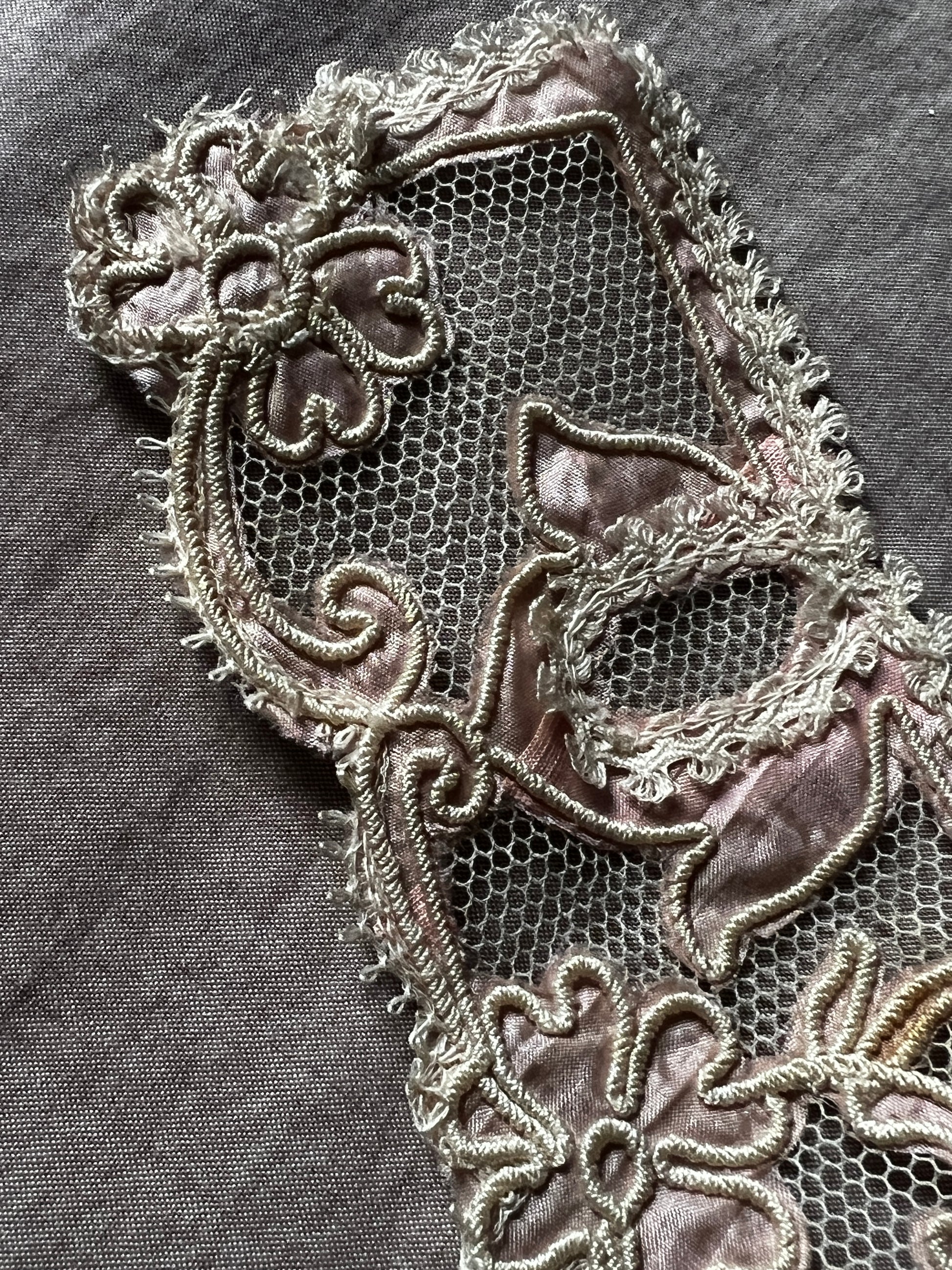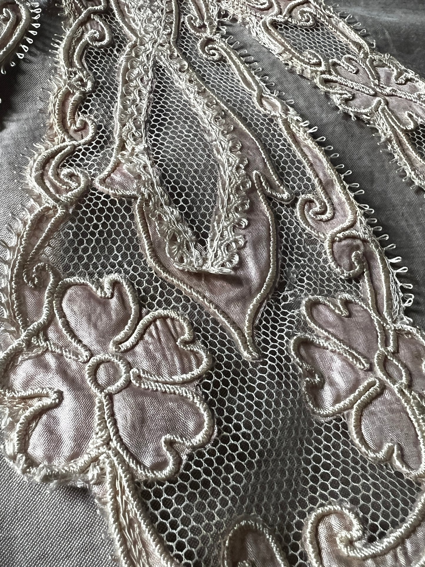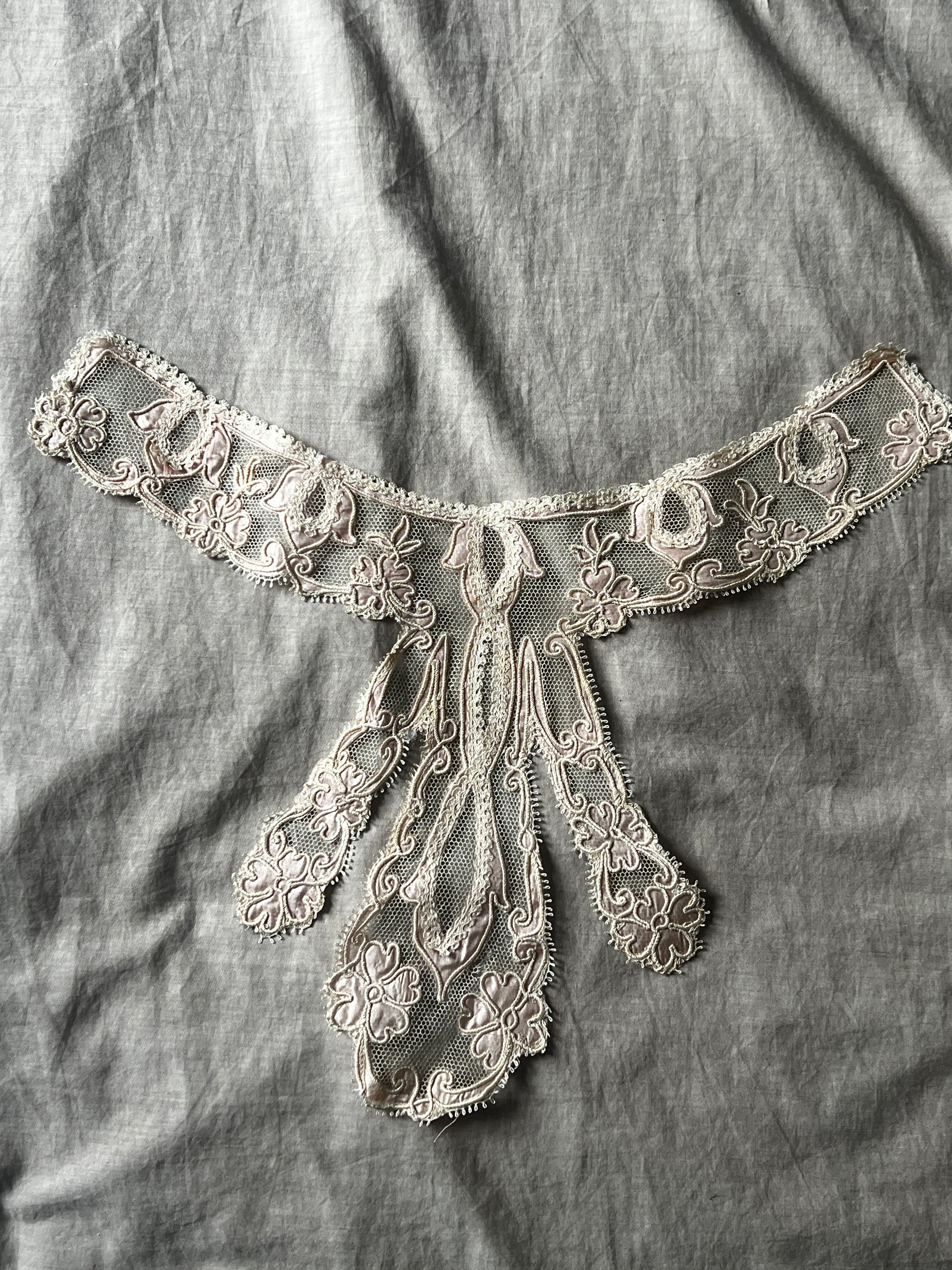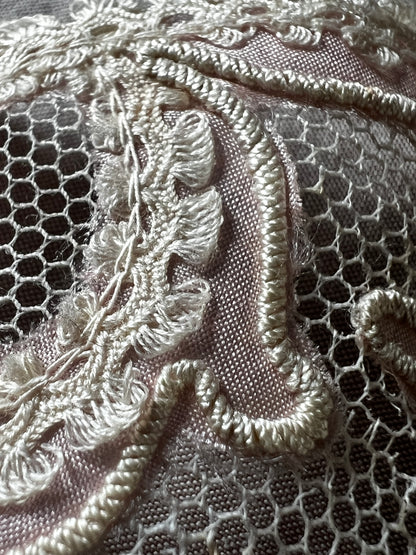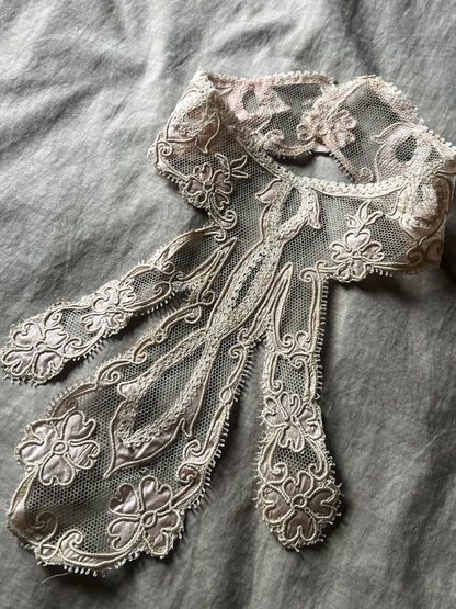 くすみピンクのサテン地とコード刺繍が施されたチュールレースの首元飾りです