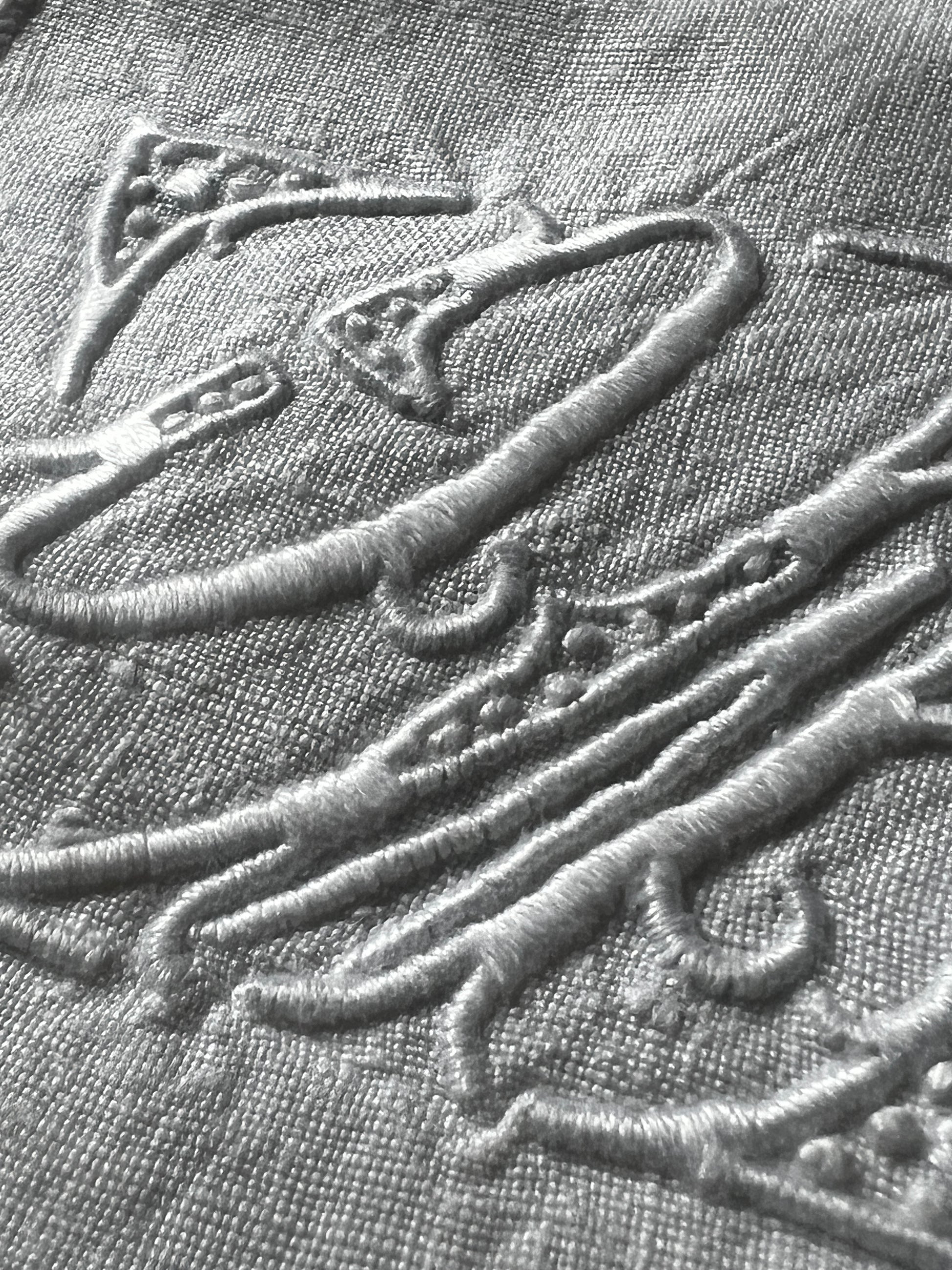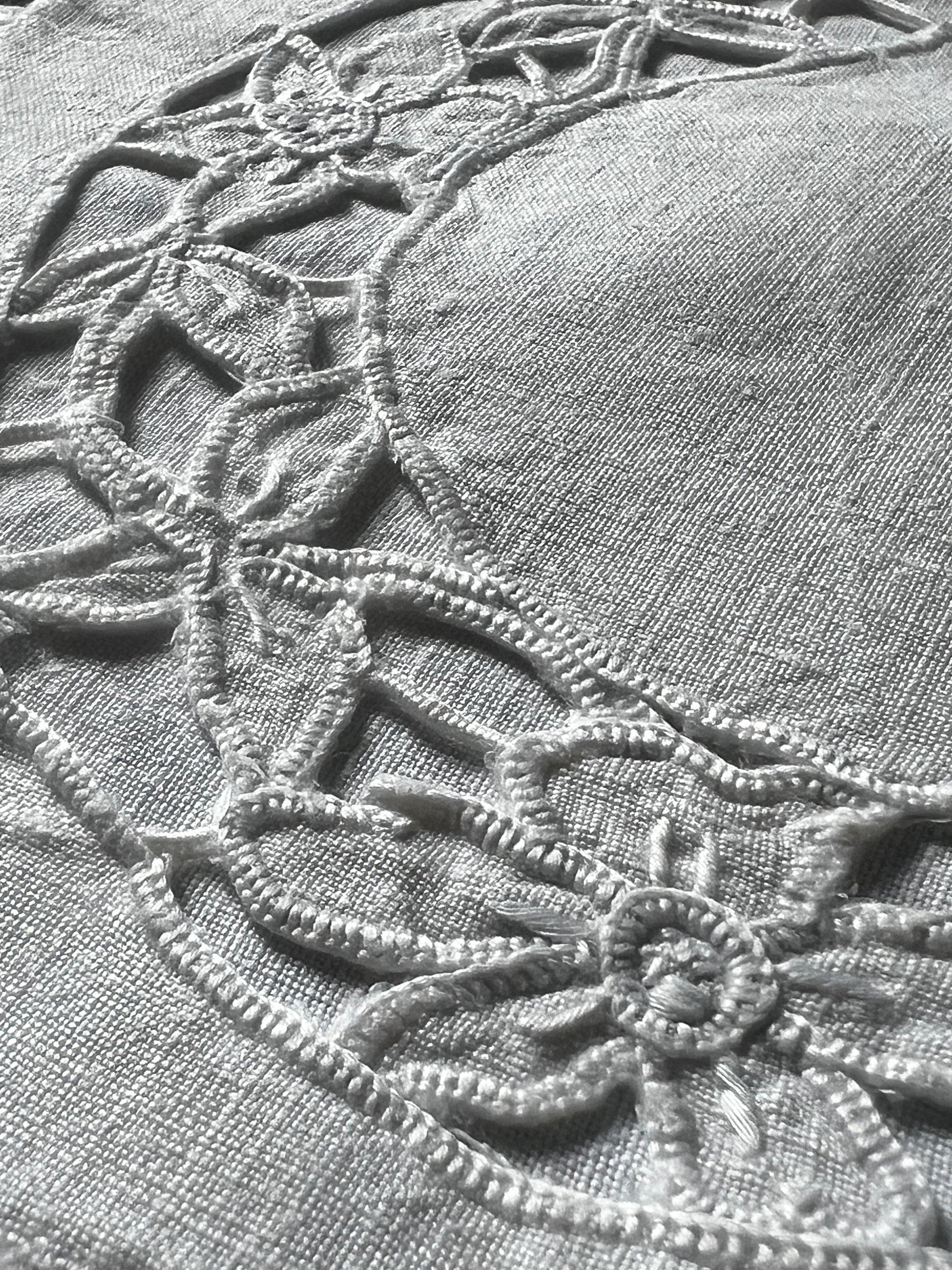 モノグラム刺繍とカットワーク刺繍が施されたデザインのクッションカバーです