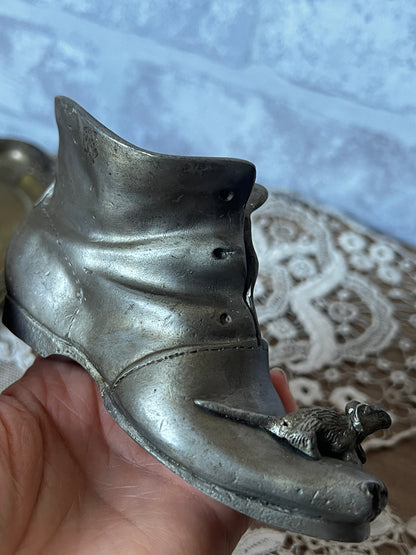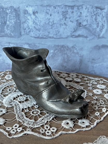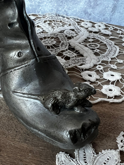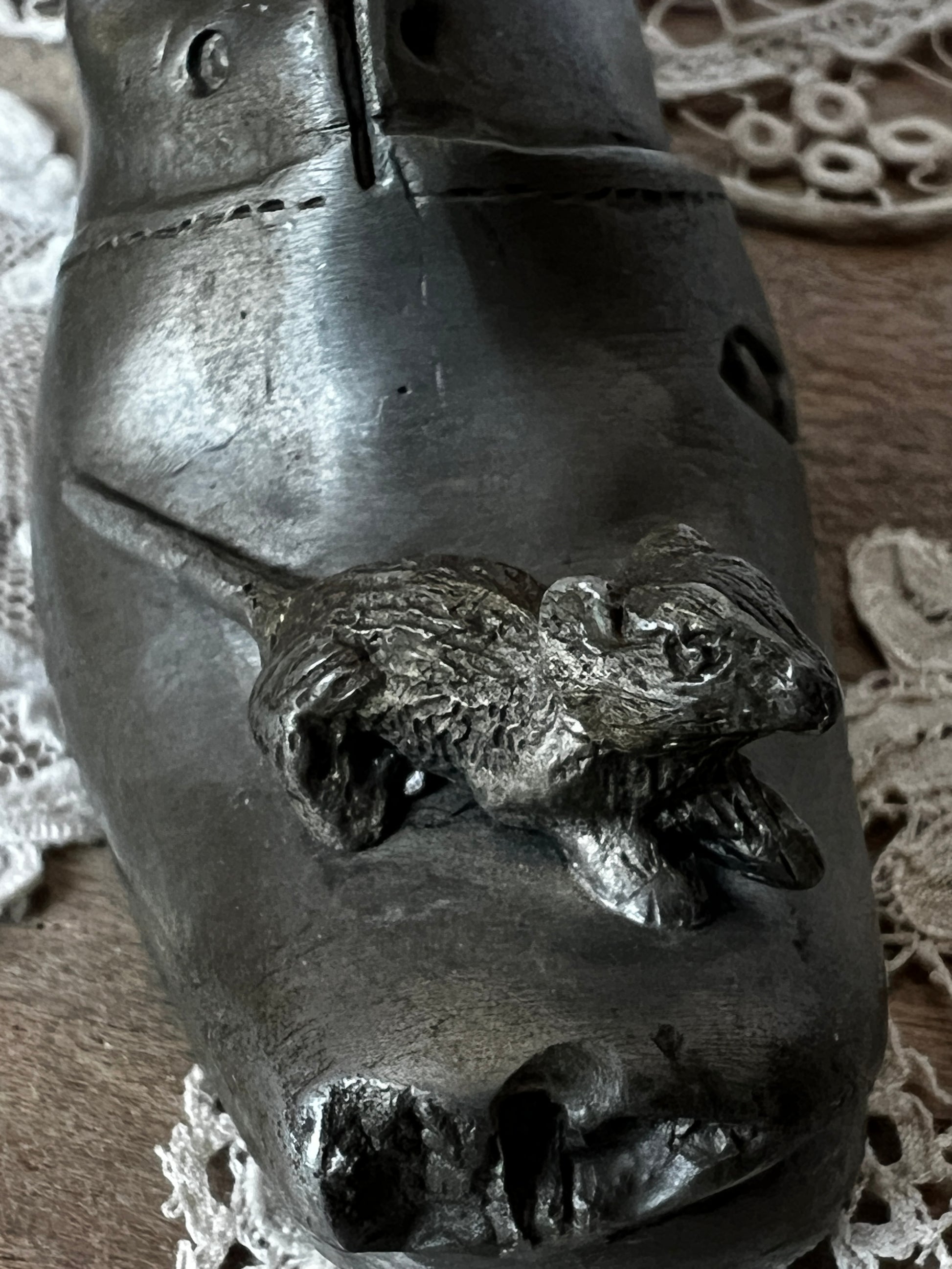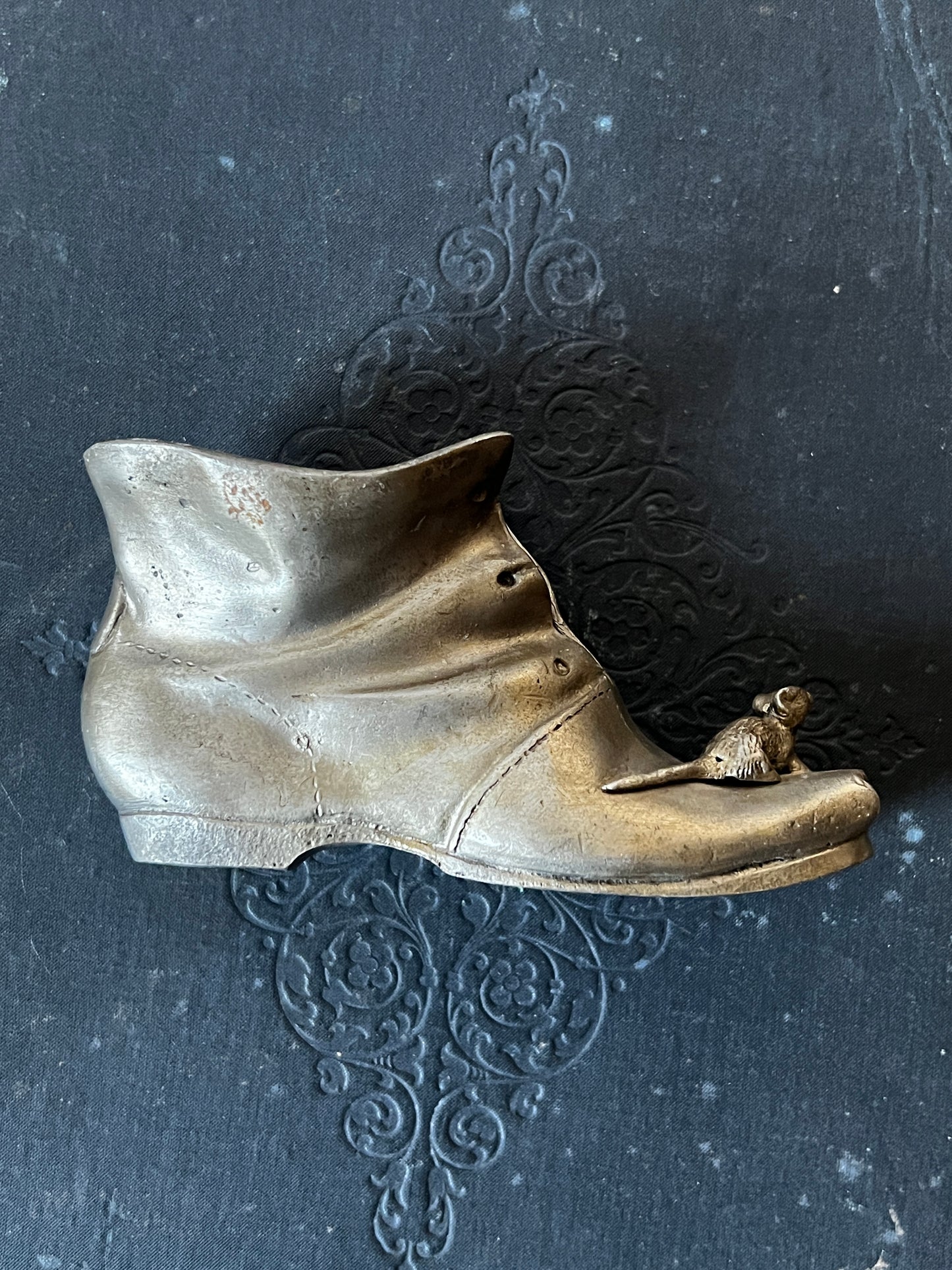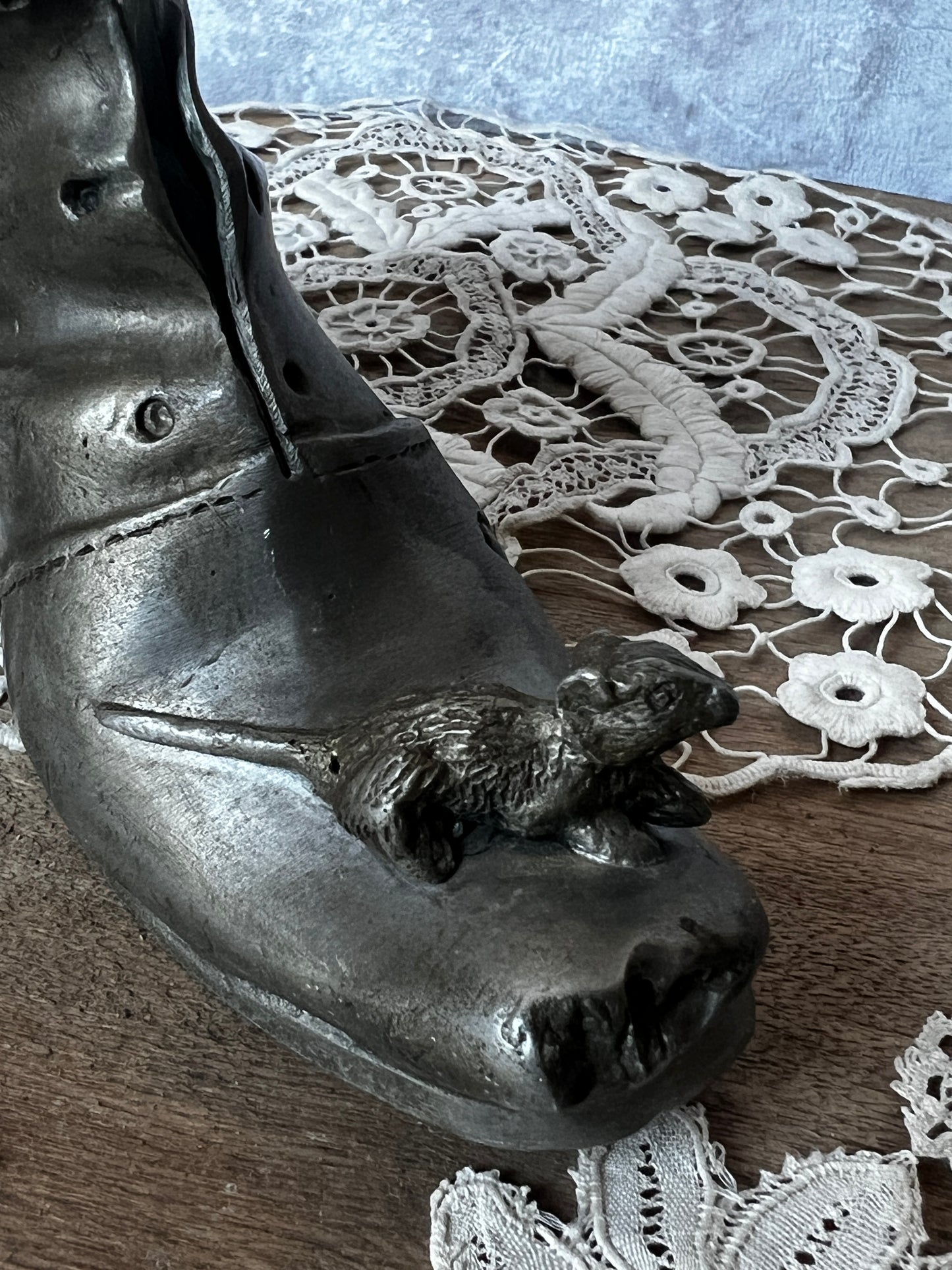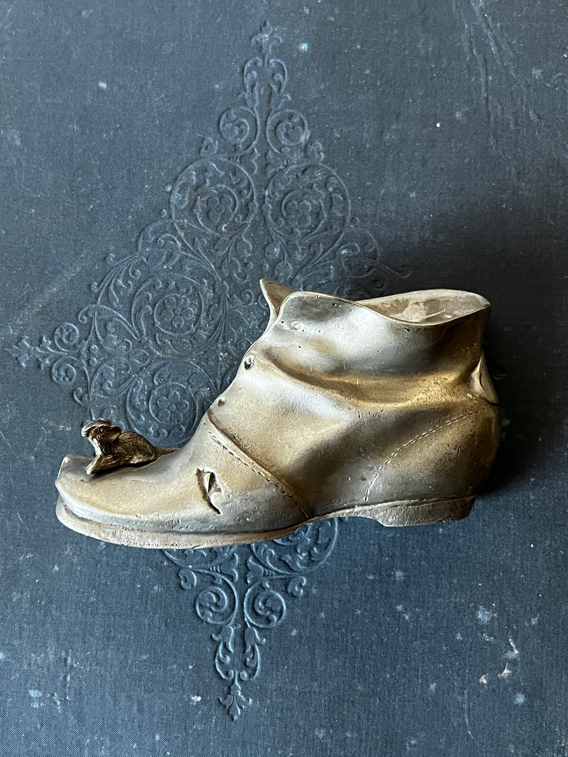 ねずみにかじられた靴を表現しており、小さな齧り痕やねずみの姿が愛らしく表現されています