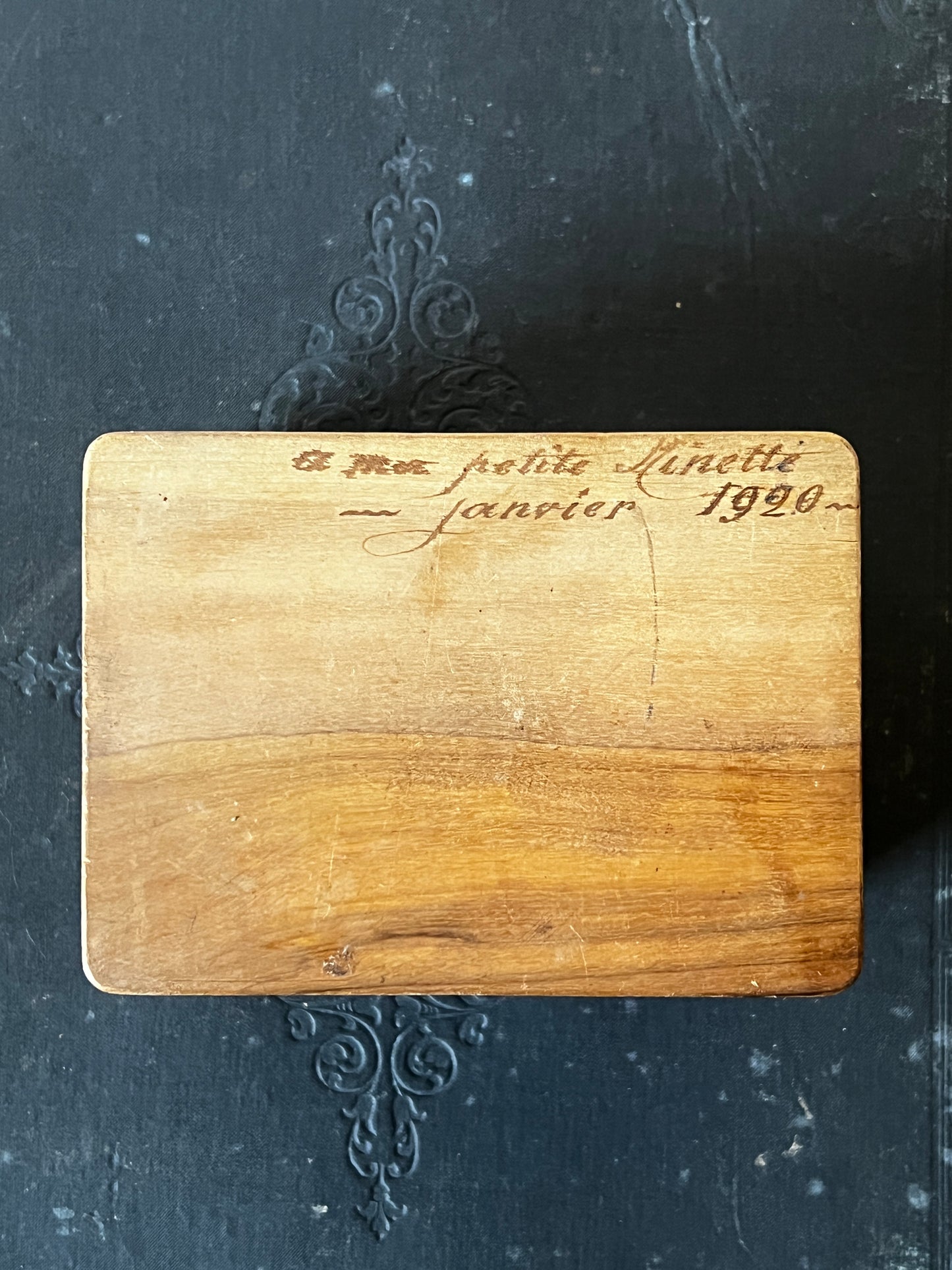 底裏に元の持ち主のメモ書きが記されており、1920年1月の文字がこの小箱に宿る個人的な歴史を物語っています