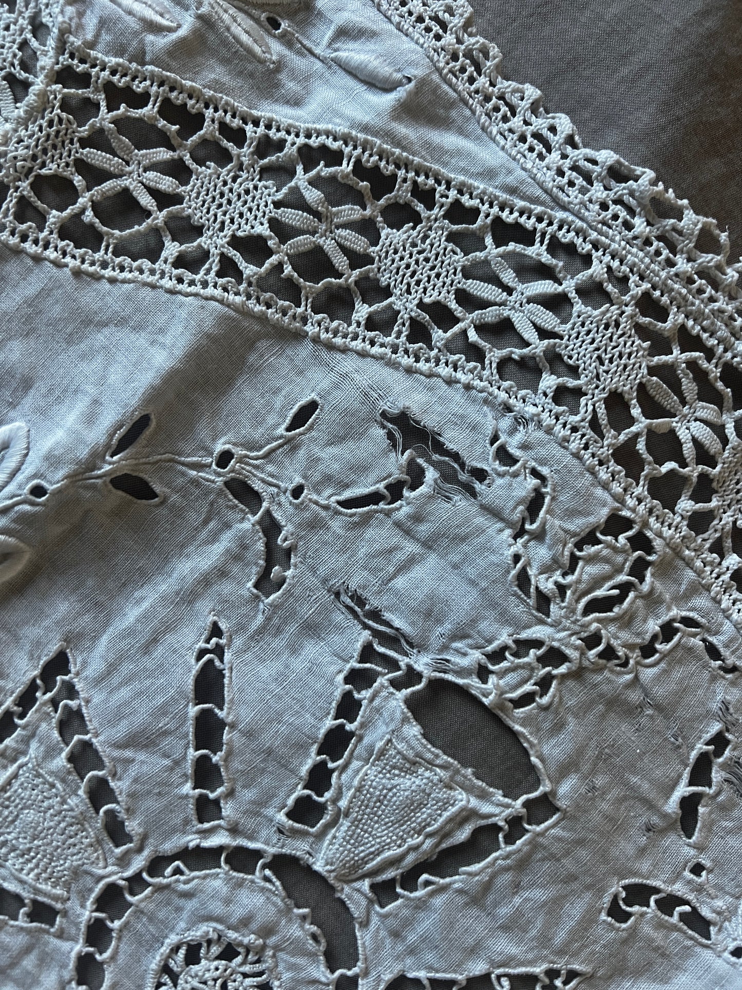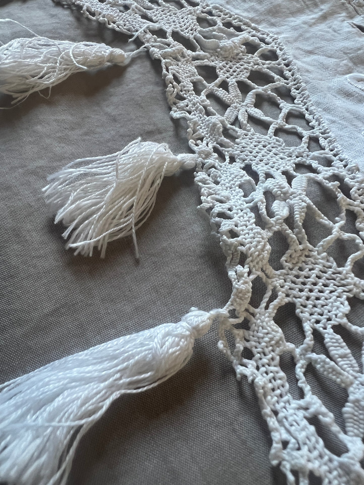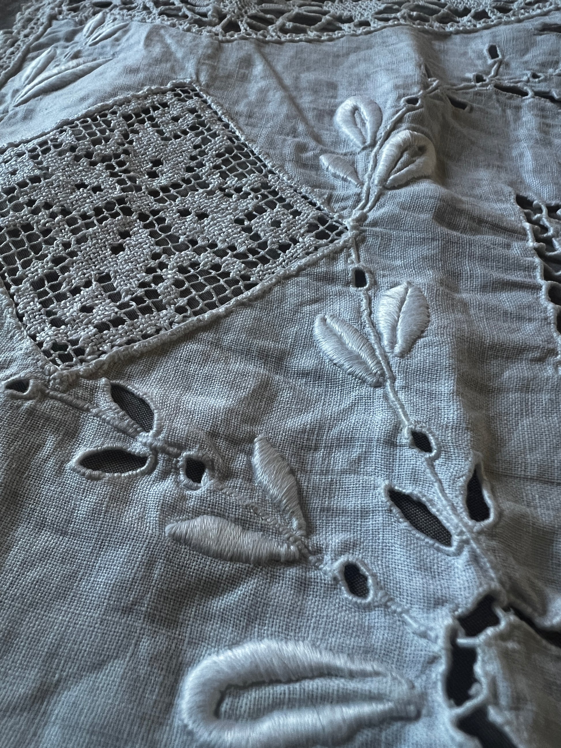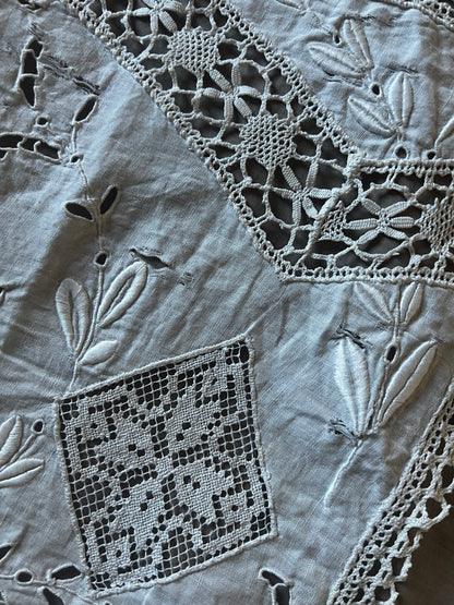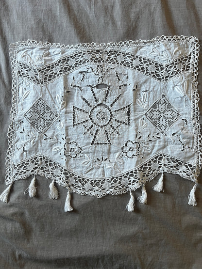 白刺繍とレースのインサートでデザインされた小さなカーテンです