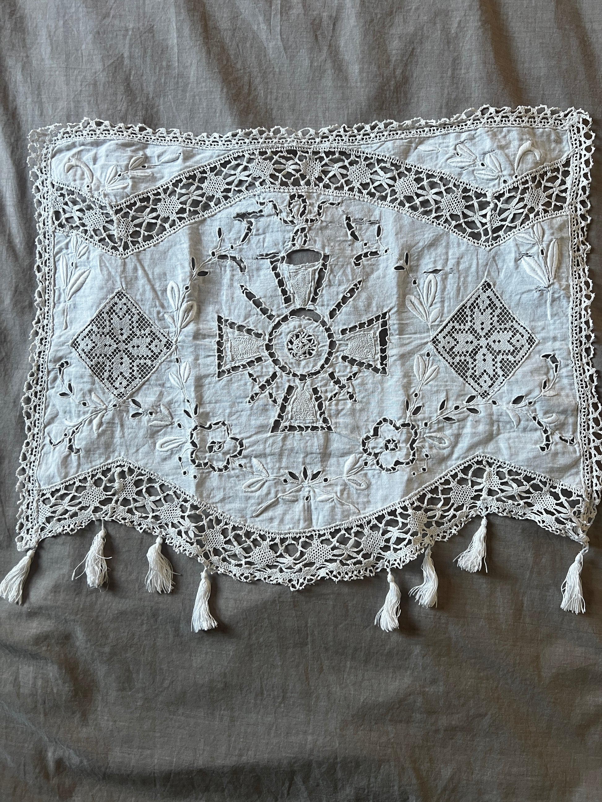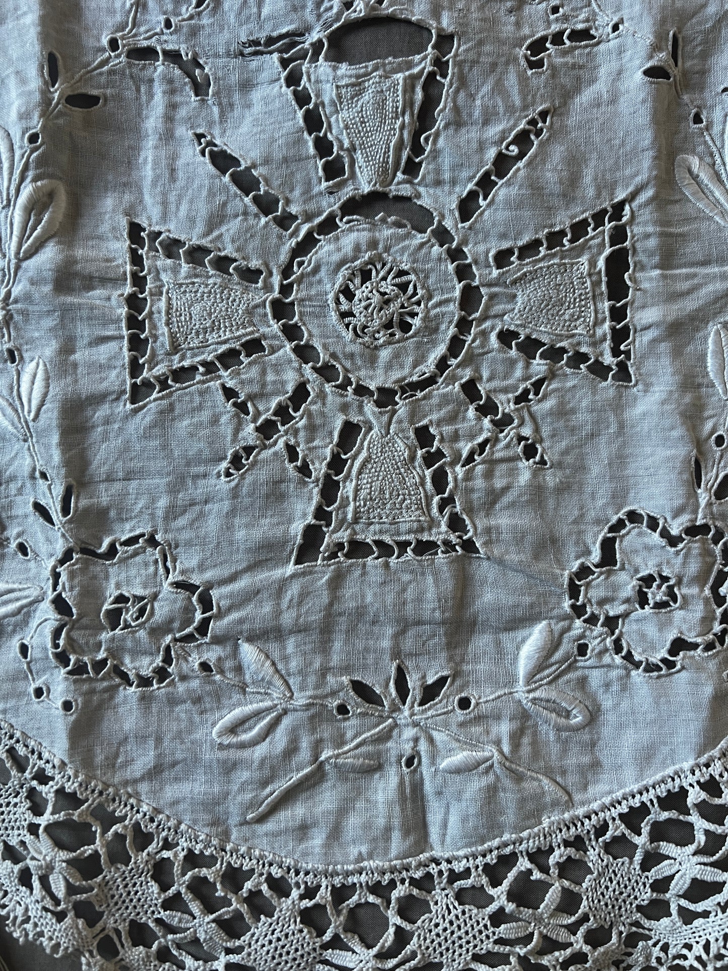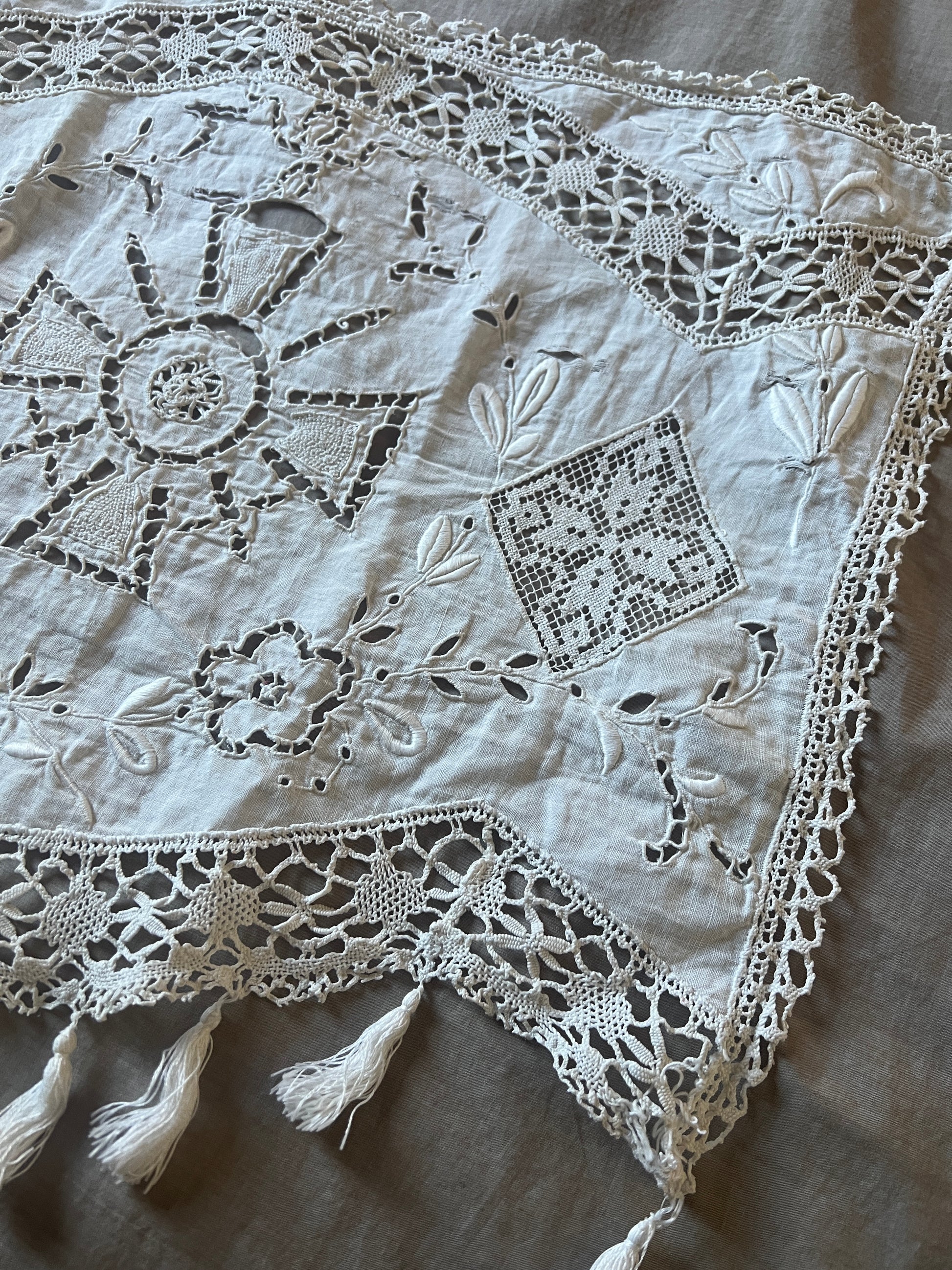 白刺繍とレースのインサートでデザインされた小さなカーテンです
