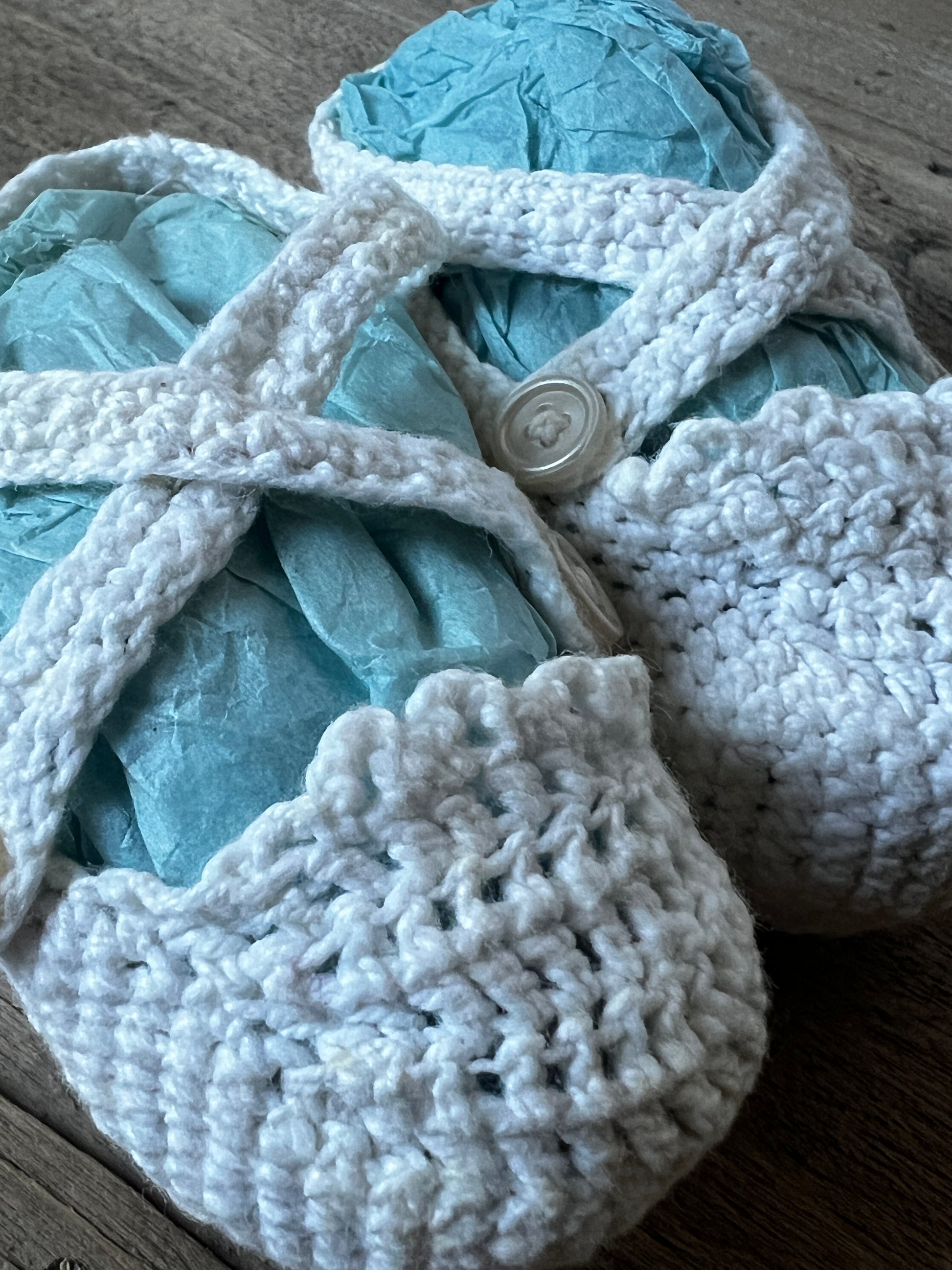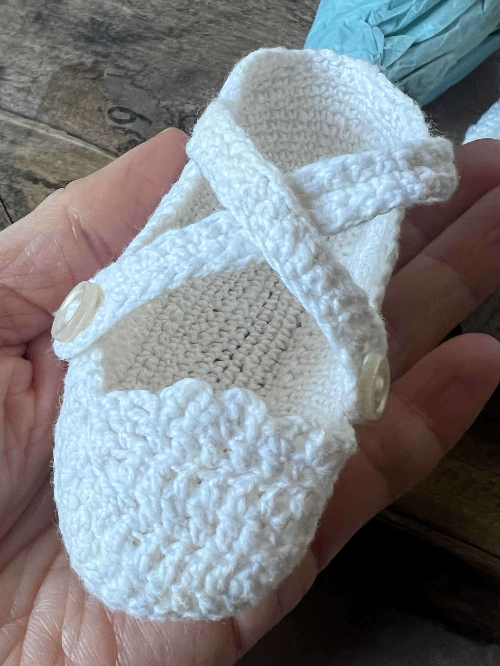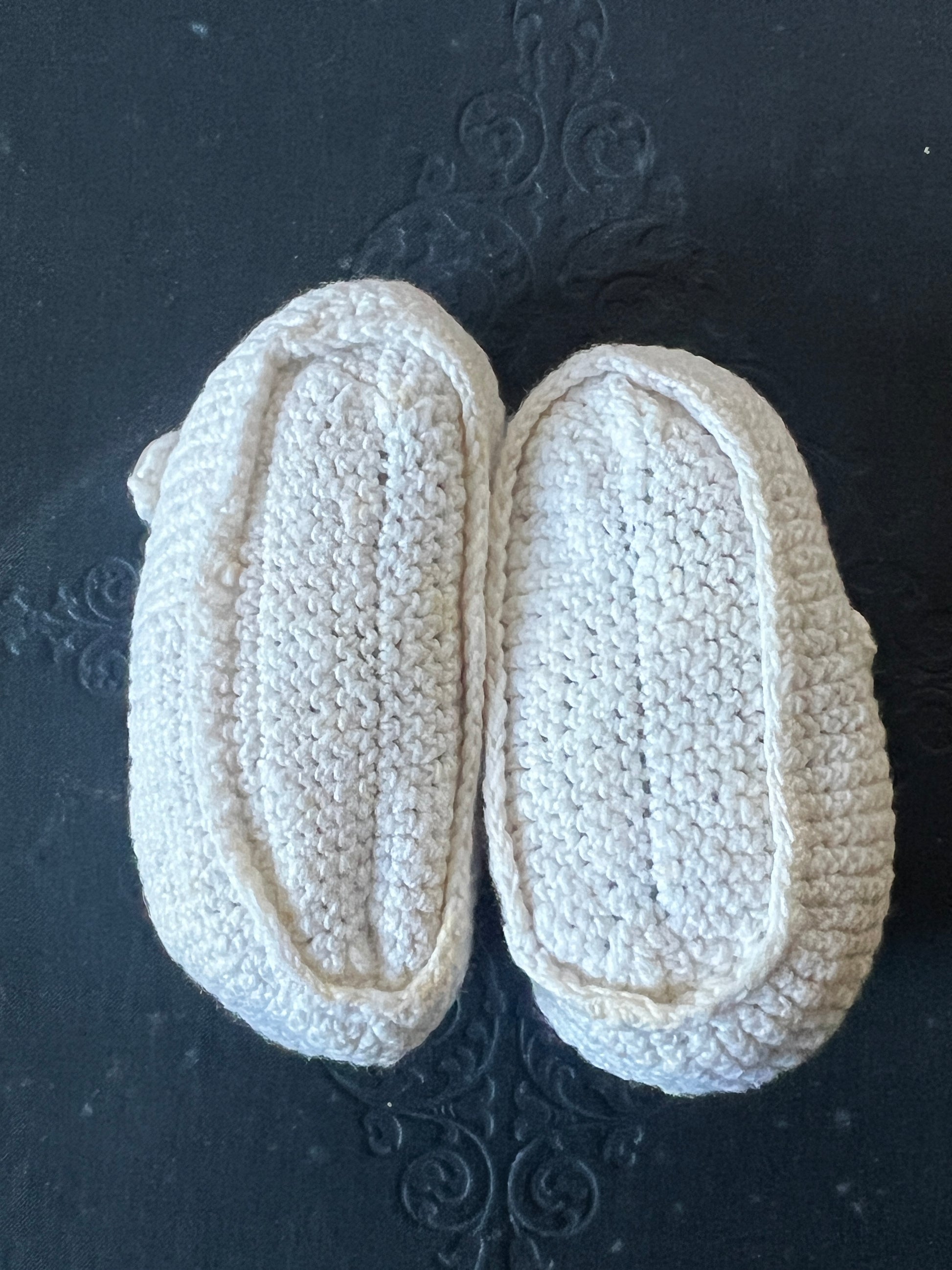 クロシェ編みで作られたかわいらしい赤ちゃん用のシューズです