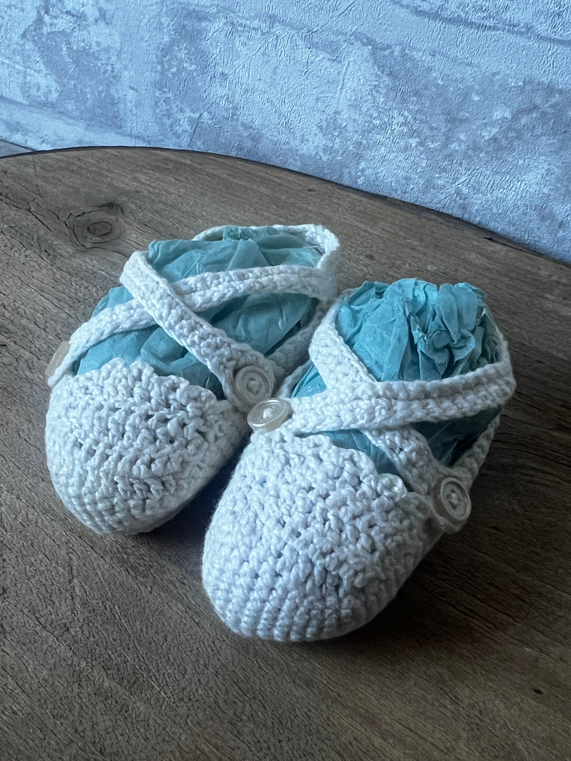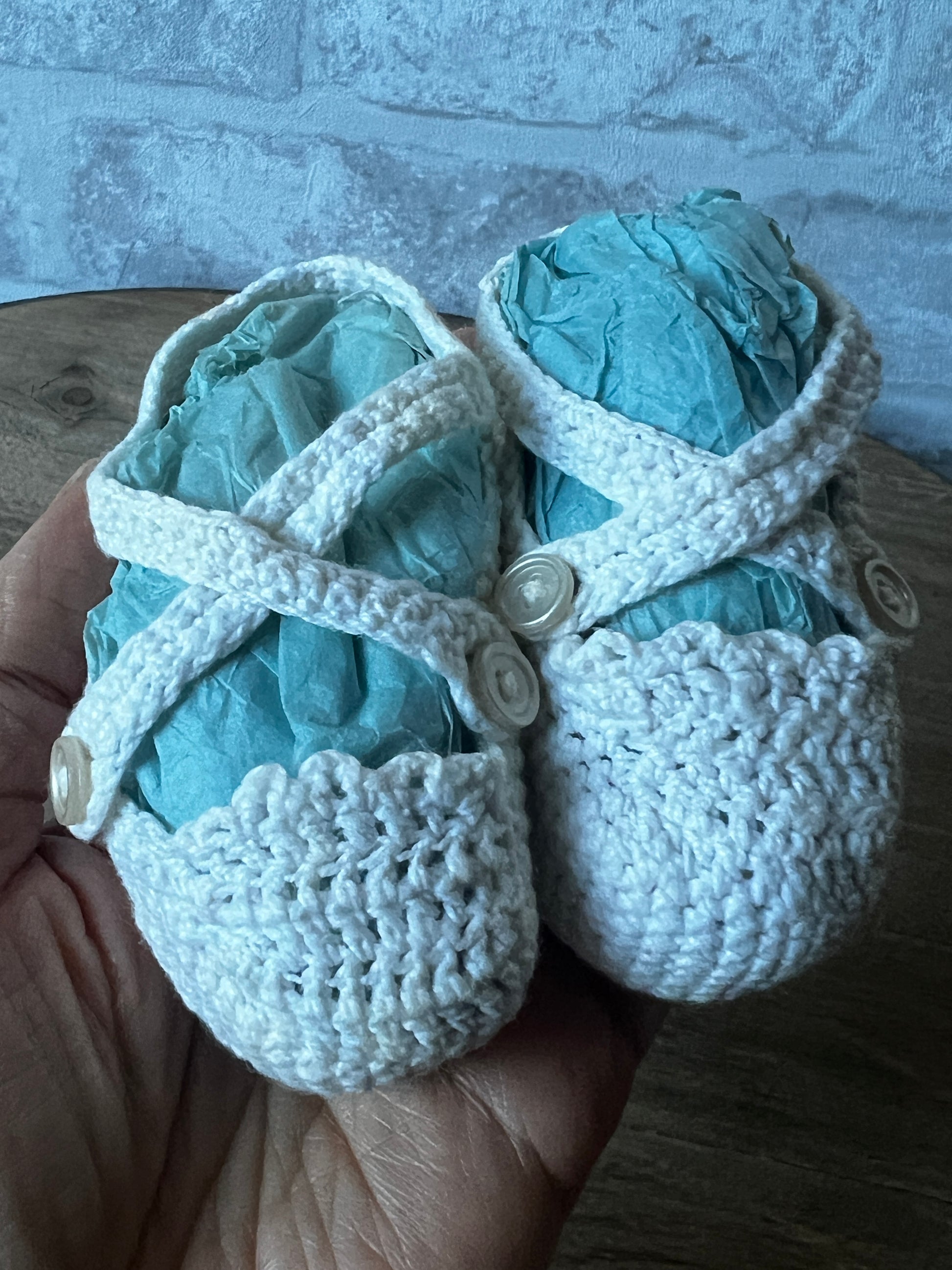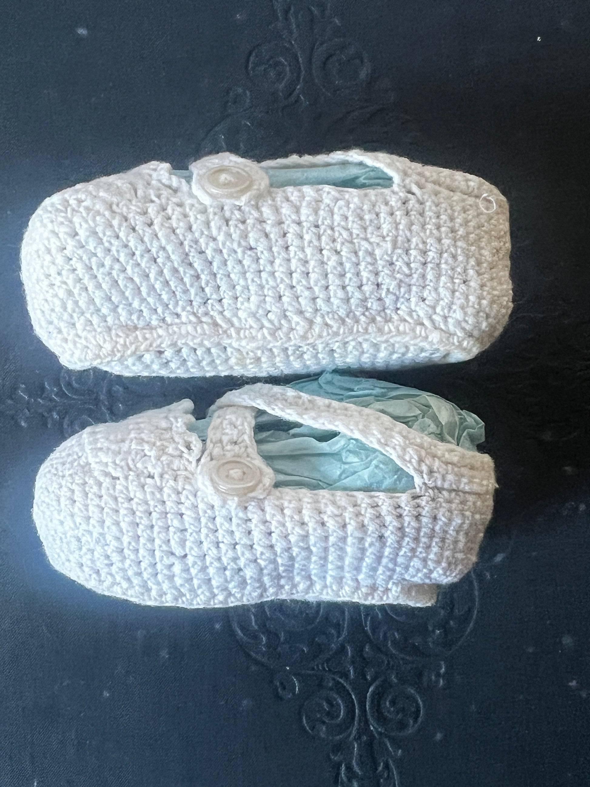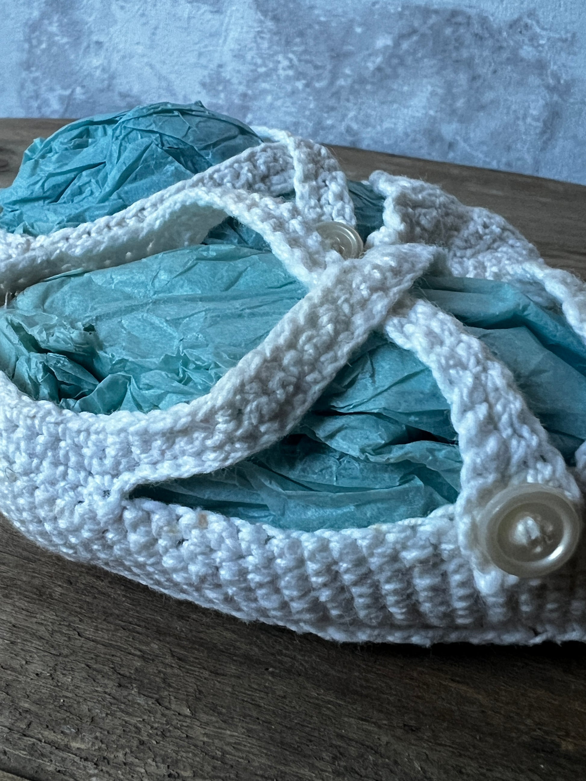 クロシェ編みで作られたかわいらしい赤ちゃん用のシューズです