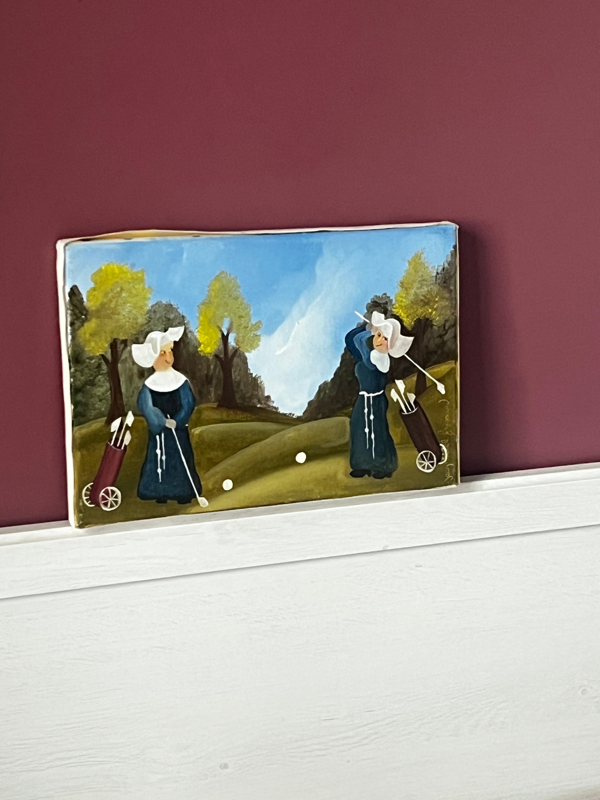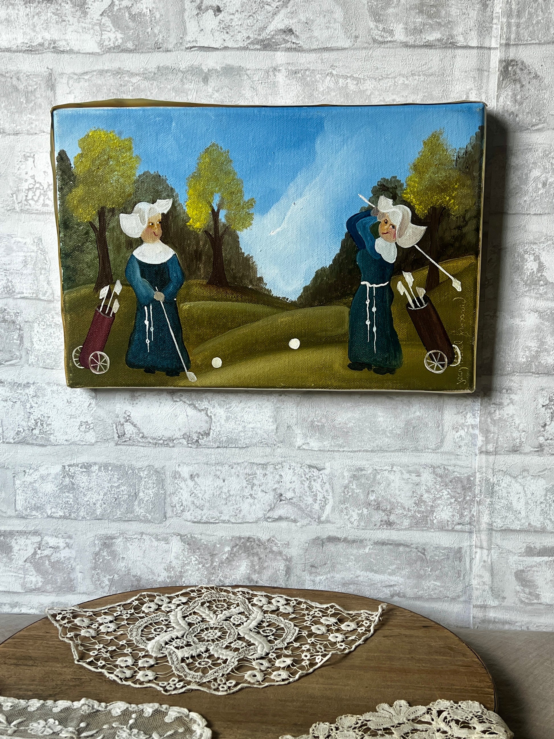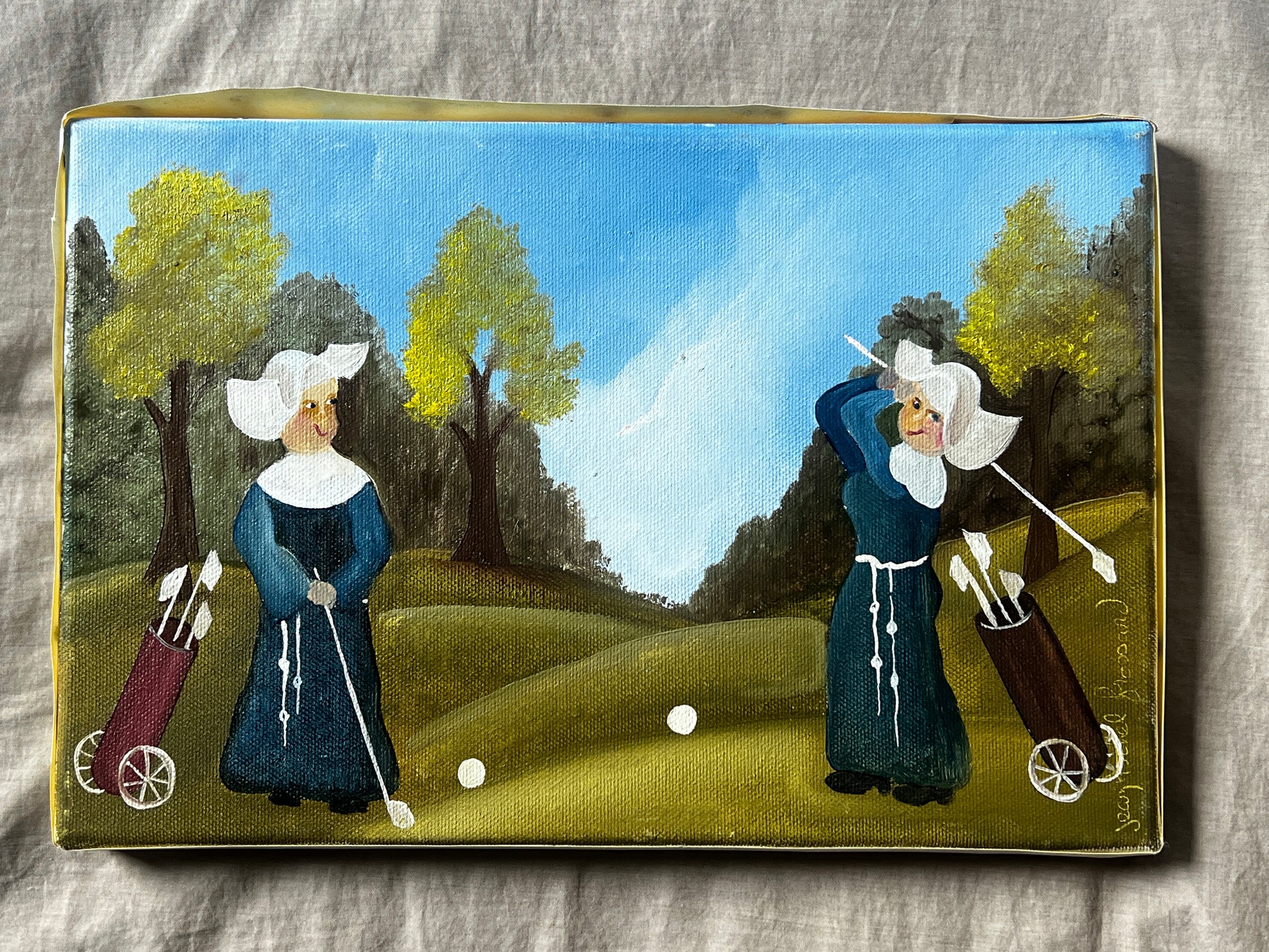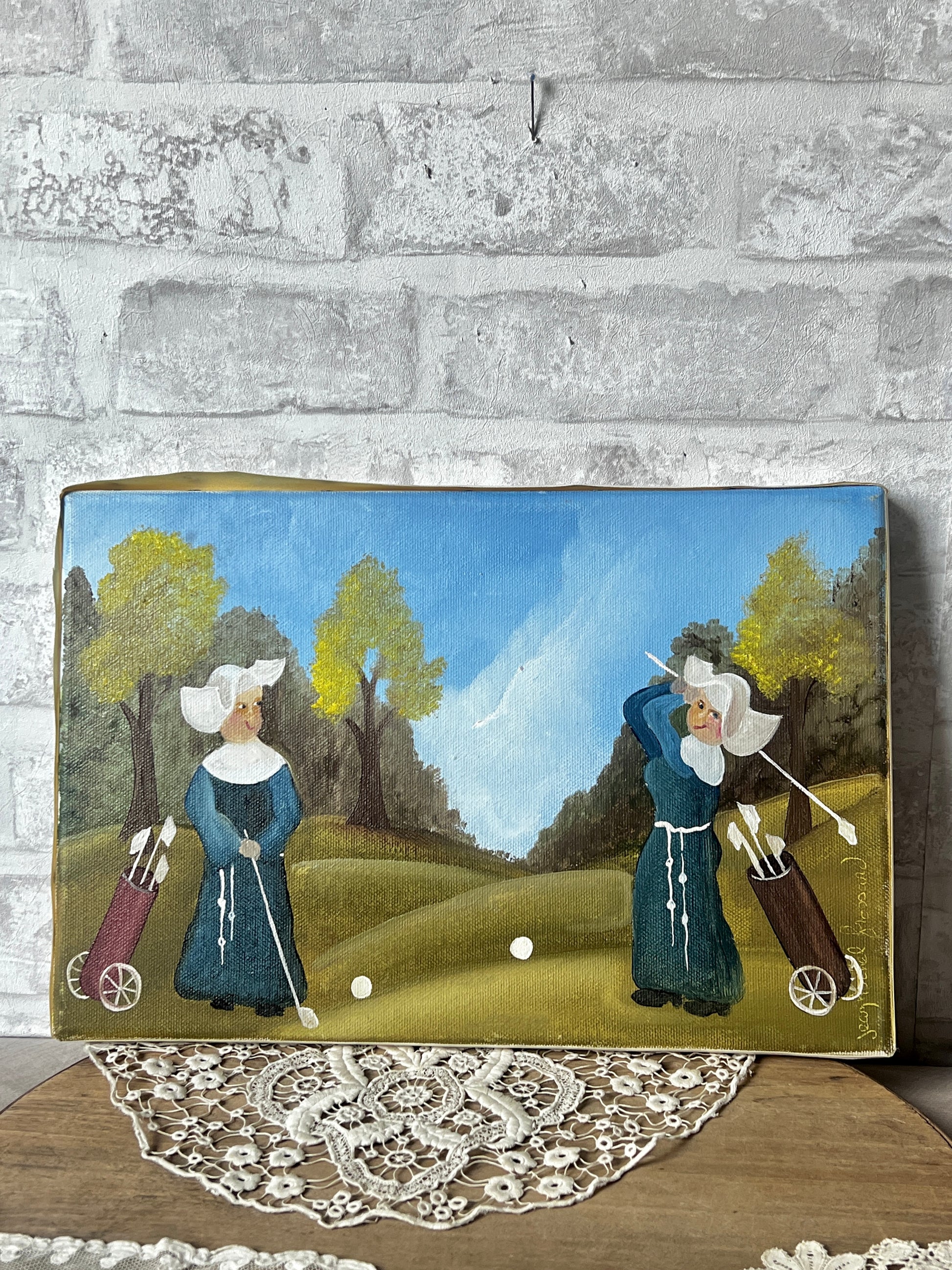 ユーモアと優しさが溢れる、修道女たちのゴルフシーンを描いた愛らしいアクリル画です