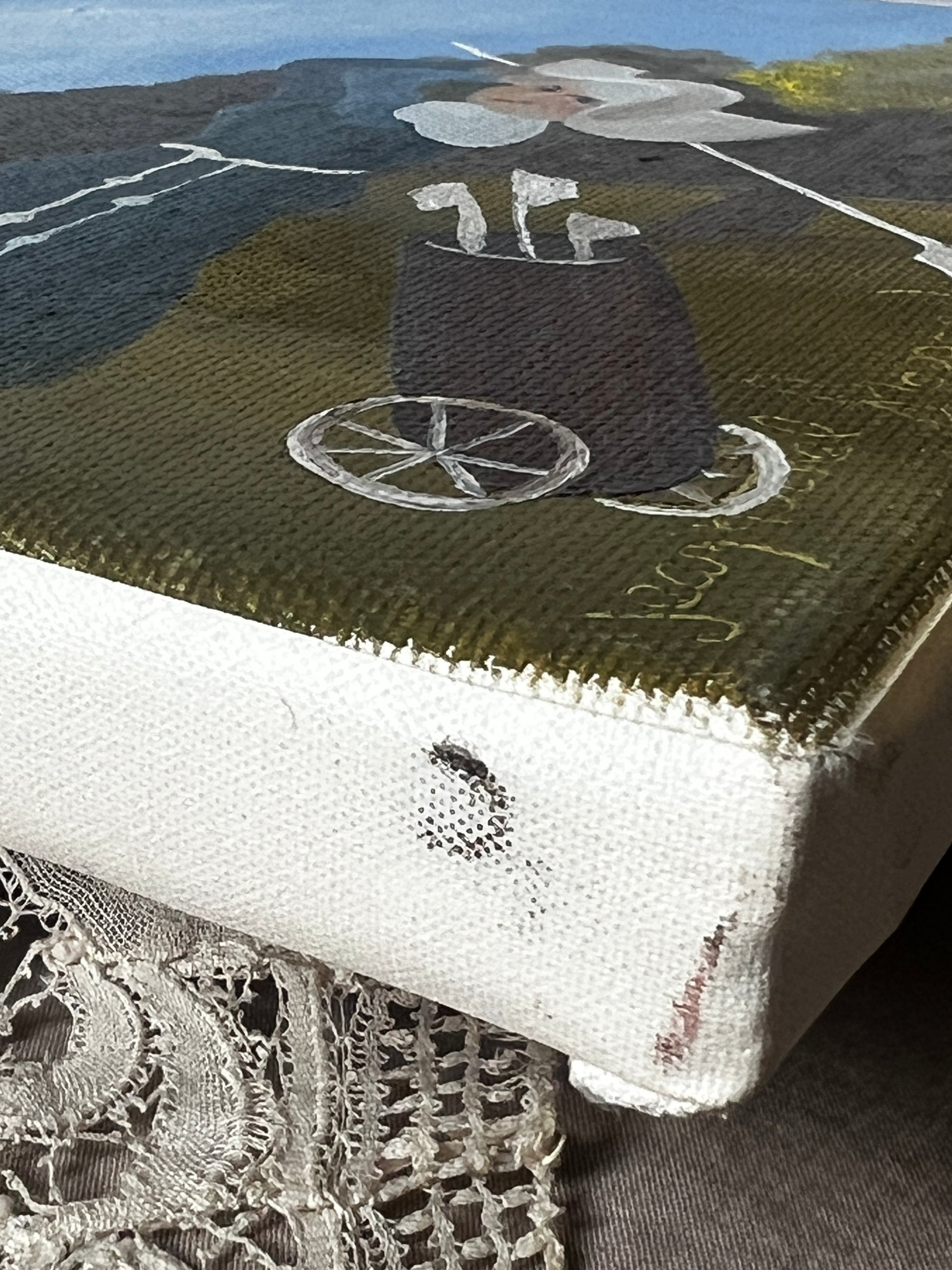 手描きならではの筆のタッチや色の重なりが、キャンバスの上にいきいきと表現されています