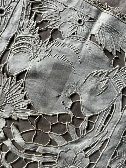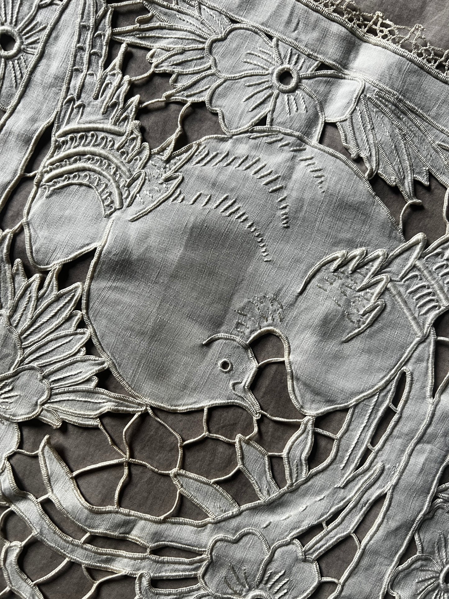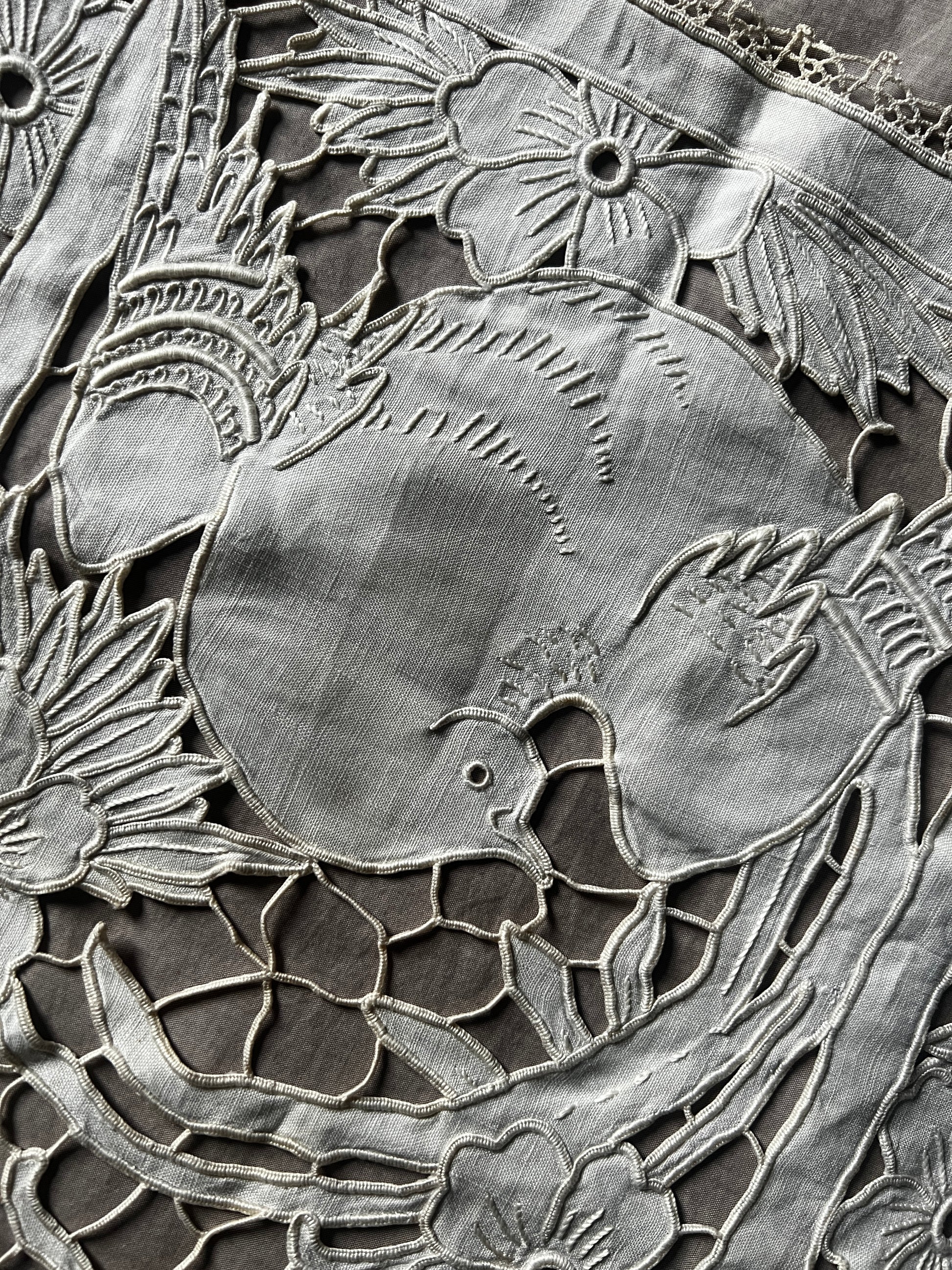 細かなカットワークのステッチで花と鳥が美しく描かれています