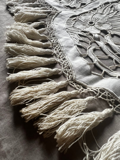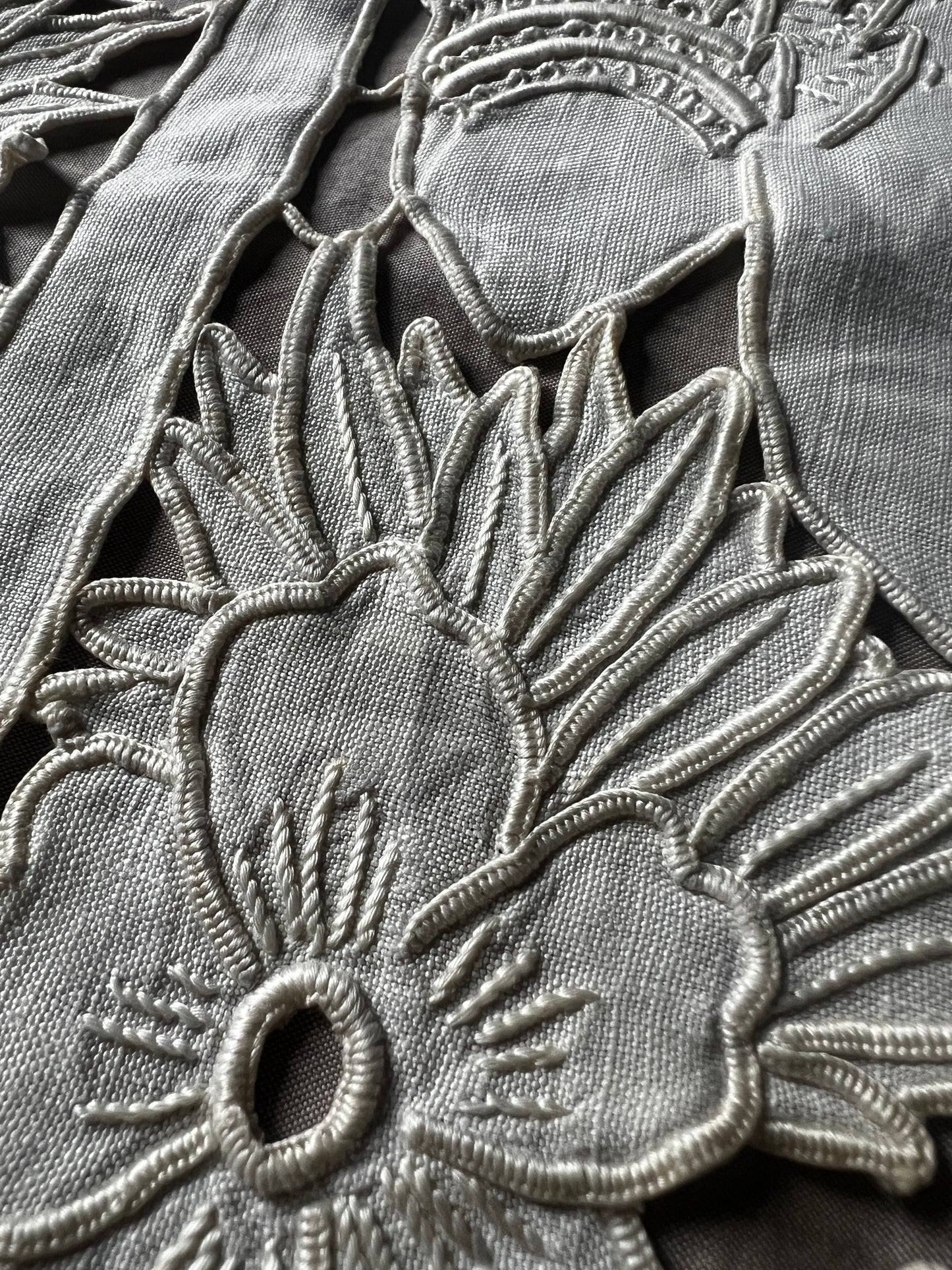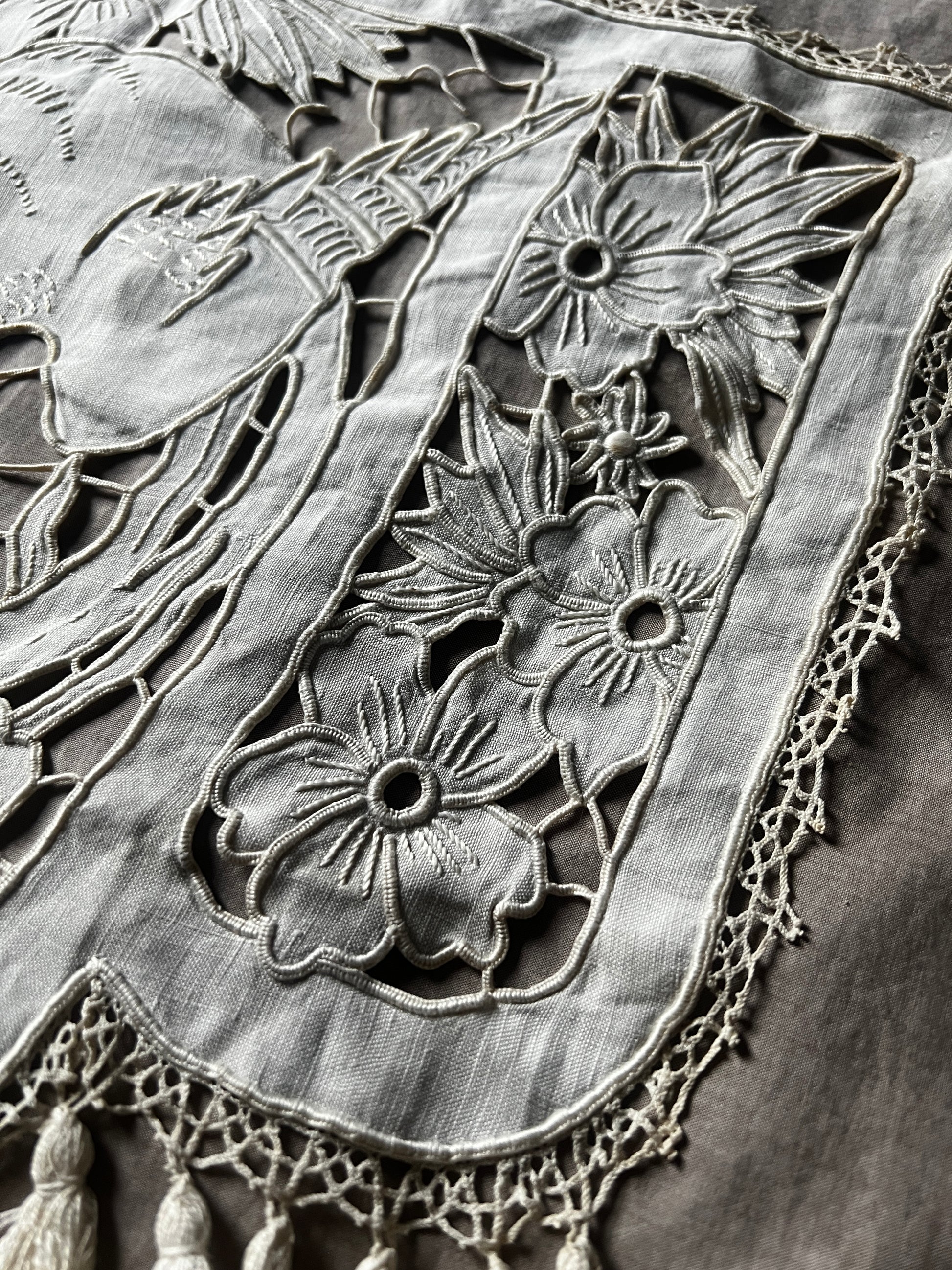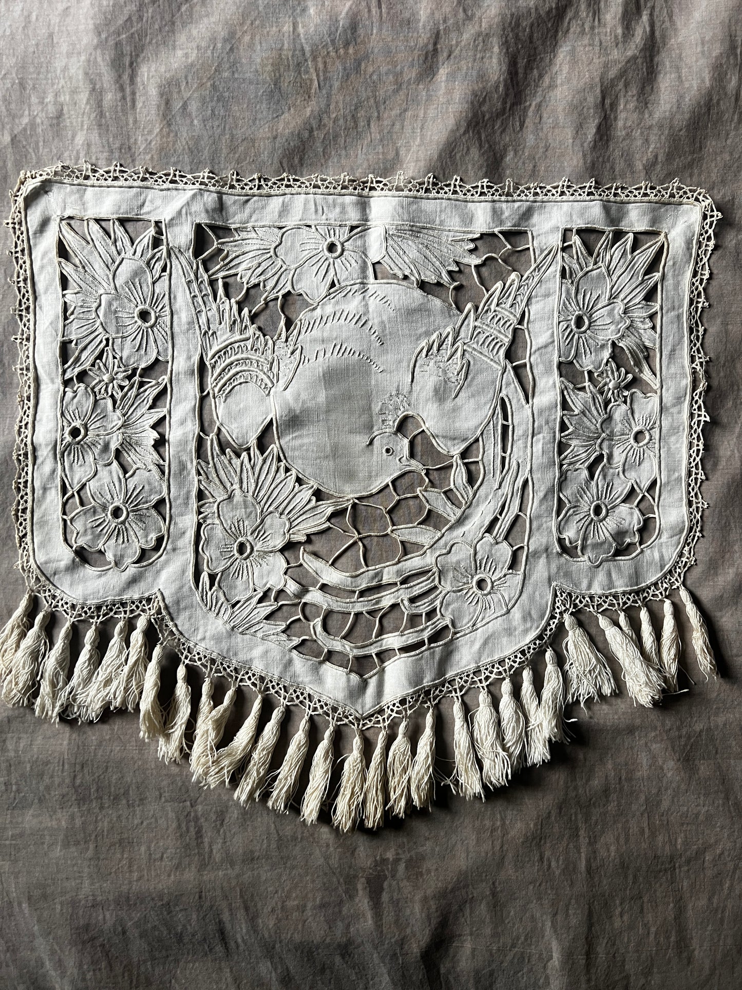 細かなカットワークのステッチで花と鳥が美しく描かれています