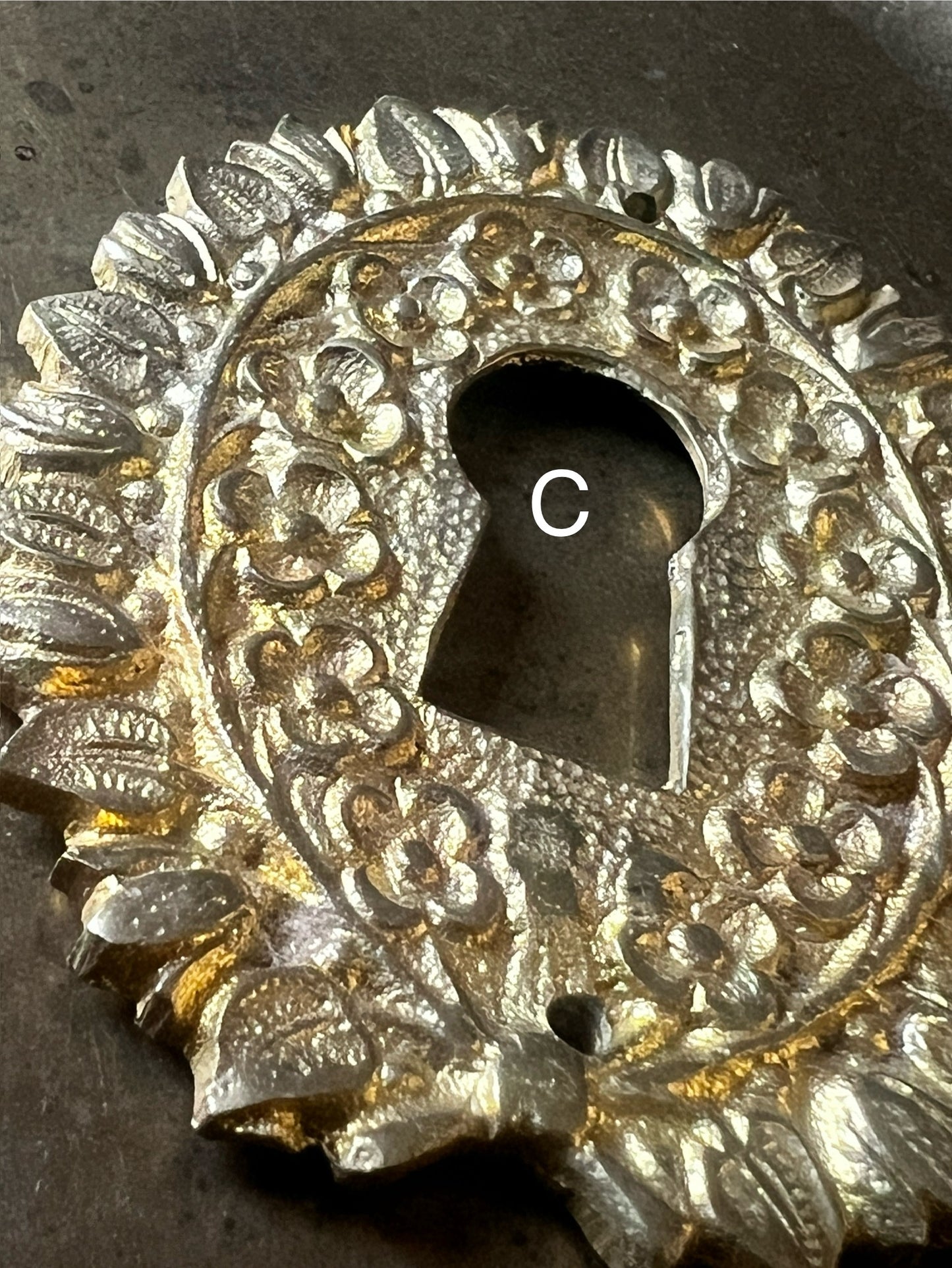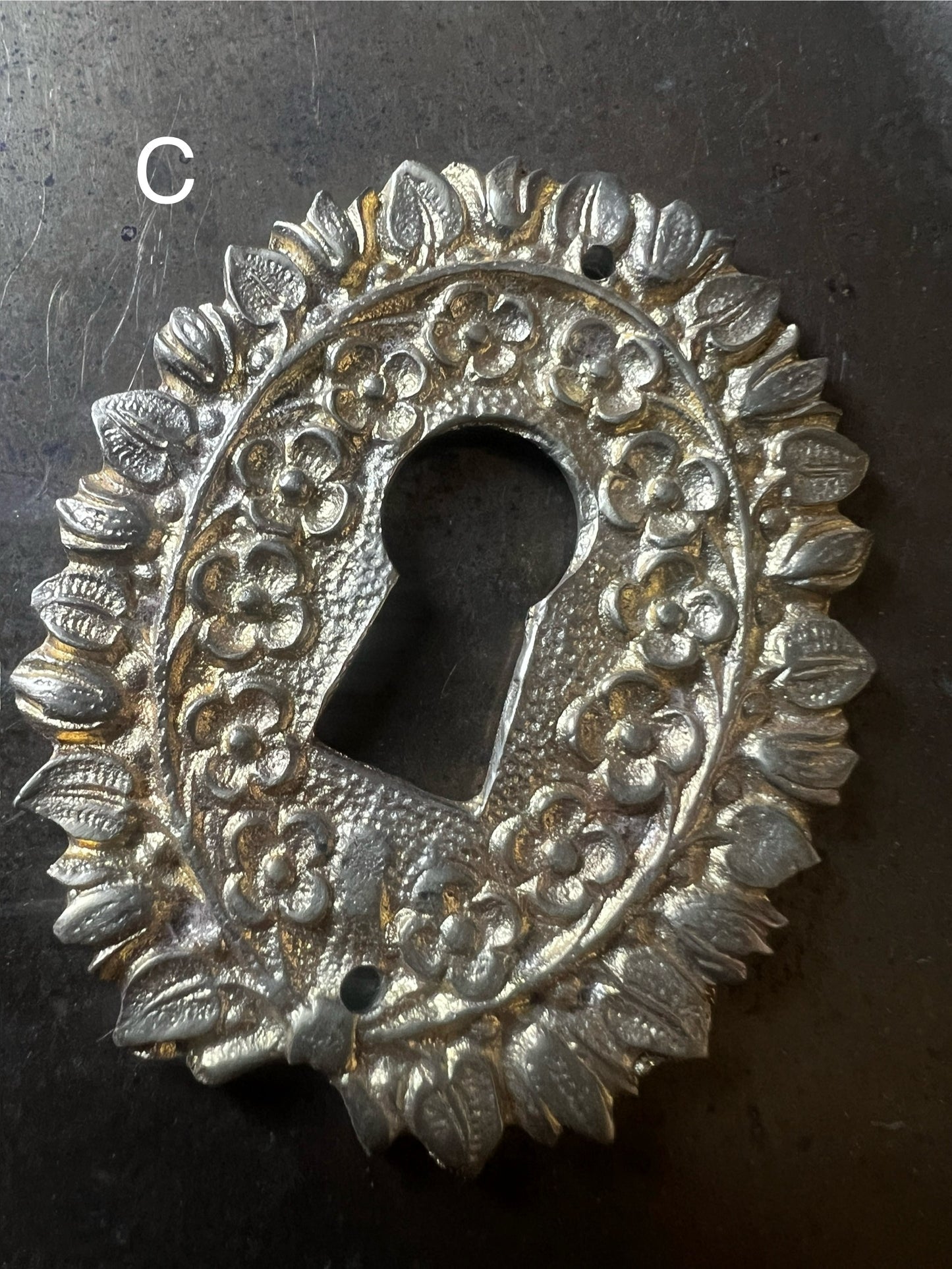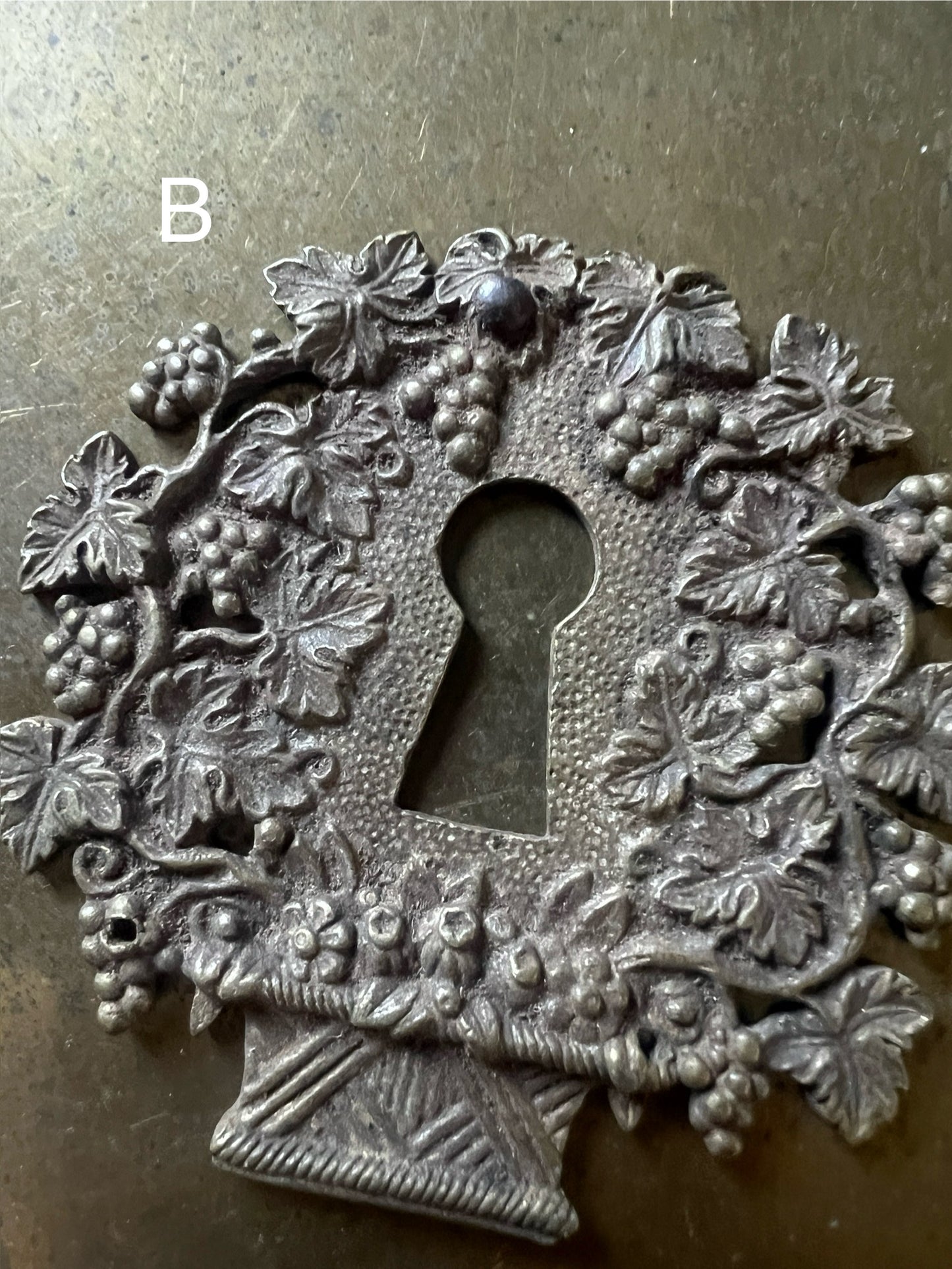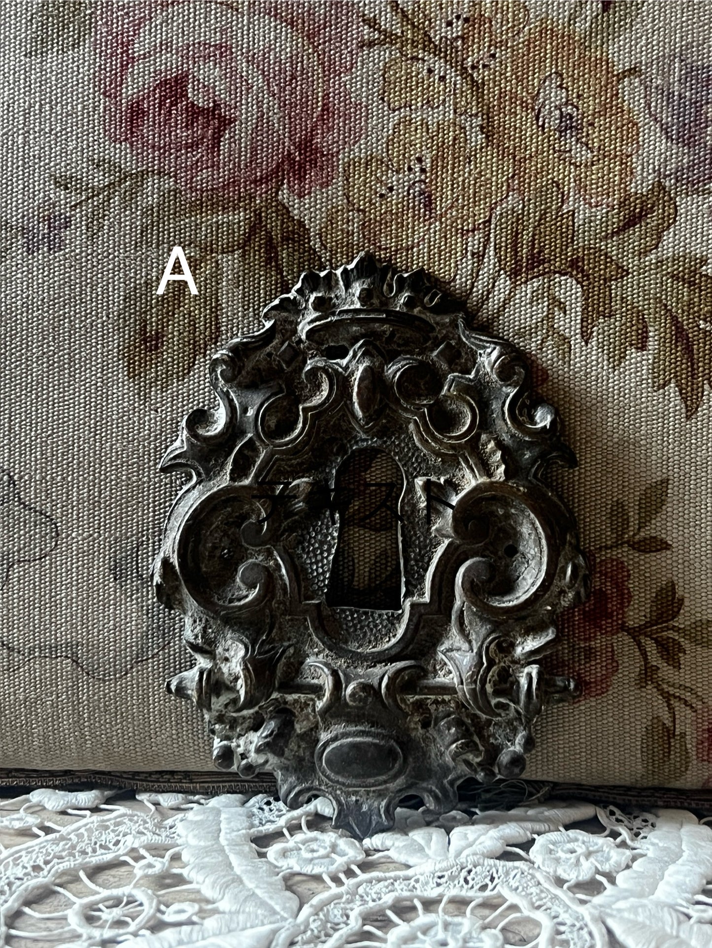 古びた金属のくすんだ風合いと細工が特徴の鍵穴装飾金具です