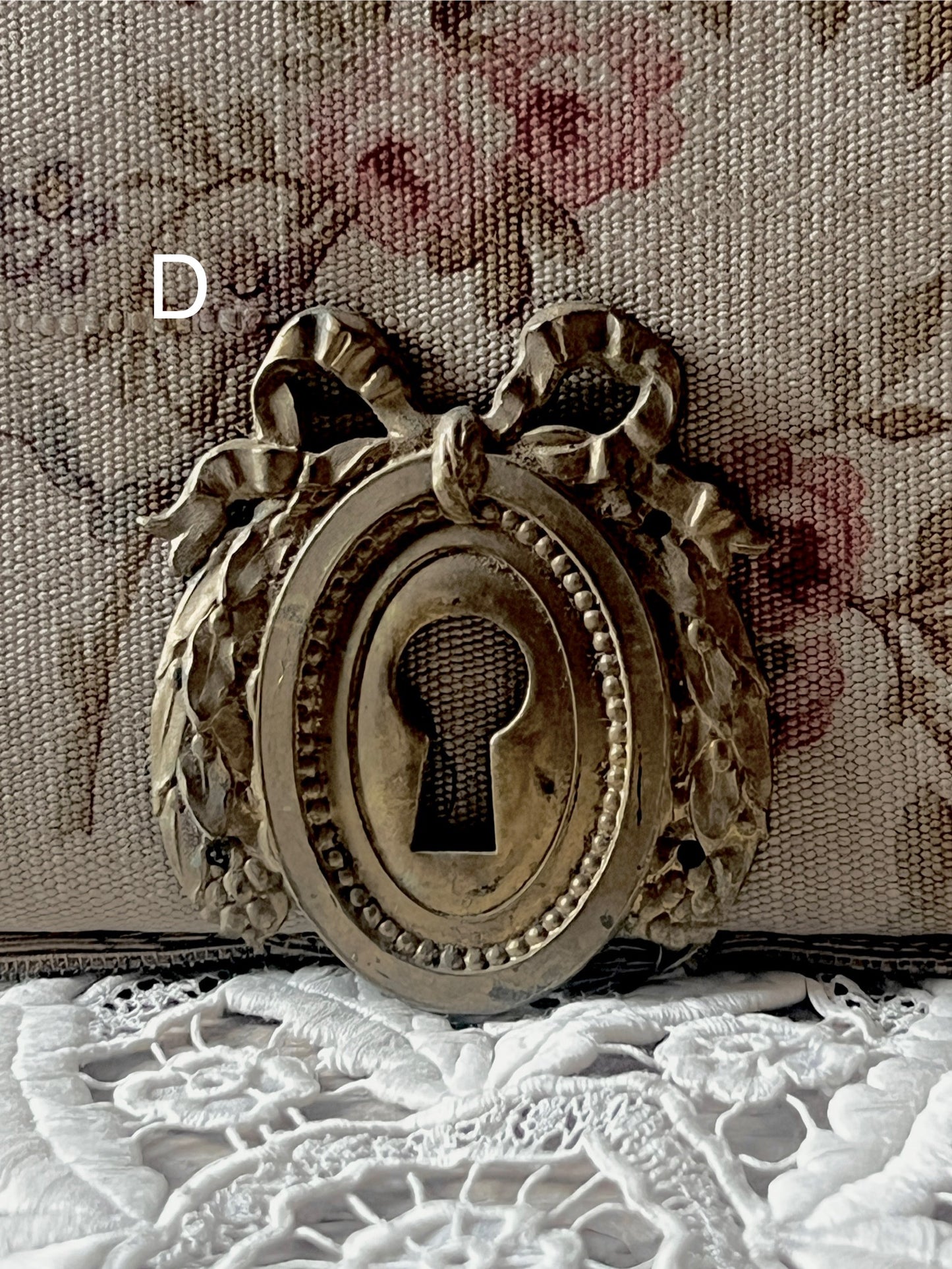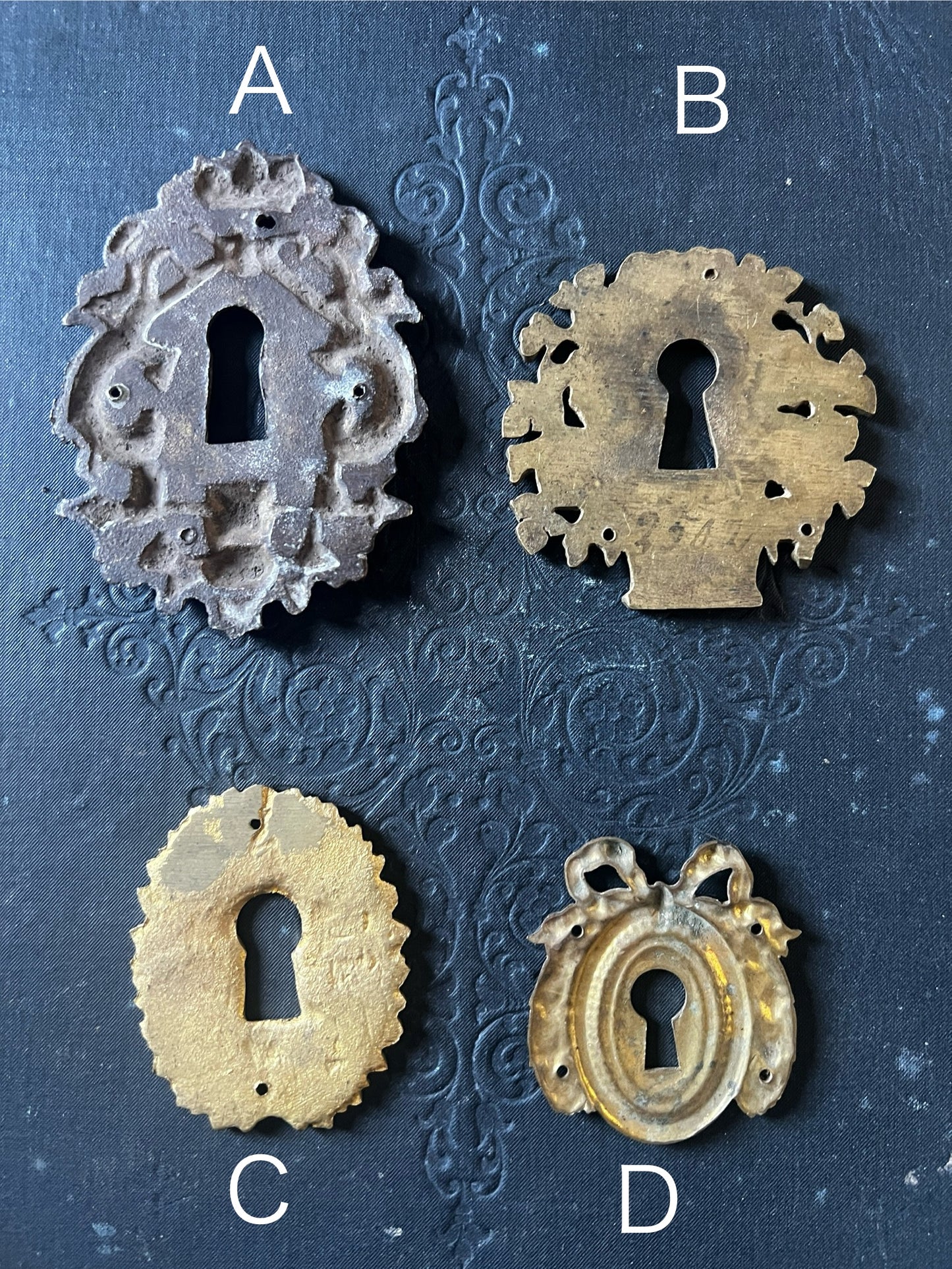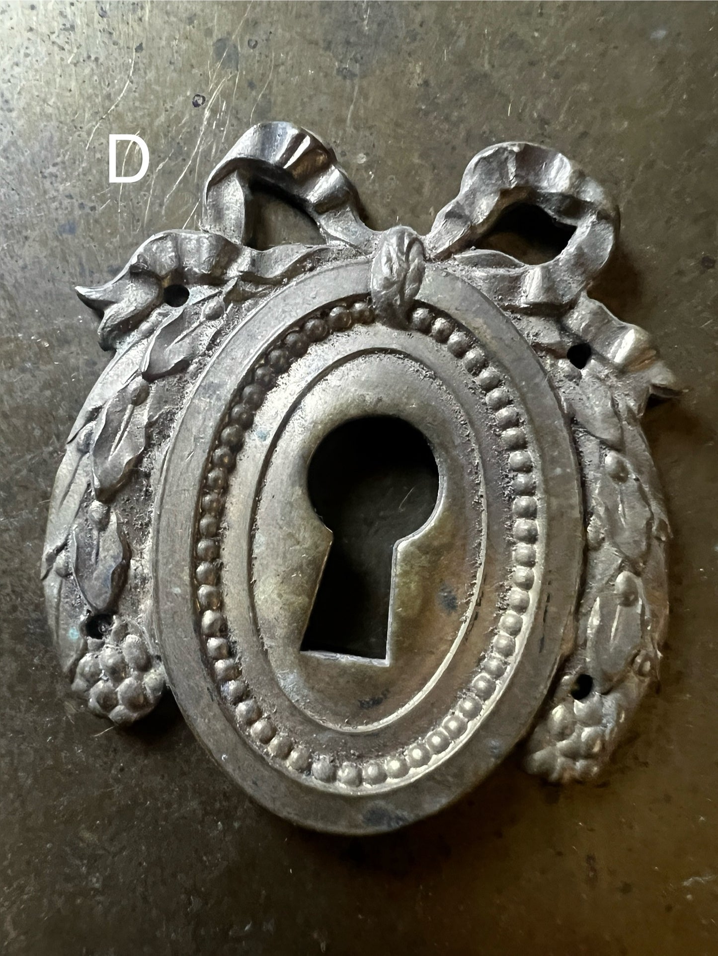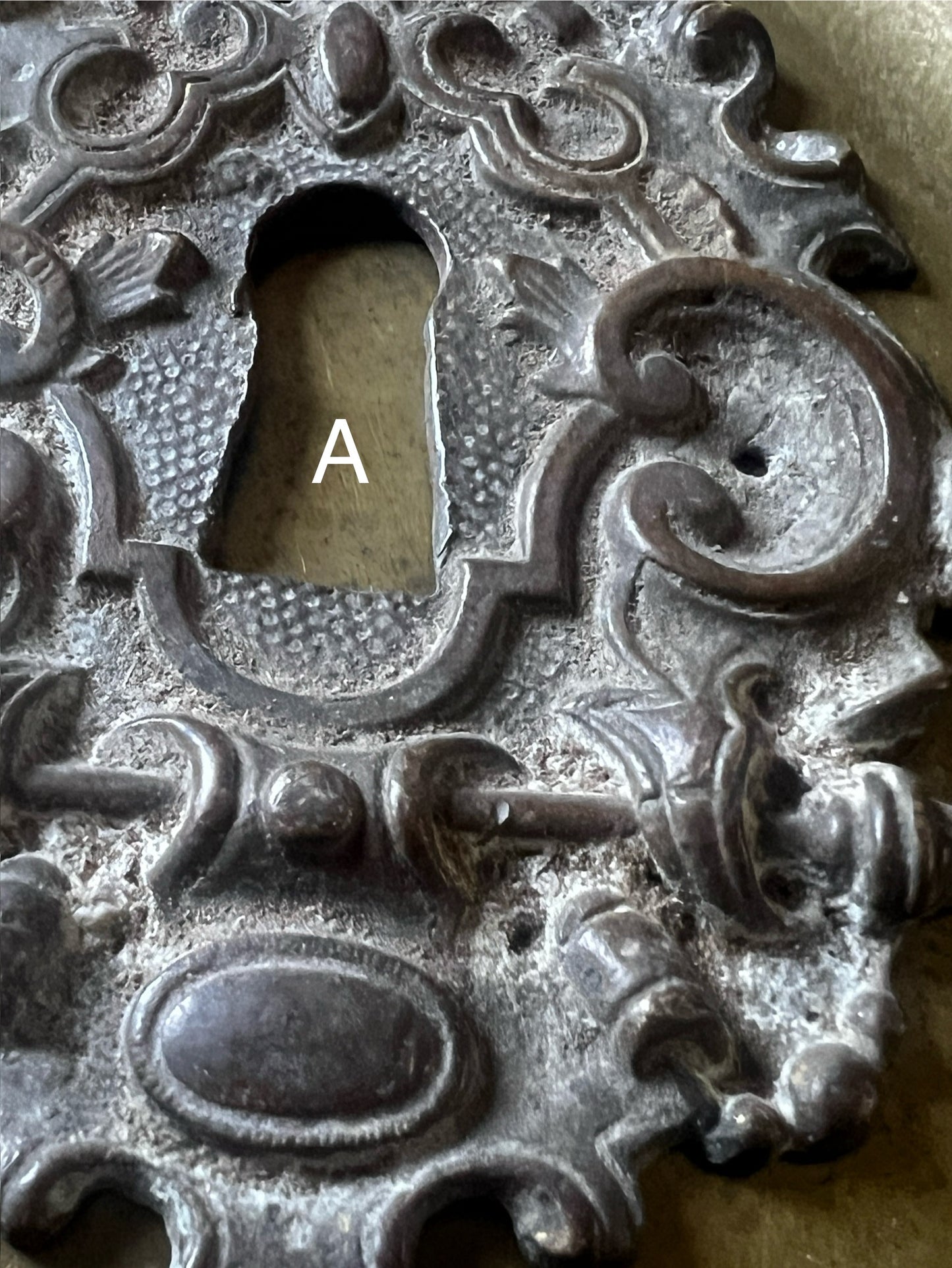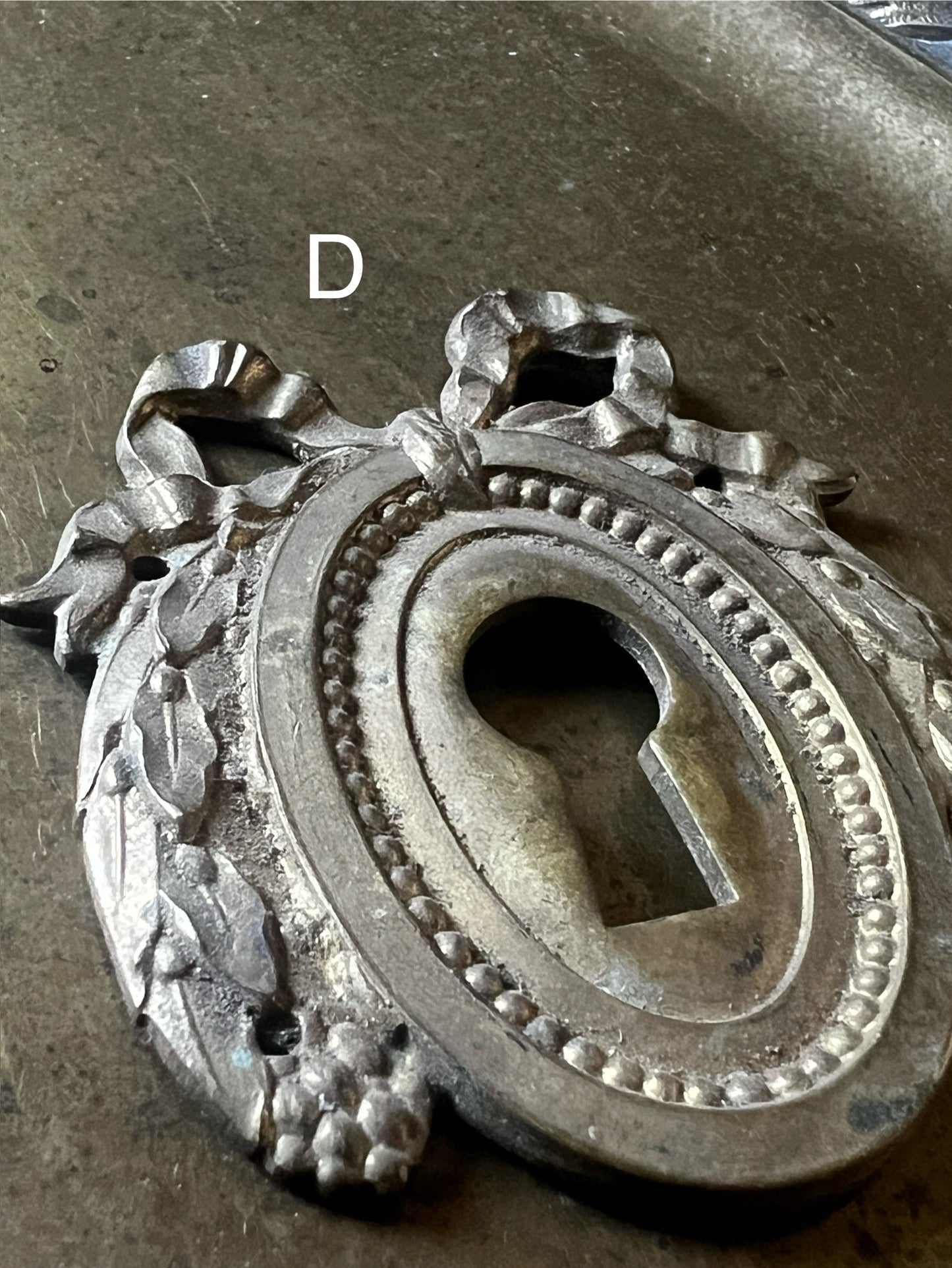 古びた金属のくすんだ風合いと細工が特徴の鍵穴装飾金具です