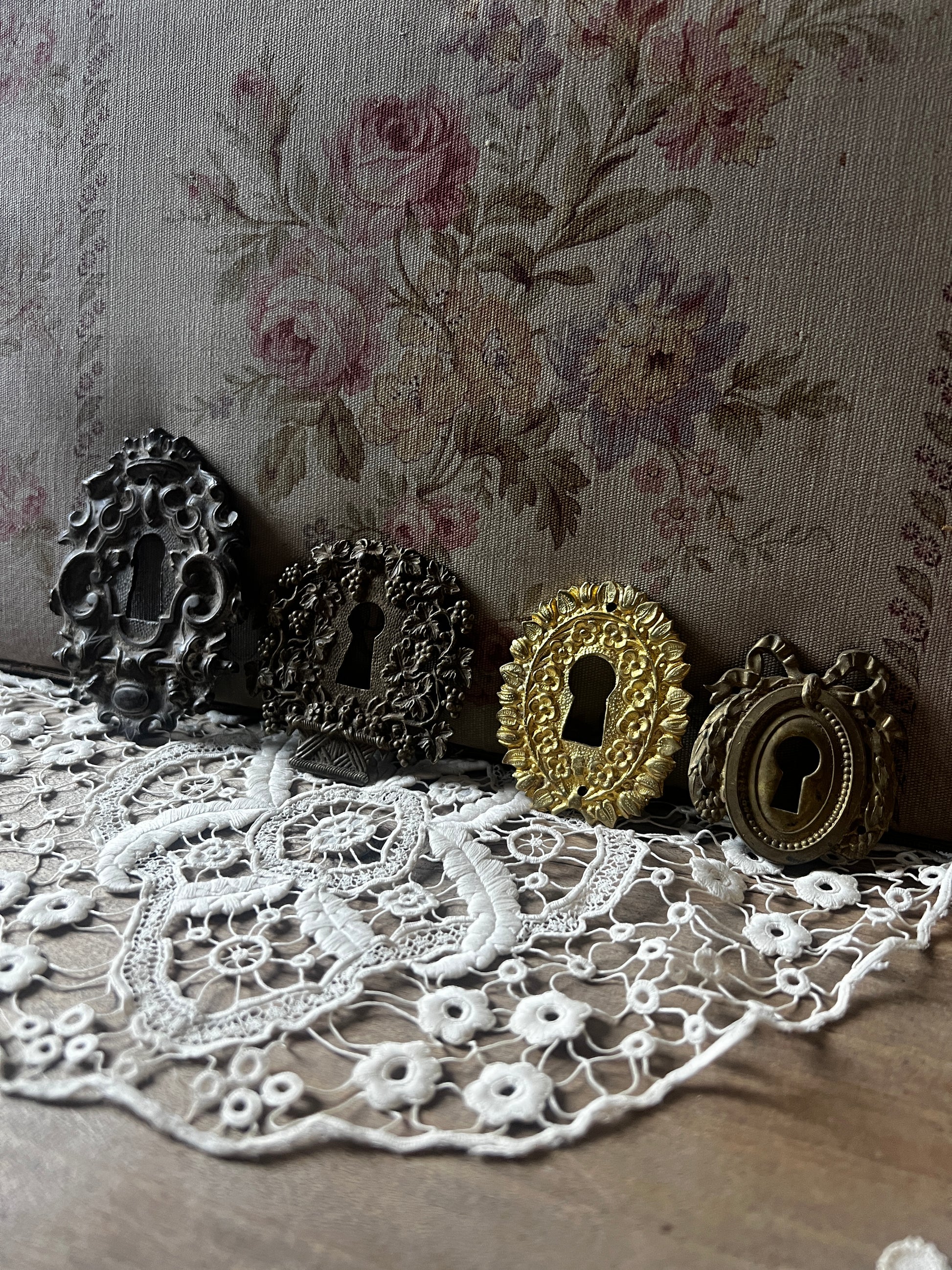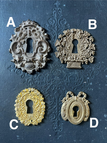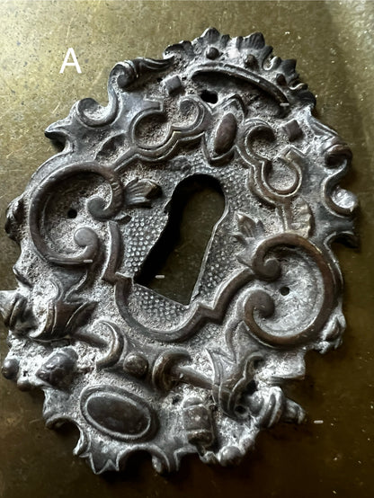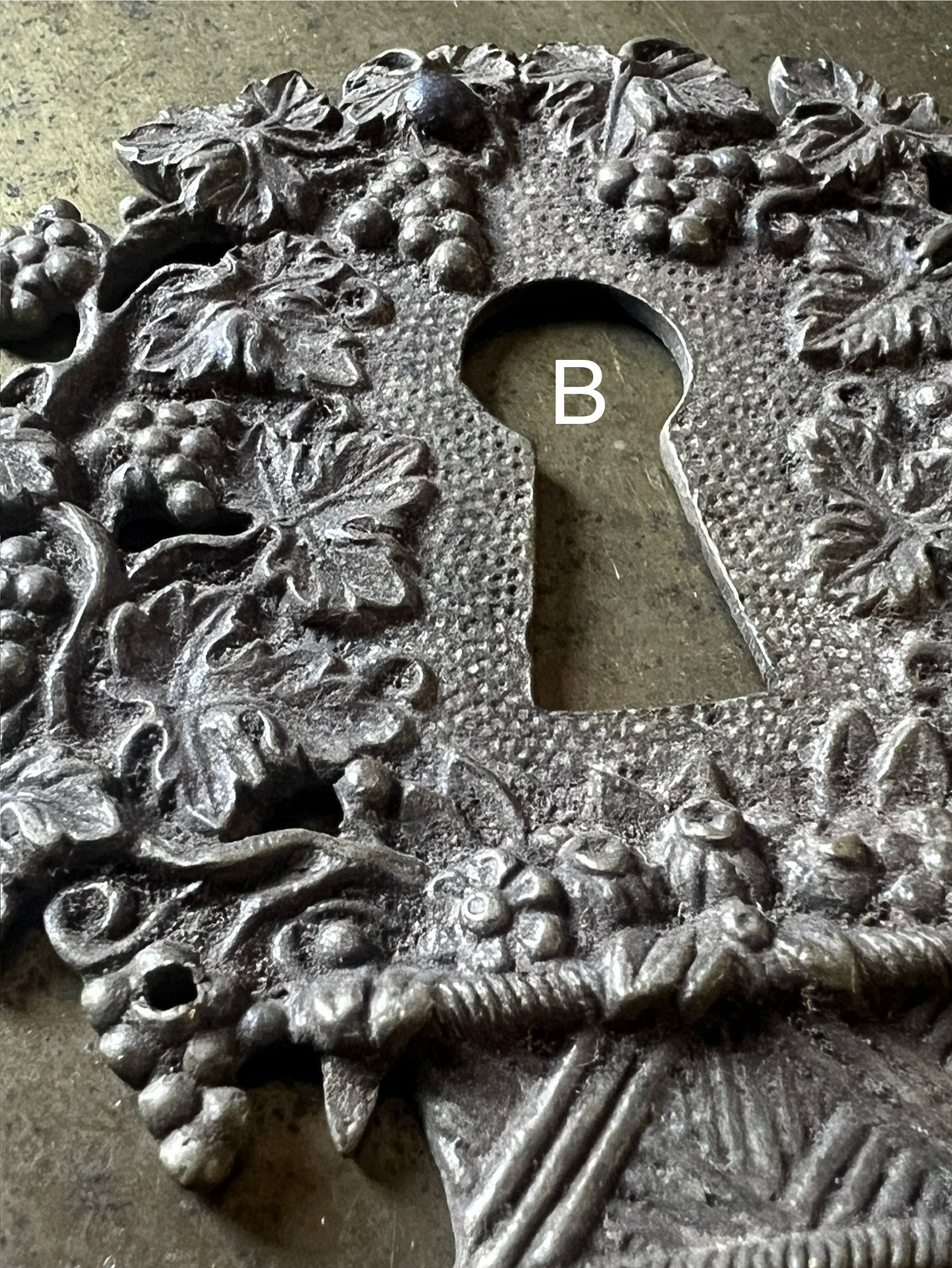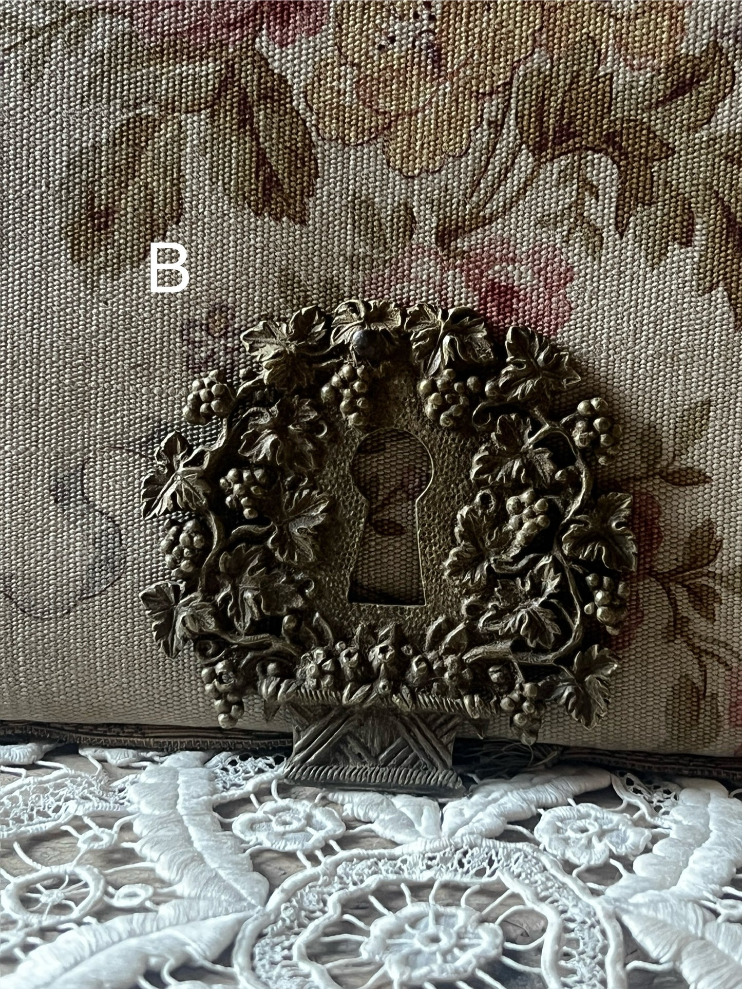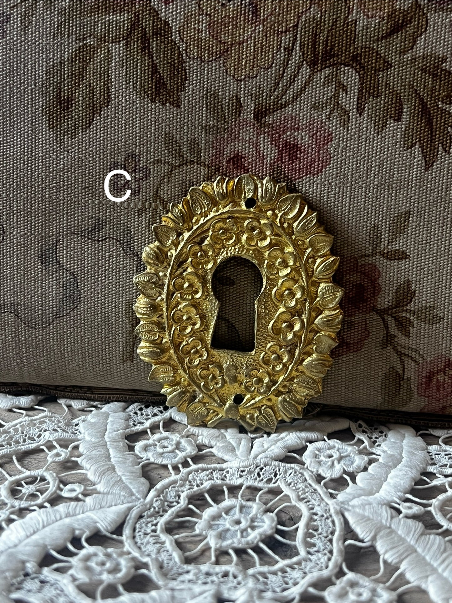 古びた金属のくすんだ風合いと細工が特徴の鍵穴装飾金具です