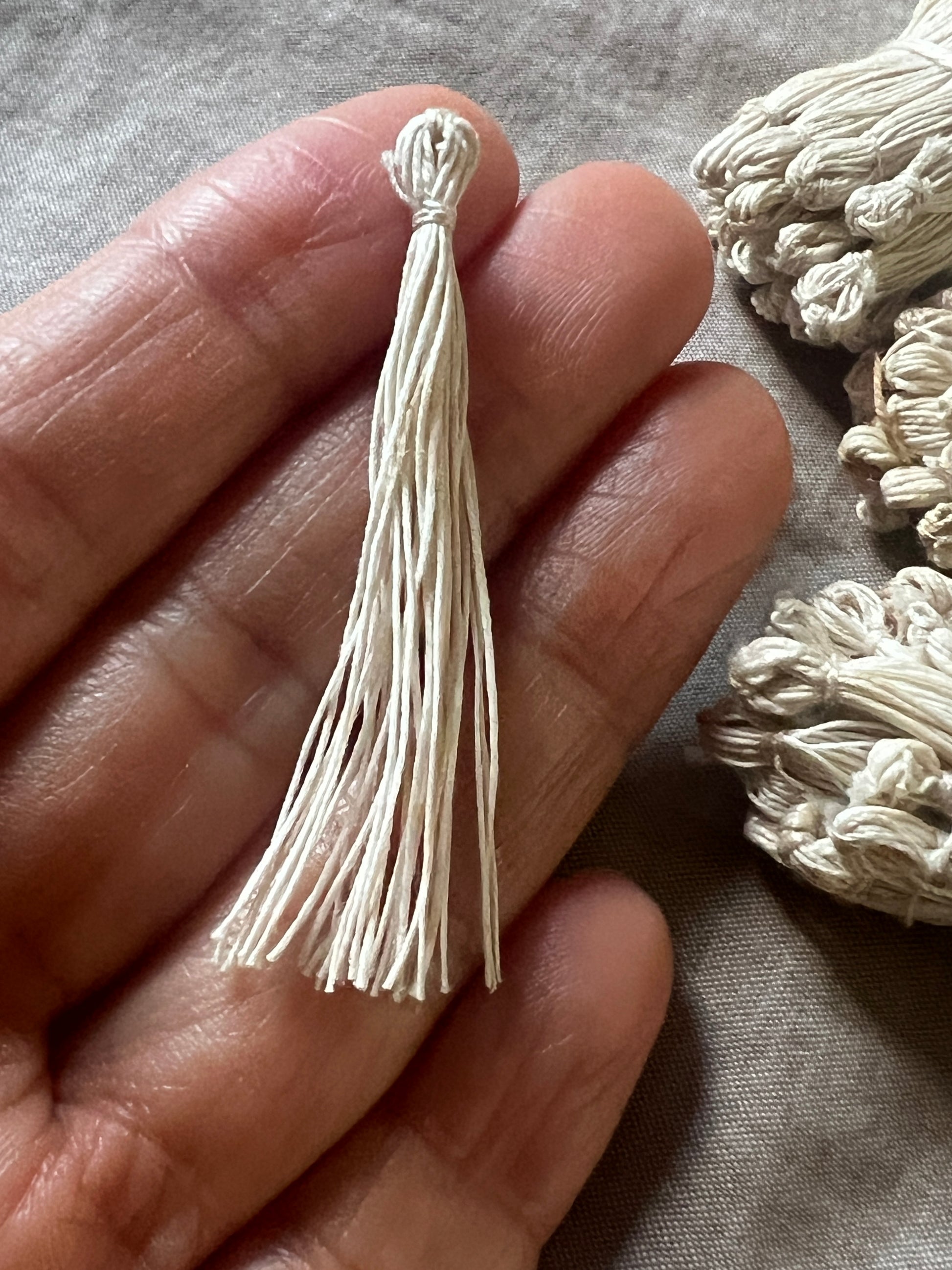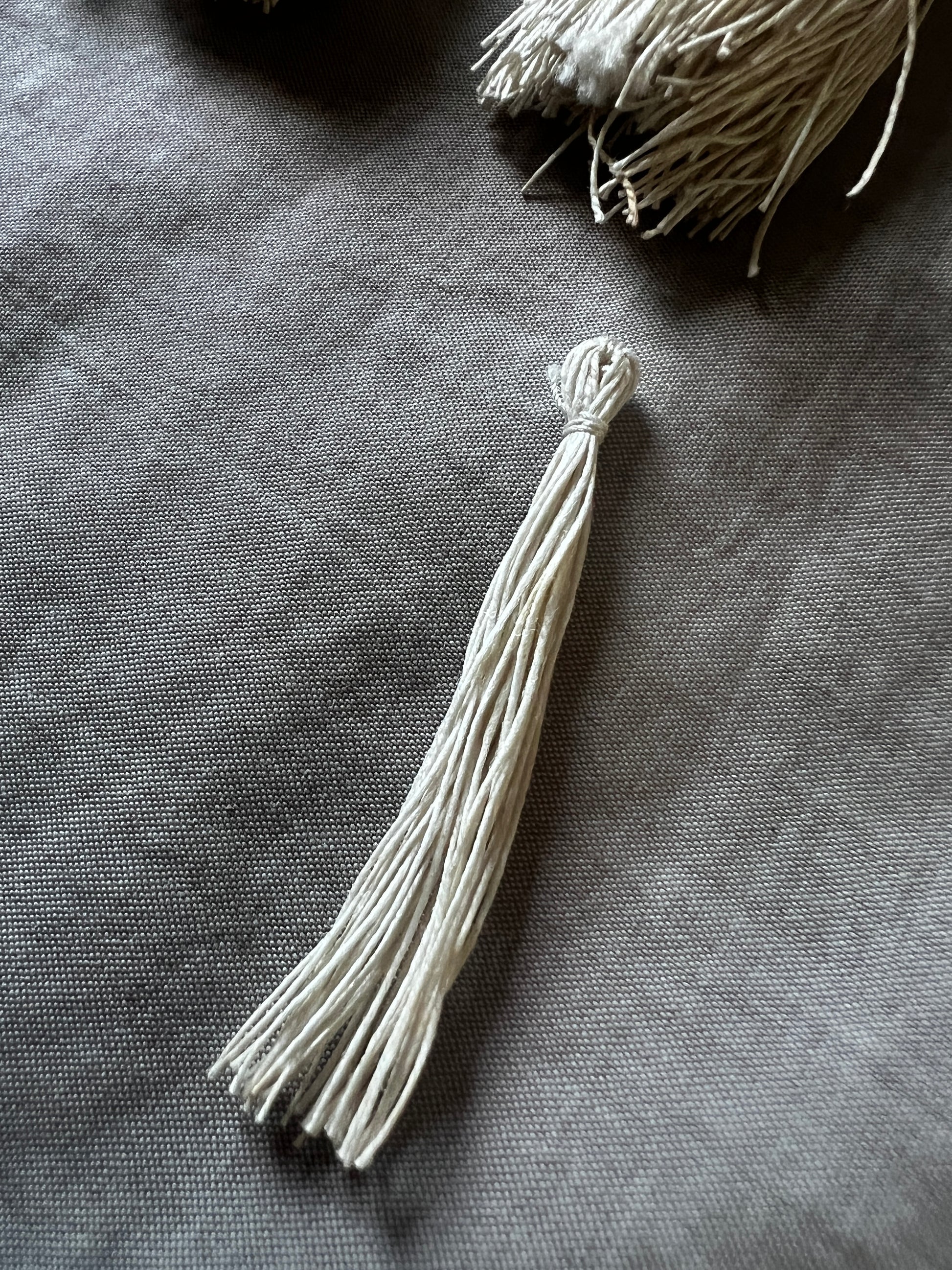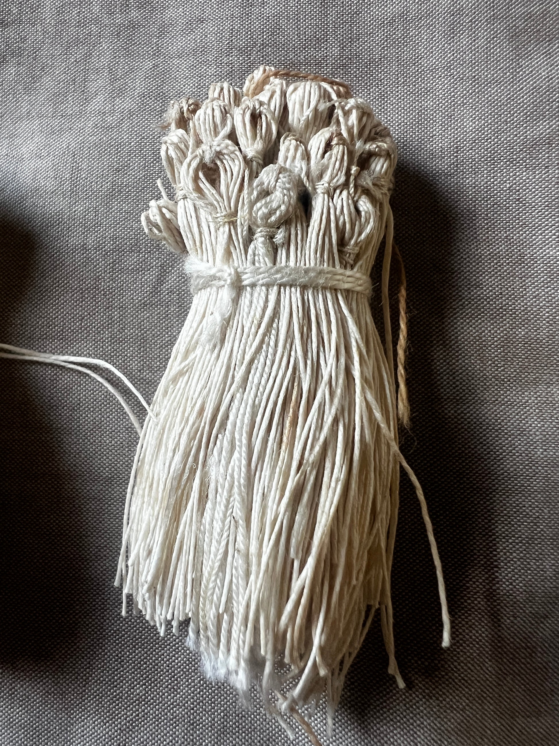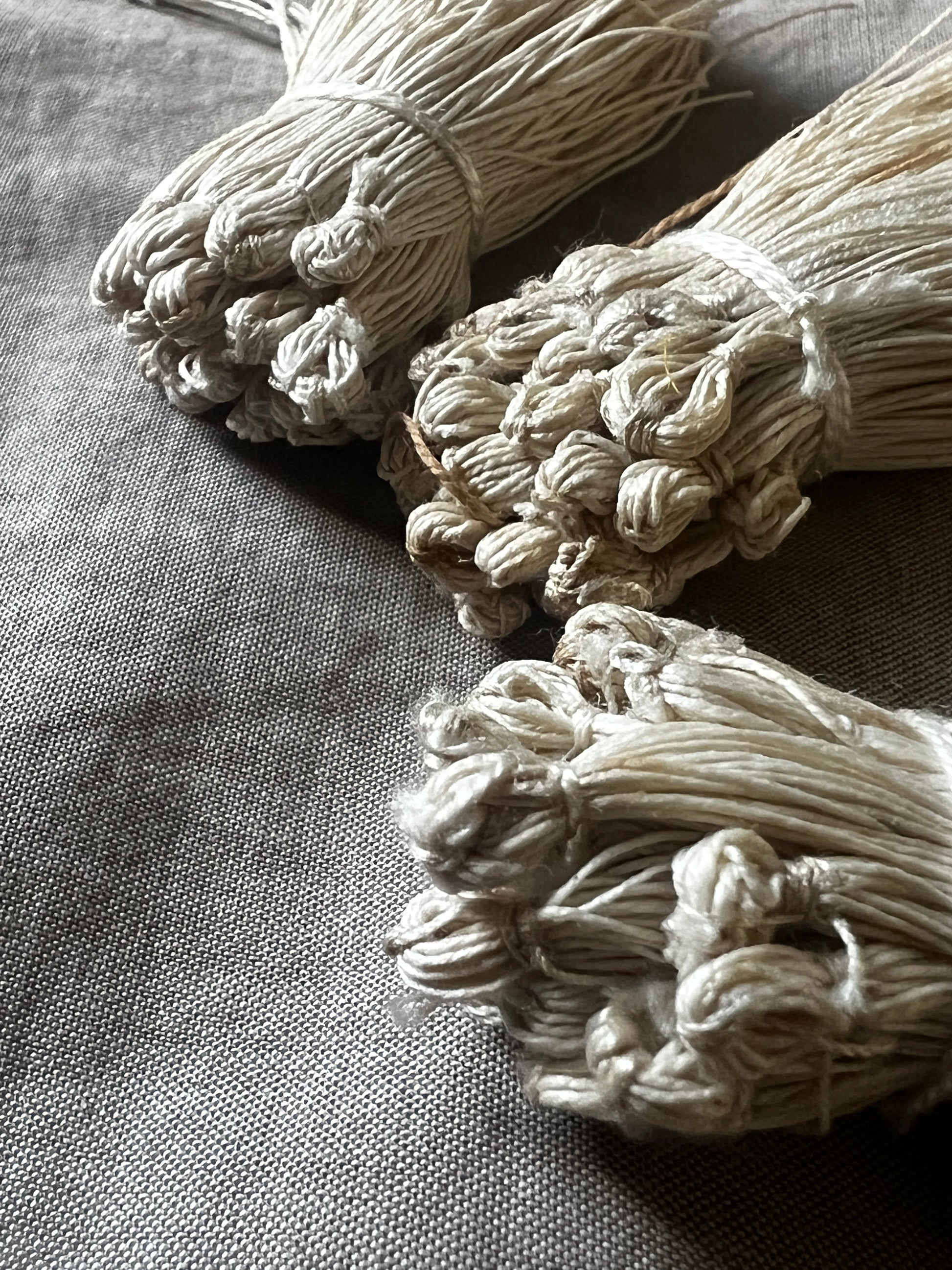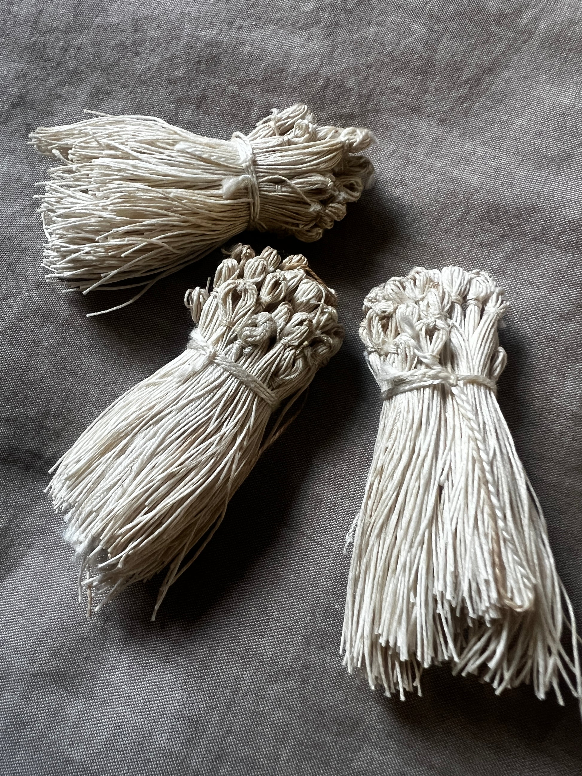 房飾り長約4cm 24房×3束セット リネン糸で作られた房飾りが束になったものを3束セットにしました 一束24房程度の数で束ねられていますが、多少の数の前後がある事をご了承ください クロスの縁取りや掛布の裾などの装飾の他、バッグやお洋服のリメイク素材としてご利用いただけます 保管時の全体的な変色がうっすらと見受けられます