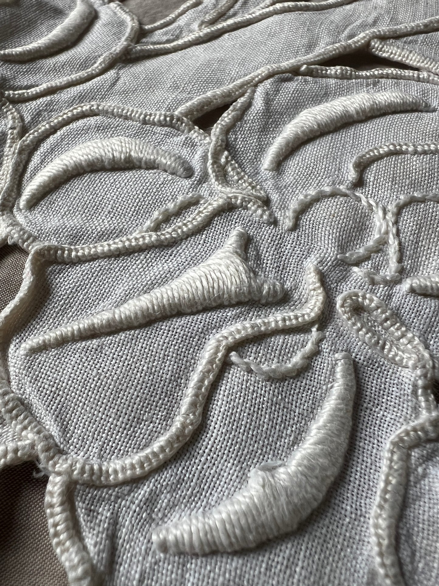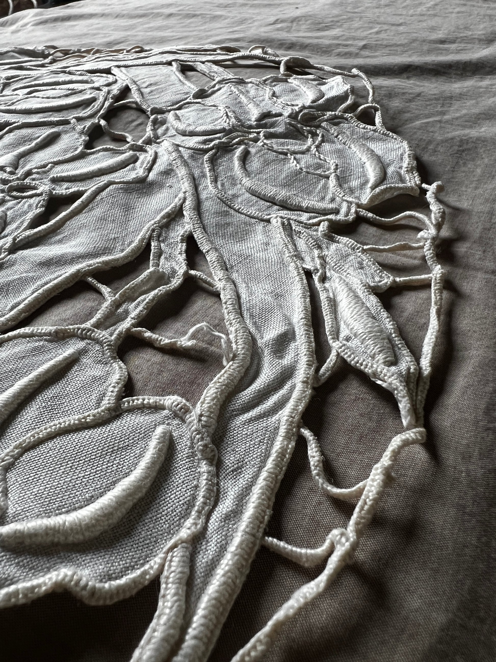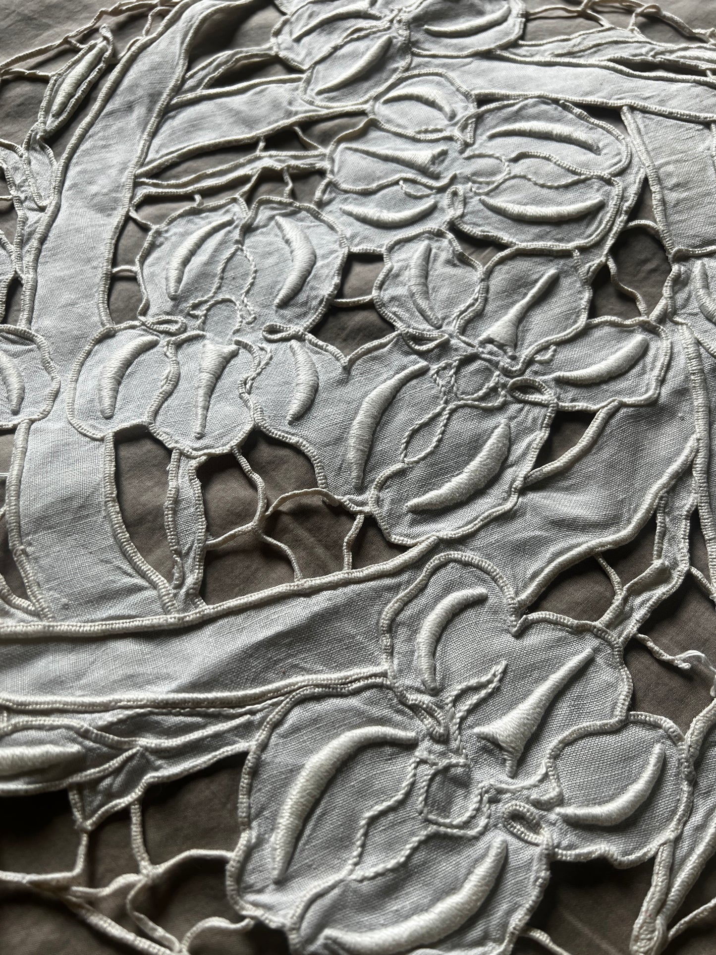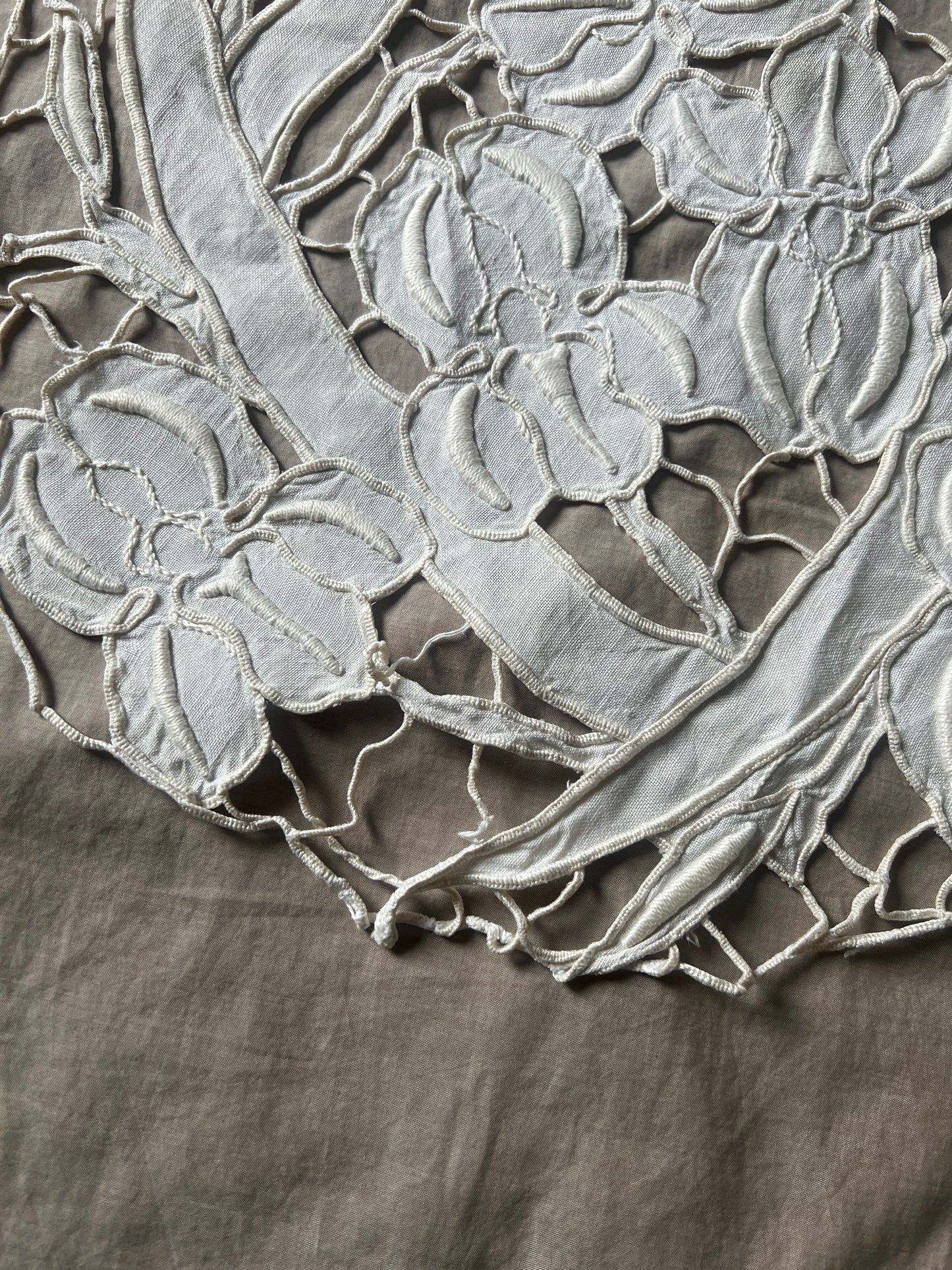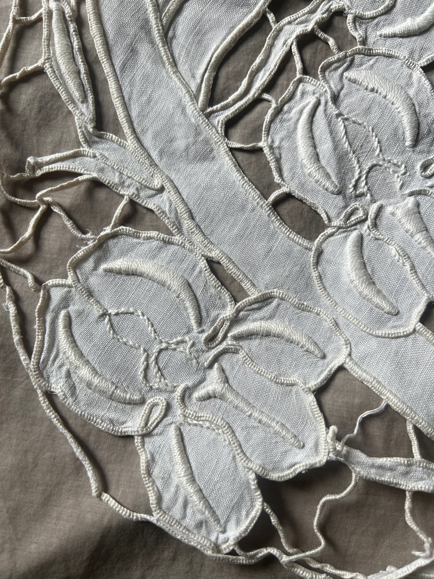 軽やかなデザインのカットワーク刺繍円形クロスです