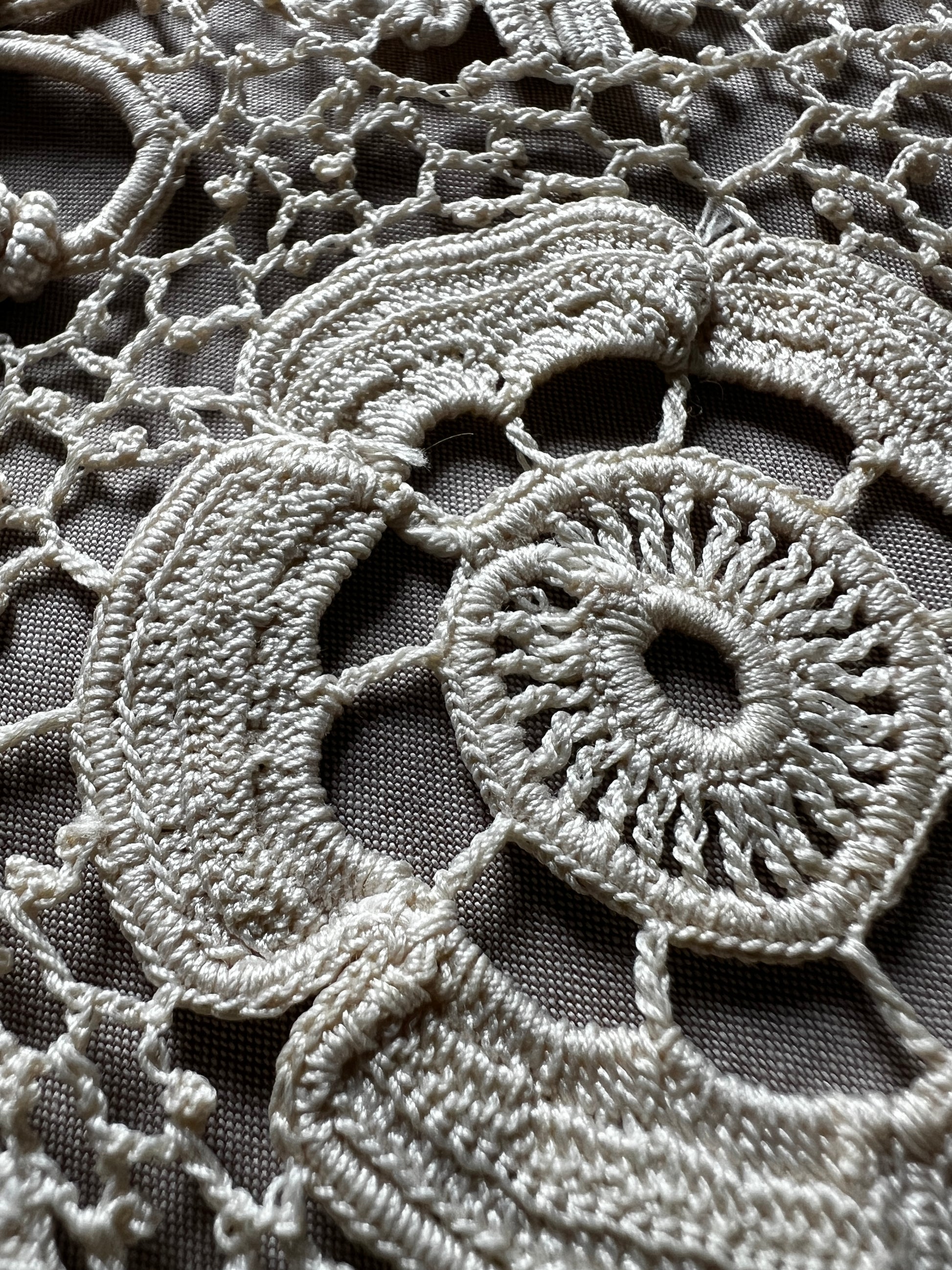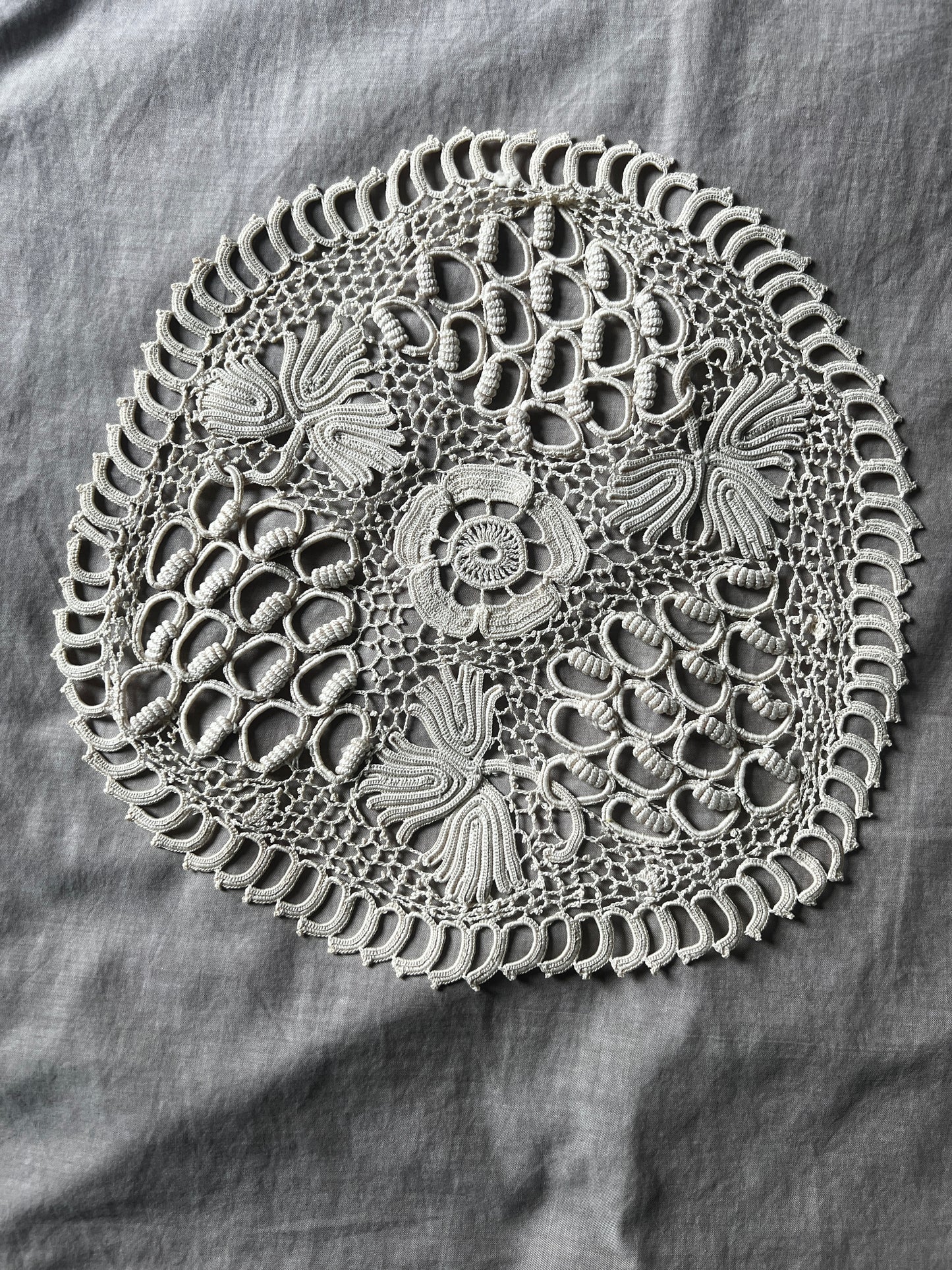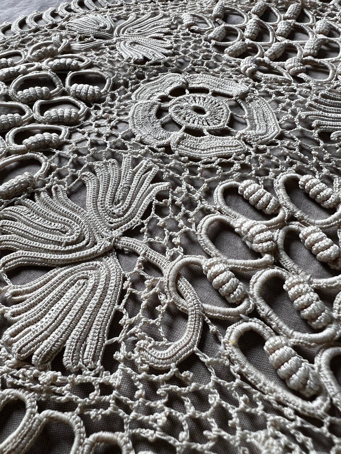 極細糸で編み込まれたアイリッシュクロシェレースの円形クロスです