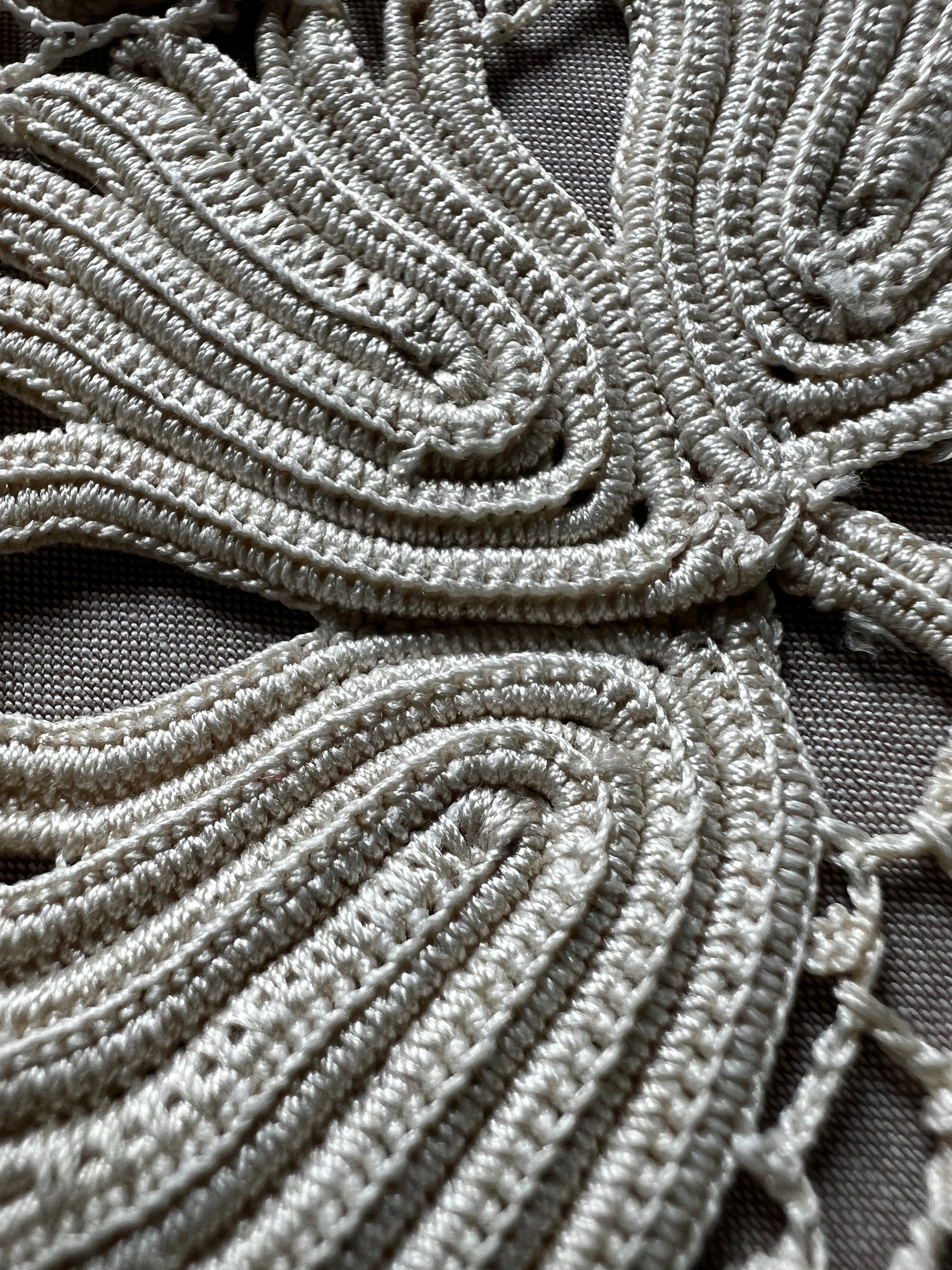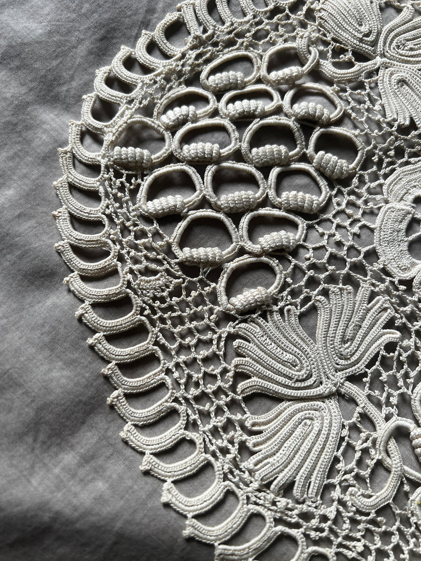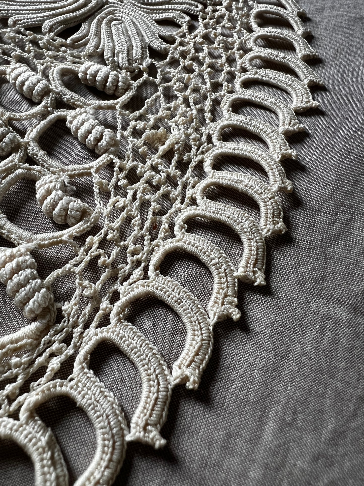 極細糸で編み込まれたアイリッシュクロシェレースの円形クロスです