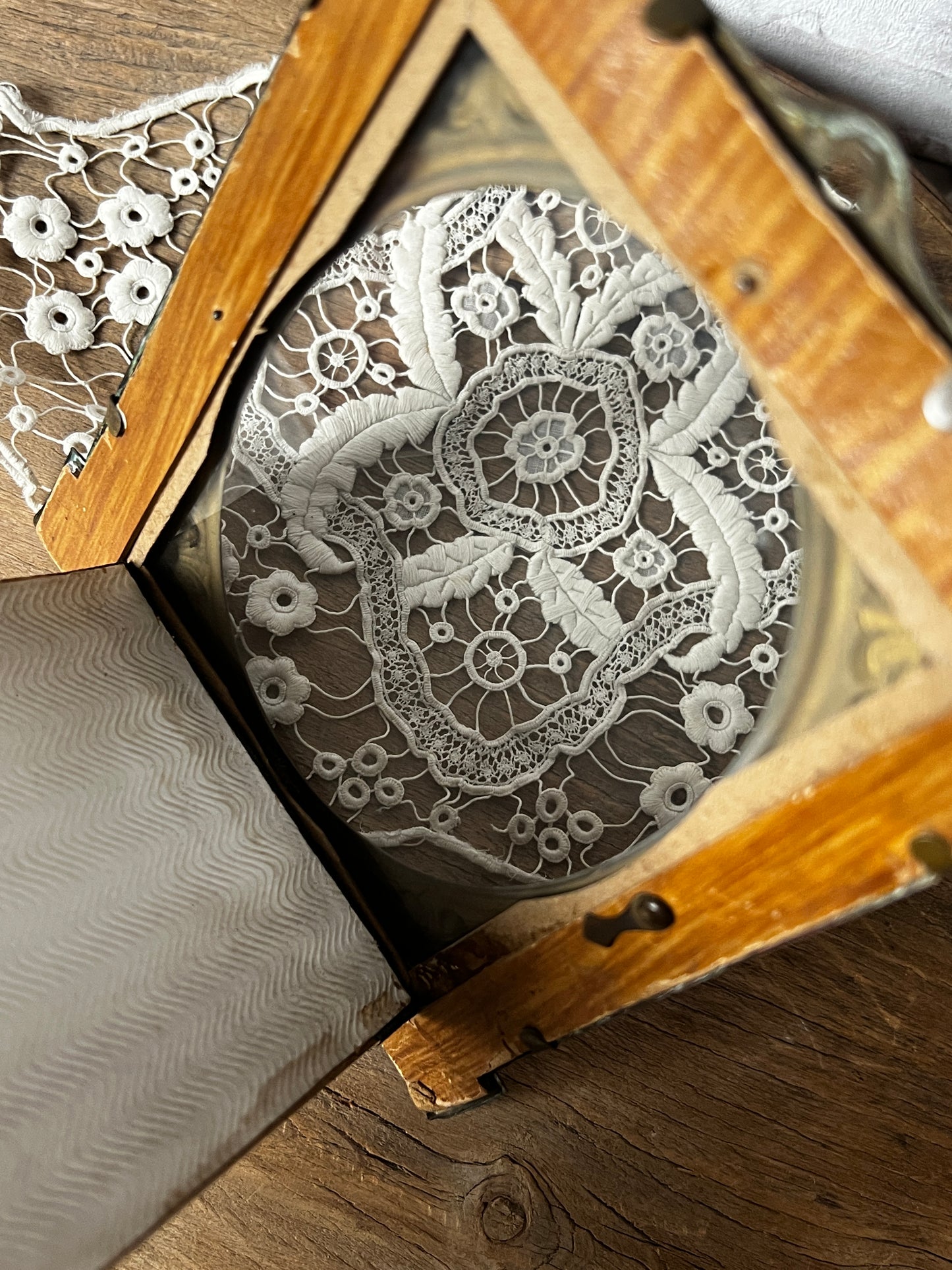 楕円形の窓には薄いガラスが入っており、背面を開閉して中の写真や小さな作品を差し替えることができます